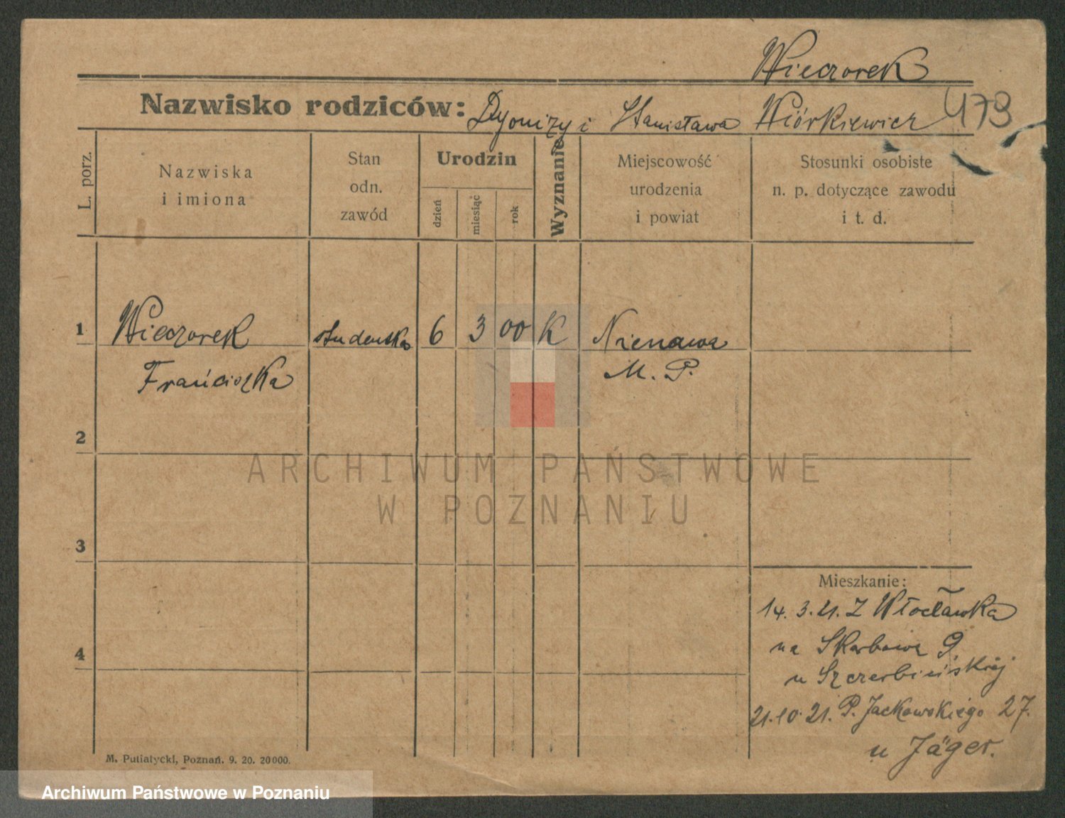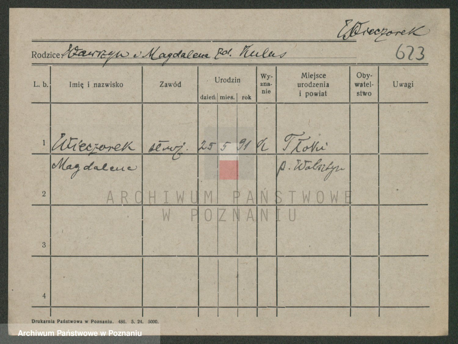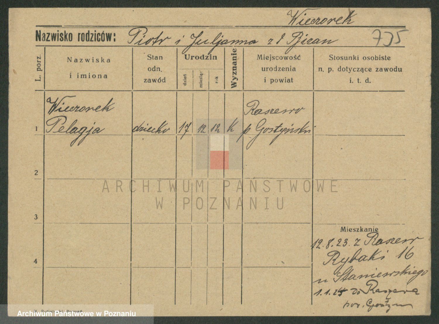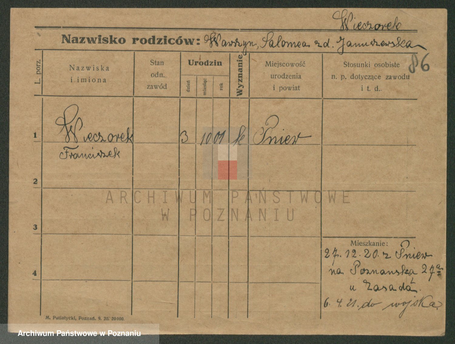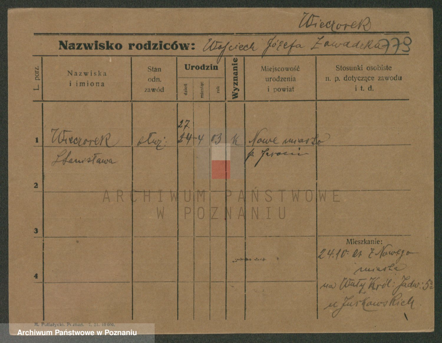 Podgląd karty osobowej dostępny jest po kliknięciu na nazwisko lub ikonkę karty. Można dokonywać powiększenia (ikony na górze) lub przechodzić między kolejnymi skanami (strzałki po bokach).