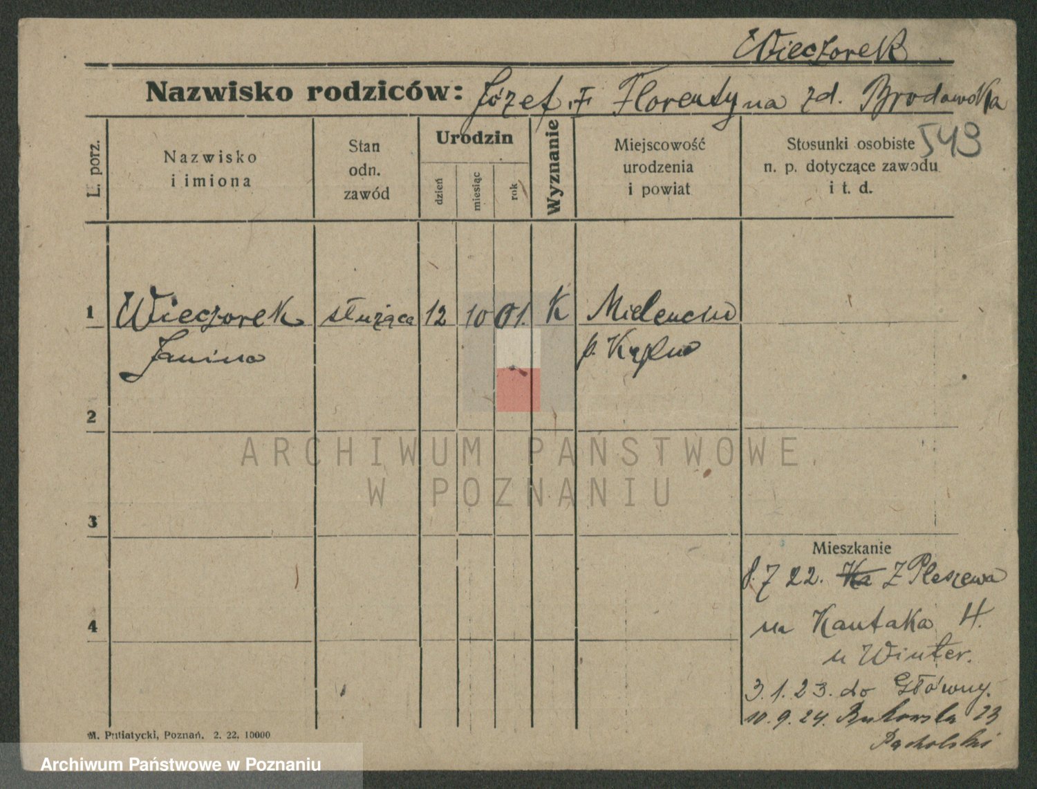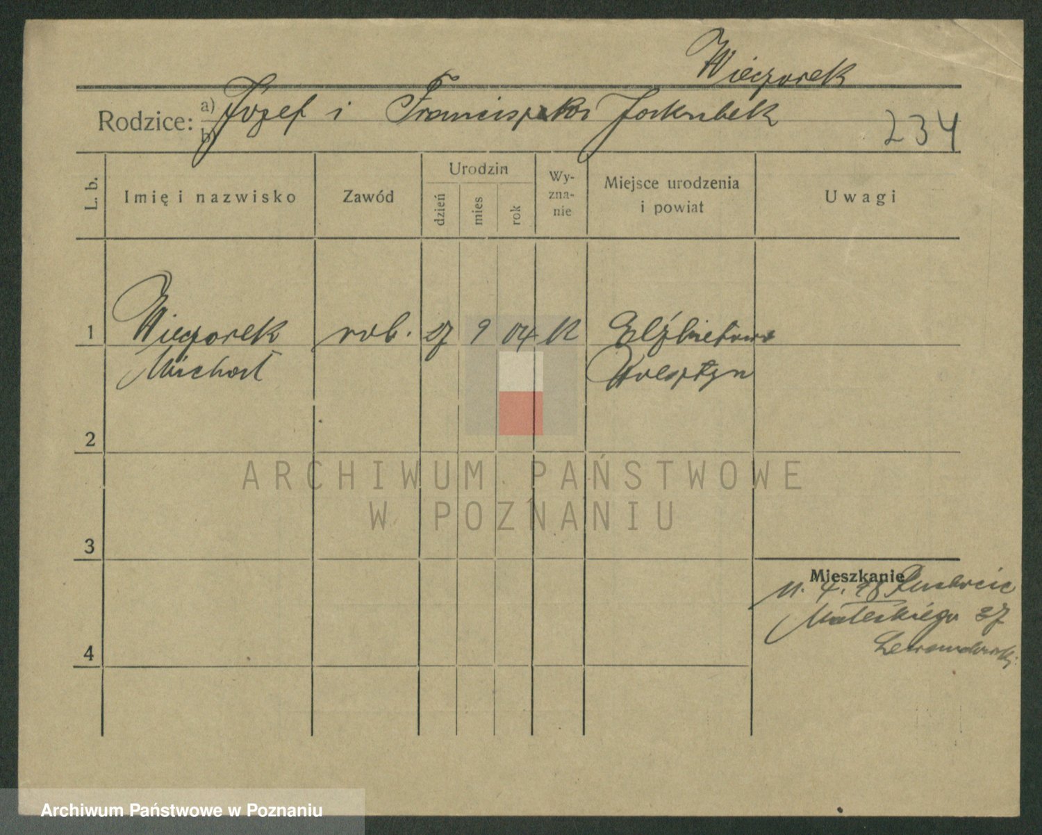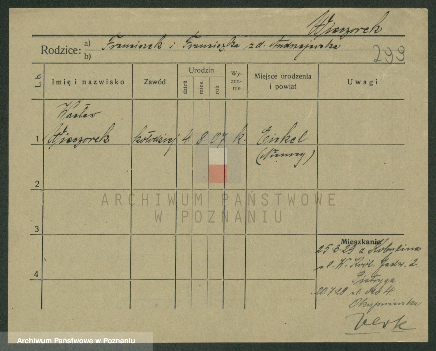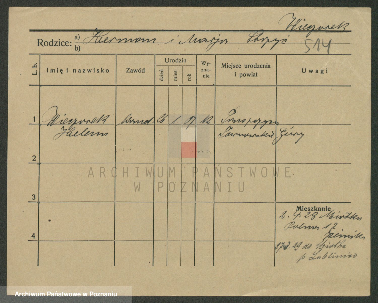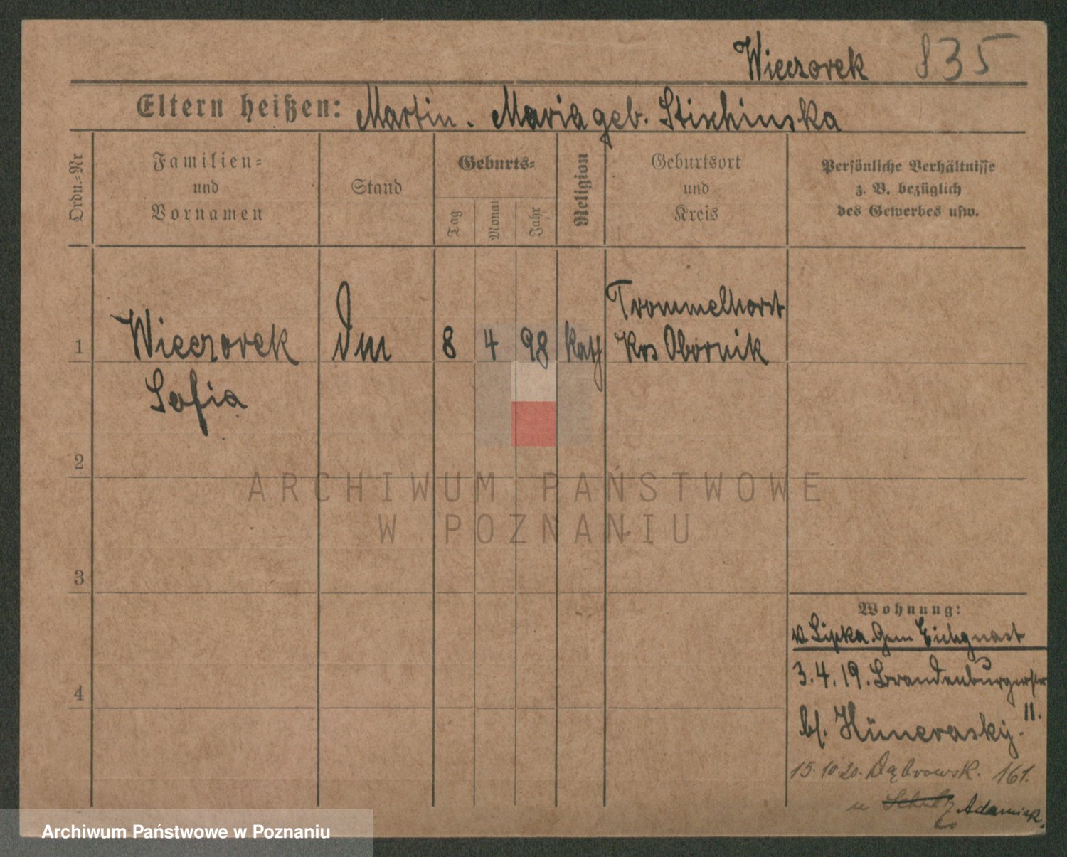 Podgląd karty osobowej dostępny jest po kliknięciu na nazwisko lub ikonkę karty. Można dokonywać powiększenia (ikony na górze) lub przechodzić między kolejnymi skanami (strzałki po bokach).