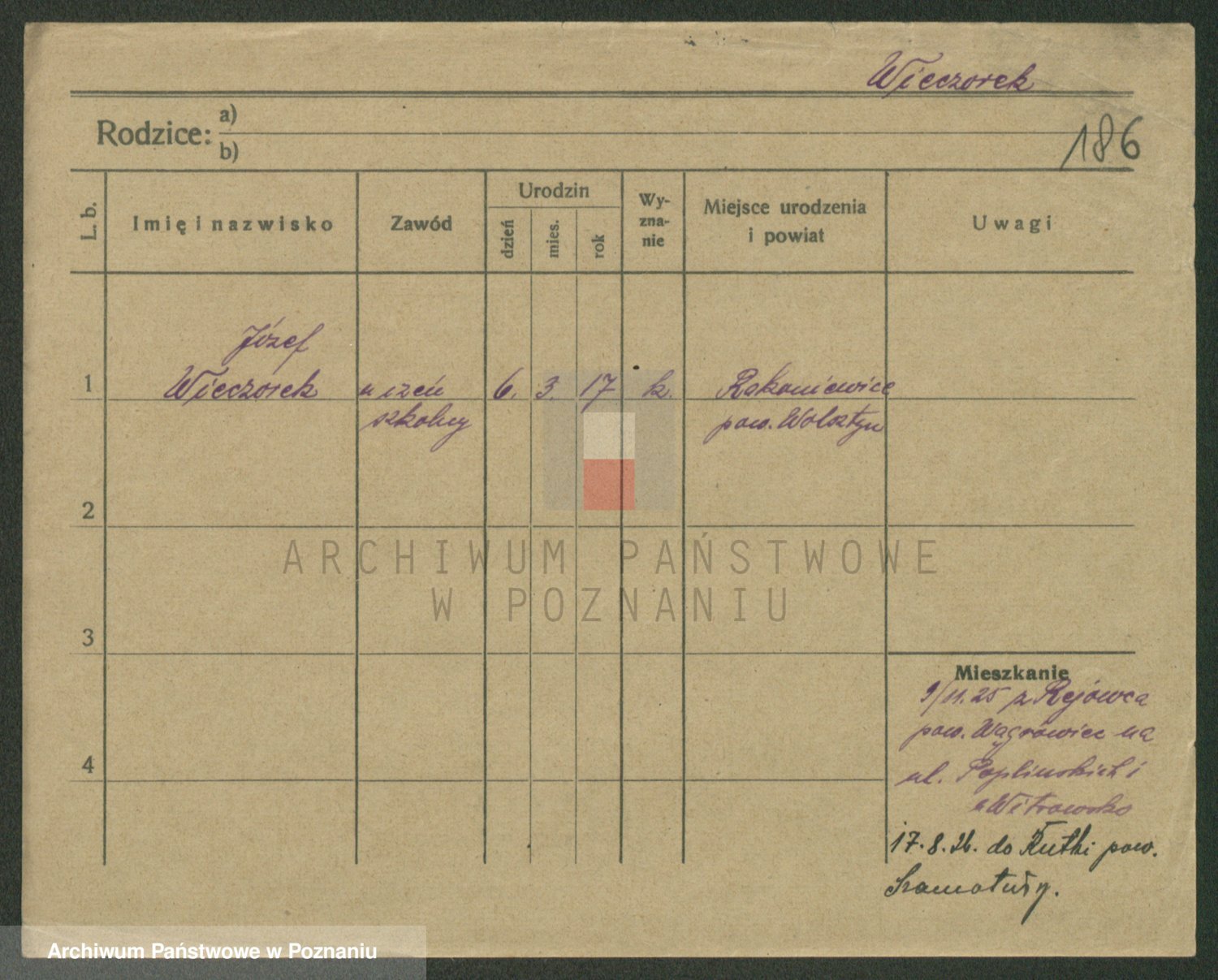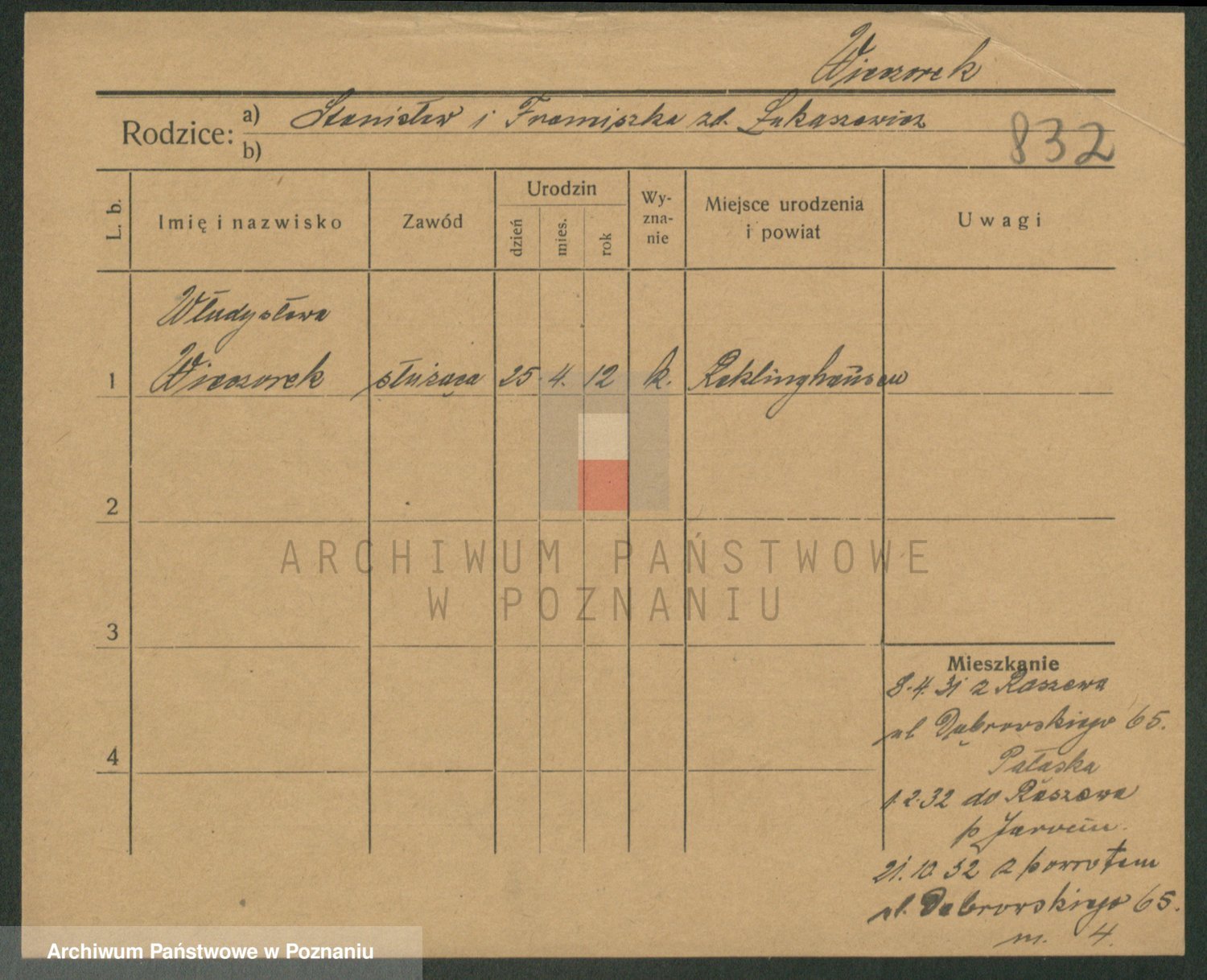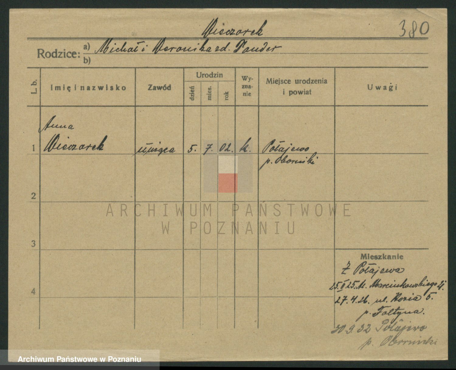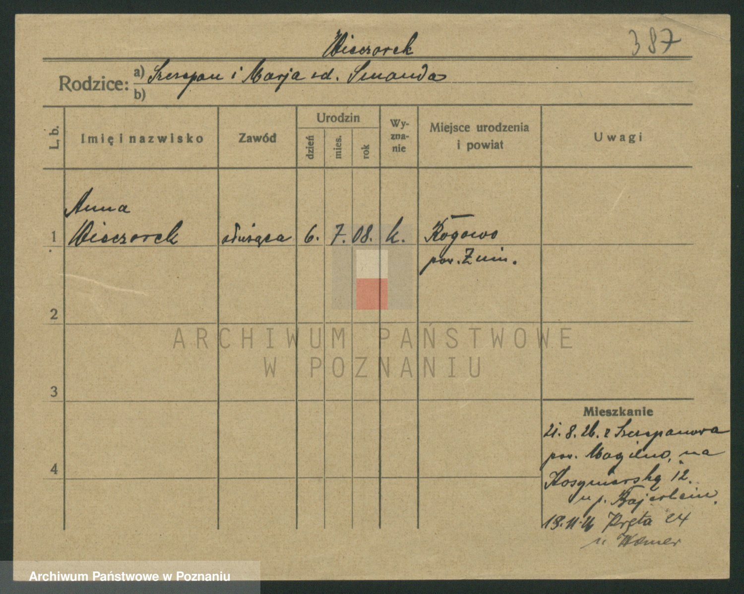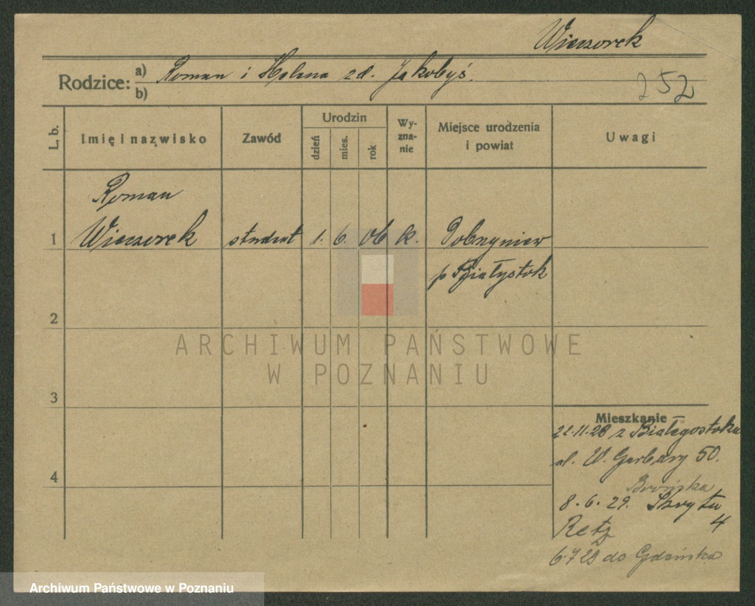 Podgląd karty osobowej dostępny jest po kliknięciu na nazwisko lub ikonkę karty. Można dokonywać powiększenia (ikony na górze) lub przechodzić między kolejnymi skanami (strzałki po bokach).