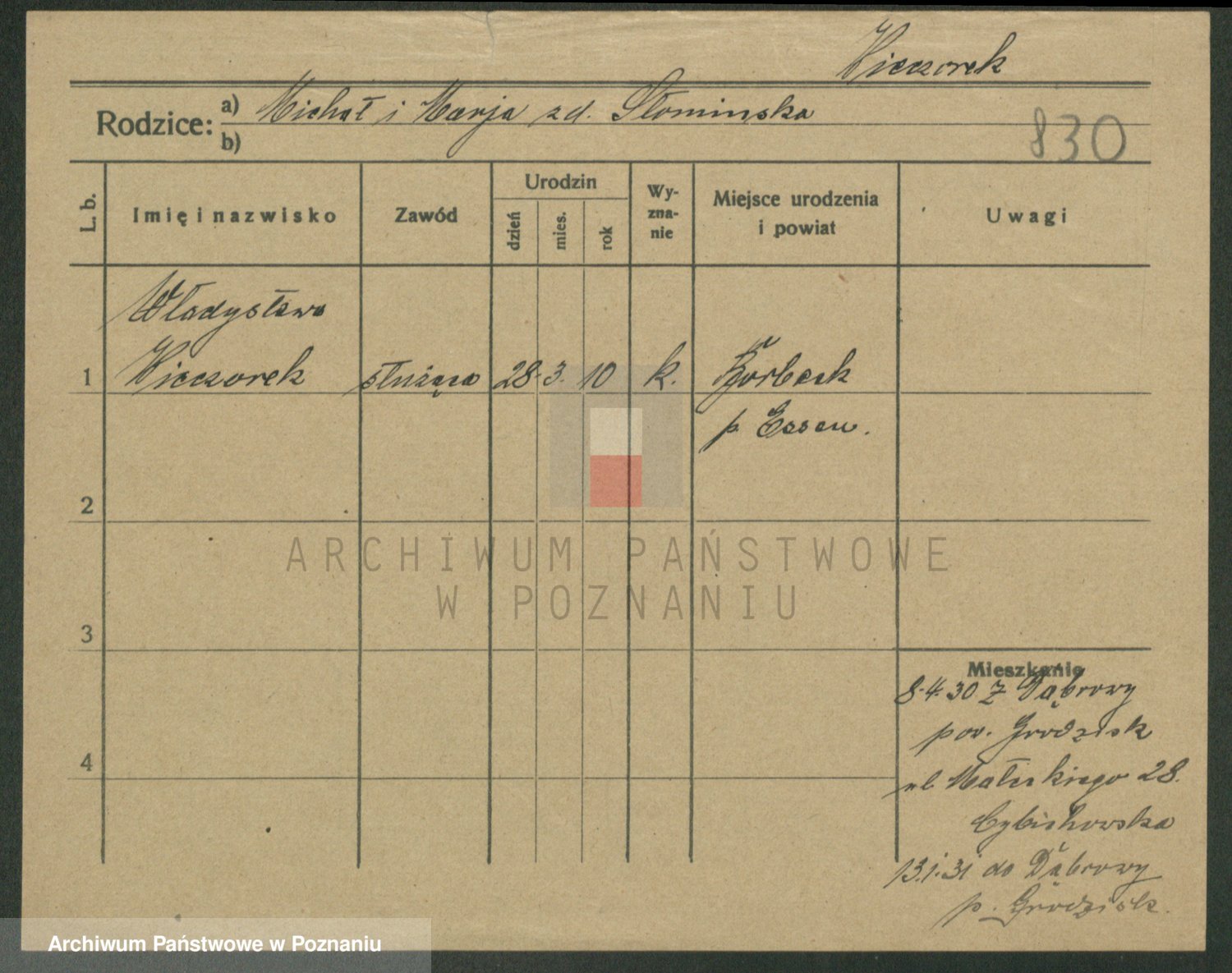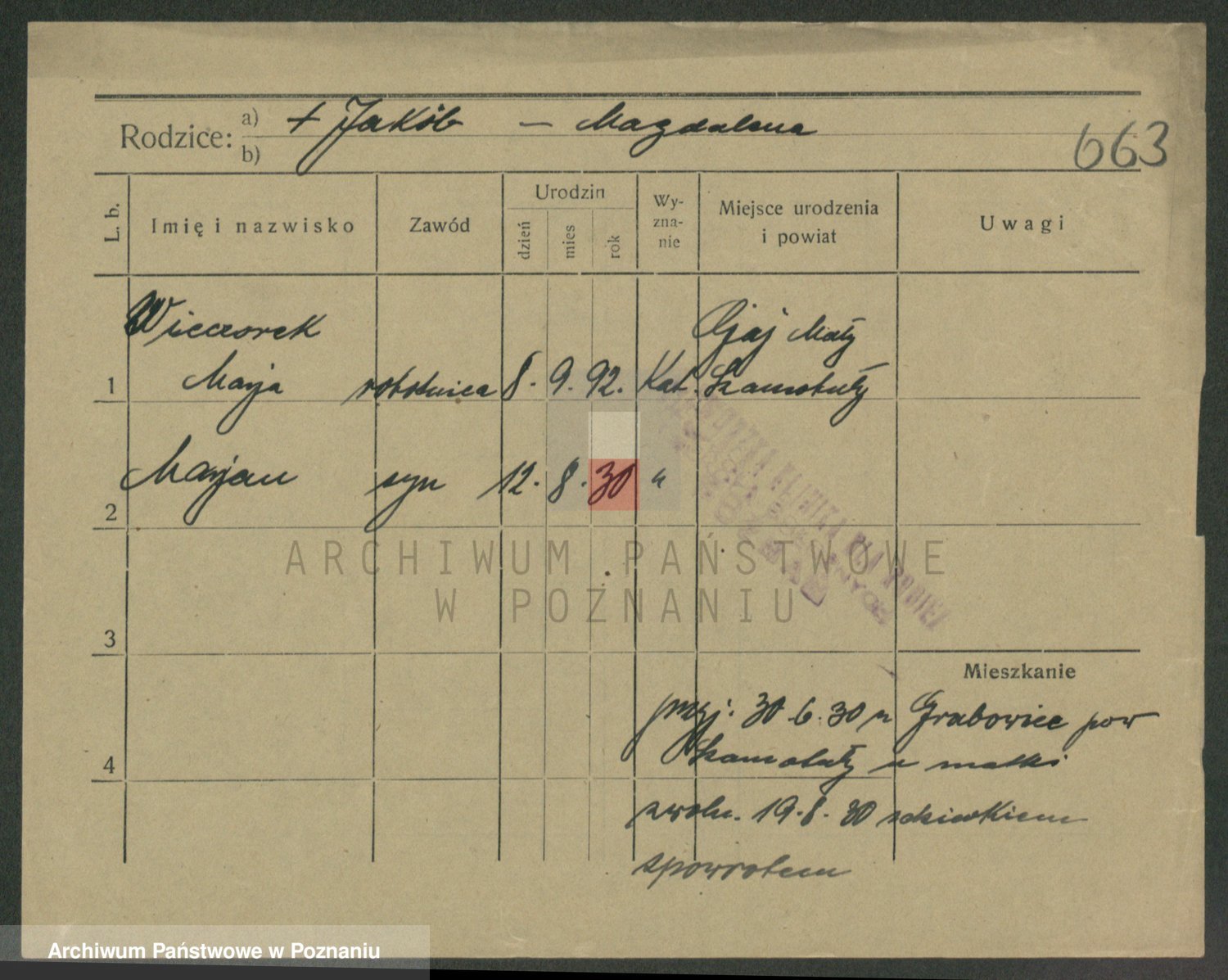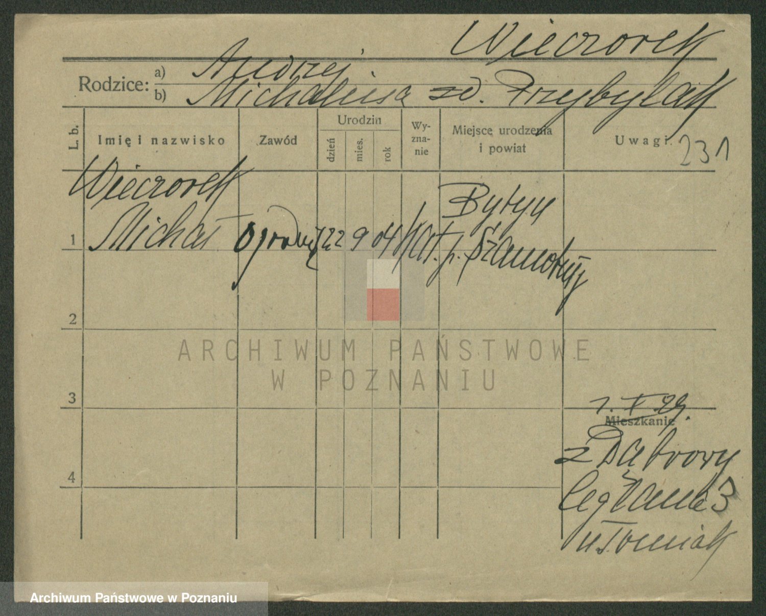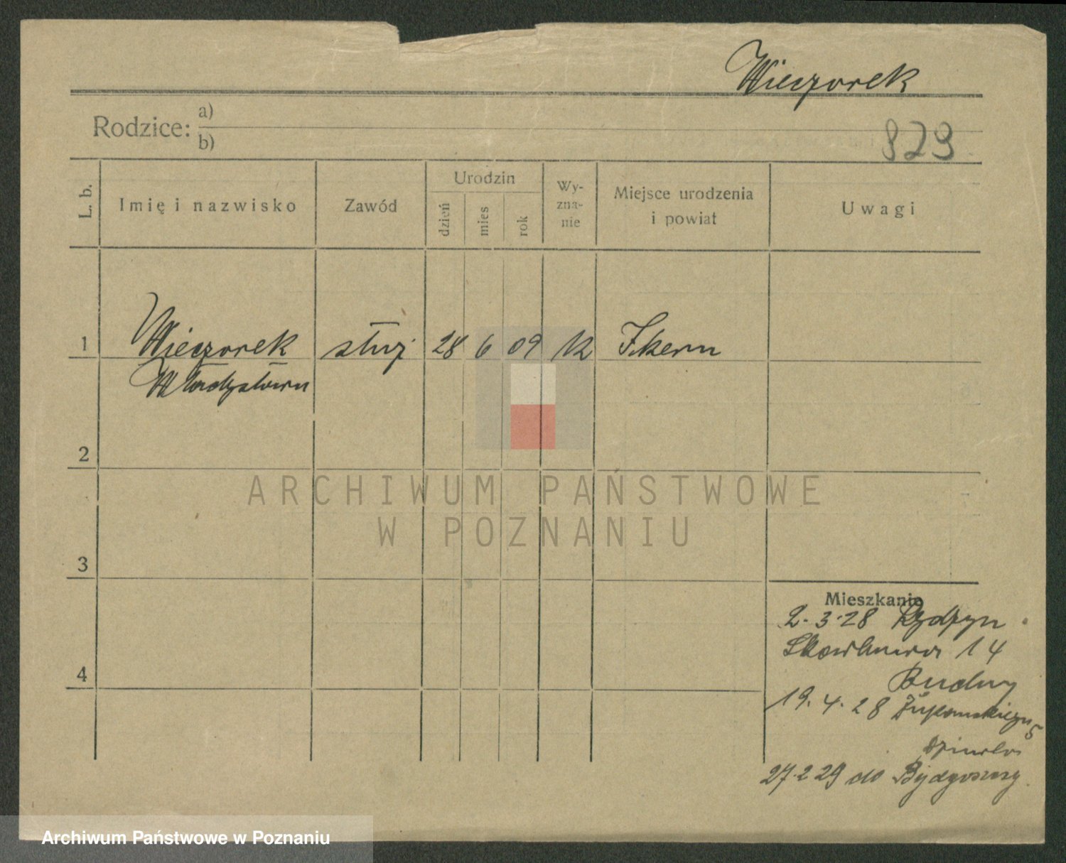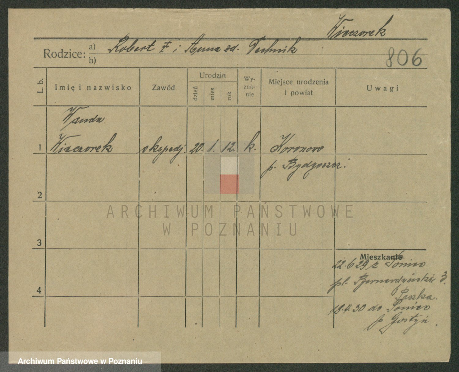 Podgląd karty osobowej dostępny jest po kliknięciu na nazwisko lub ikonkę karty. Można dokonywać powiększenia (ikony na górze) lub przechodzić między kolejnymi skanami (strzałki po bokach).
