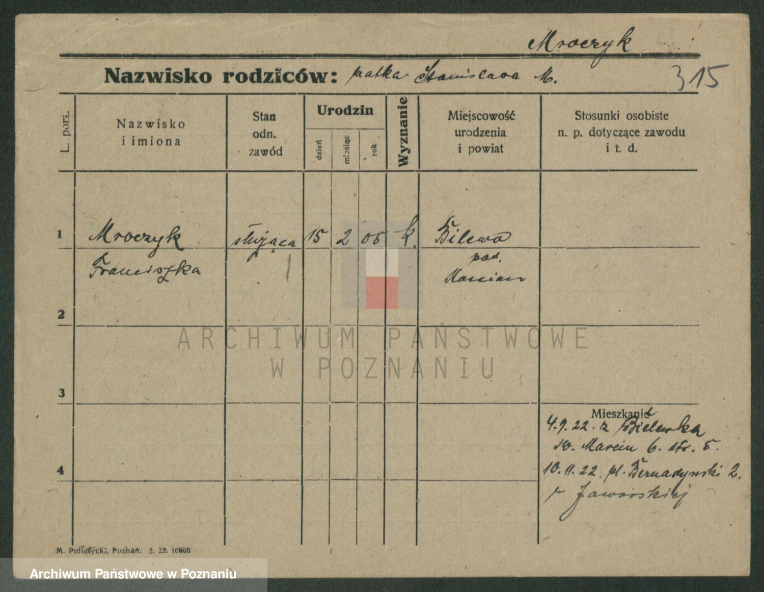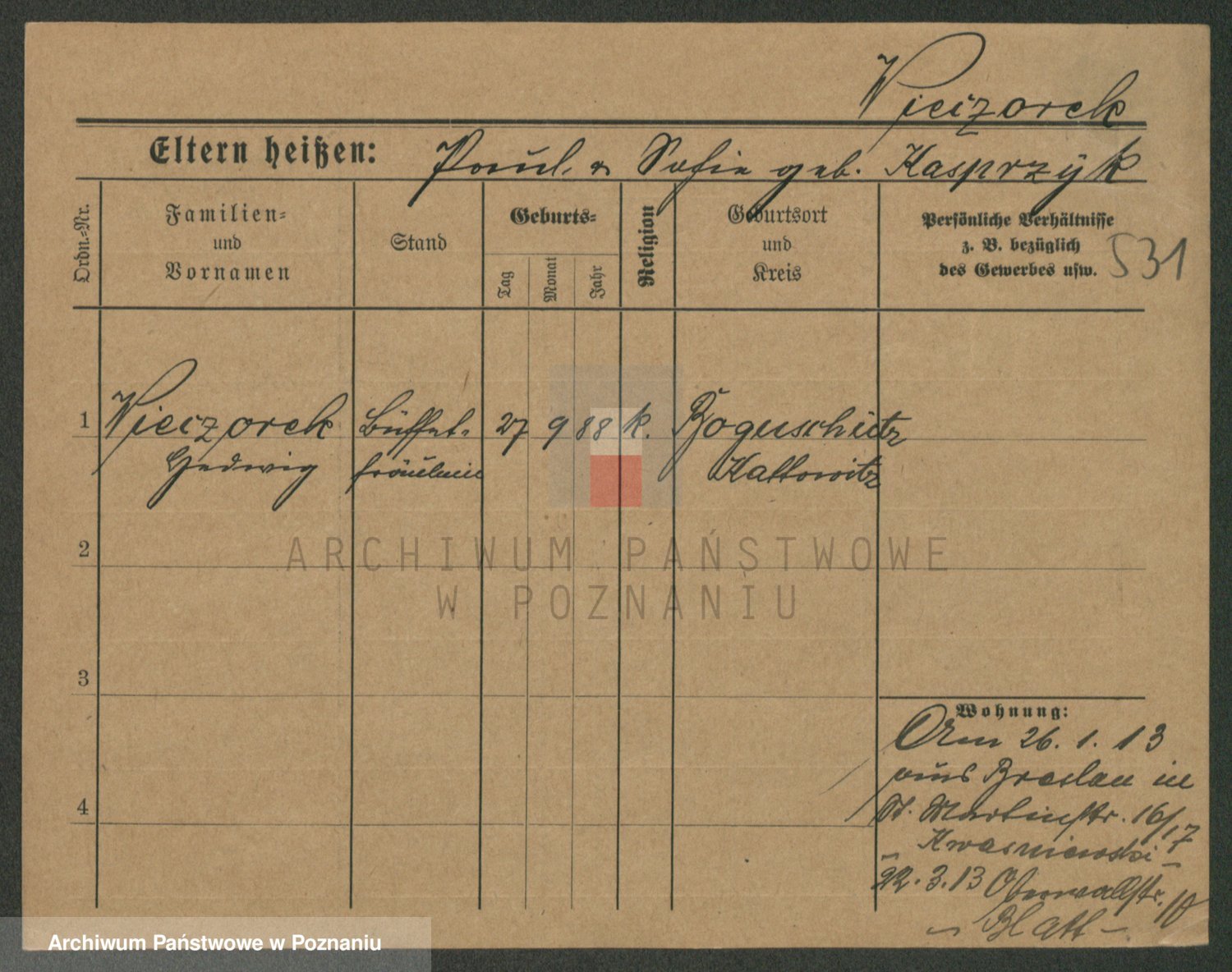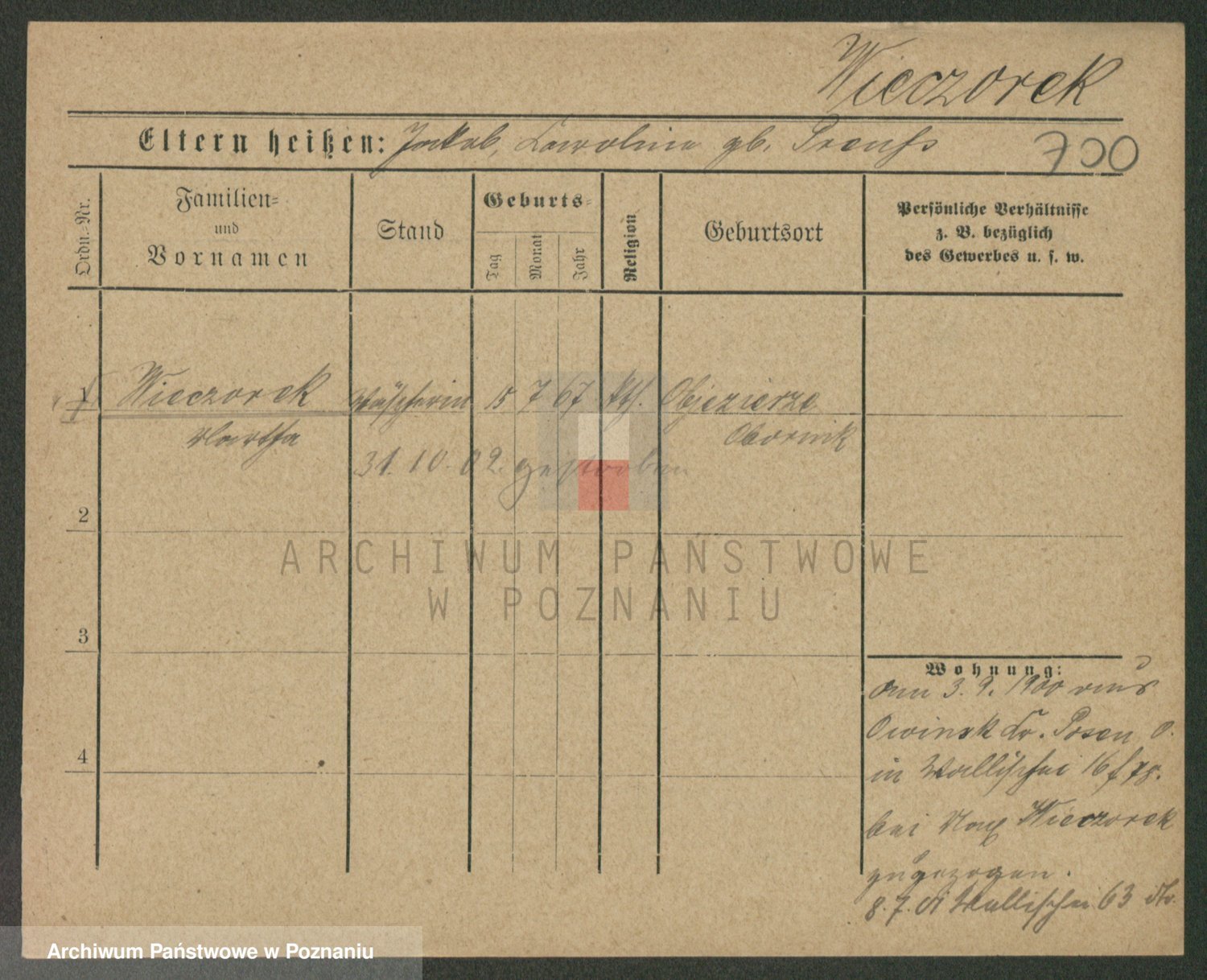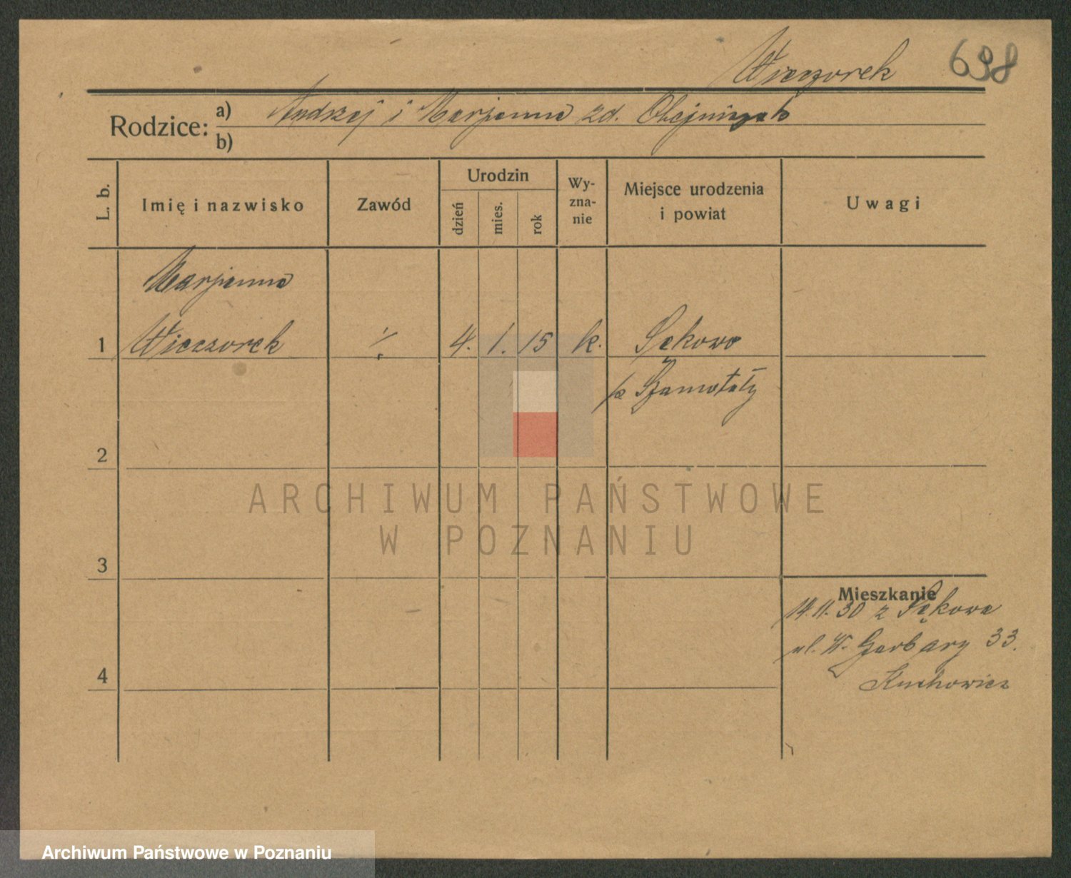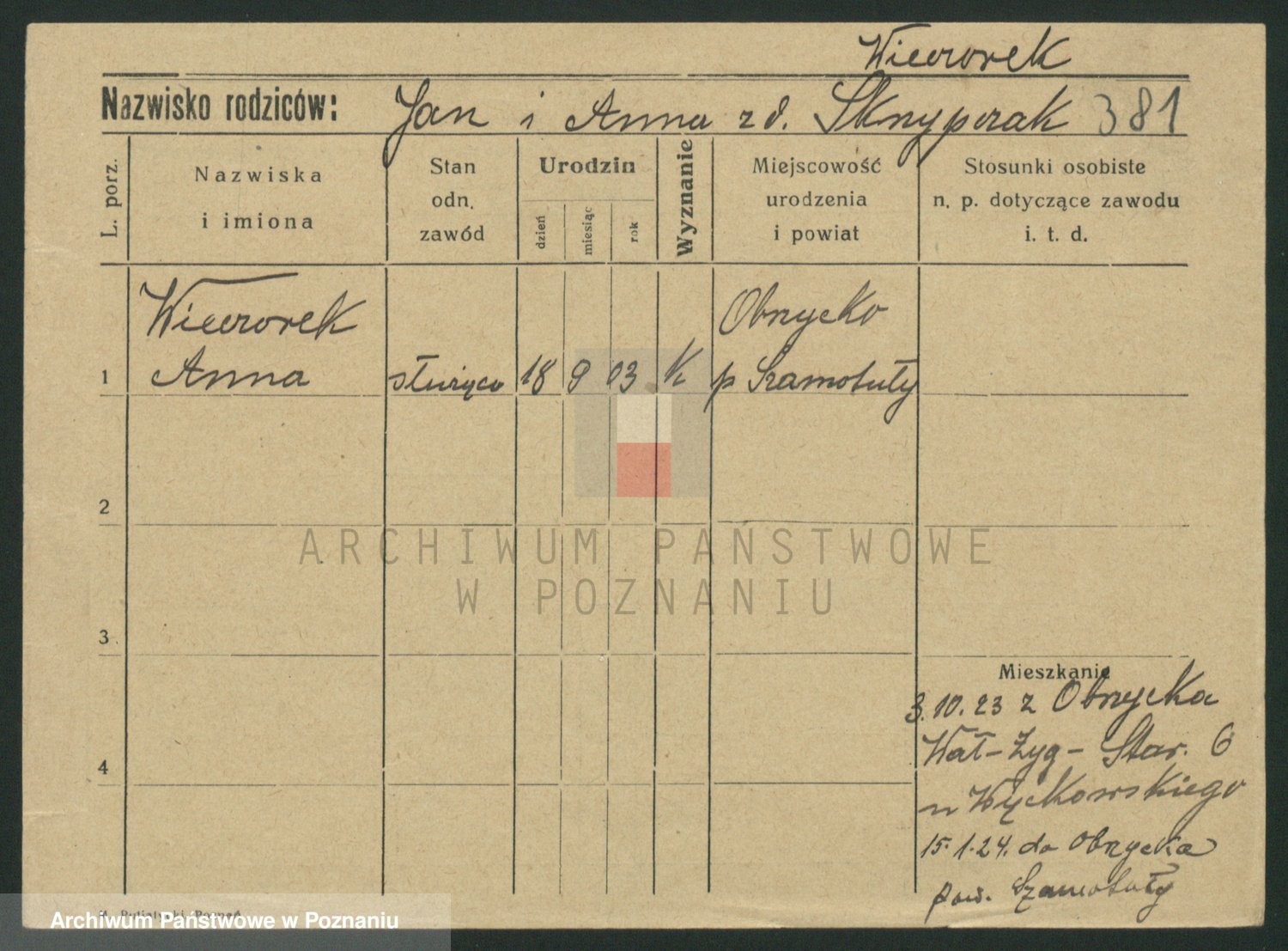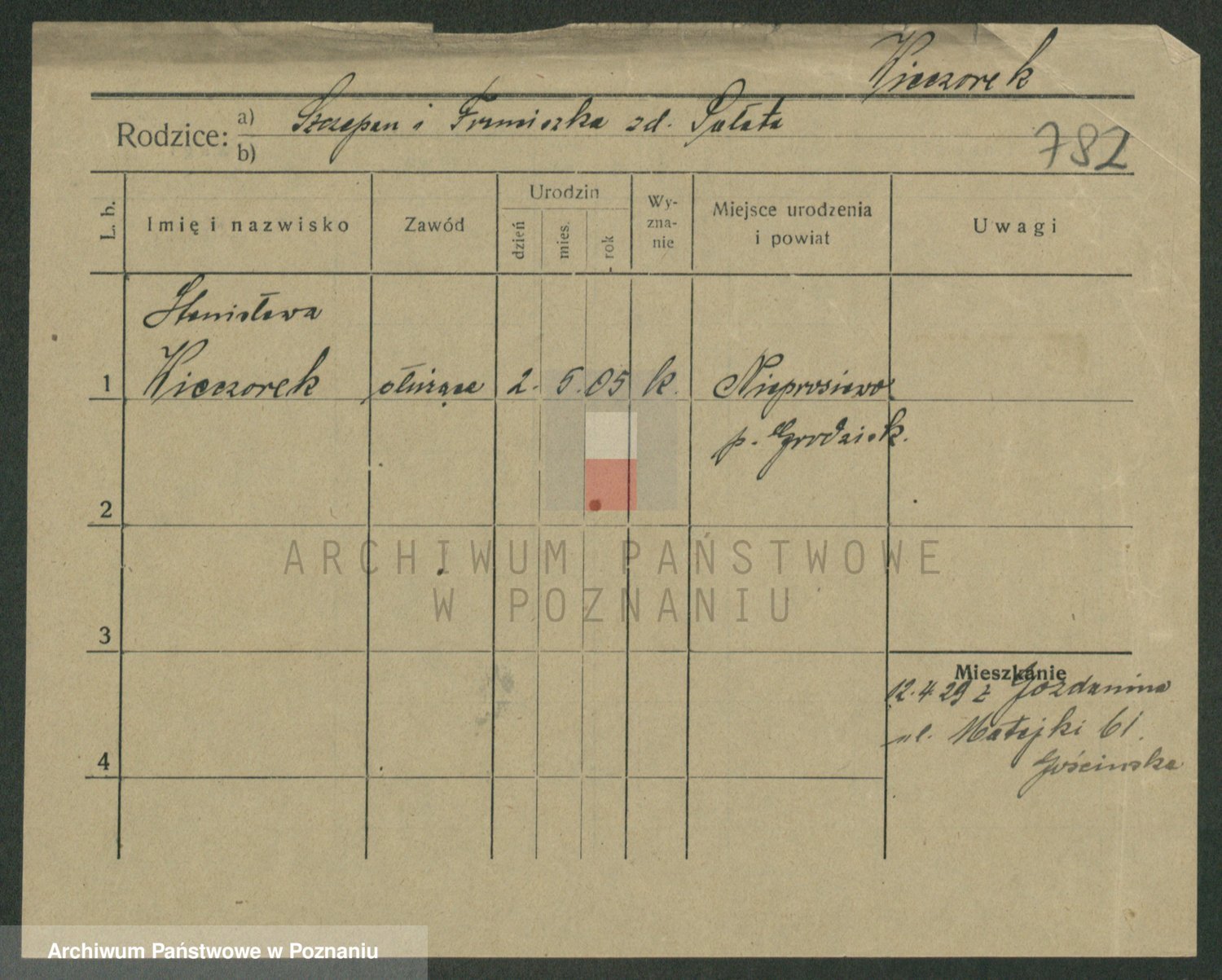 Podgląd karty osobowej dostępny jest po kliknięciu na nazwisko lub ikonkę karty. Można dokonywać powiększenia (ikony na górze) lub przechodzić między kolejnymi skanami (strzałki po bokach).