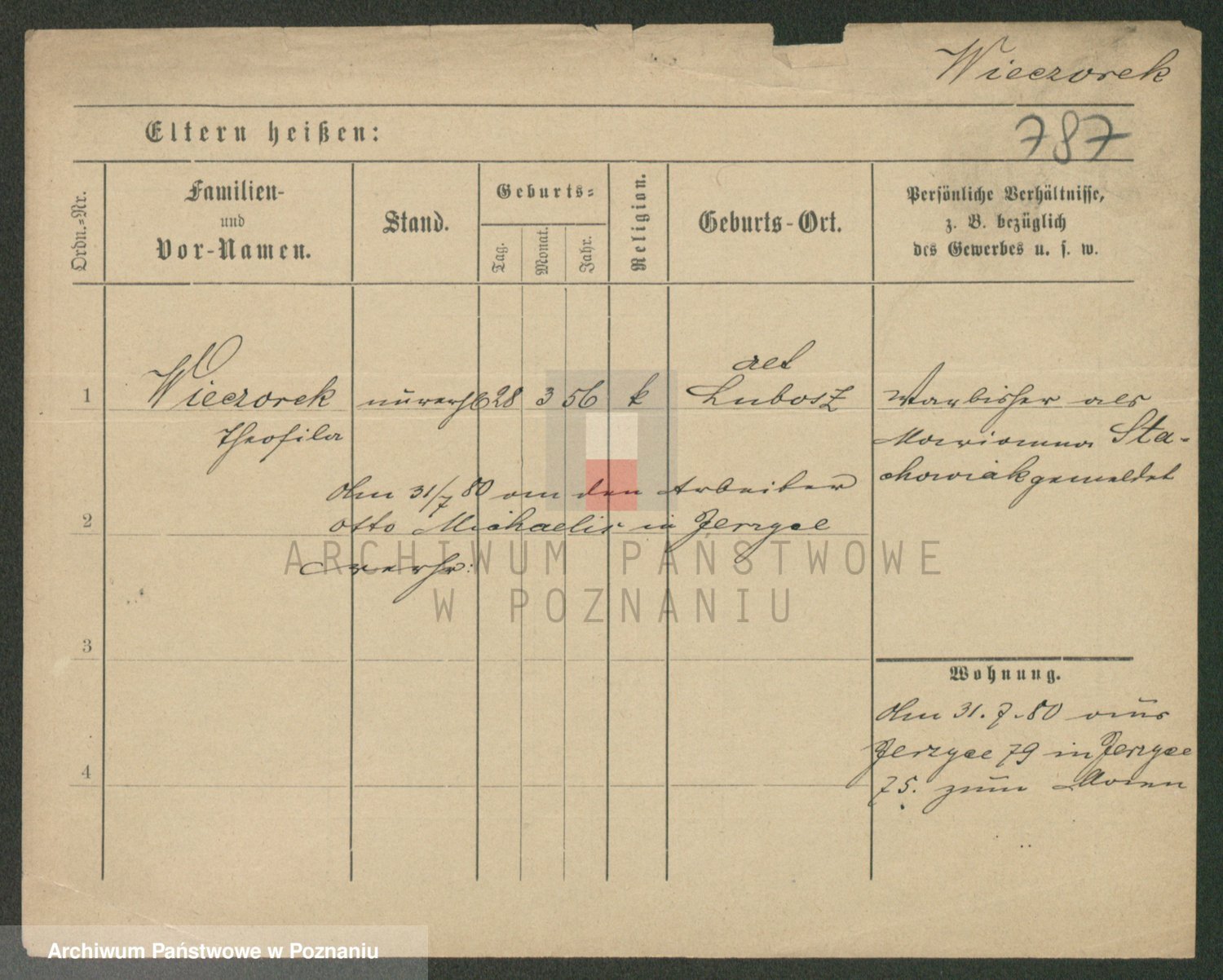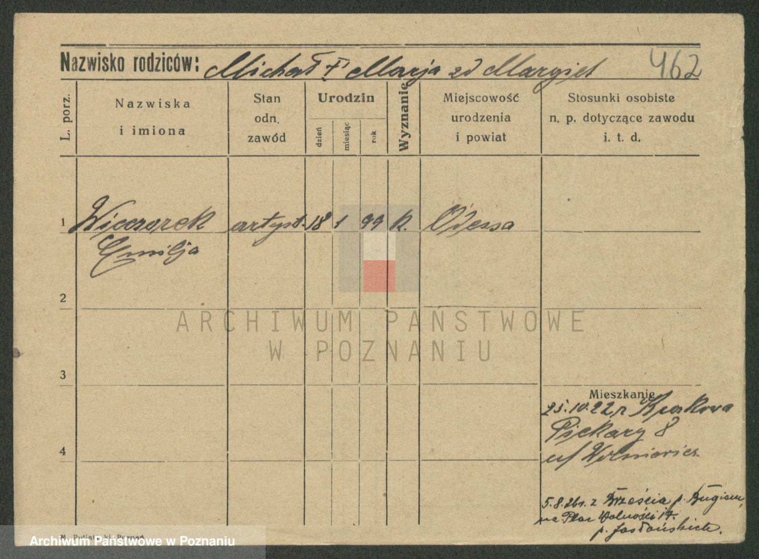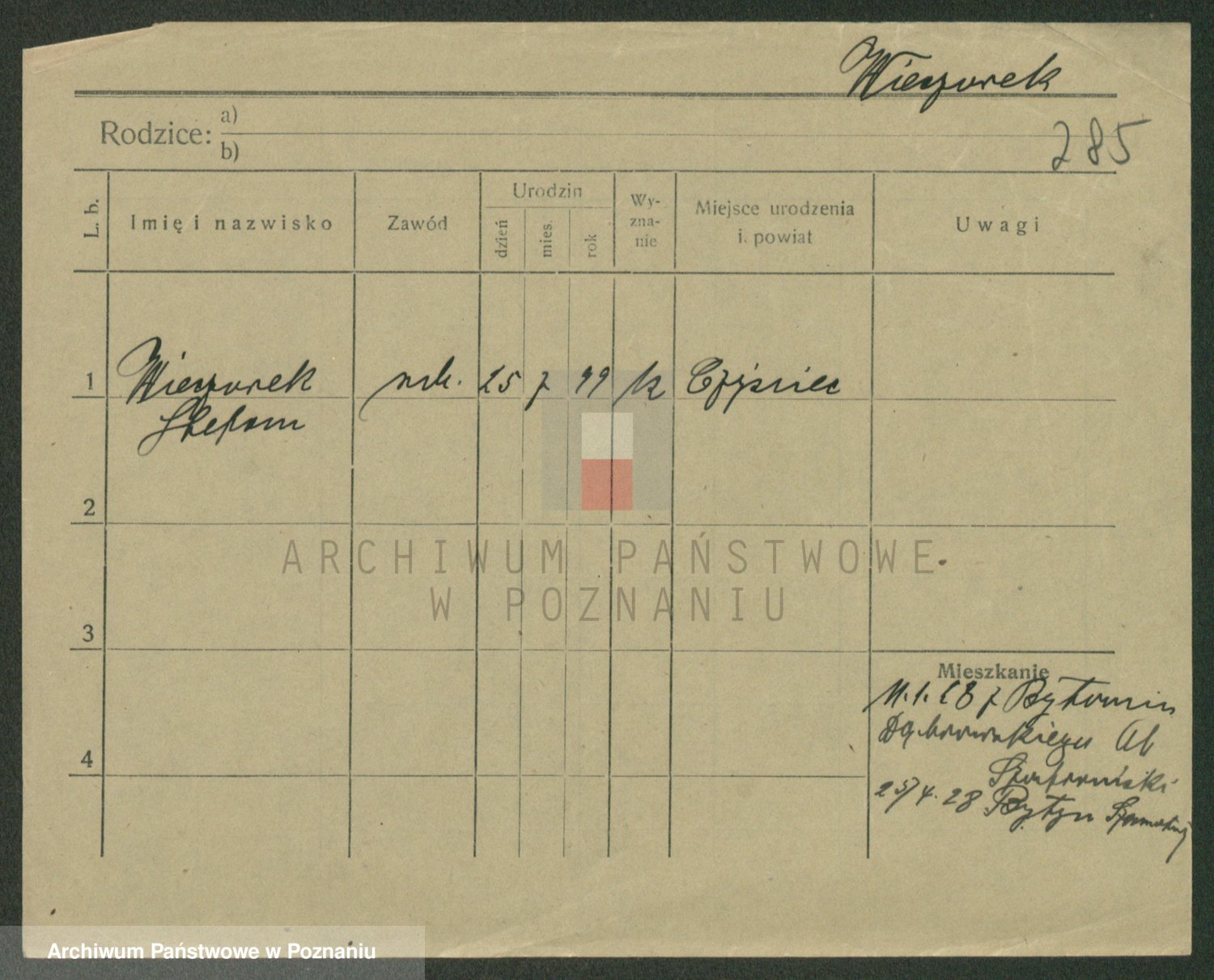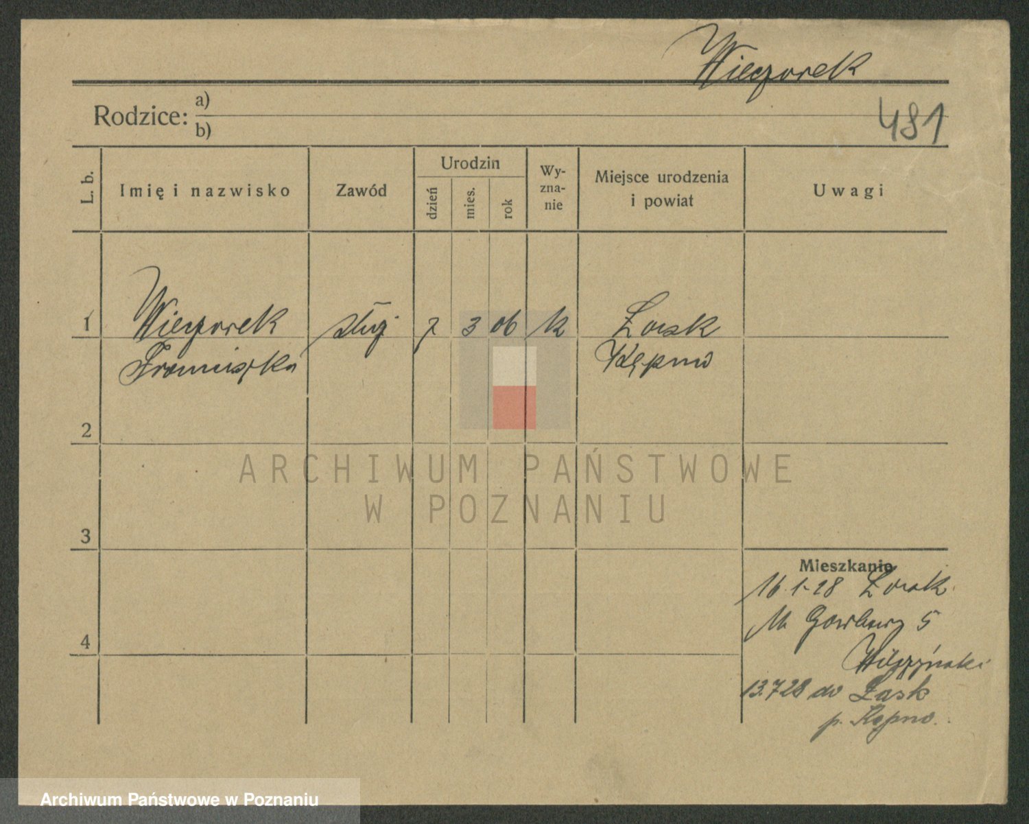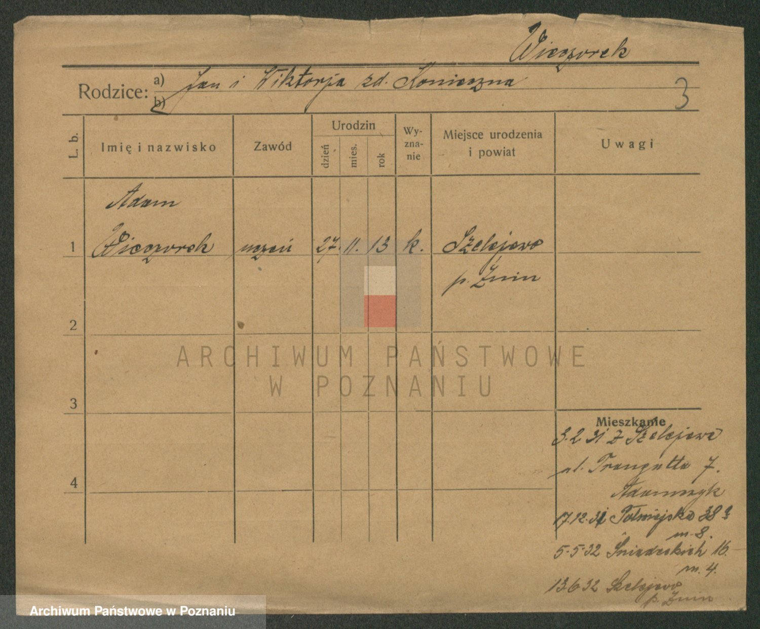 Podgląd karty osobowej dostępny jest po kliknięciu na nazwisko lub ikonkę karty. Można dokonywać powiększenia (ikony na górze) lub przechodzić między kolejnymi skanami (strzałki po bokach).