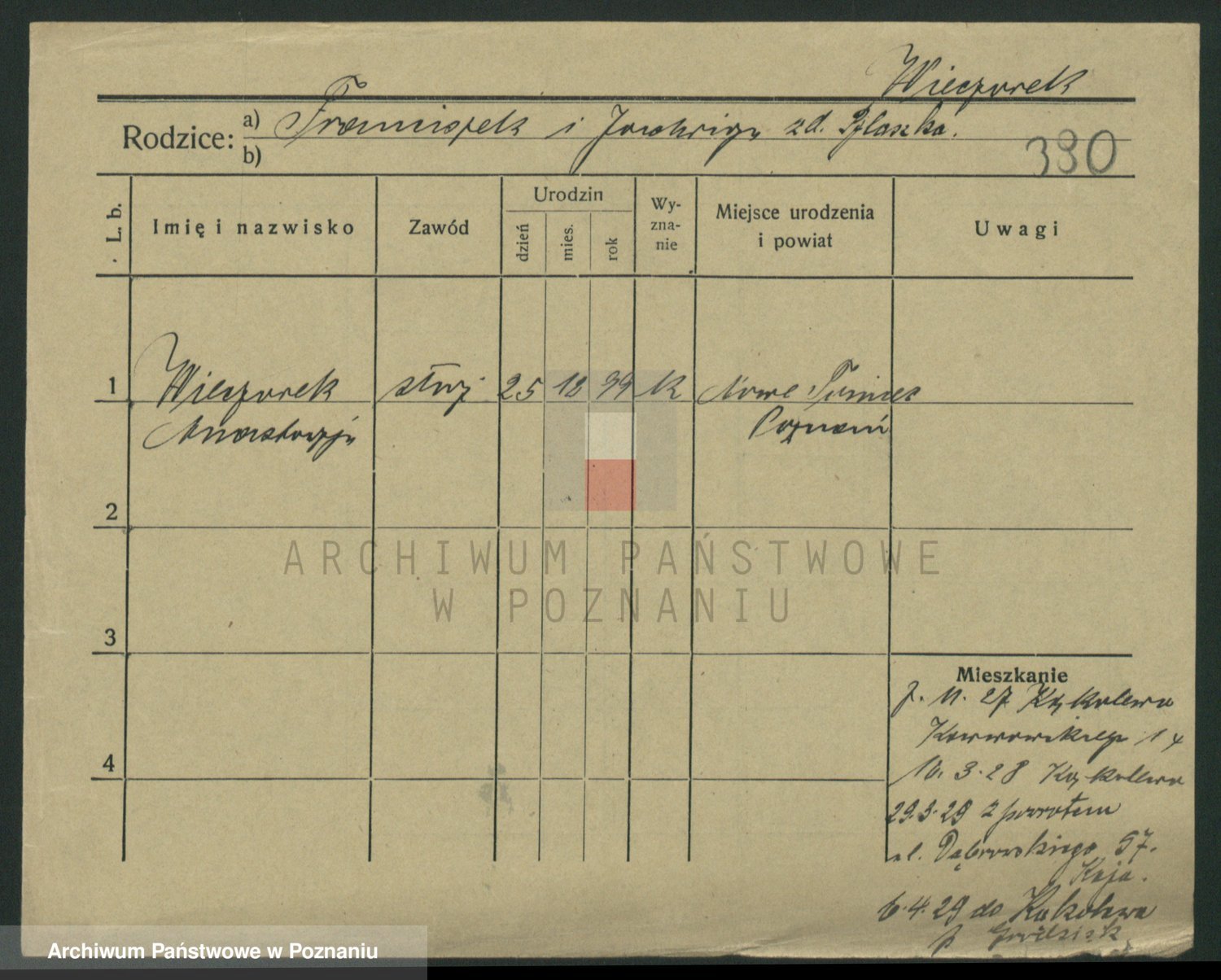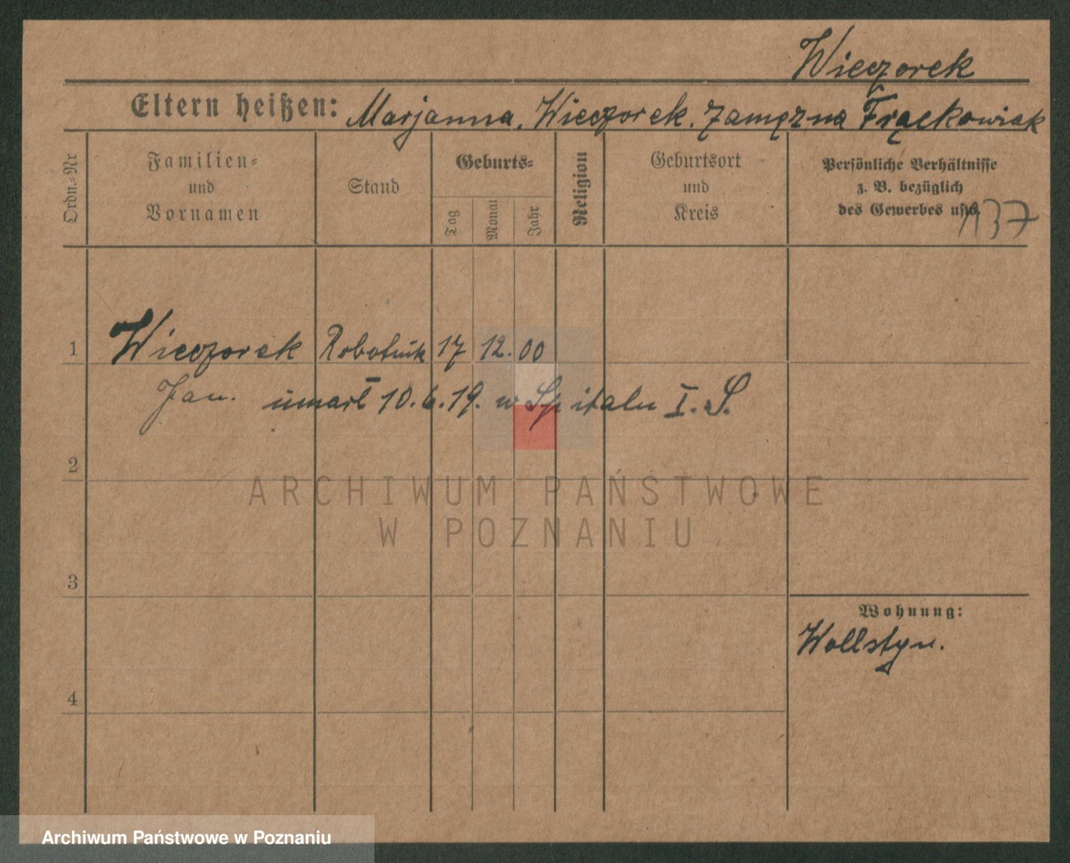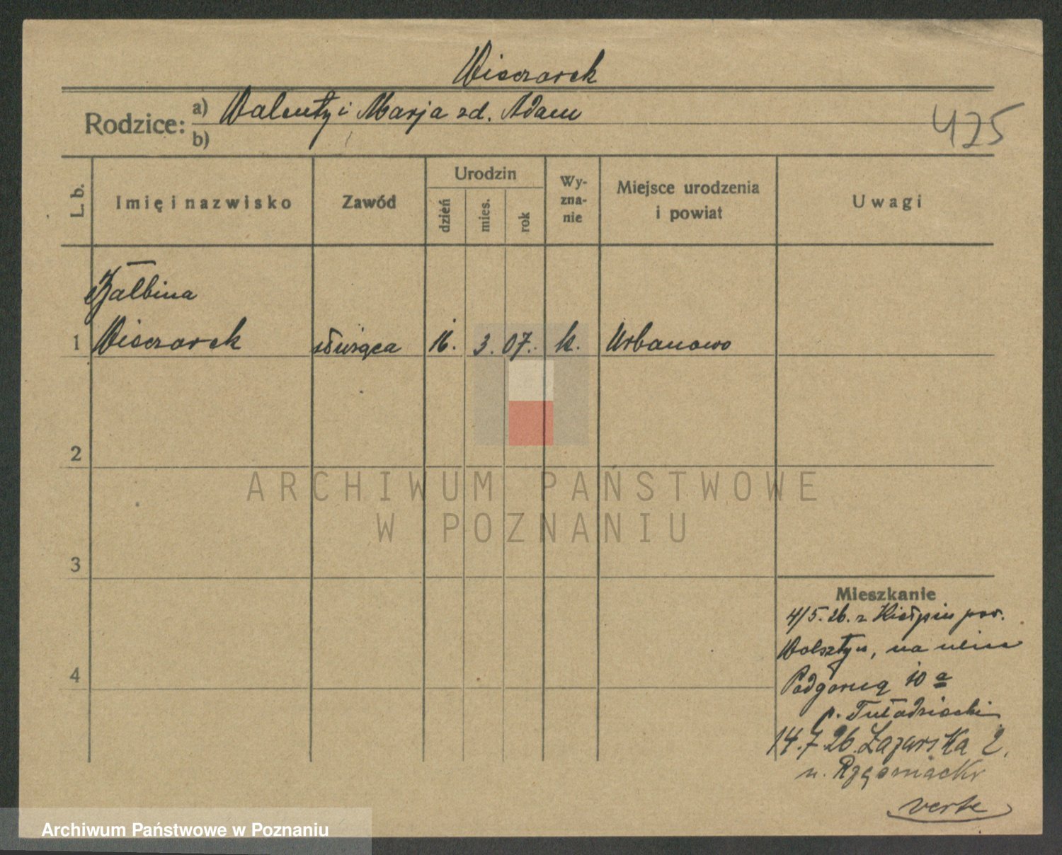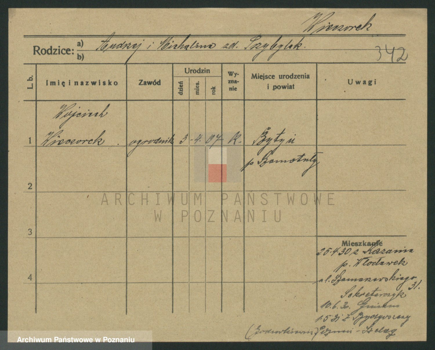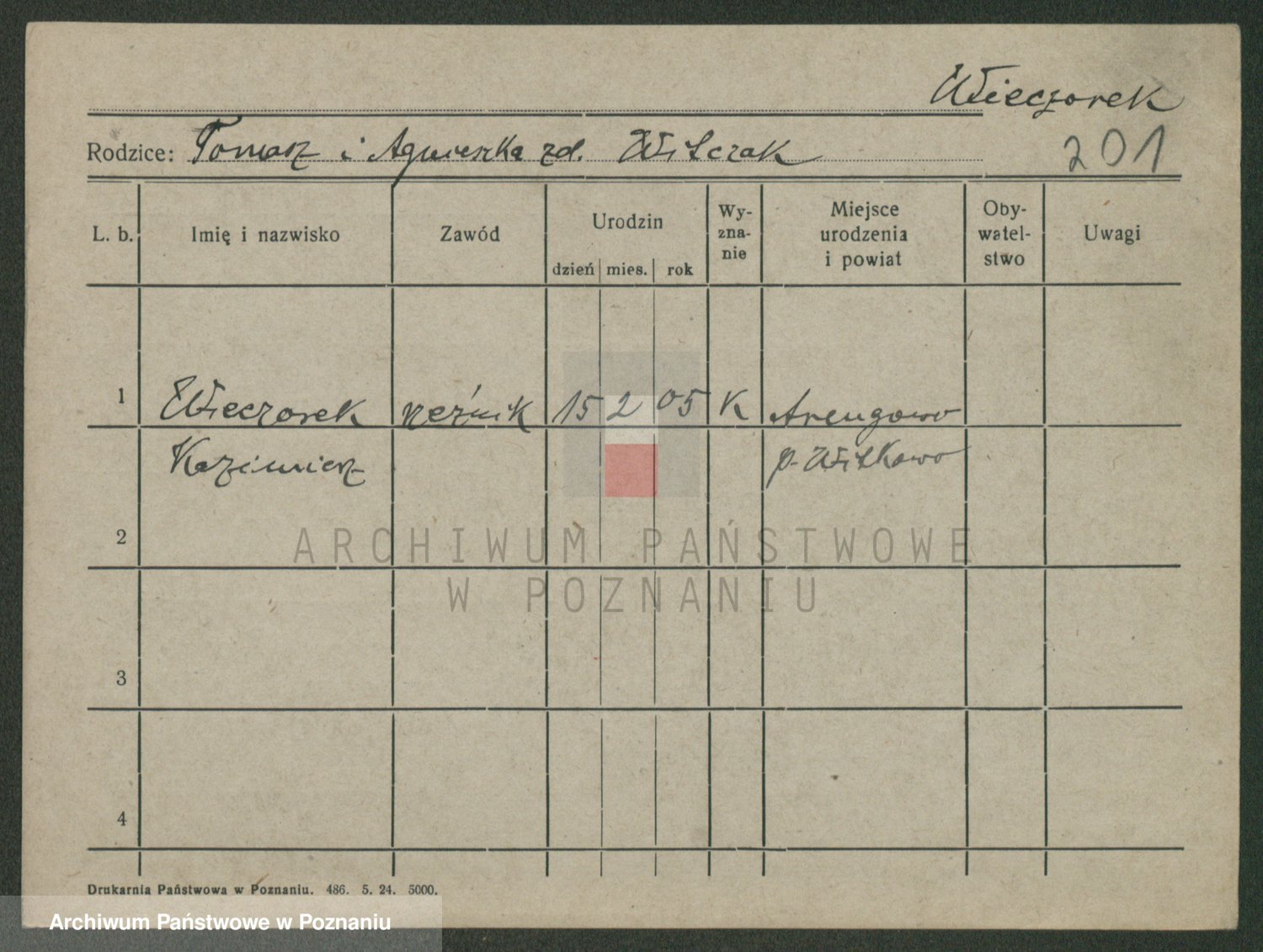 Podgląd karty osobowej dostępny jest po kliknięciu na nazwisko lub ikonkę karty. Można dokonywać powiększenia (ikony na górze) lub przechodzić między kolejnymi skanami (strzałki po bokach).