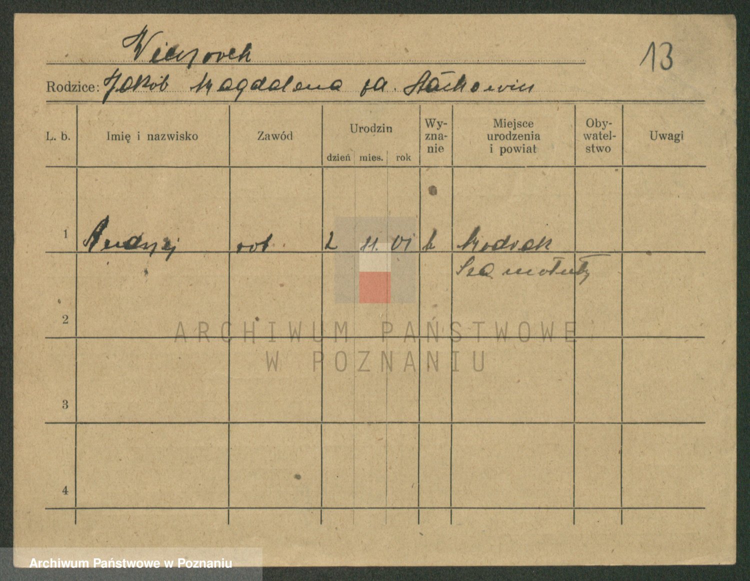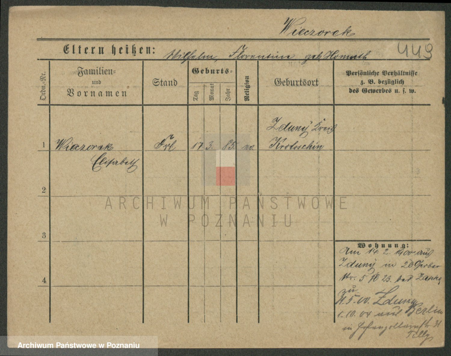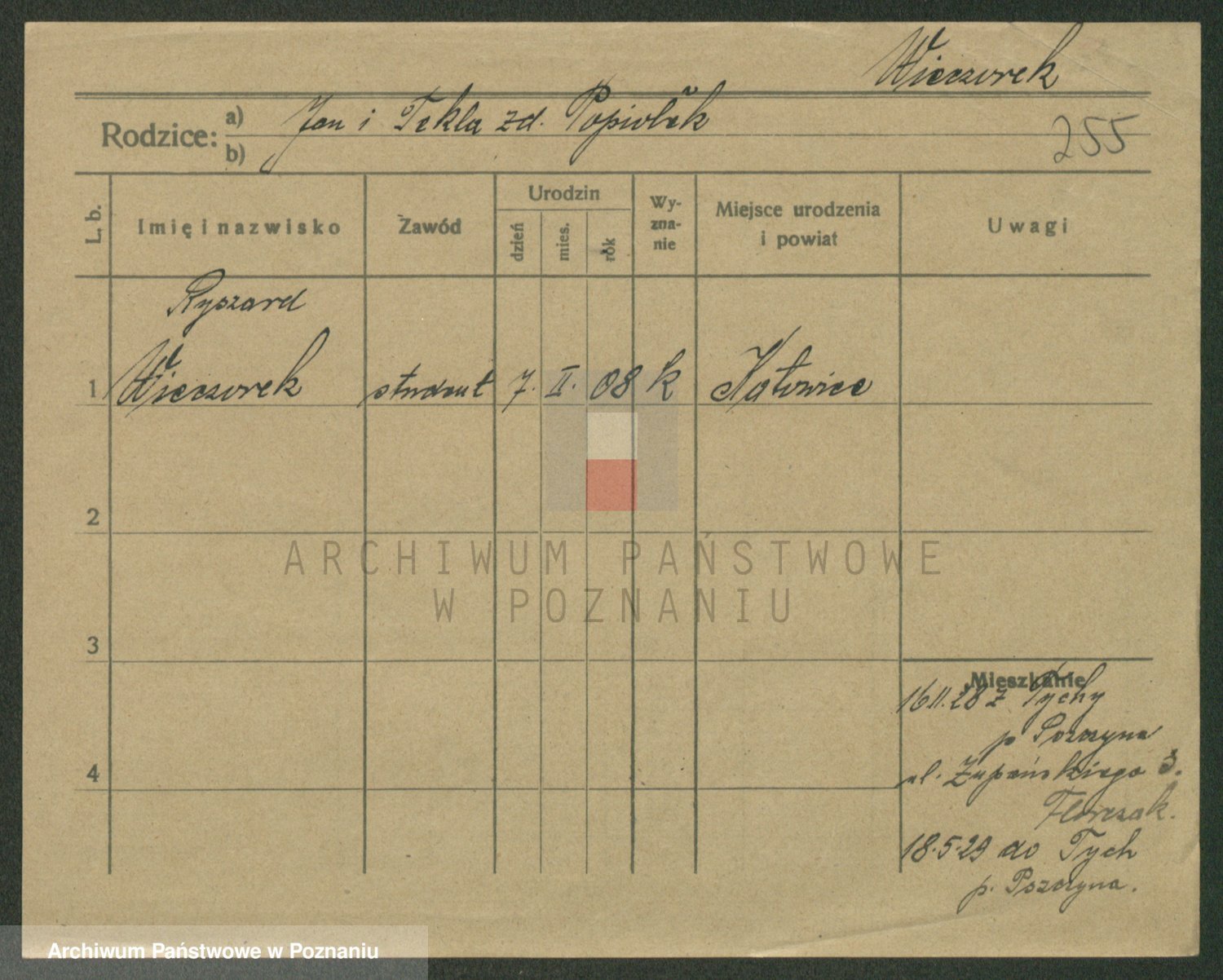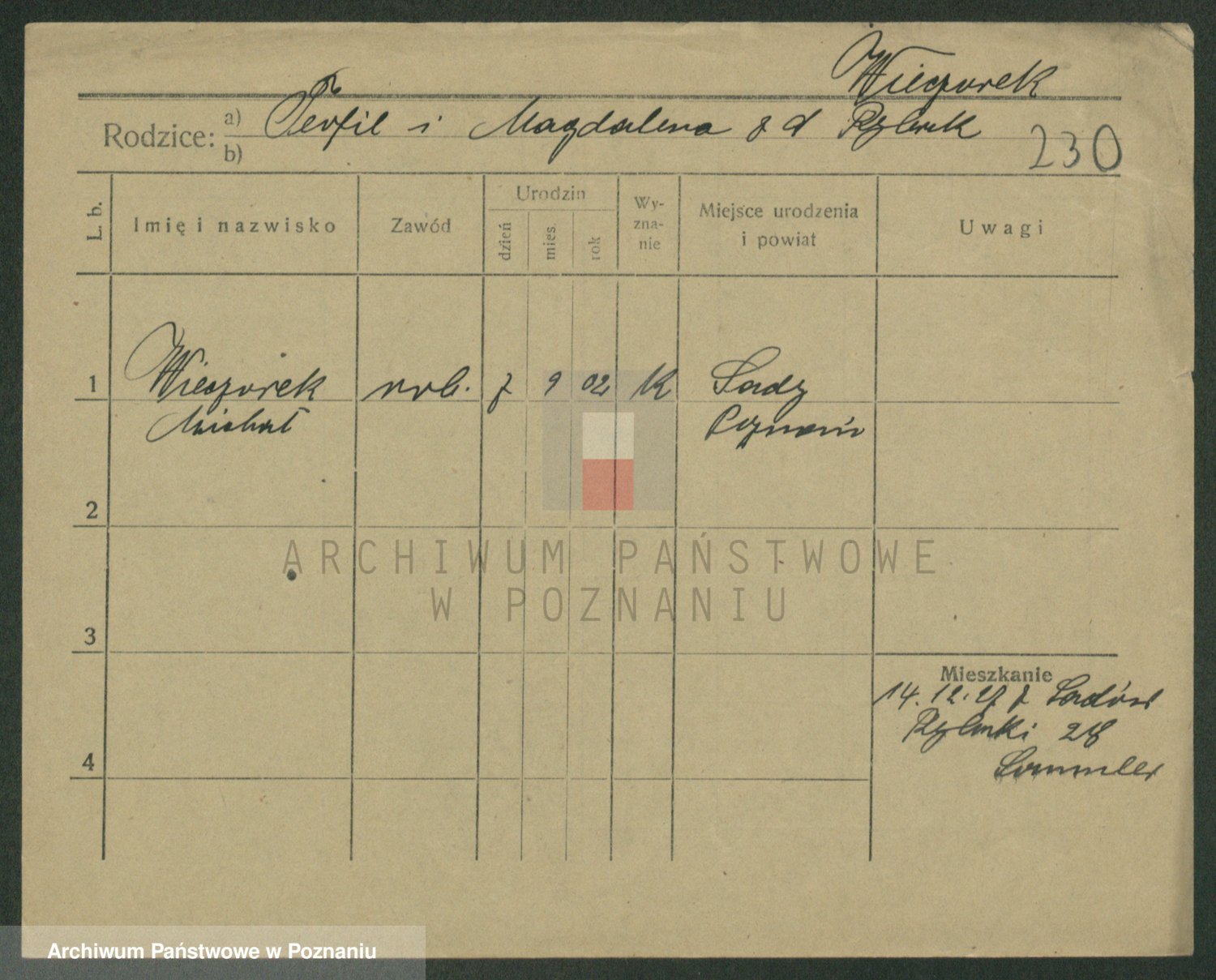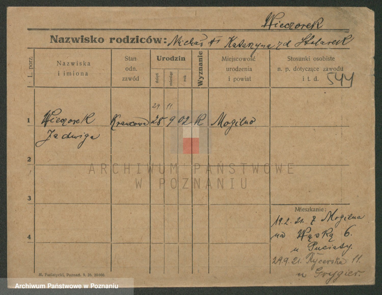 Podgląd karty osobowej dostępny jest po kliknięciu na nazwisko lub ikonkę karty. Można dokonywać powiększenia (ikony na górze) lub przechodzić między kolejnymi skanami (strzałki po bokach).