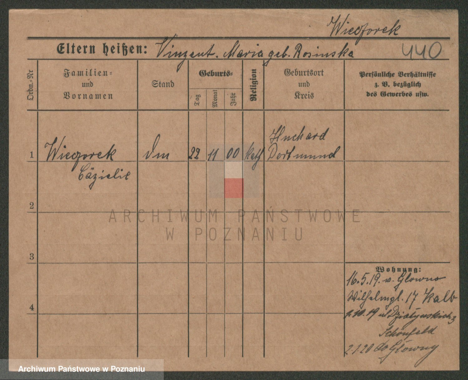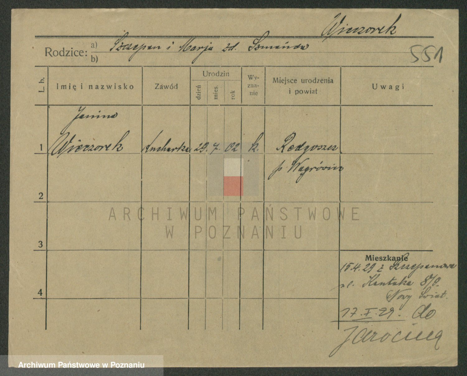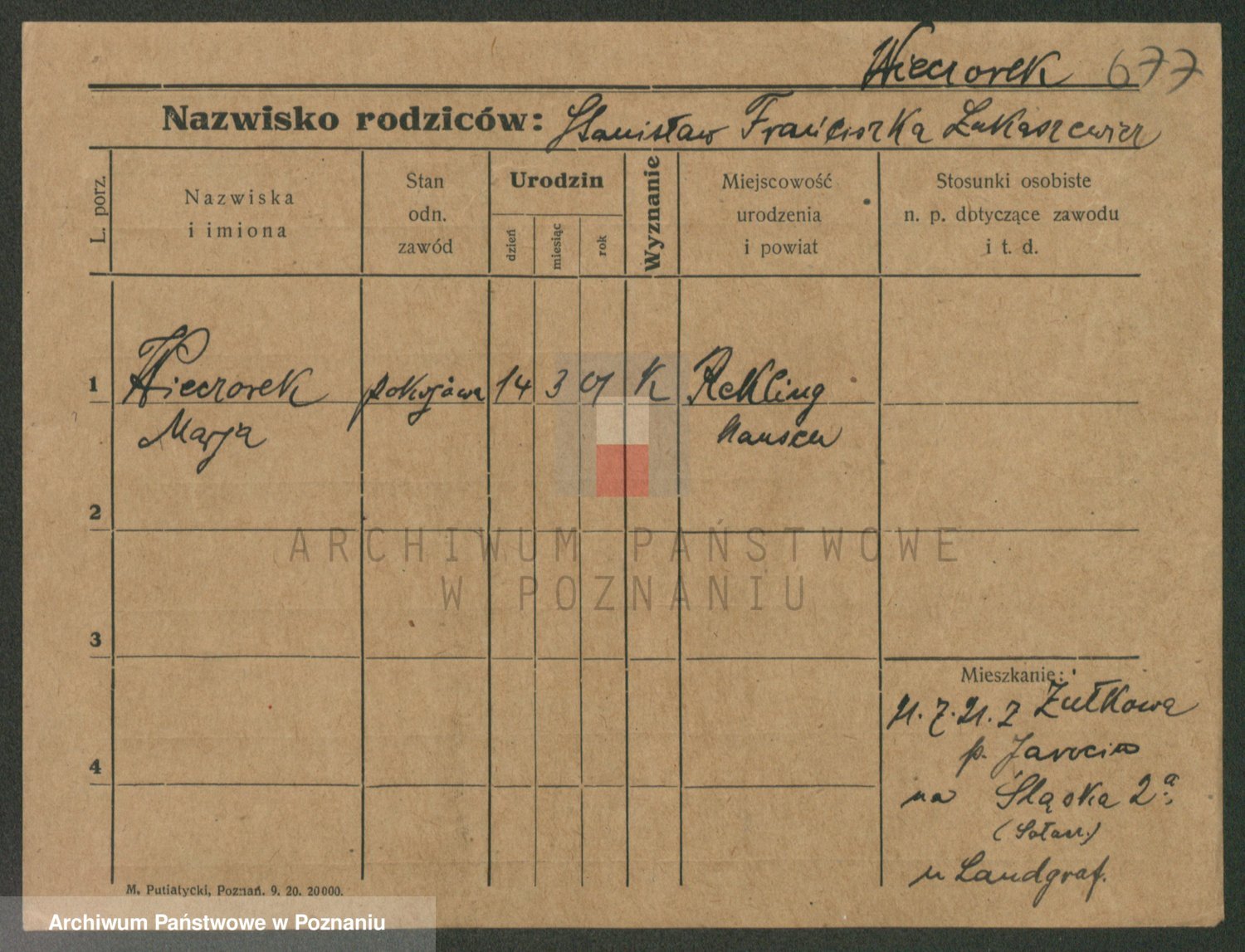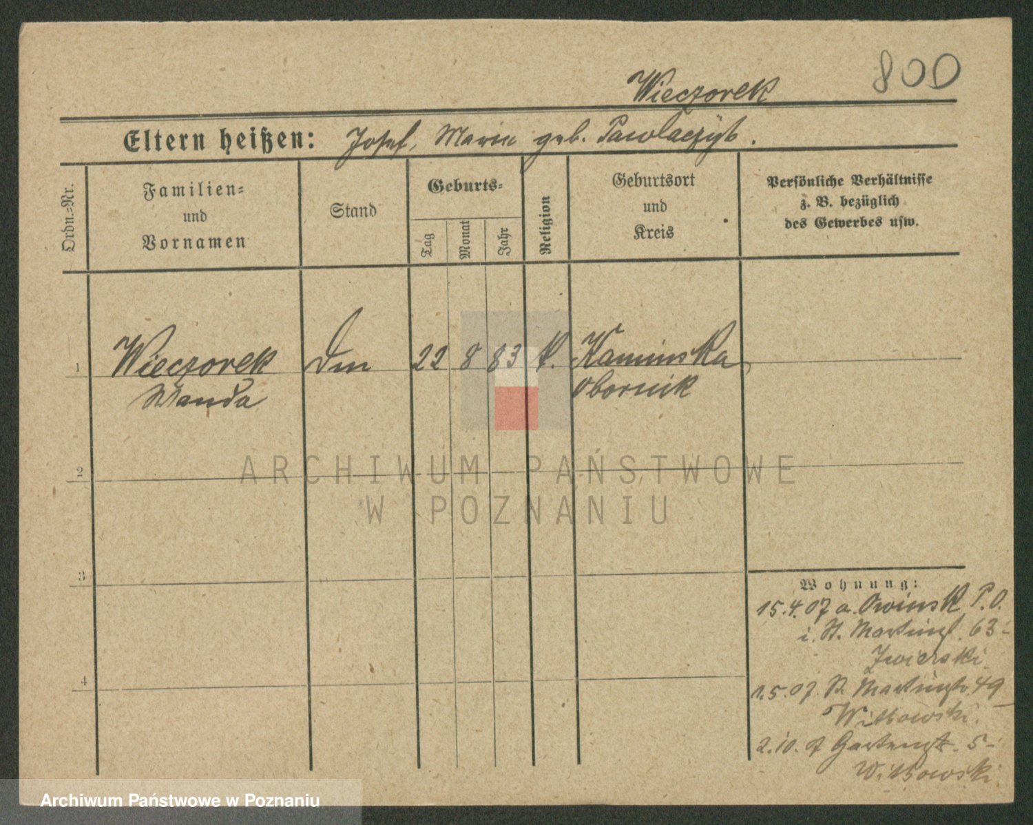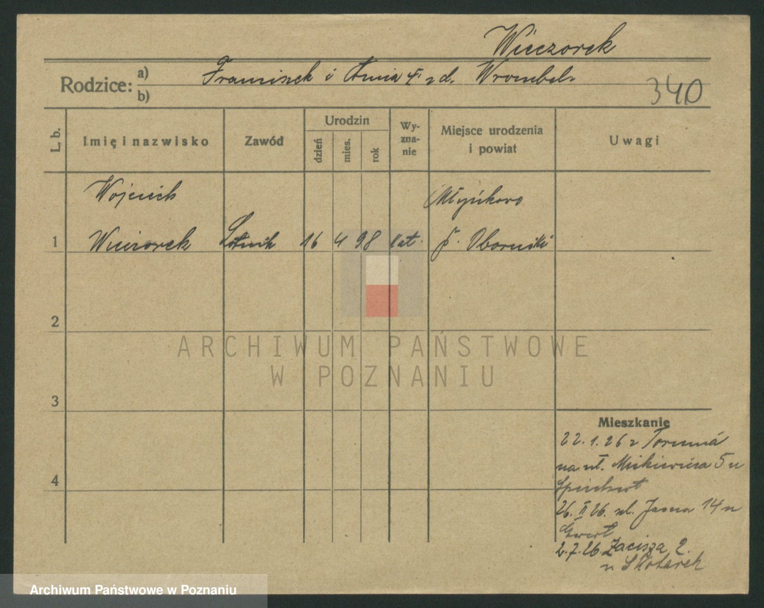 Podgląd karty osobowej dostępny jest po kliknięciu na nazwisko lub ikonkę karty. Można dokonywać powiększenia (ikony na górze) lub przechodzić między kolejnymi skanami (strzałki po bokach).