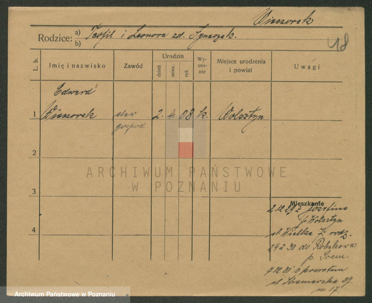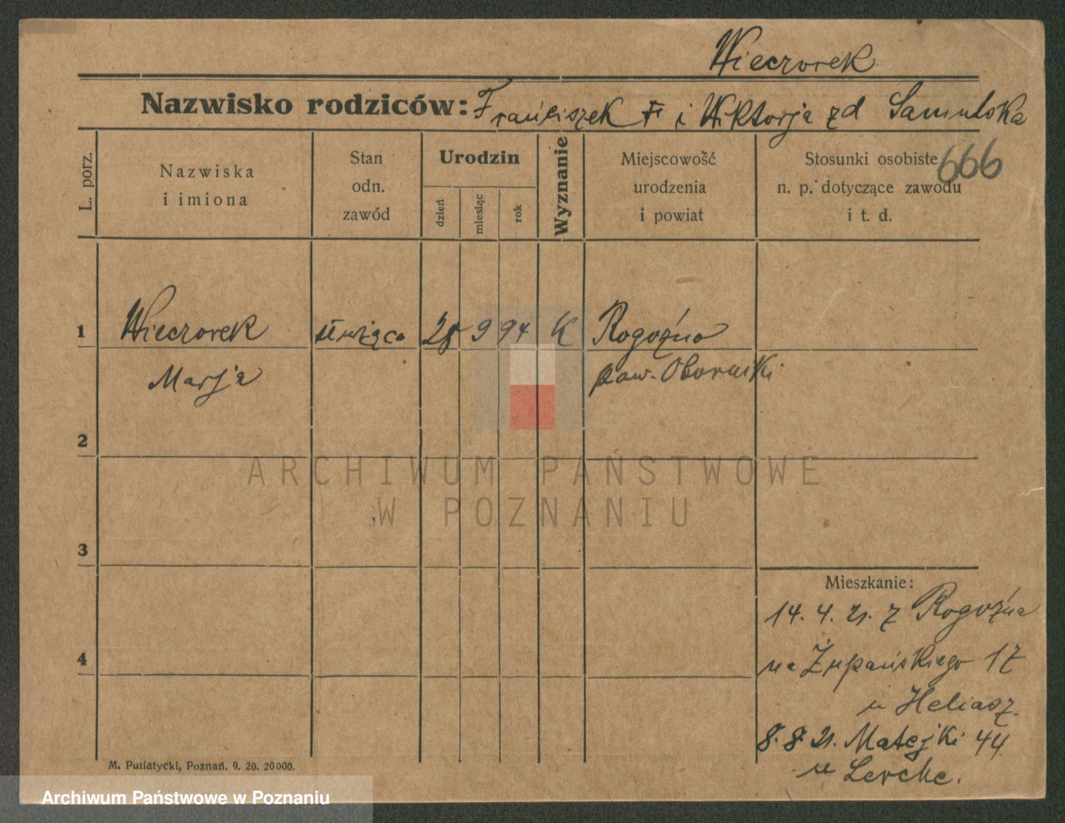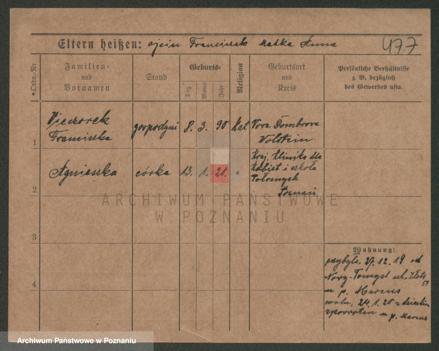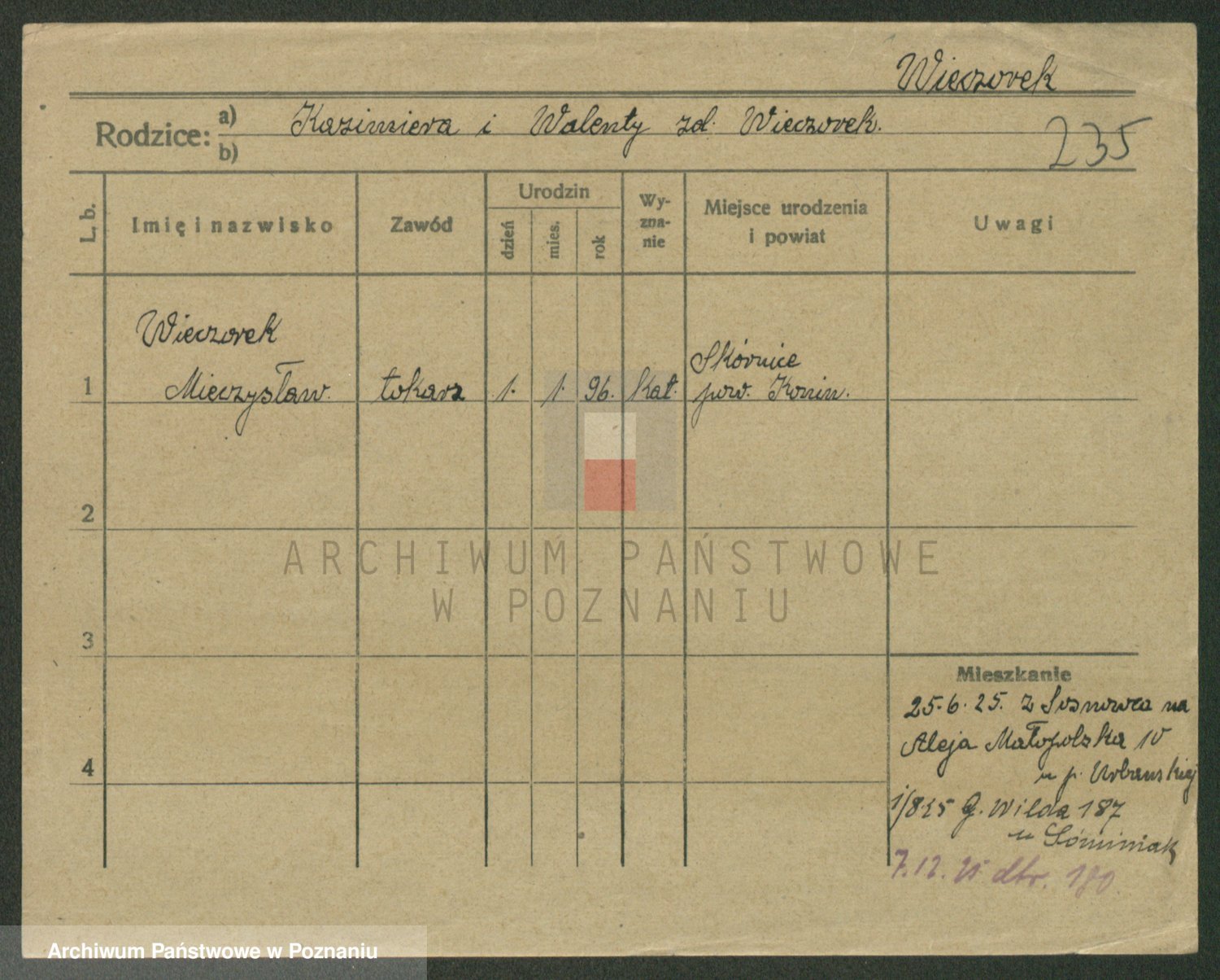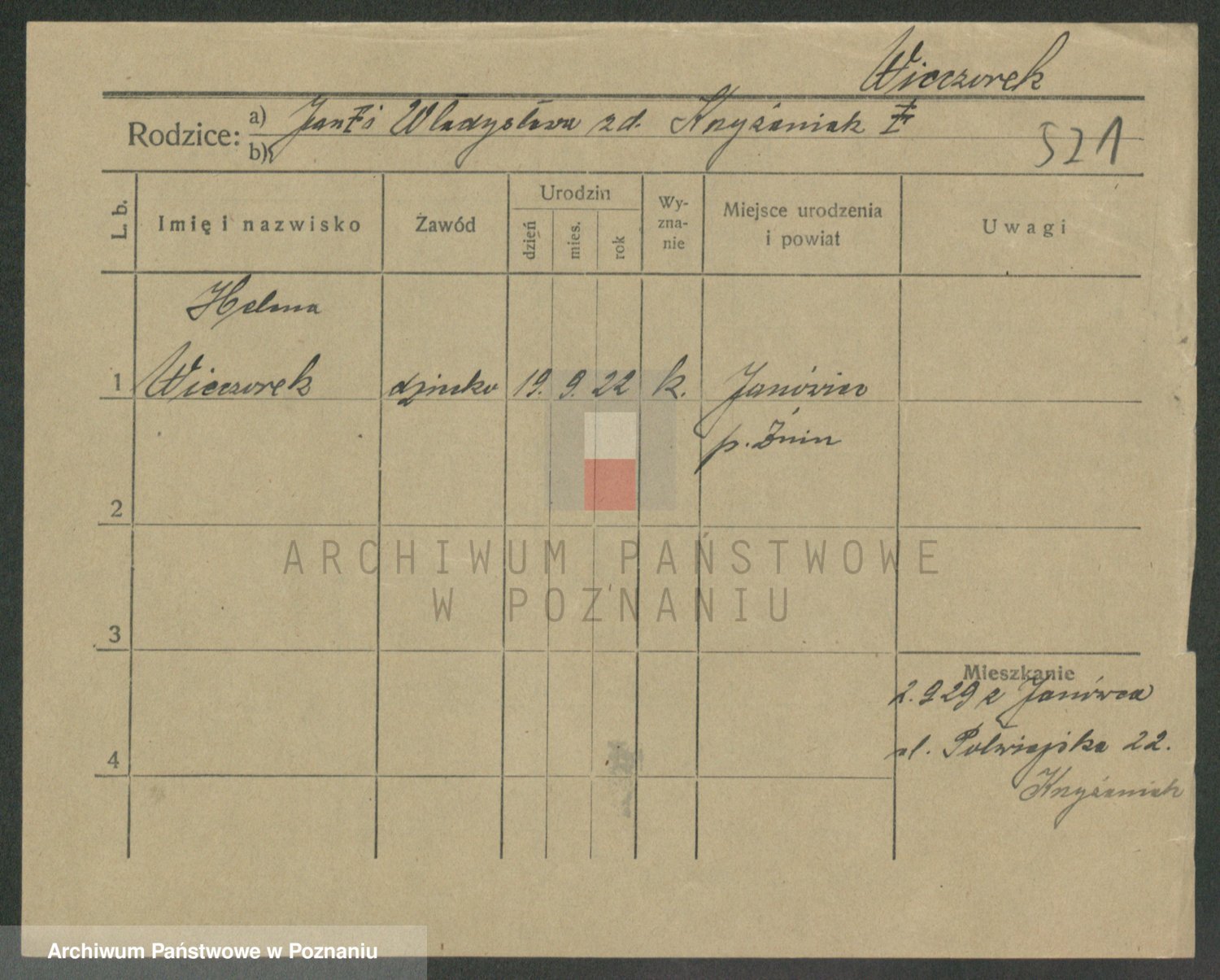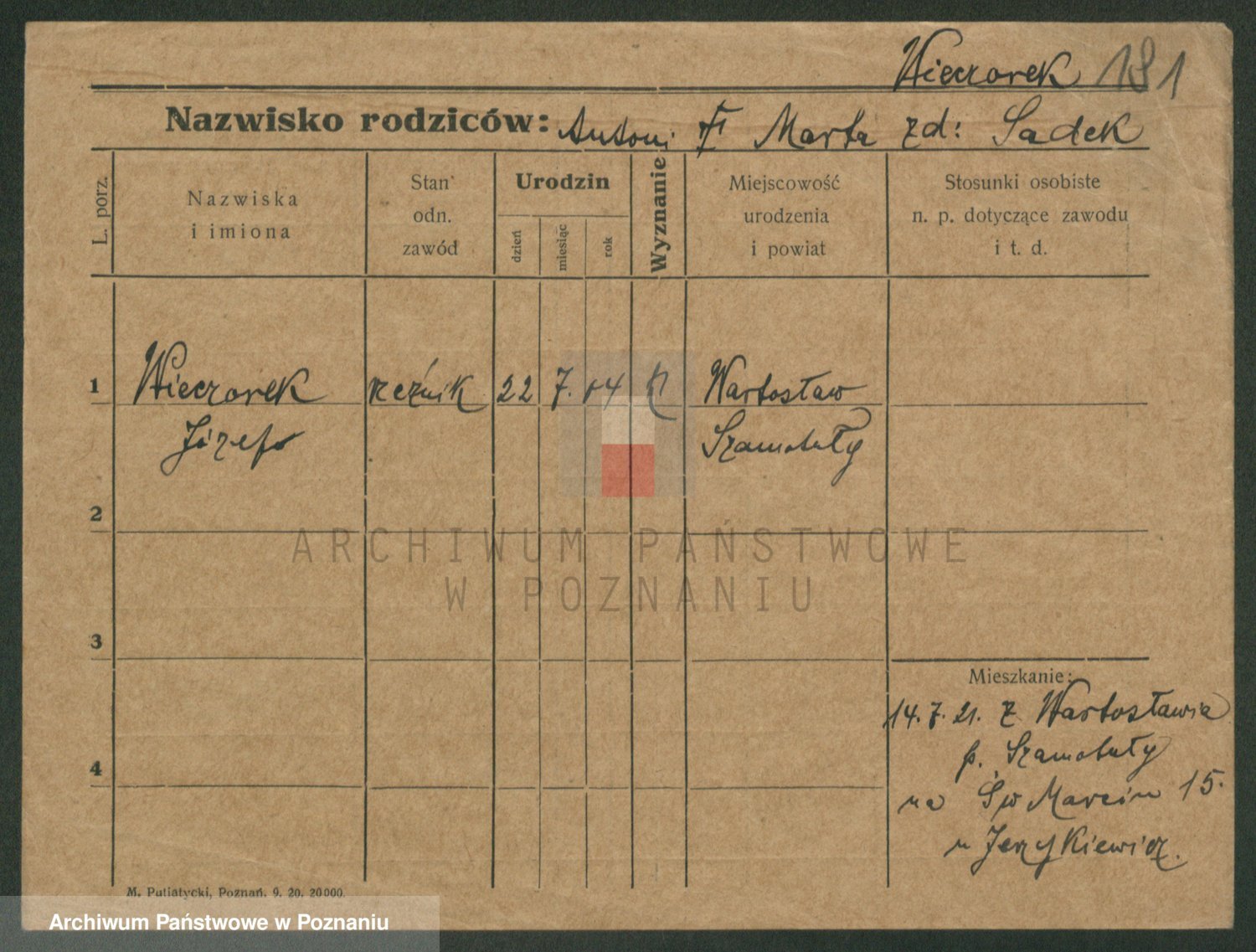 Podgląd karty osobowej dostępny jest po kliknięciu na nazwisko lub ikonkę karty. Można dokonywać powiększenia (ikony na górze) lub przechodzić między kolejnymi skanami (strzałki po bokach).