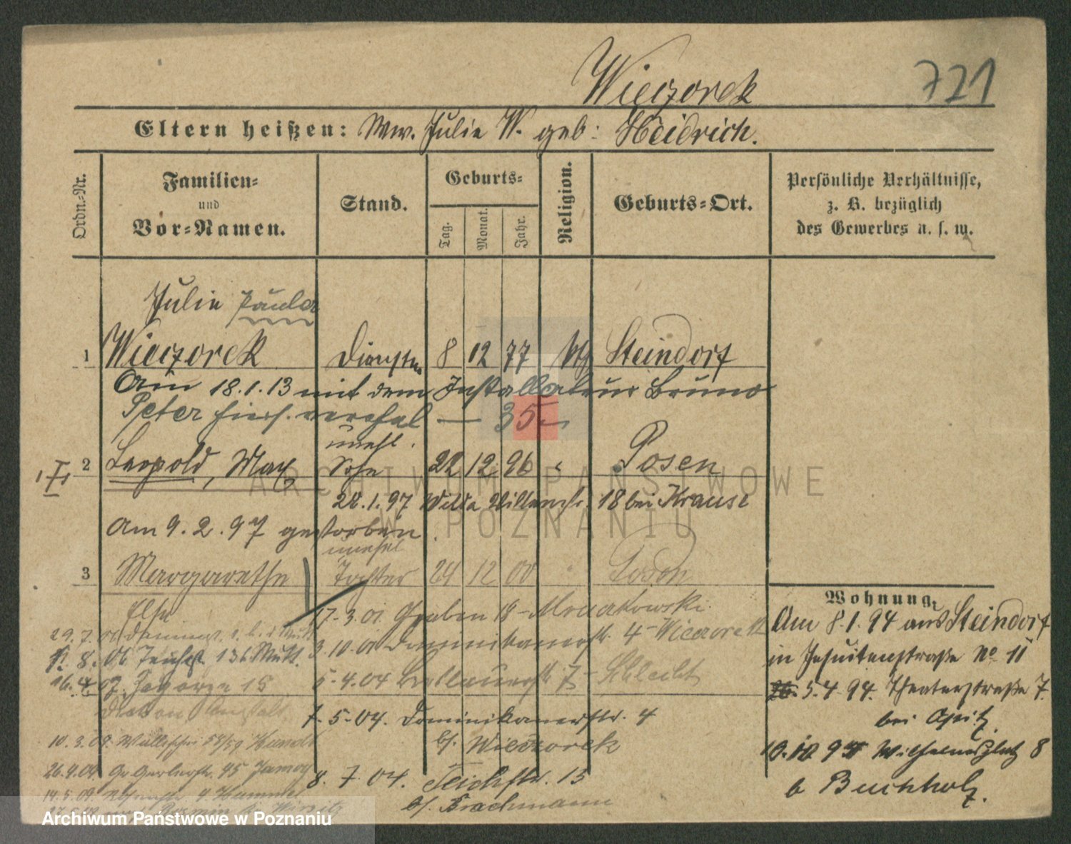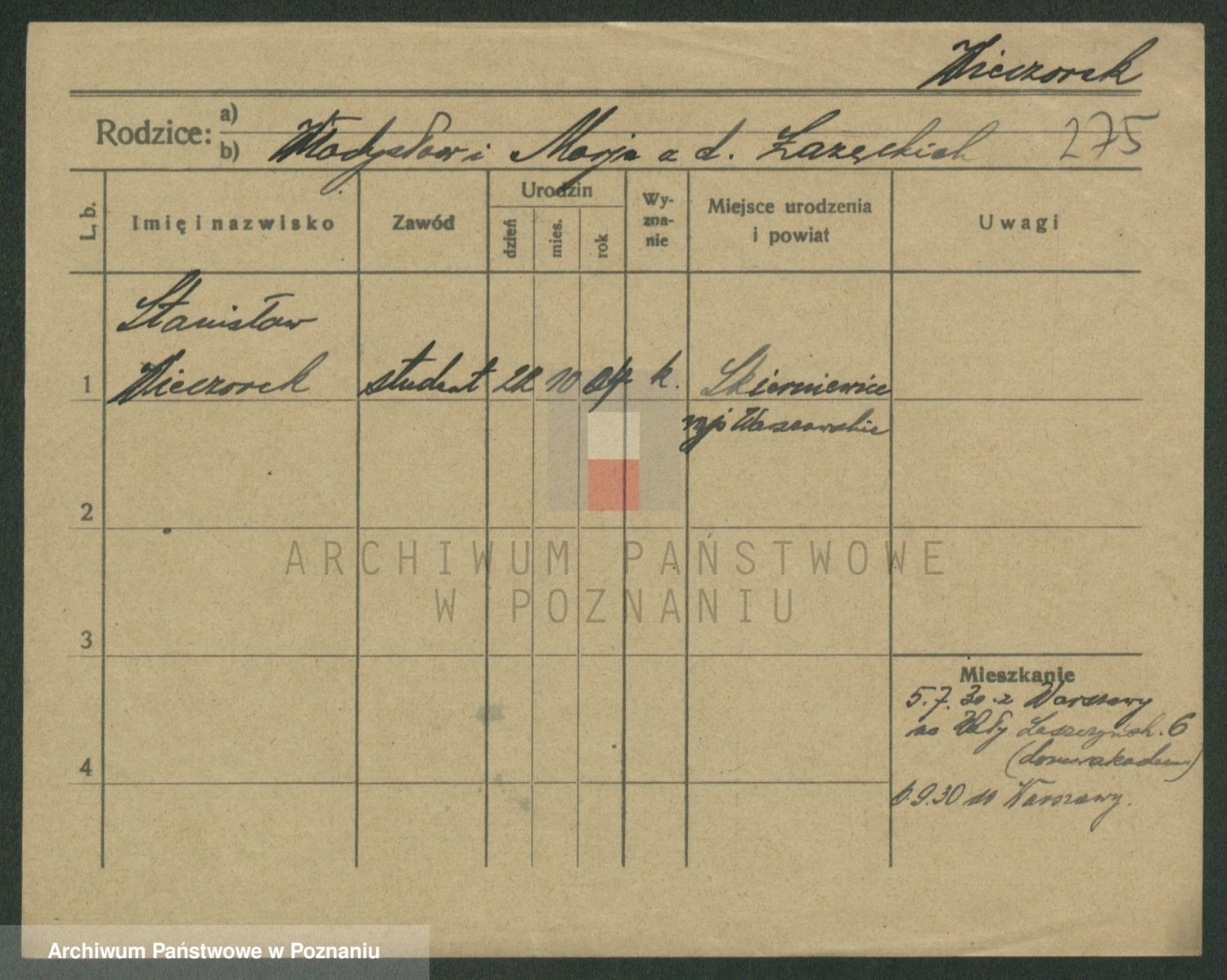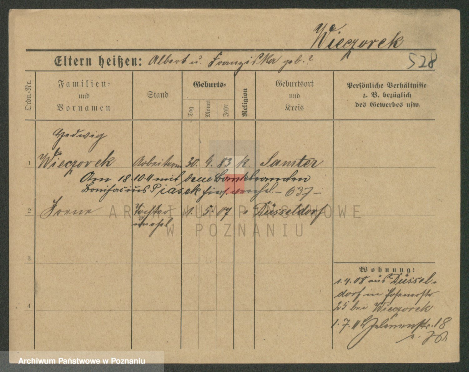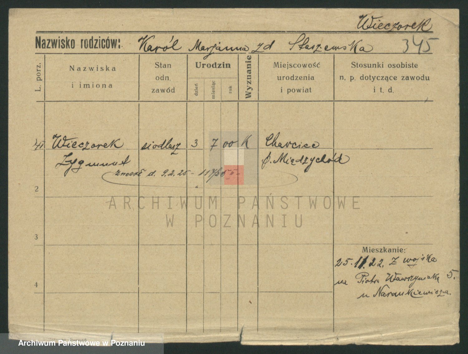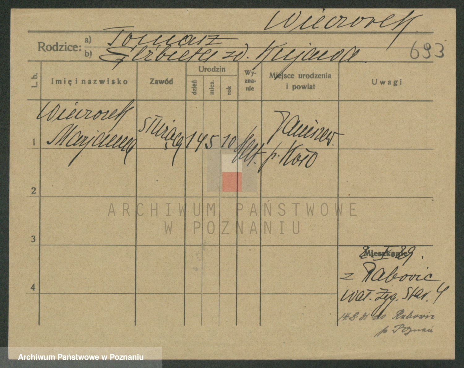 Podgląd karty osobowej dostępny jest po kliknięciu na nazwisko lub ikonkę karty. Można dokonywać powiększenia (ikony na górze) lub przechodzić między kolejnymi skanami (strzałki po bokach).
