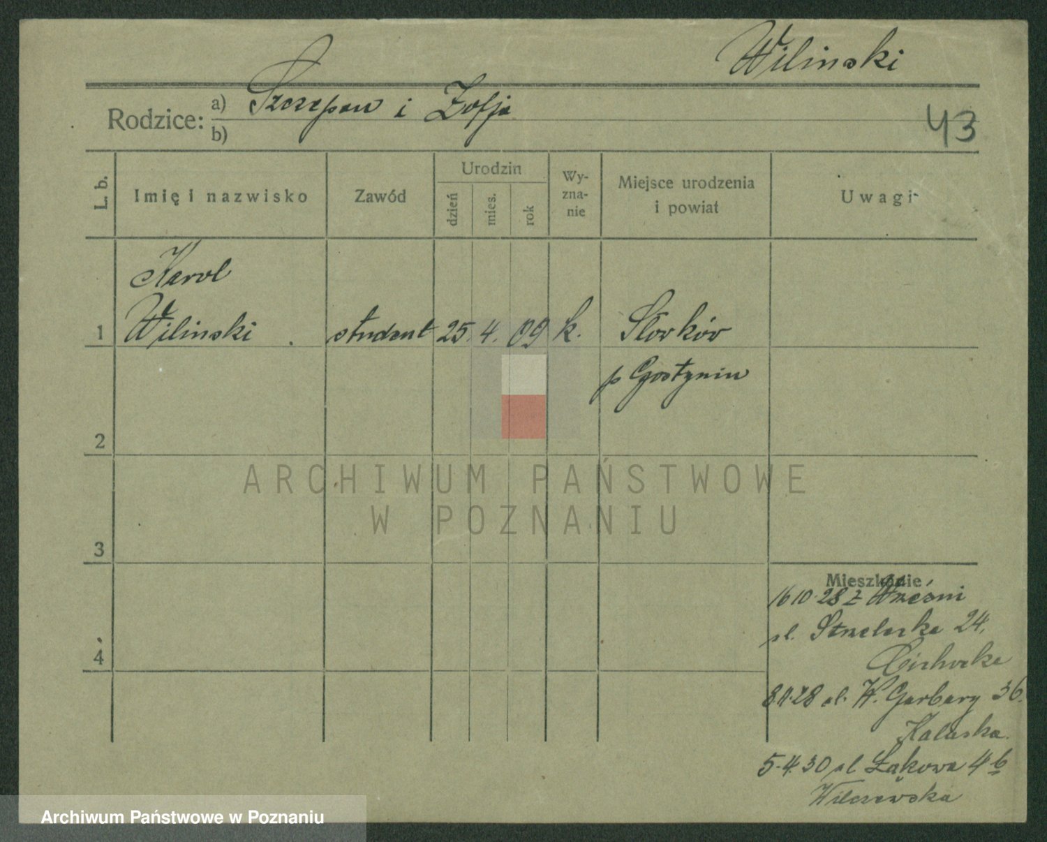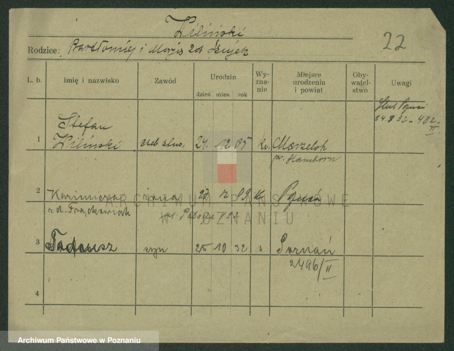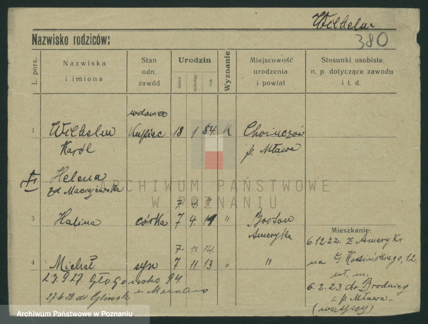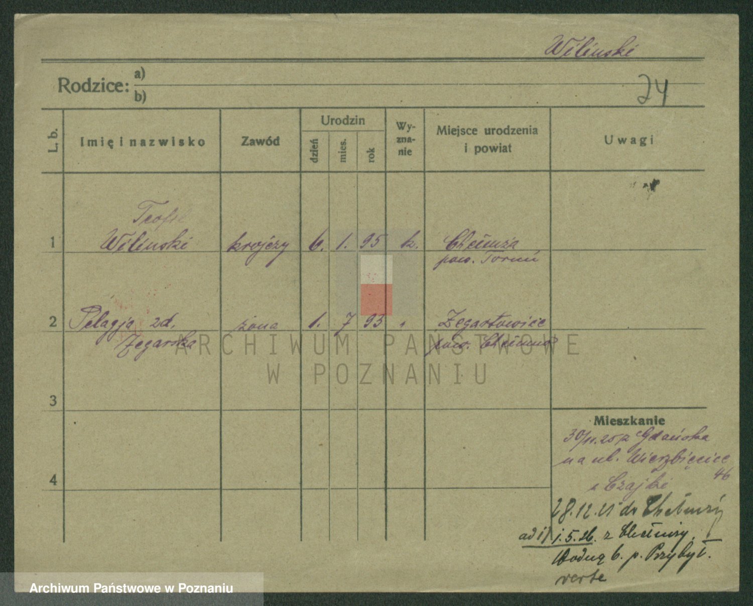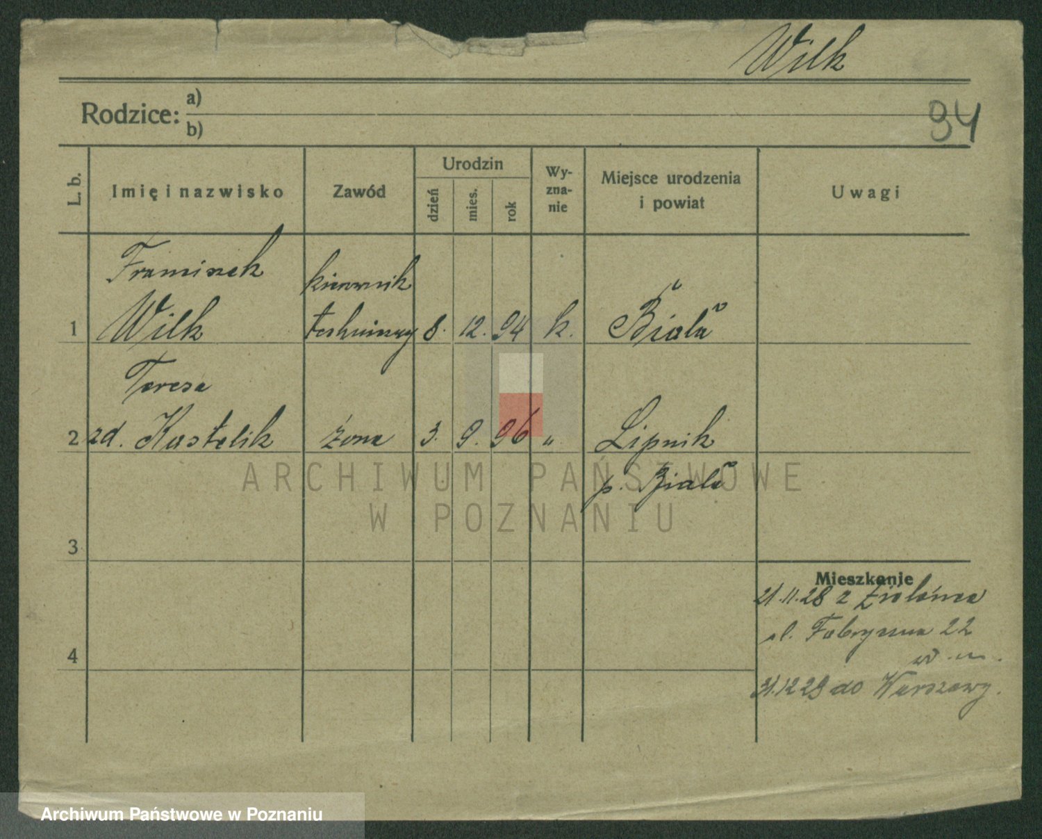 Podgląd karty osobowej dostępny jest po kliknięciu na nazwisko lub ikonkę karty. Można dokonywać powiększenia (ikony na górze) lub przechodzić między kolejnymi skanami (strzałki po bokach).