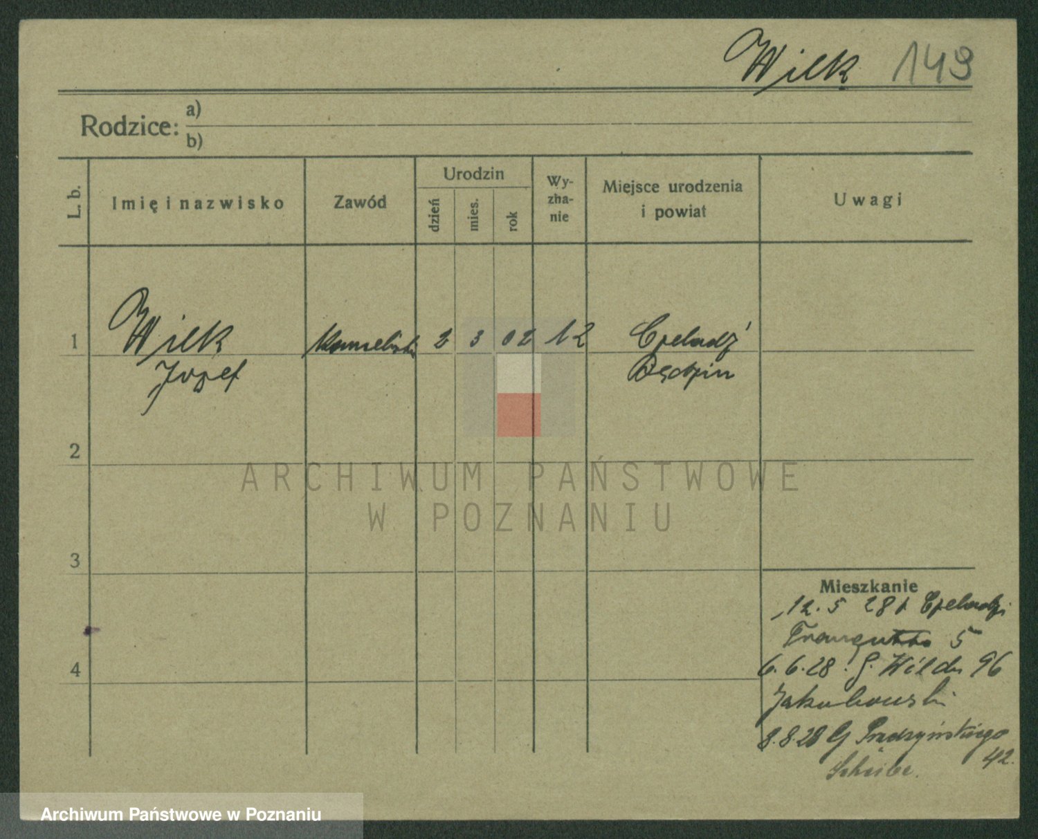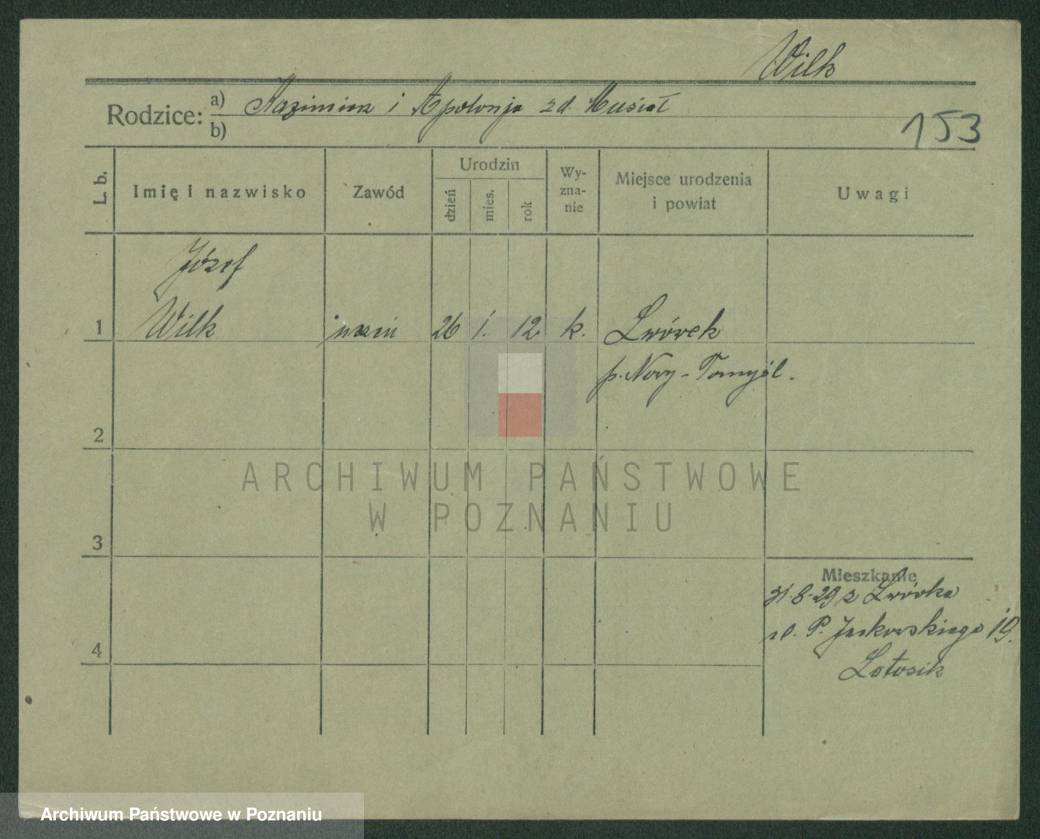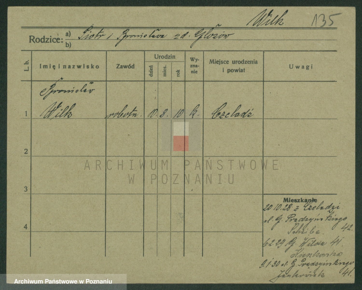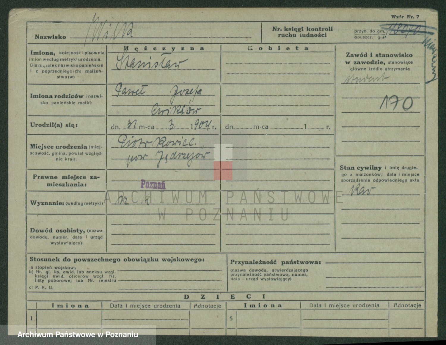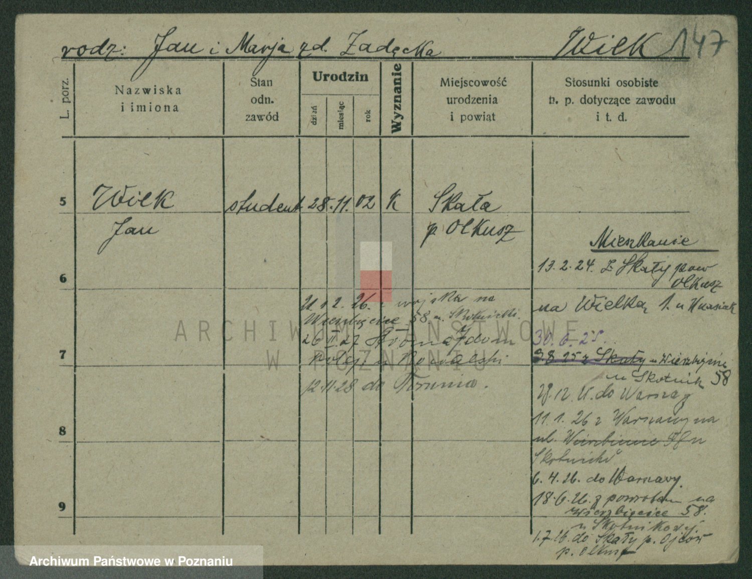 Podgląd karty osobowej dostępny jest po kliknięciu na nazwisko lub ikonkę karty. Można dokonywać powiększenia (ikony na górze) lub przechodzić między kolejnymi skanami (strzałki po bokach).