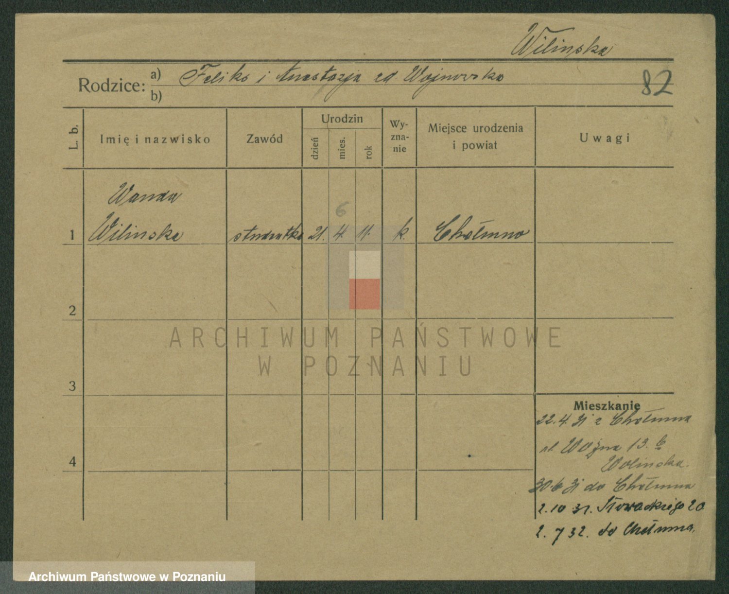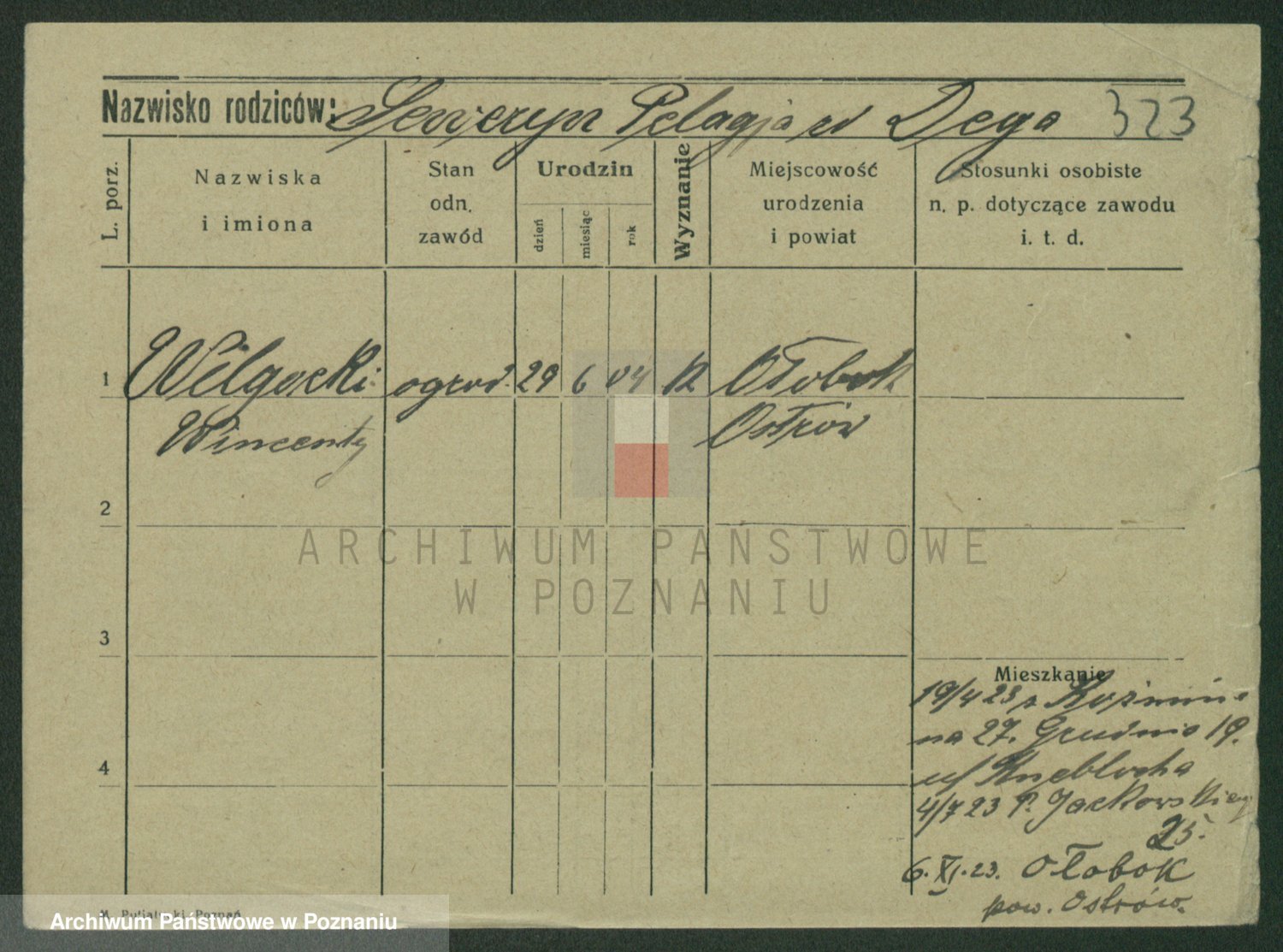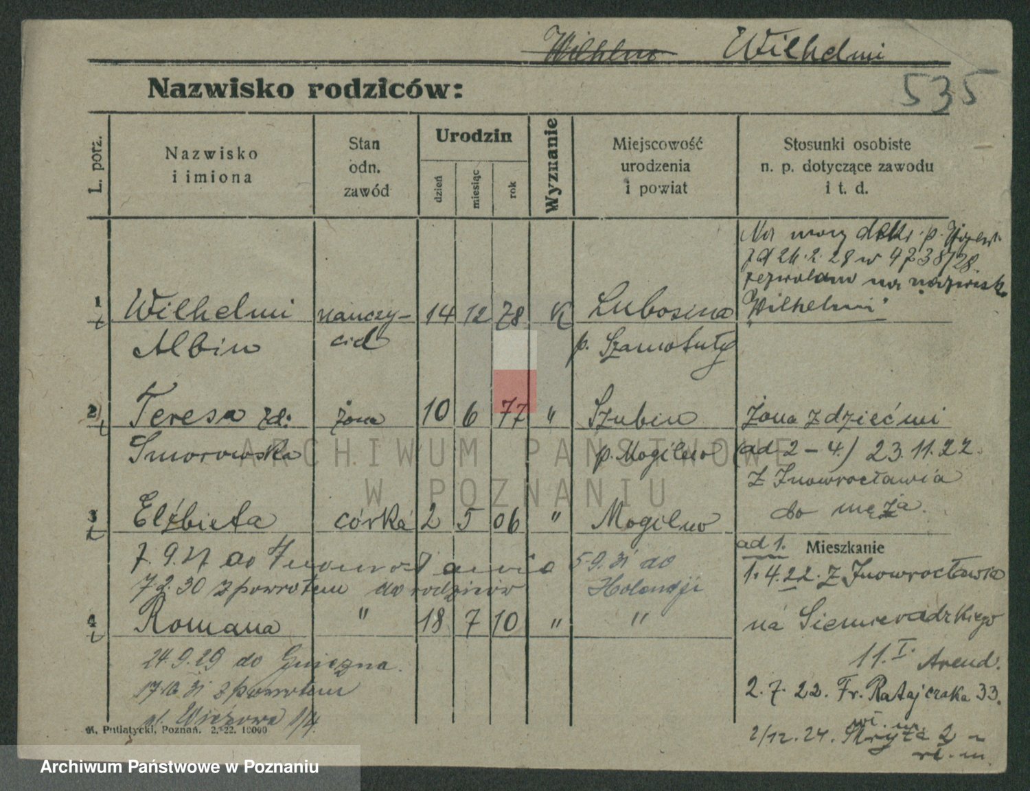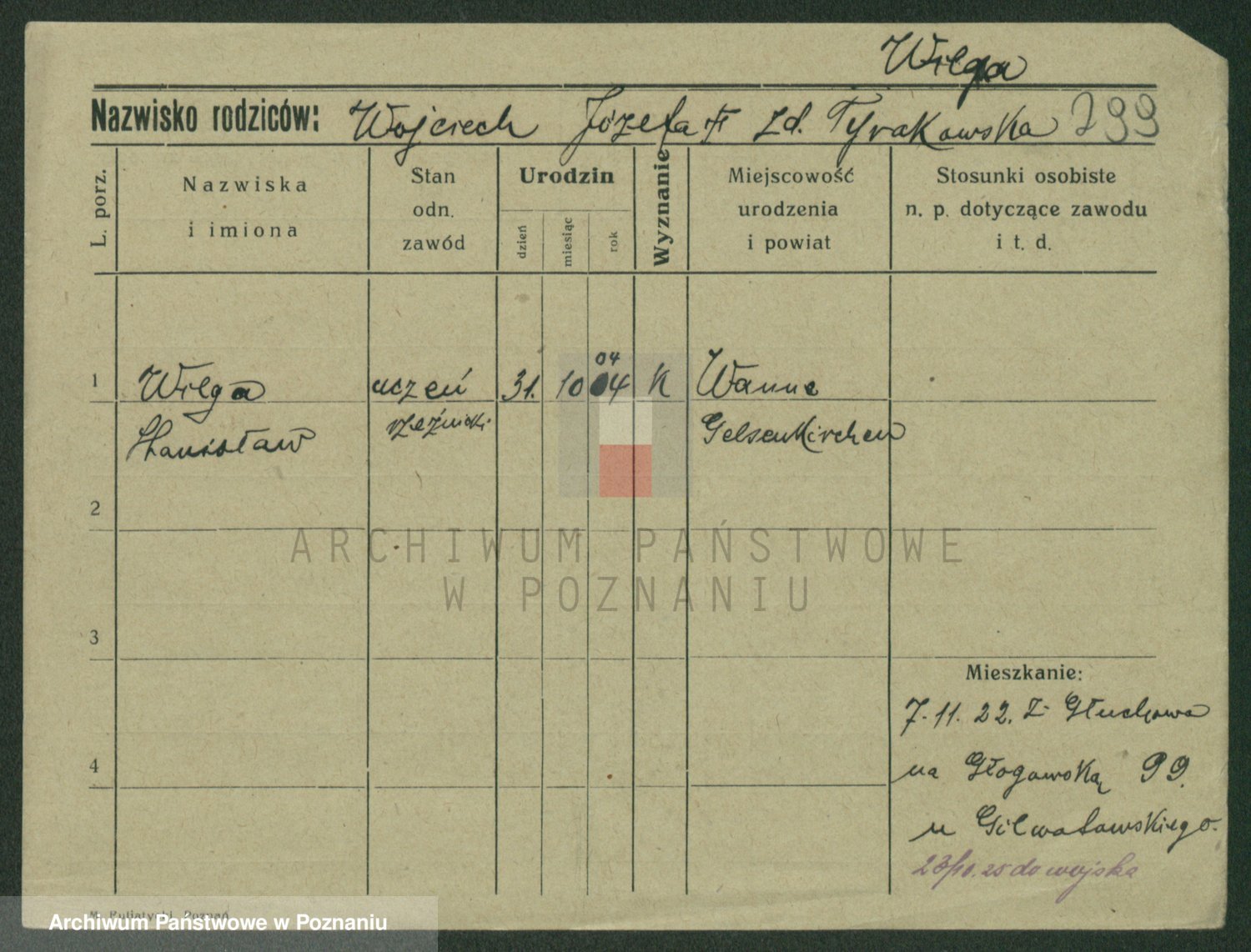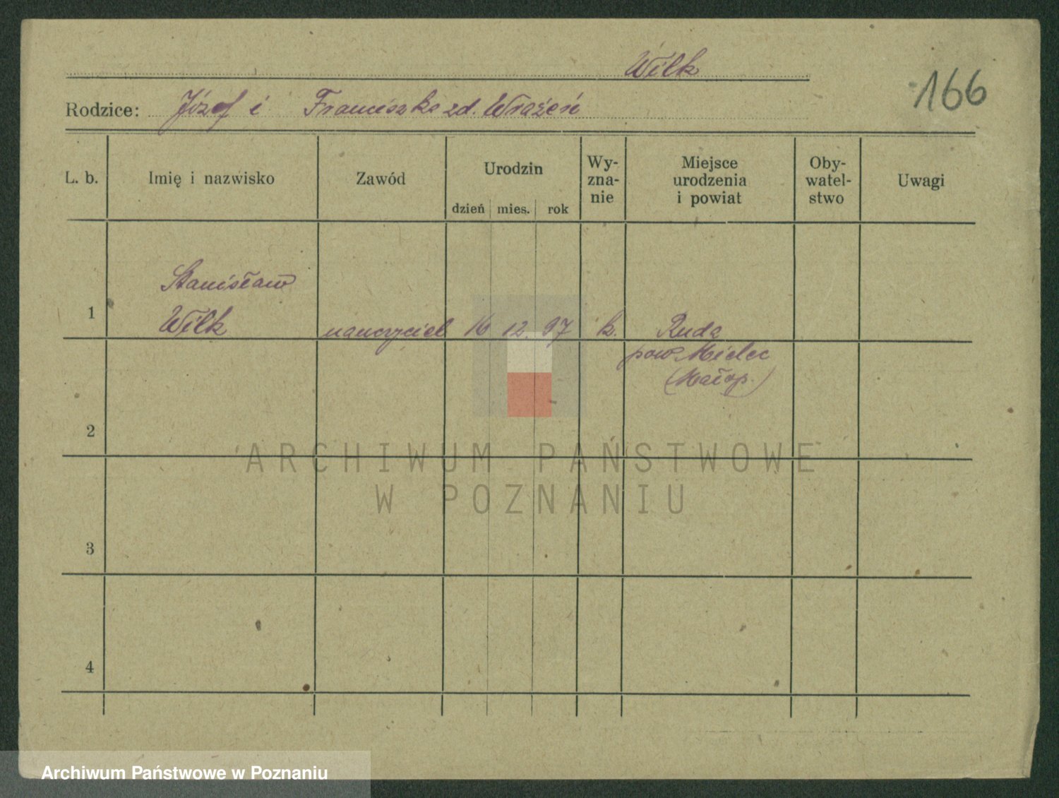 Podgląd karty osobowej dostępny jest po kliknięciu na nazwisko lub ikonkę karty. Można dokonywać powiększenia (ikony na górze) lub przechodzić między kolejnymi skanami (strzałki po bokach).