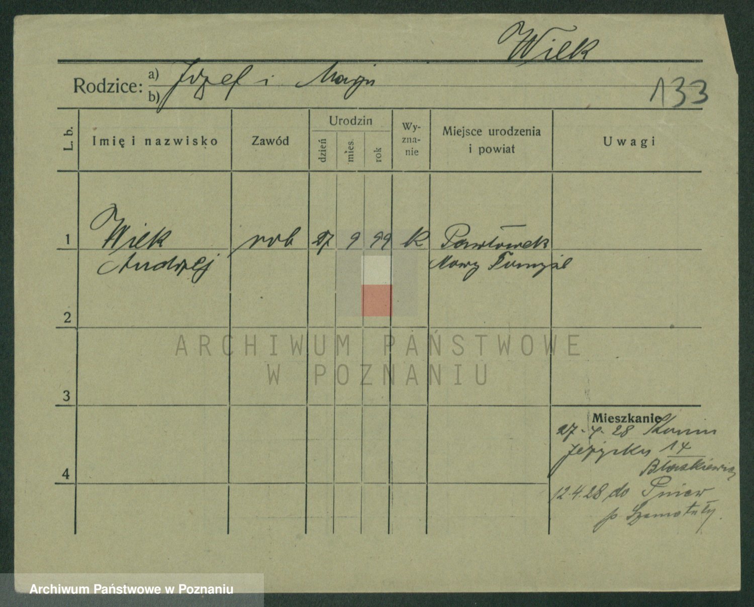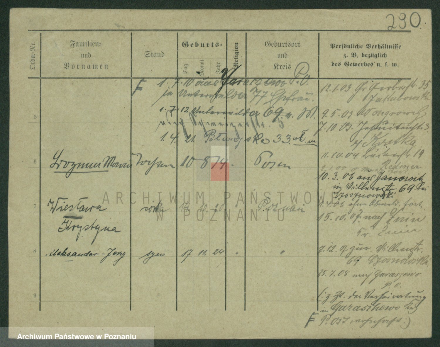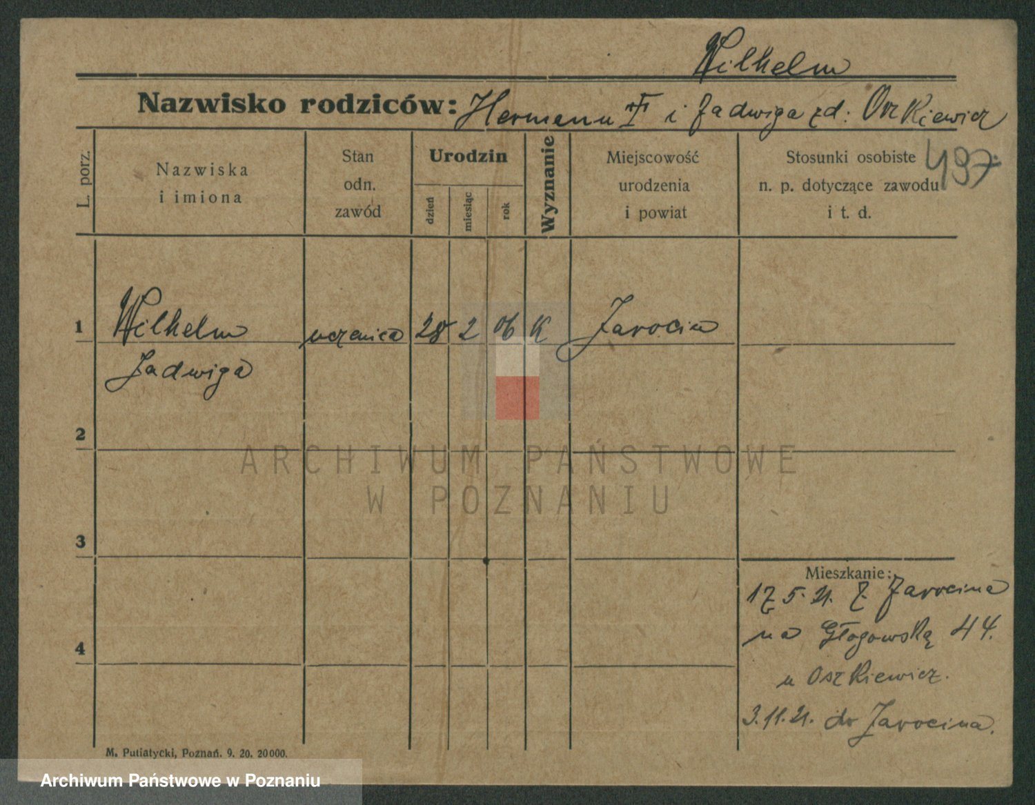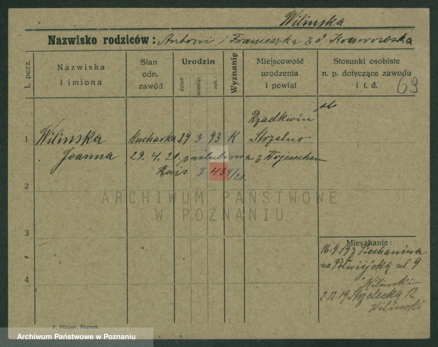 Podgląd karty osobowej dostępny jest po kliknięciu na nazwisko lub ikonkę karty. Można dokonywać powiększenia (ikony na górze) lub przechodzić między kolejnymi skanami (strzałki po bokach).
