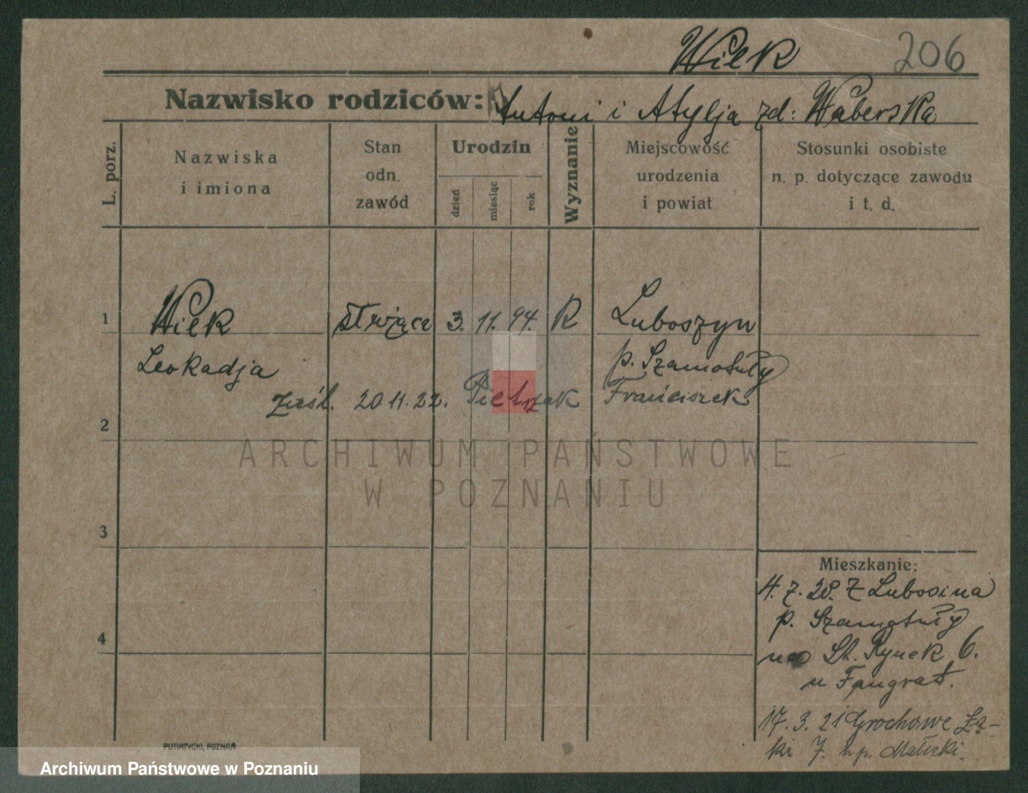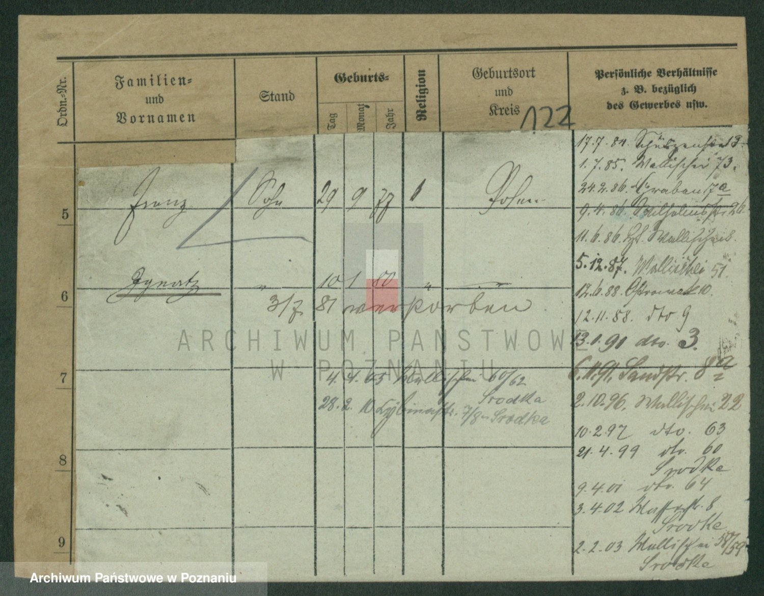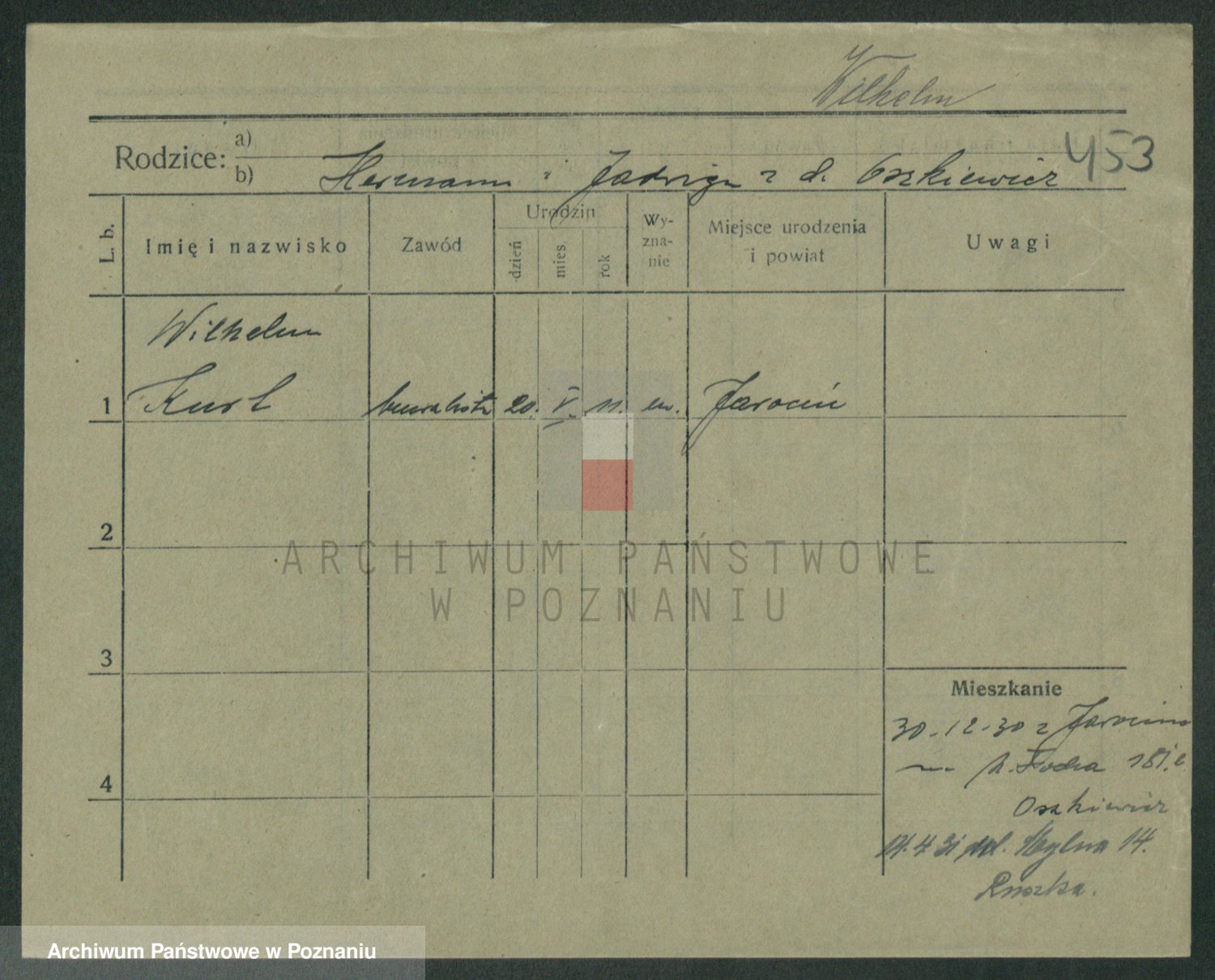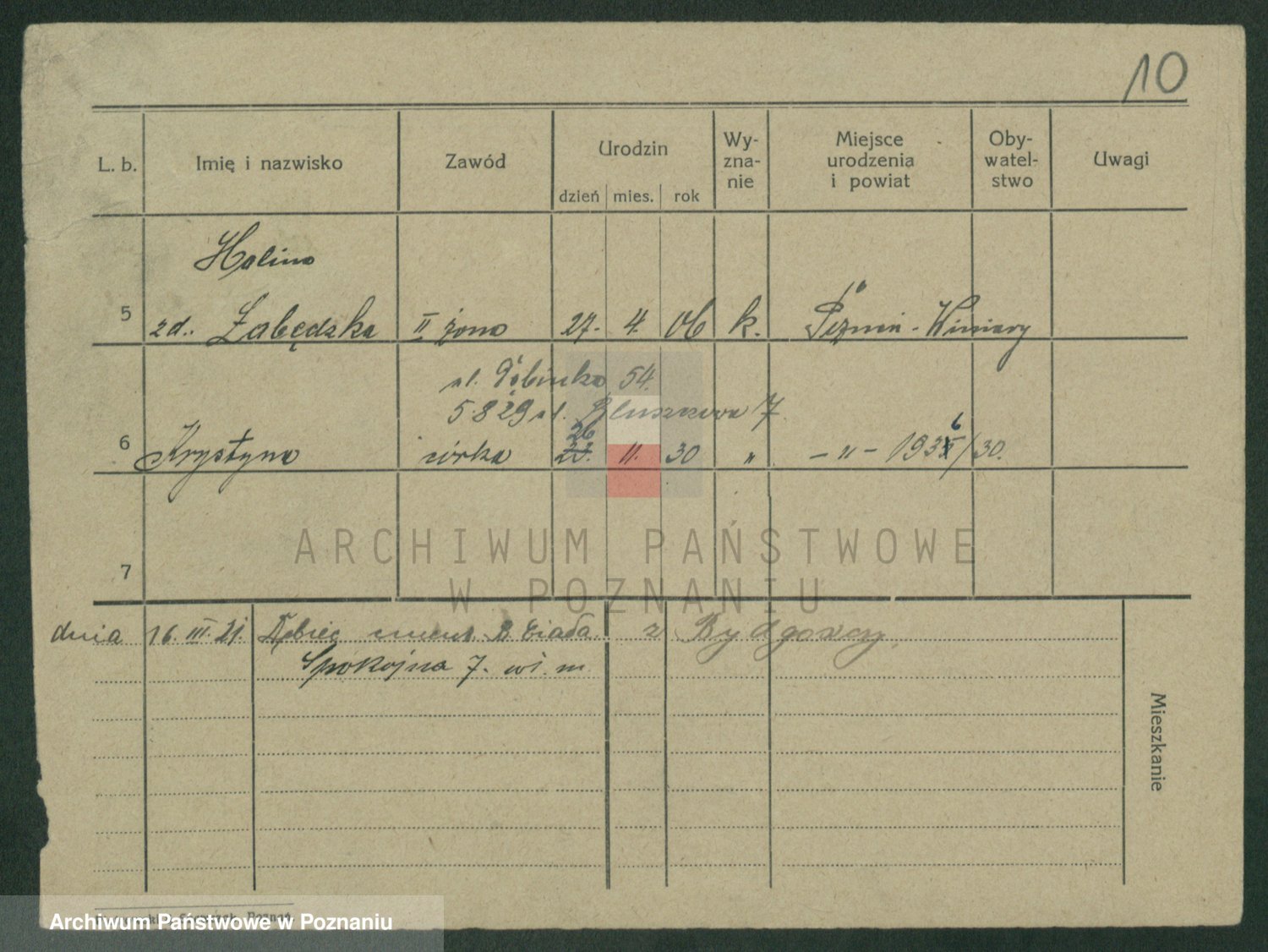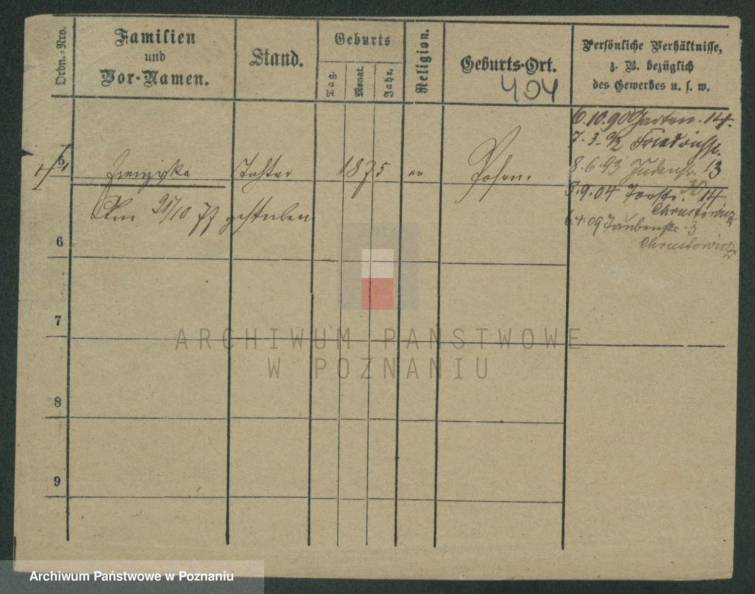 Podgląd karty osobowej dostępny jest po kliknięciu na nazwisko lub ikonkę karty. Można dokonywać powiększenia (ikony na górze) lub przechodzić między kolejnymi skanami (strzałki po bokach).