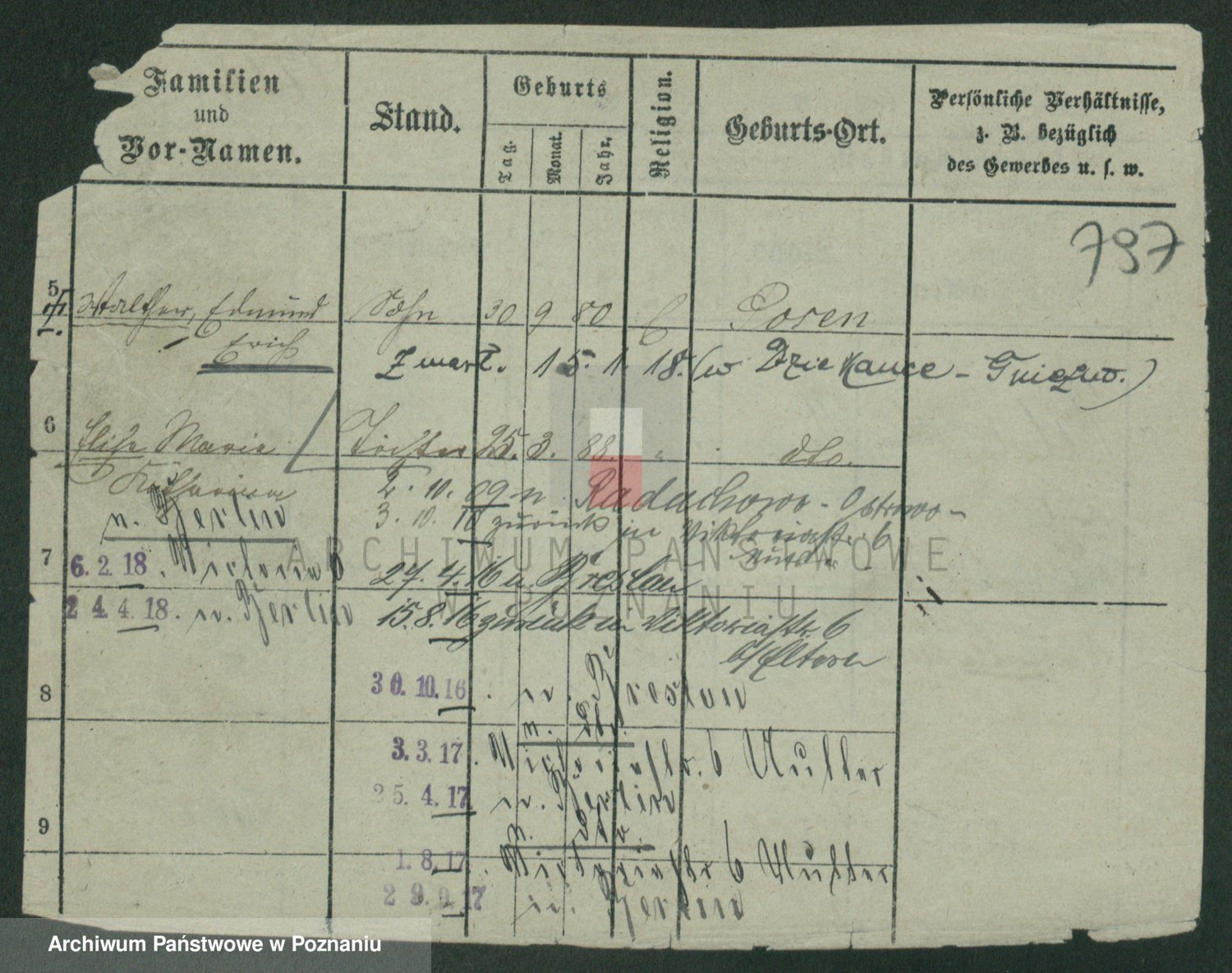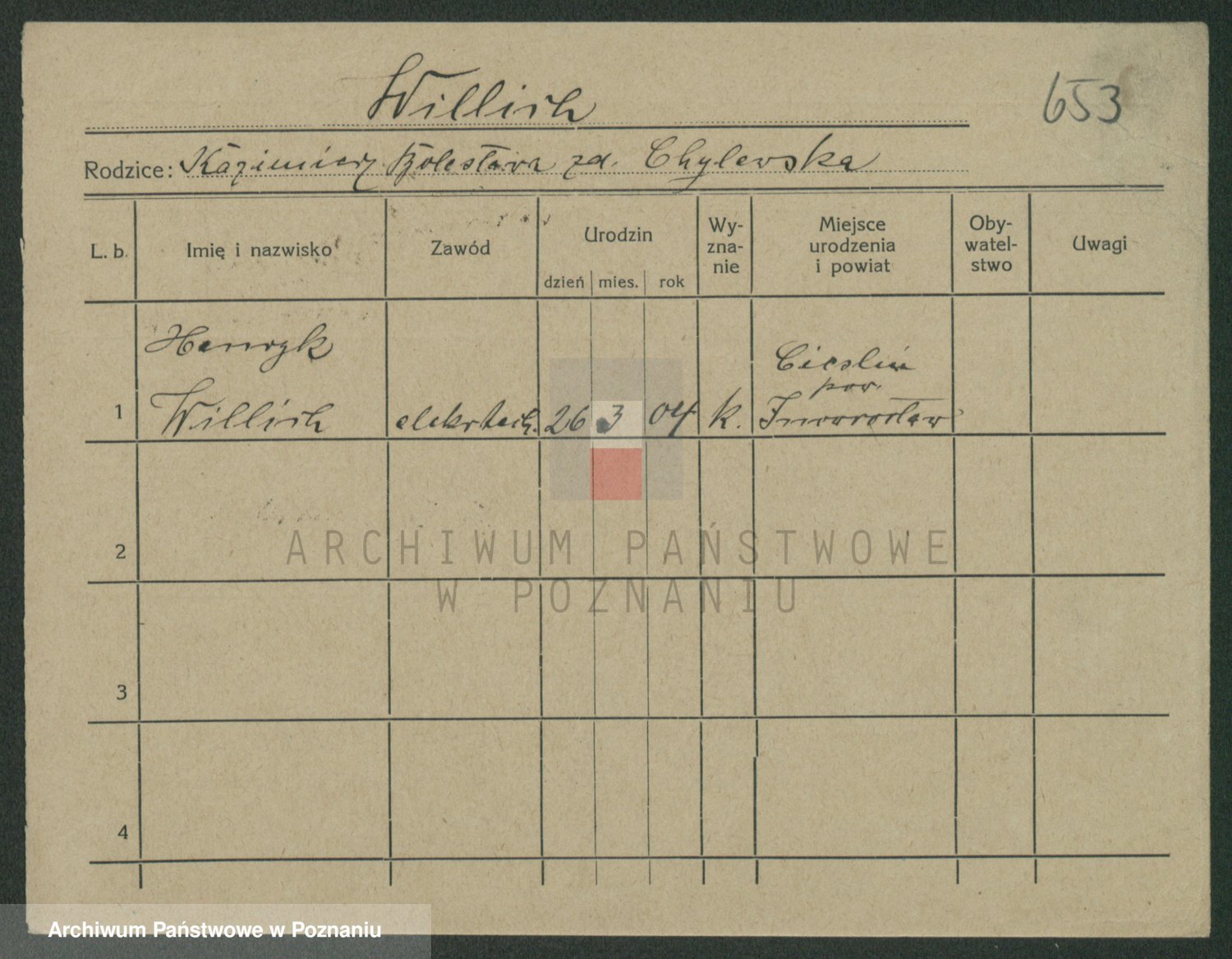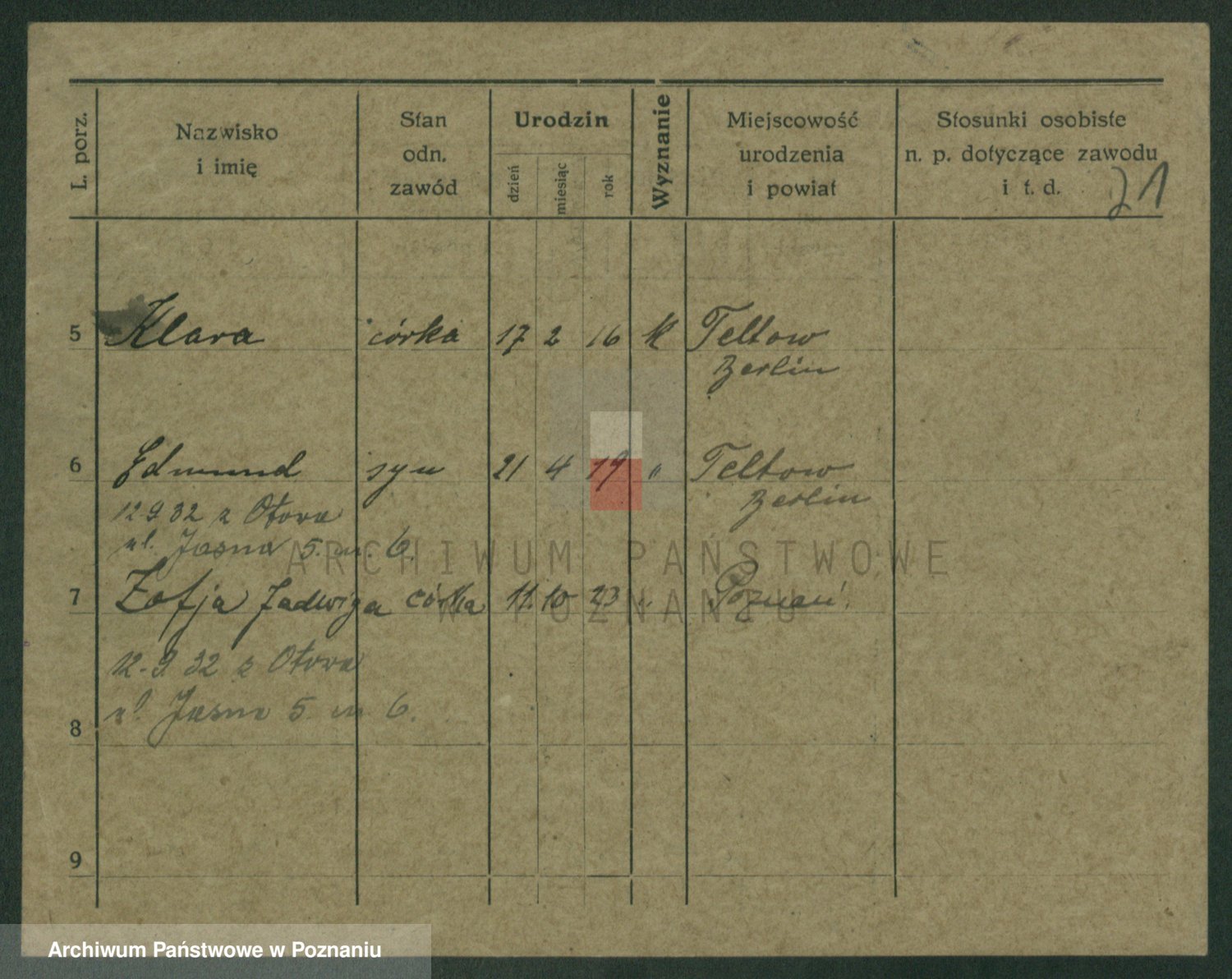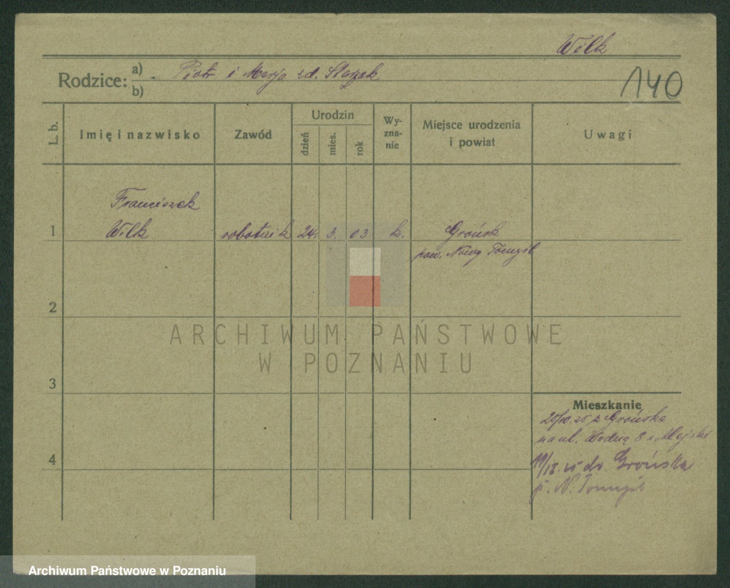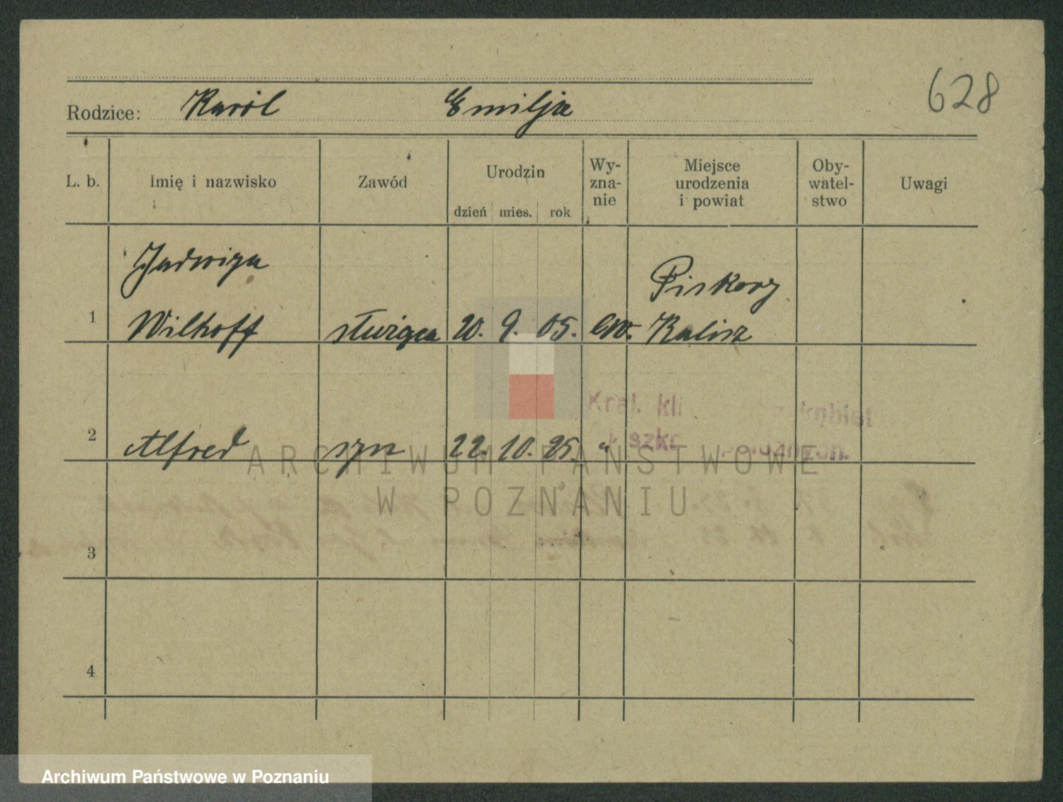 Podgląd karty osobowej dostępny jest po kliknięciu na nazwisko lub ikonkę karty. Można dokonywać powiększenia (ikony na górze) lub przechodzić między kolejnymi skanami (strzałki po bokach).