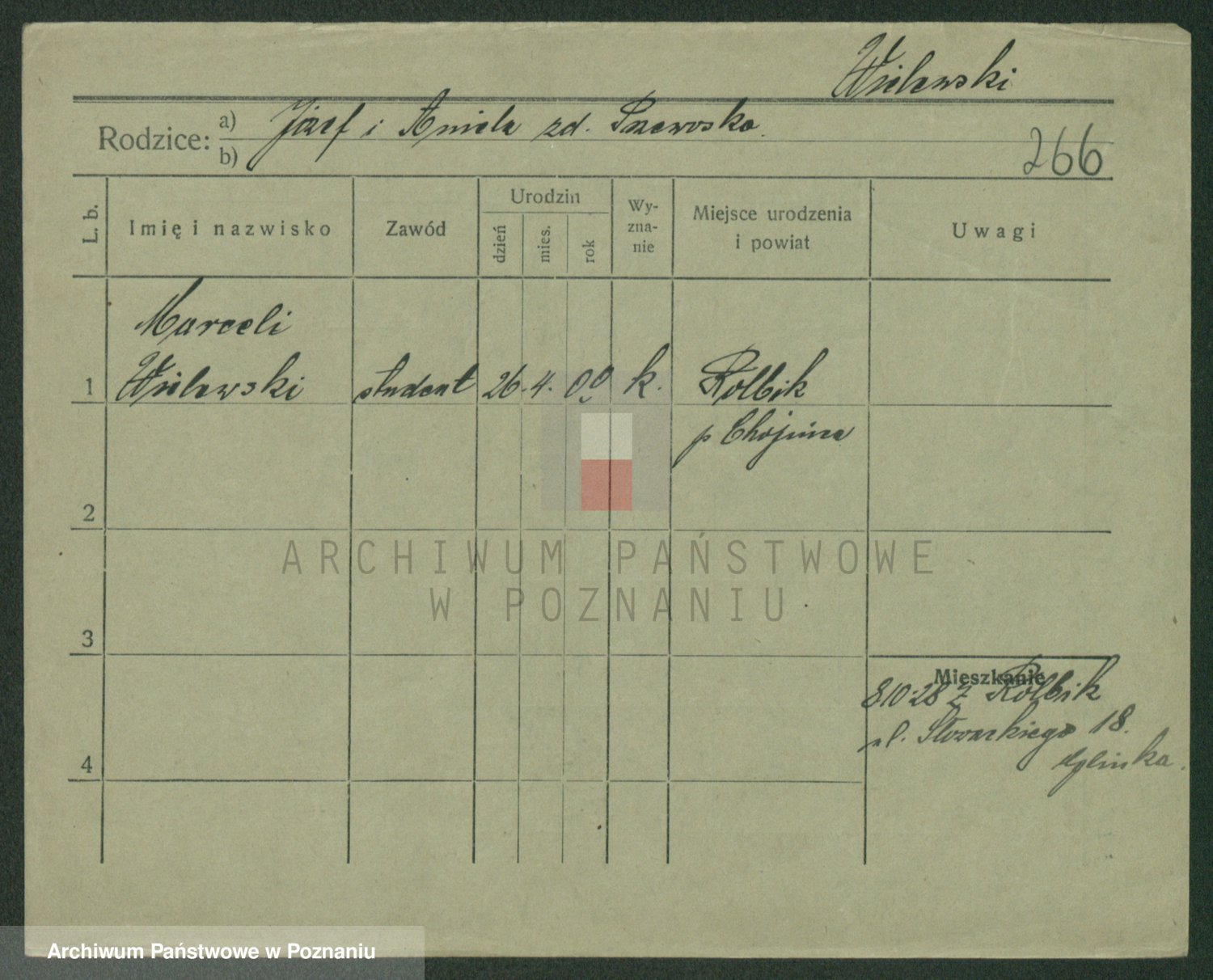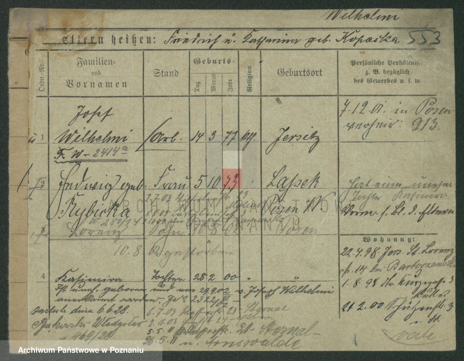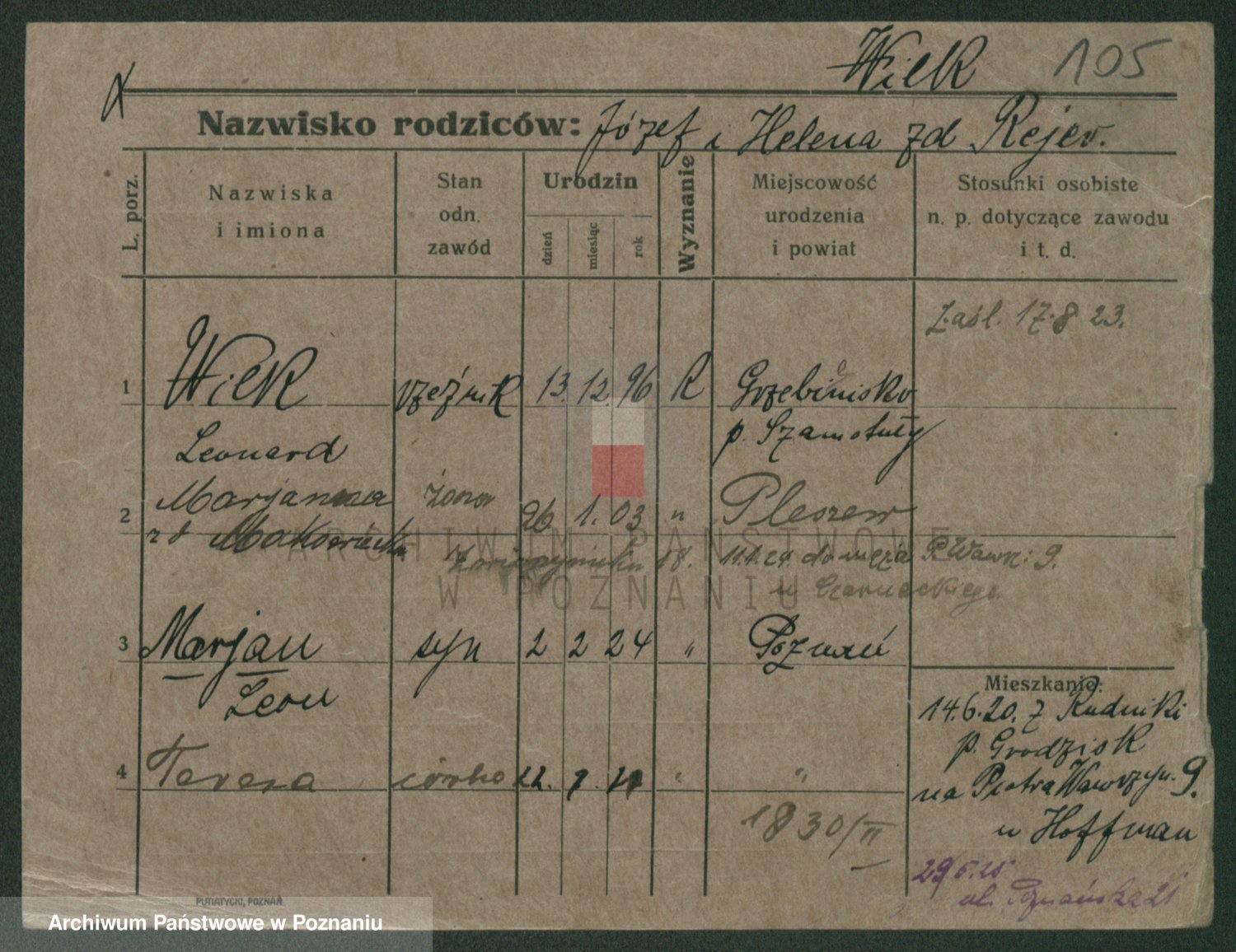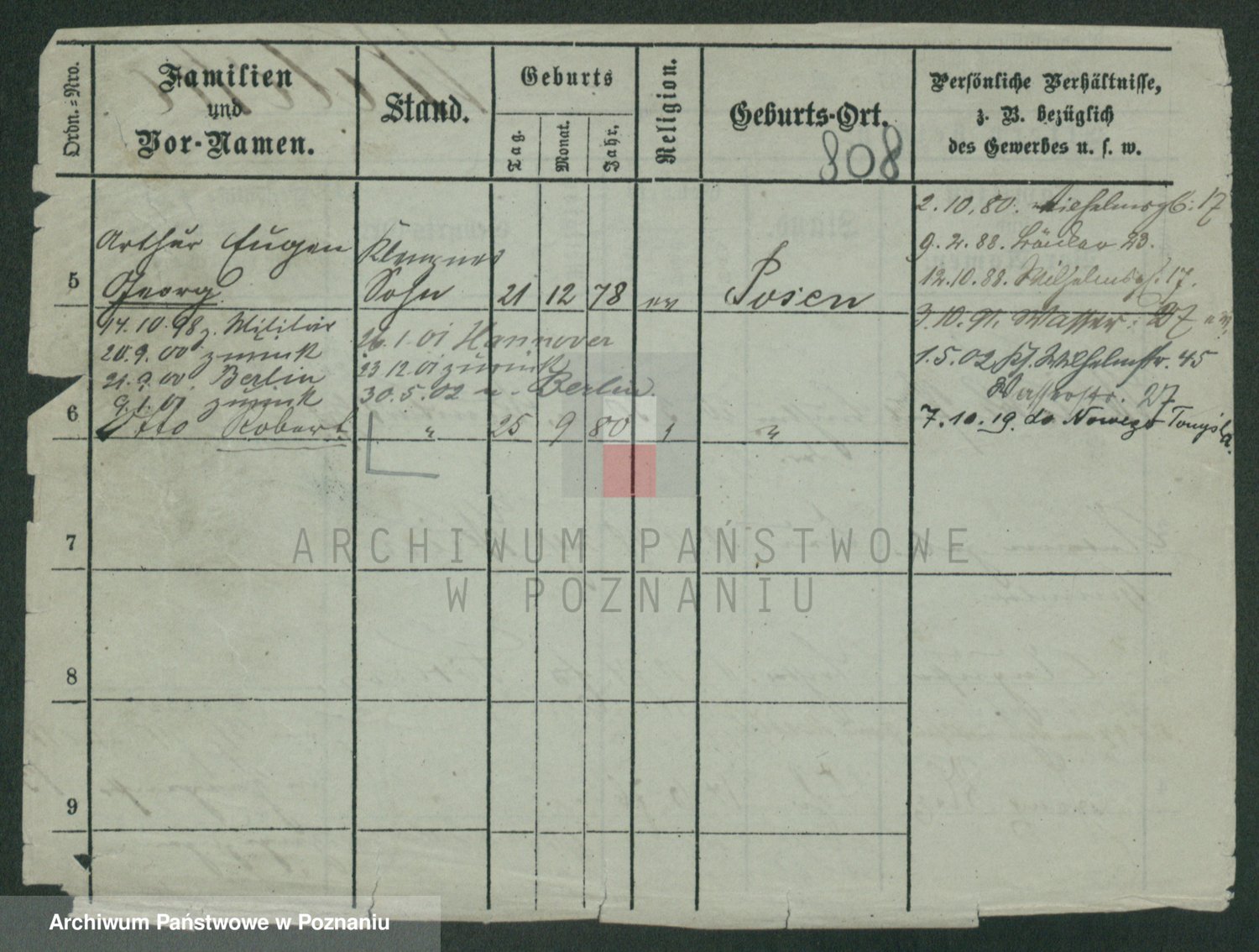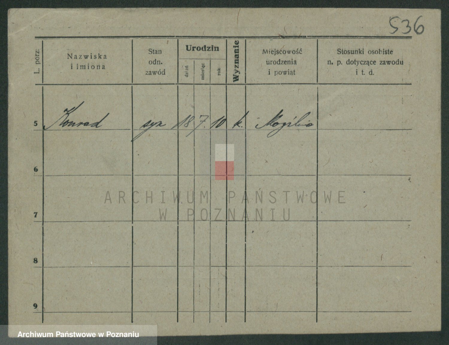 Podgląd karty osobowej dostępny jest po kliknięciu na nazwisko lub ikonkę karty. Można dokonywać powiększenia (ikony na górze) lub przechodzić między kolejnymi skanami (strzałki po bokach).