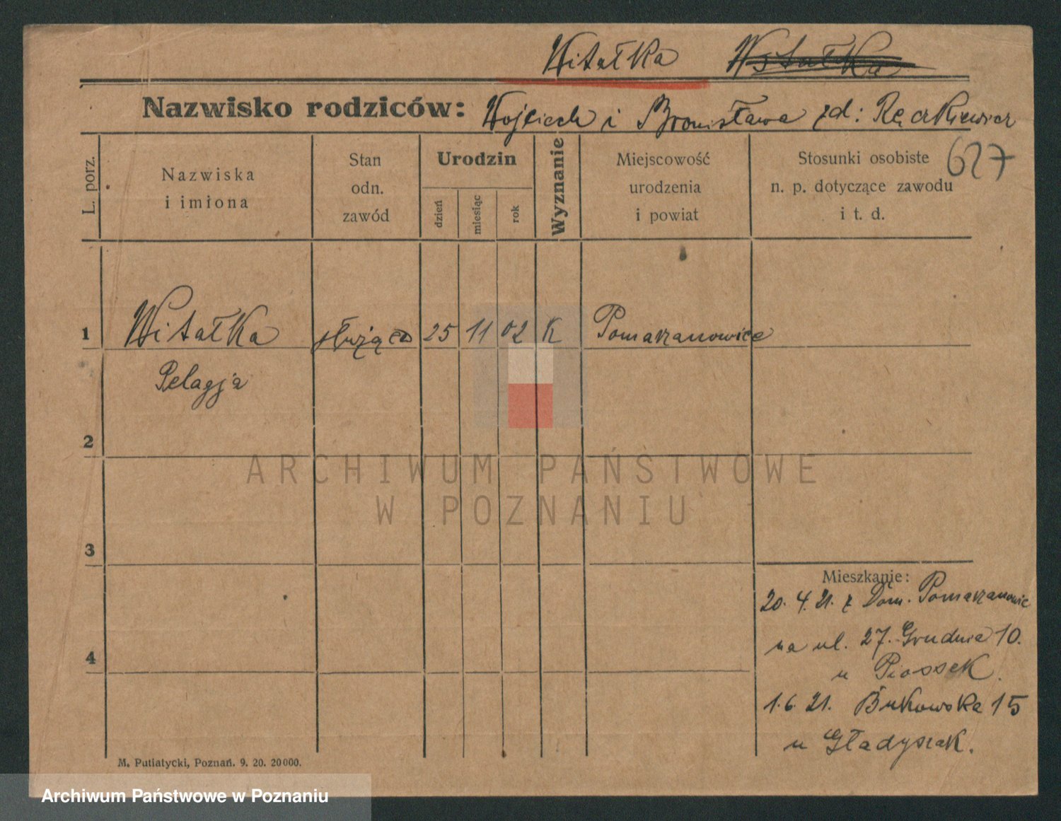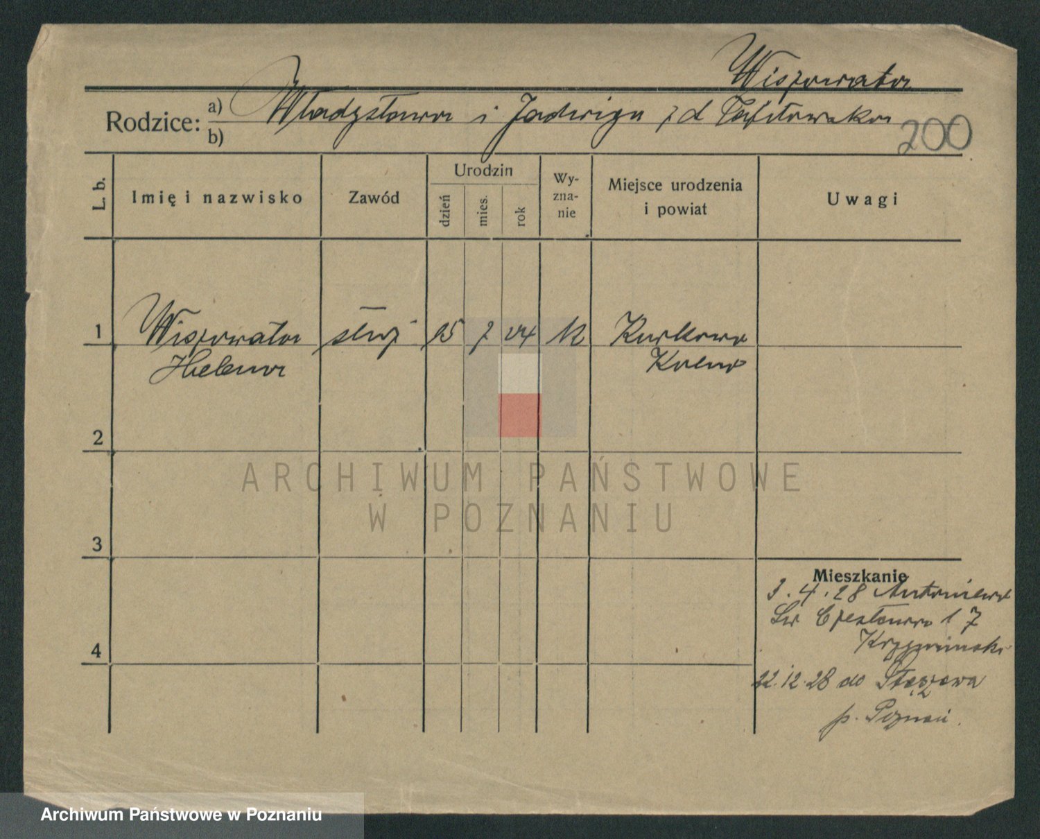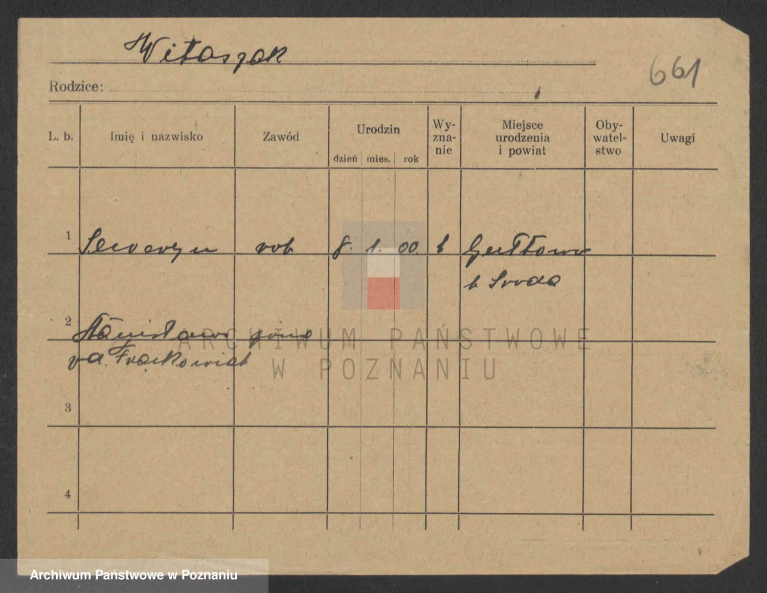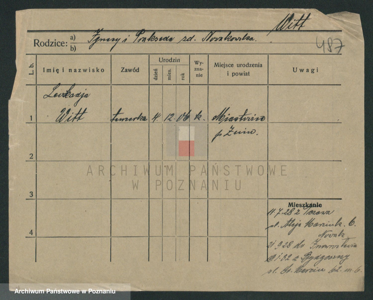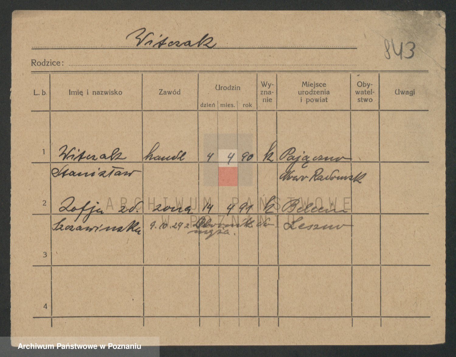 Podgląd karty osobowej dostępny jest po kliknięciu na nazwisko lub ikonkę karty. Można dokonywać powiększenia (ikony na górze) lub przechodzić między kolejnymi skanami (strzałki po bokach).