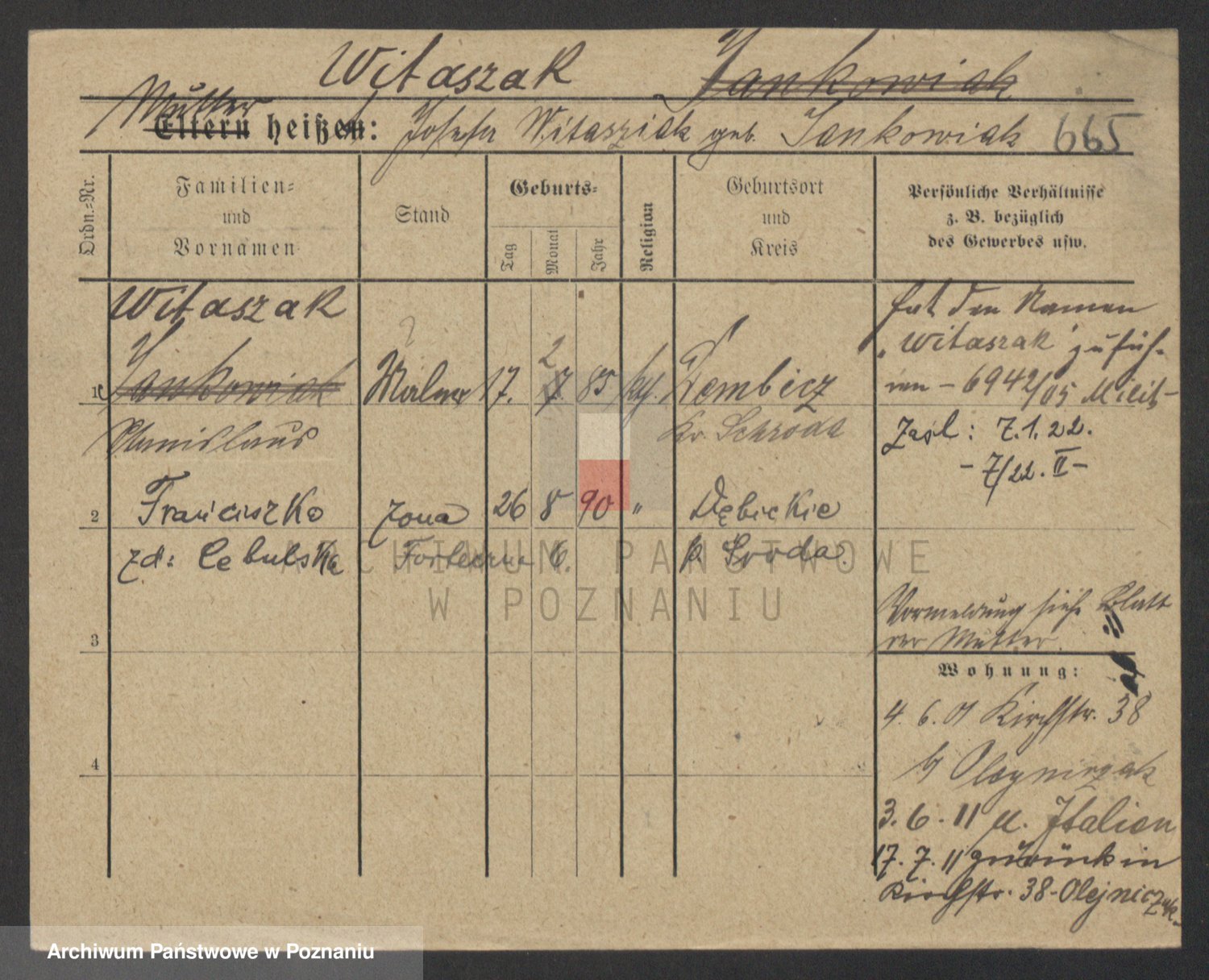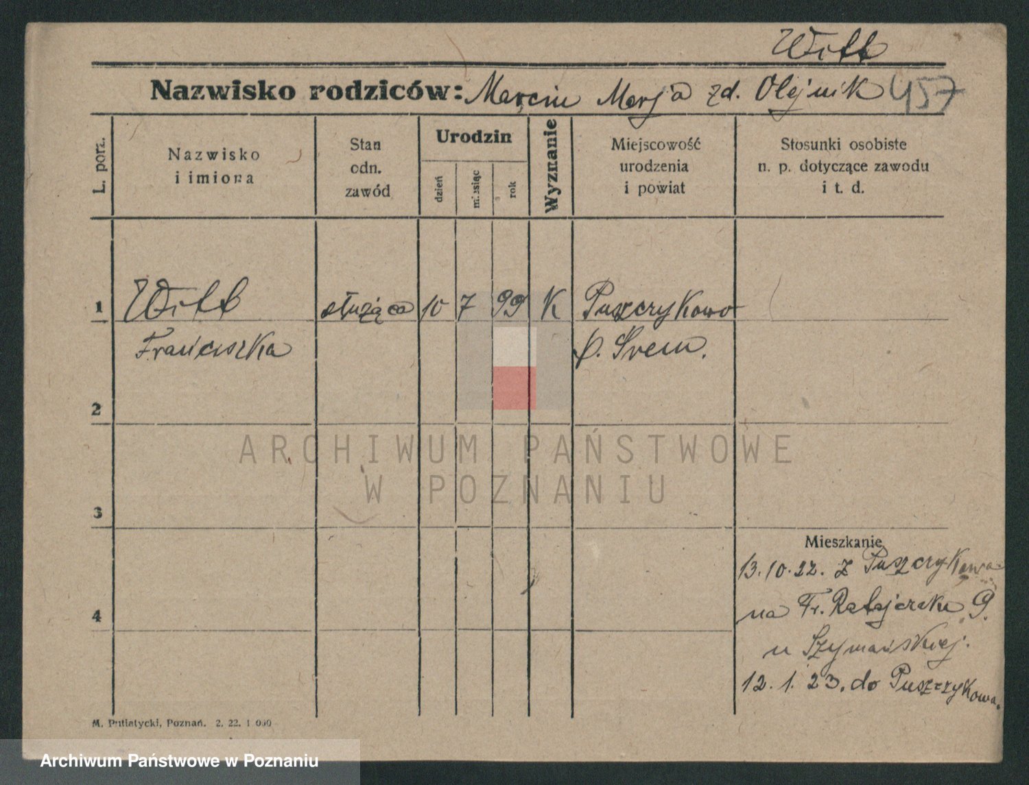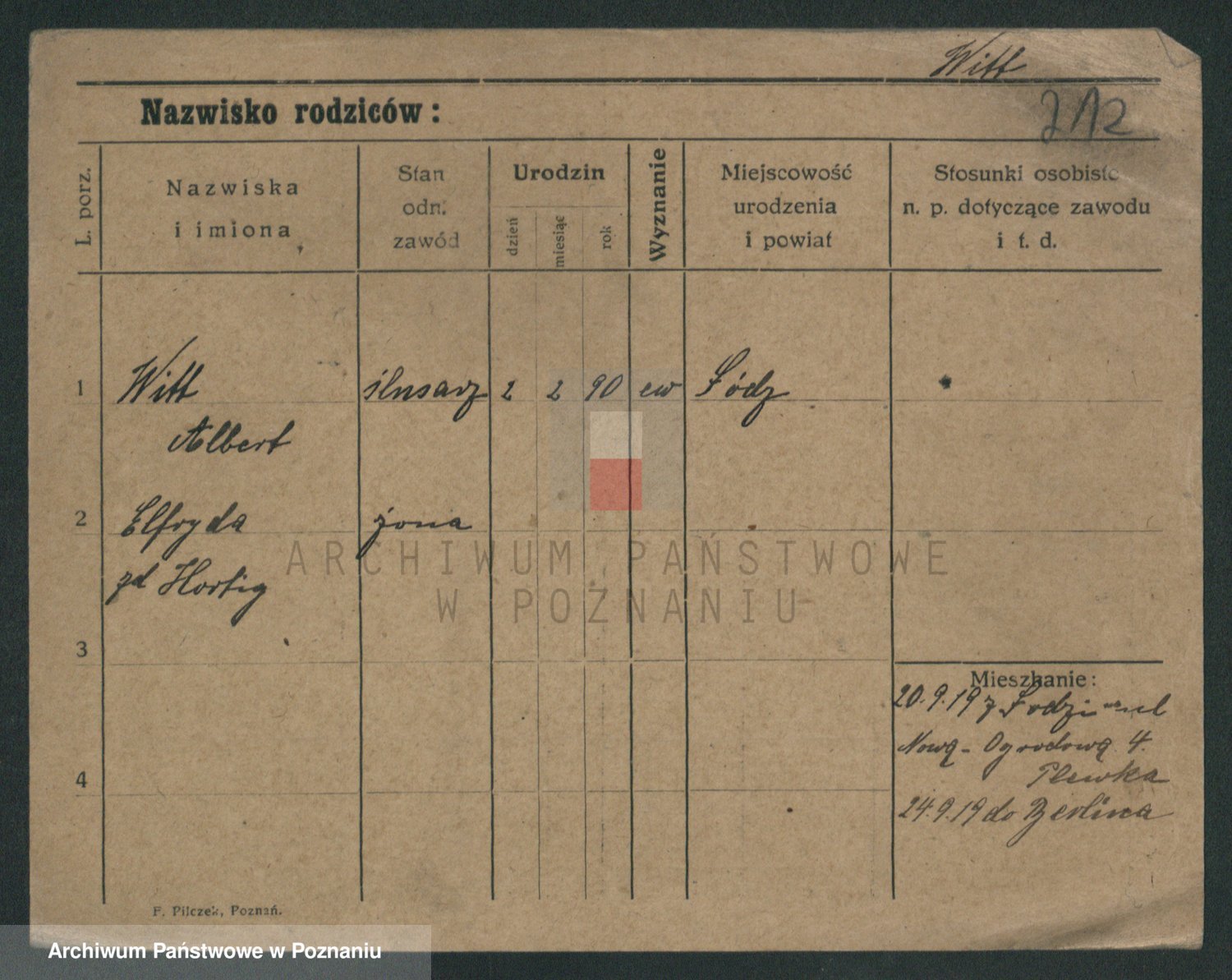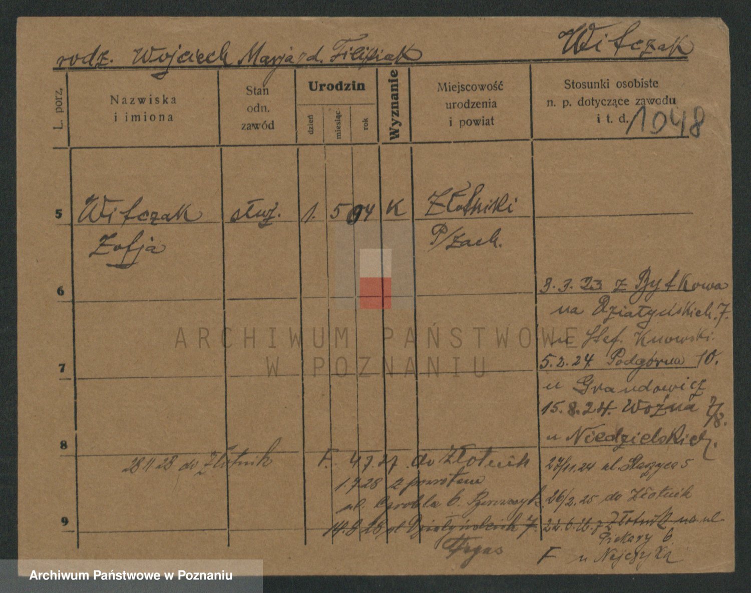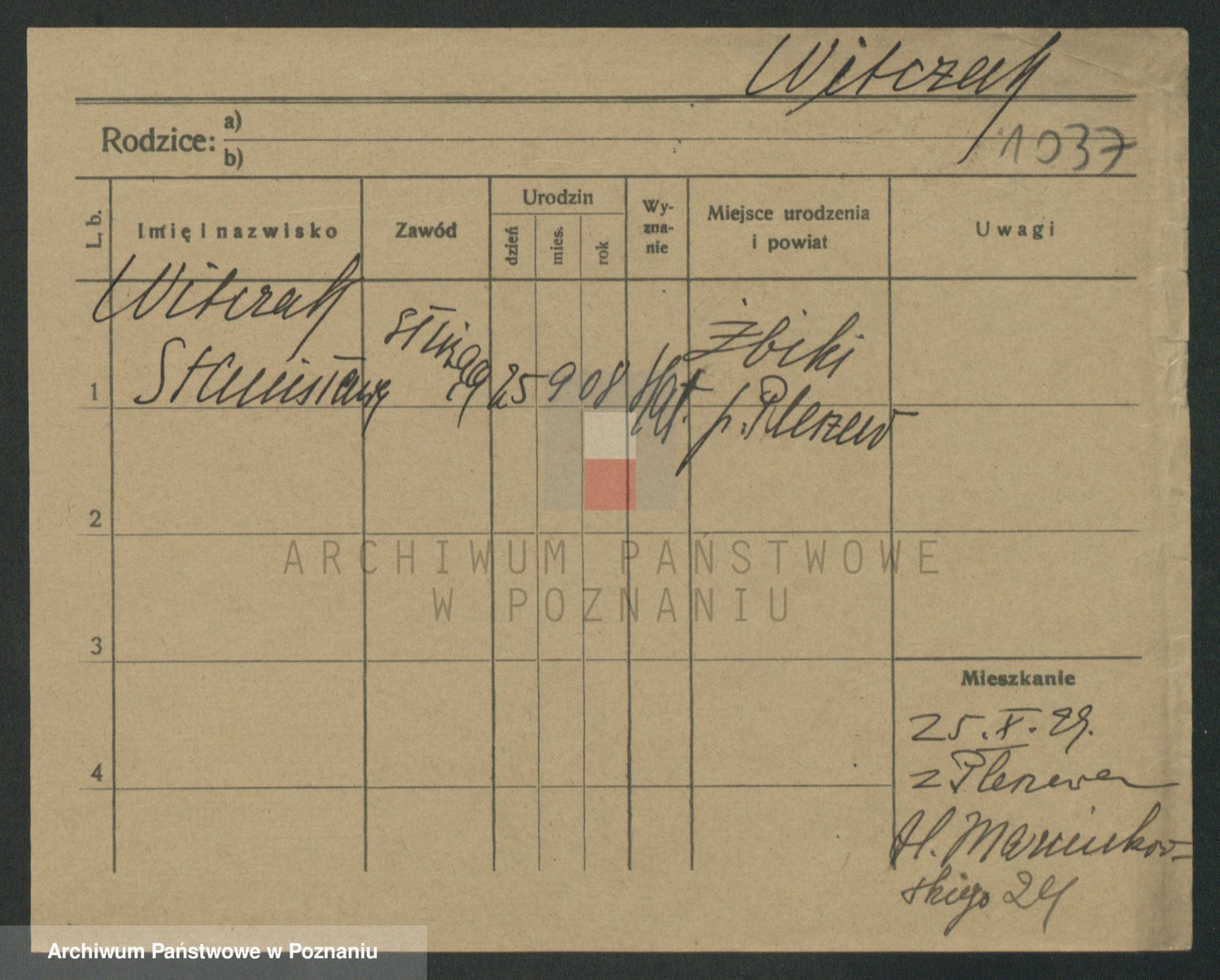 Podgląd karty osobowej dostępny jest po kliknięciu na nazwisko lub ikonkę karty. Można dokonywać powiększenia (ikony na górze) lub przechodzić między kolejnymi skanami (strzałki po bokach).