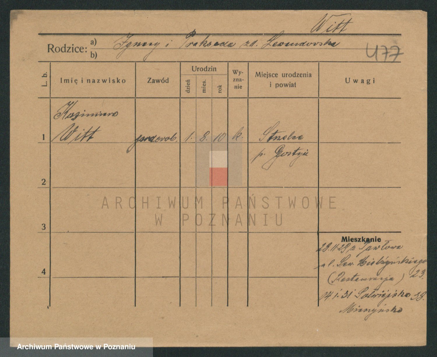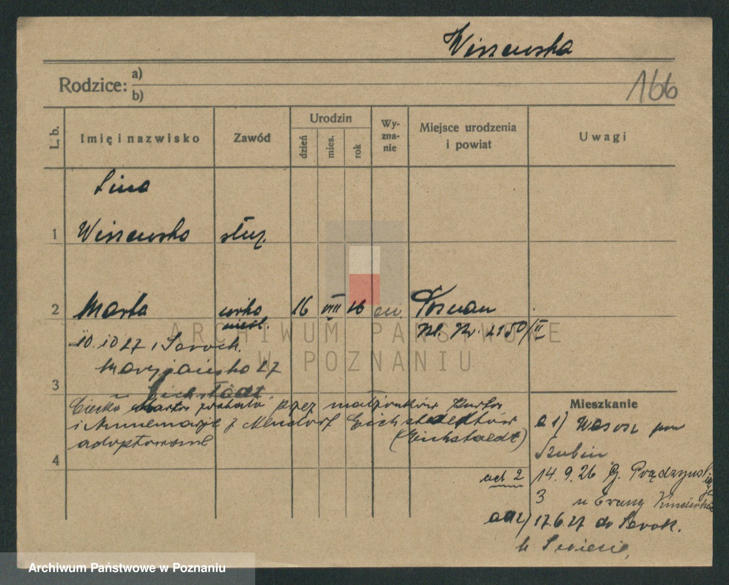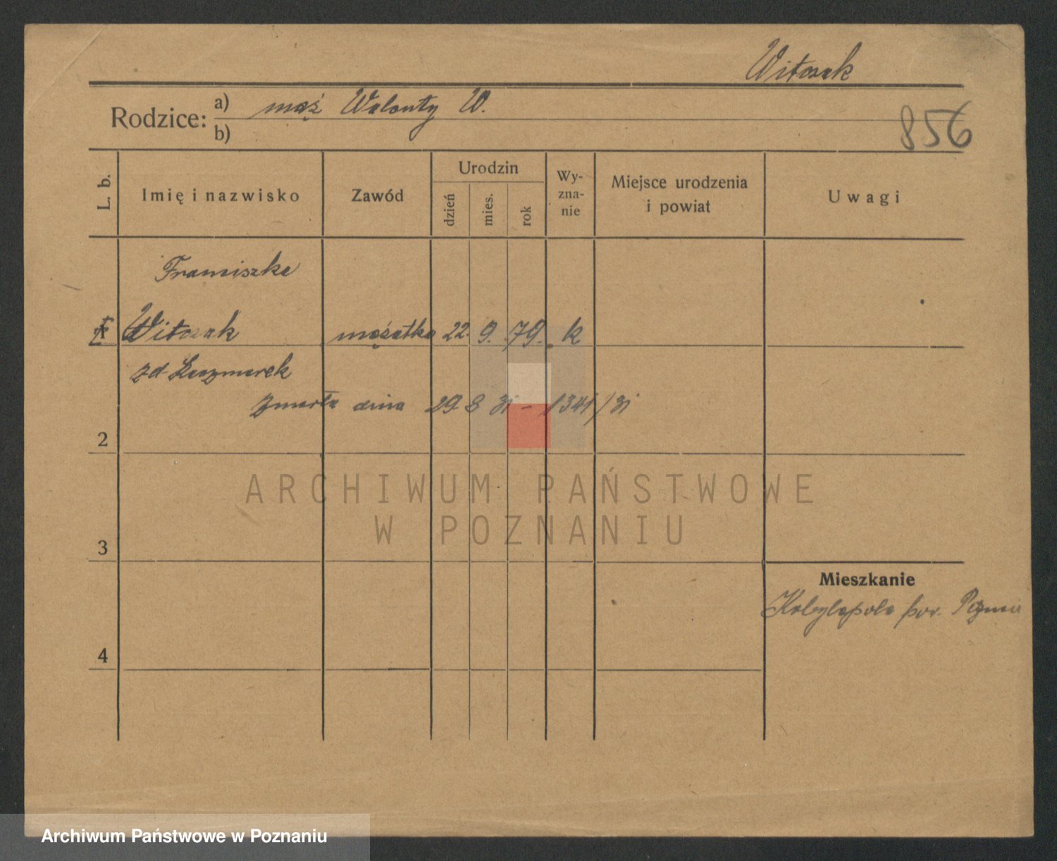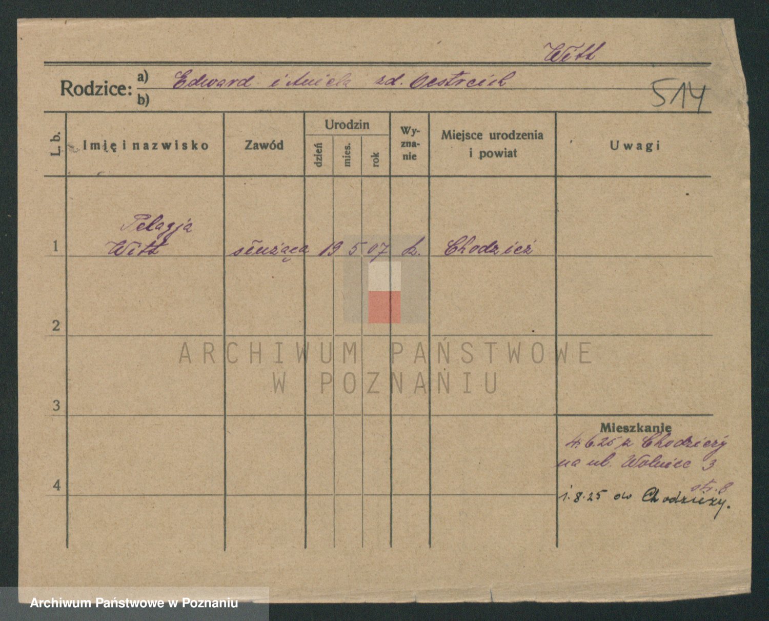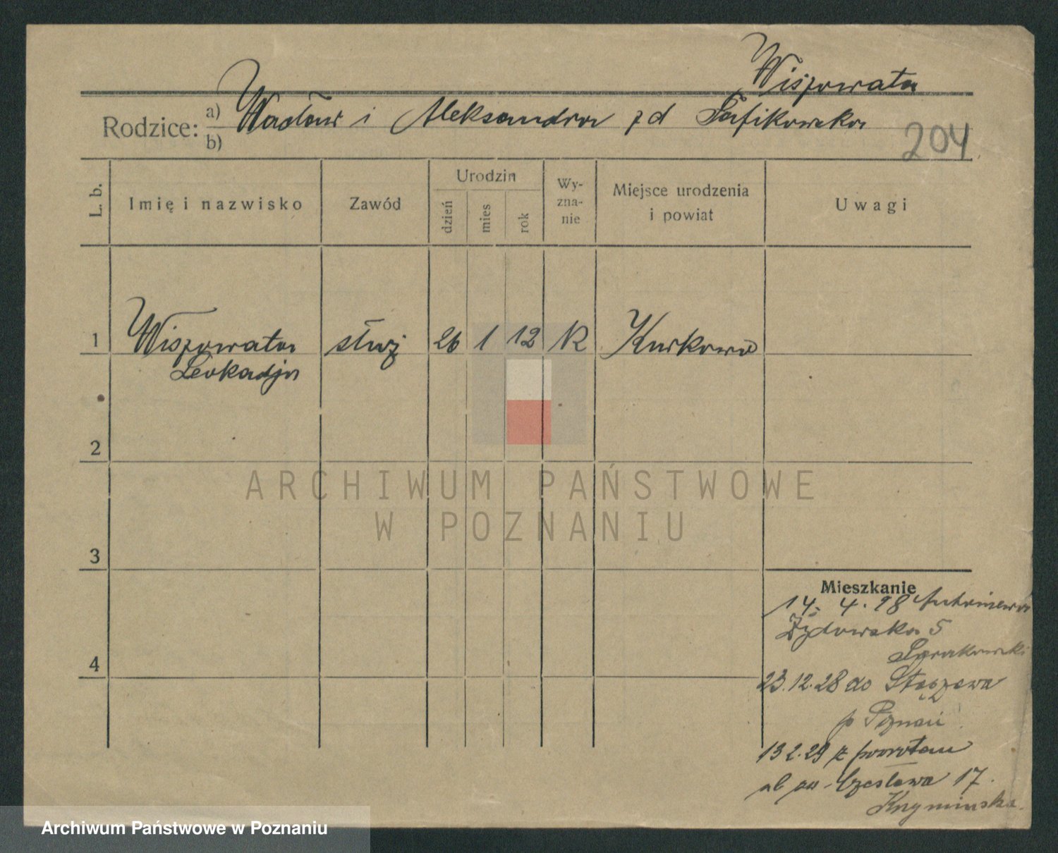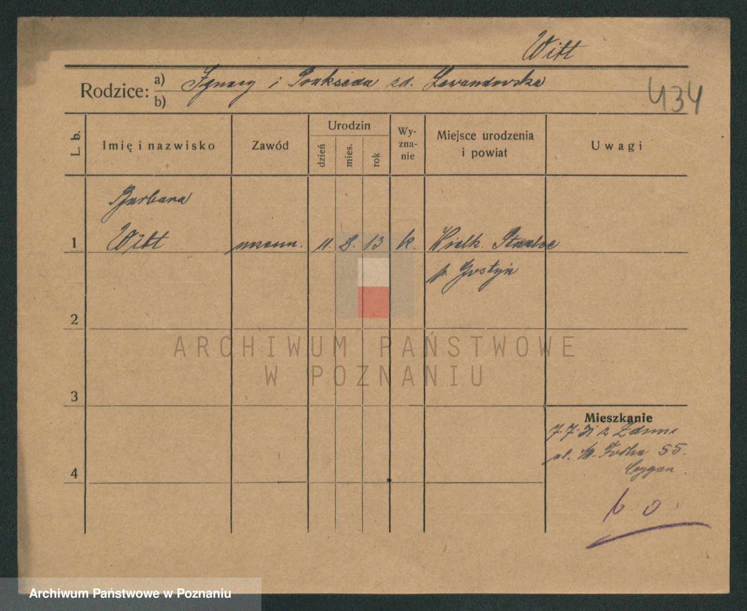 Podgląd karty osobowej dostępny jest po kliknięciu na nazwisko lub ikonkę karty. Można dokonywać powiększenia (ikony na górze) lub przechodzić między kolejnymi skanami (strzałki po bokach).