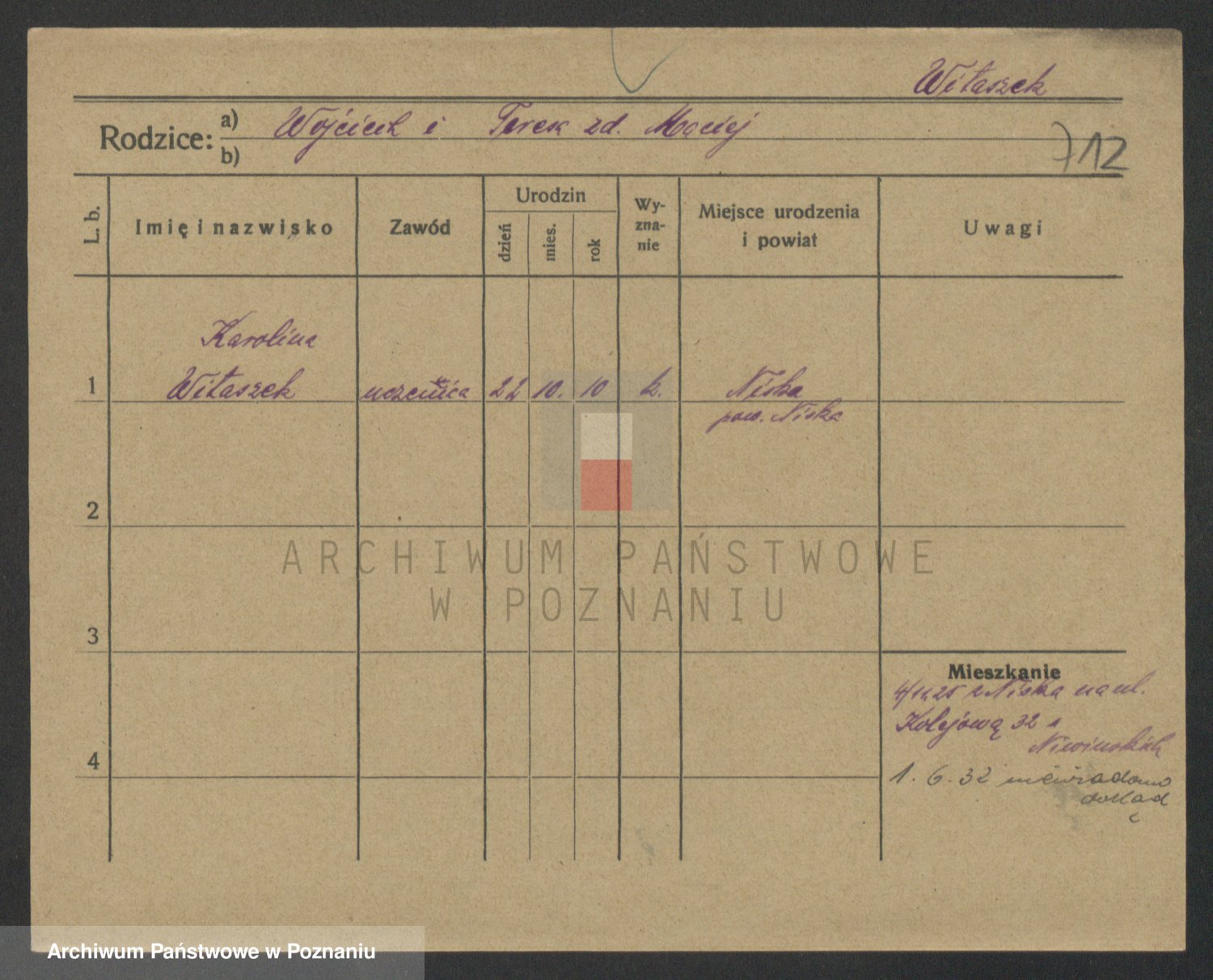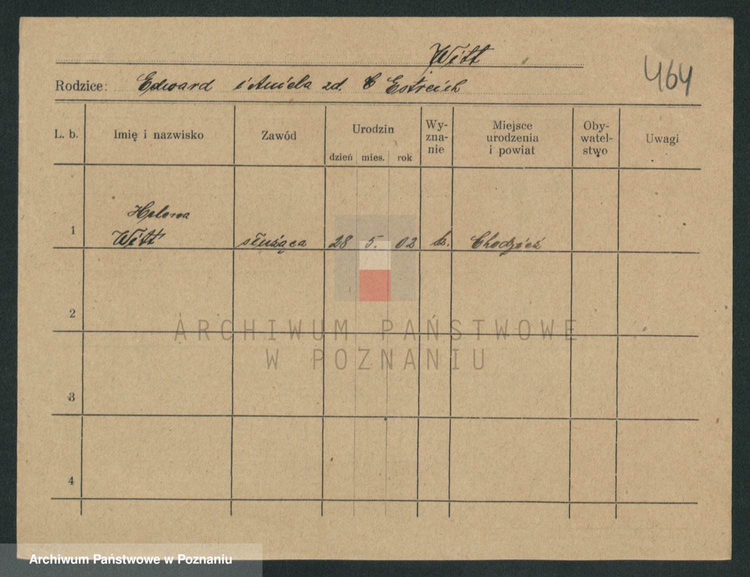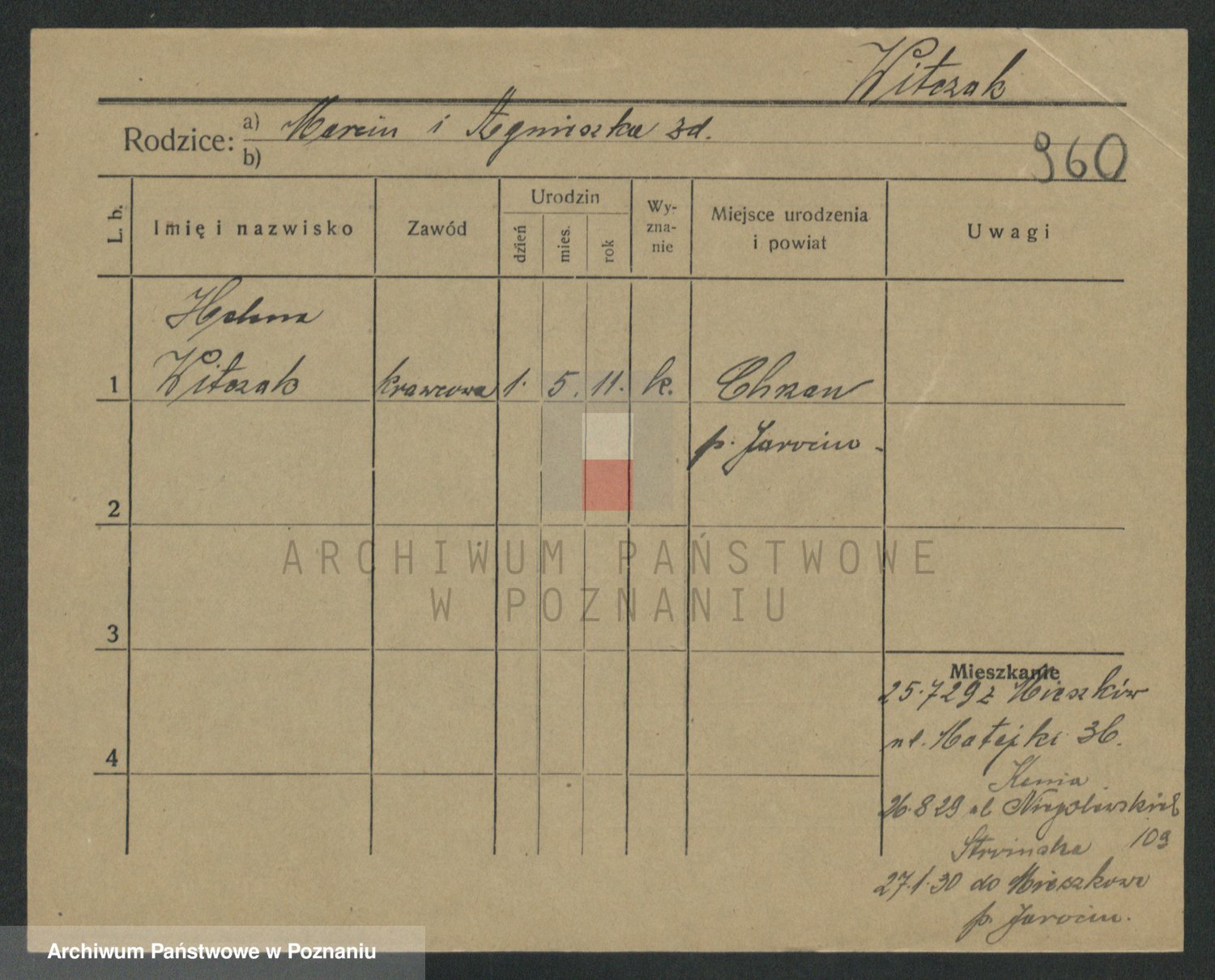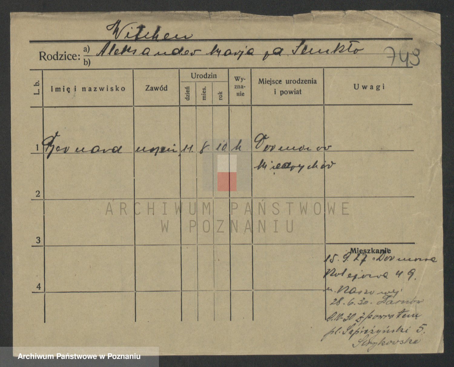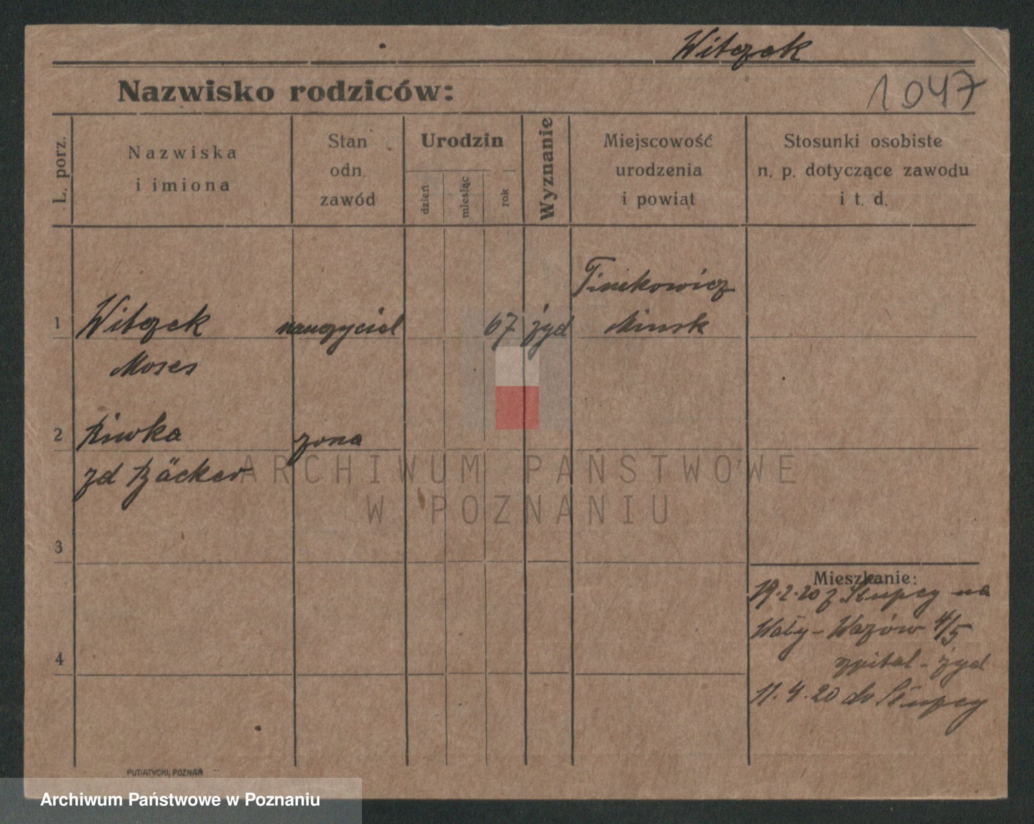 Podgląd karty osobowej dostępny jest po kliknięciu na nazwisko lub ikonkę karty. Można dokonywać powiększenia (ikony na górze) lub przechodzić między kolejnymi skanami (strzałki po bokach).