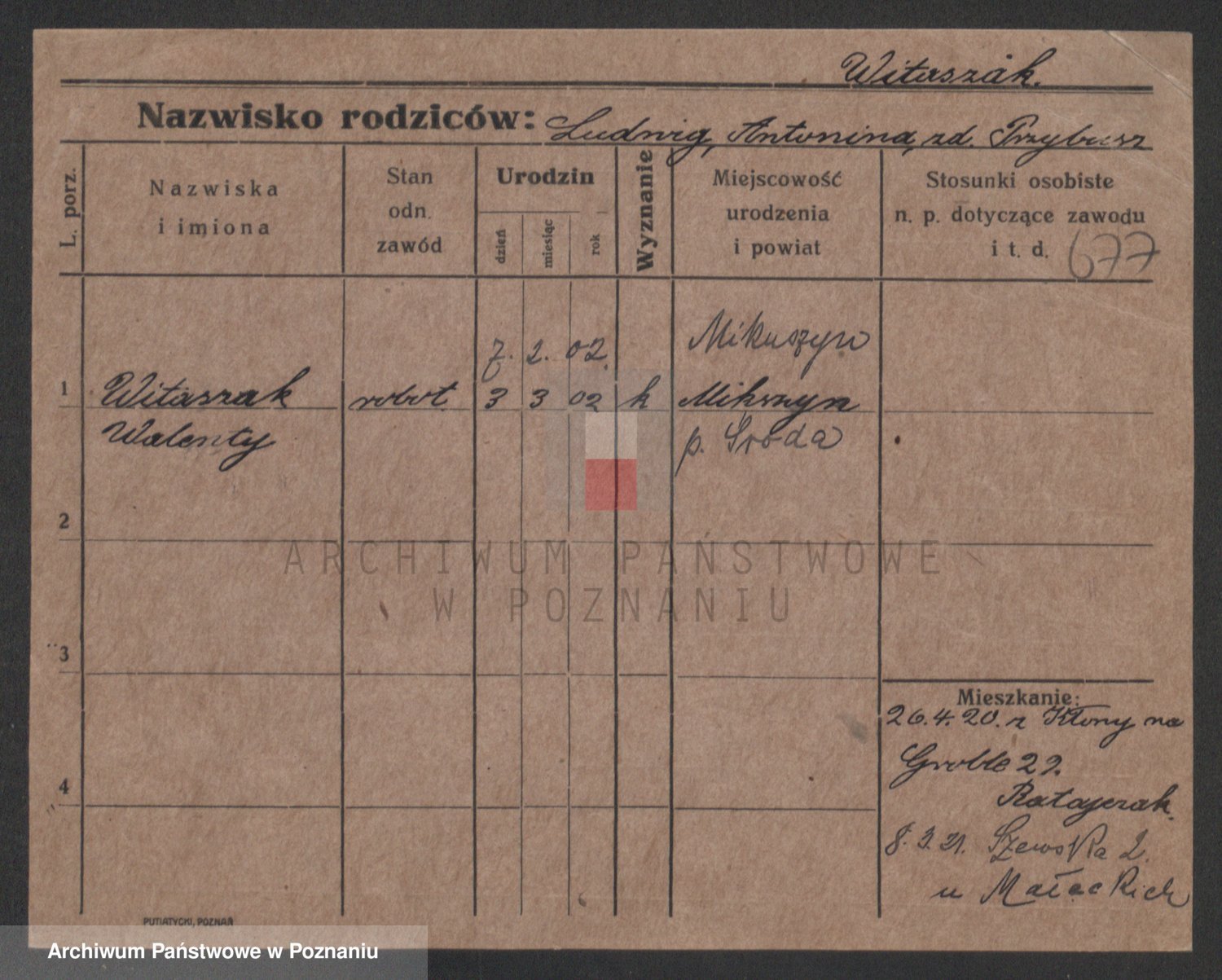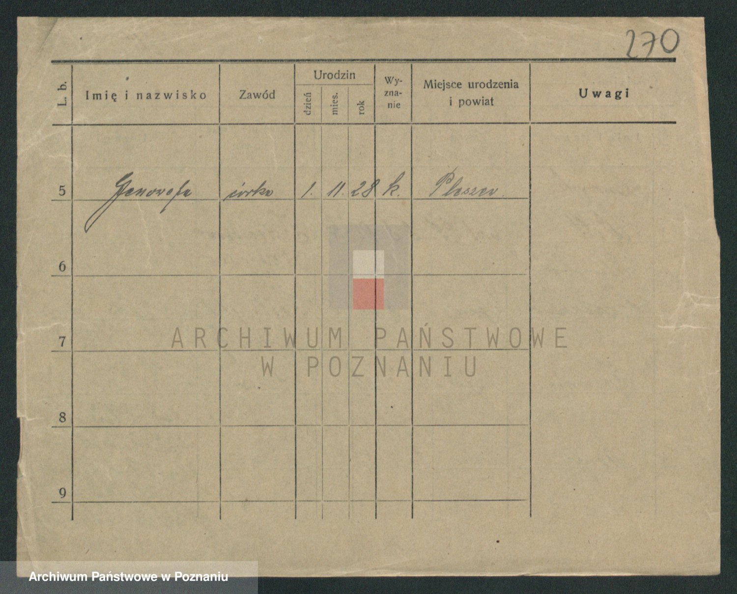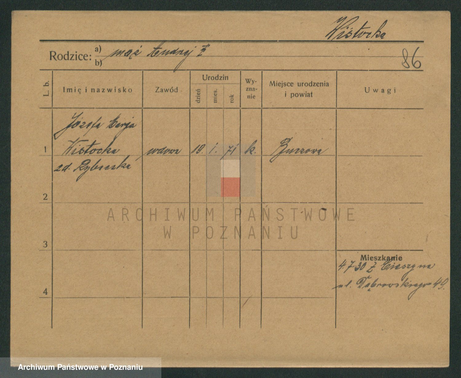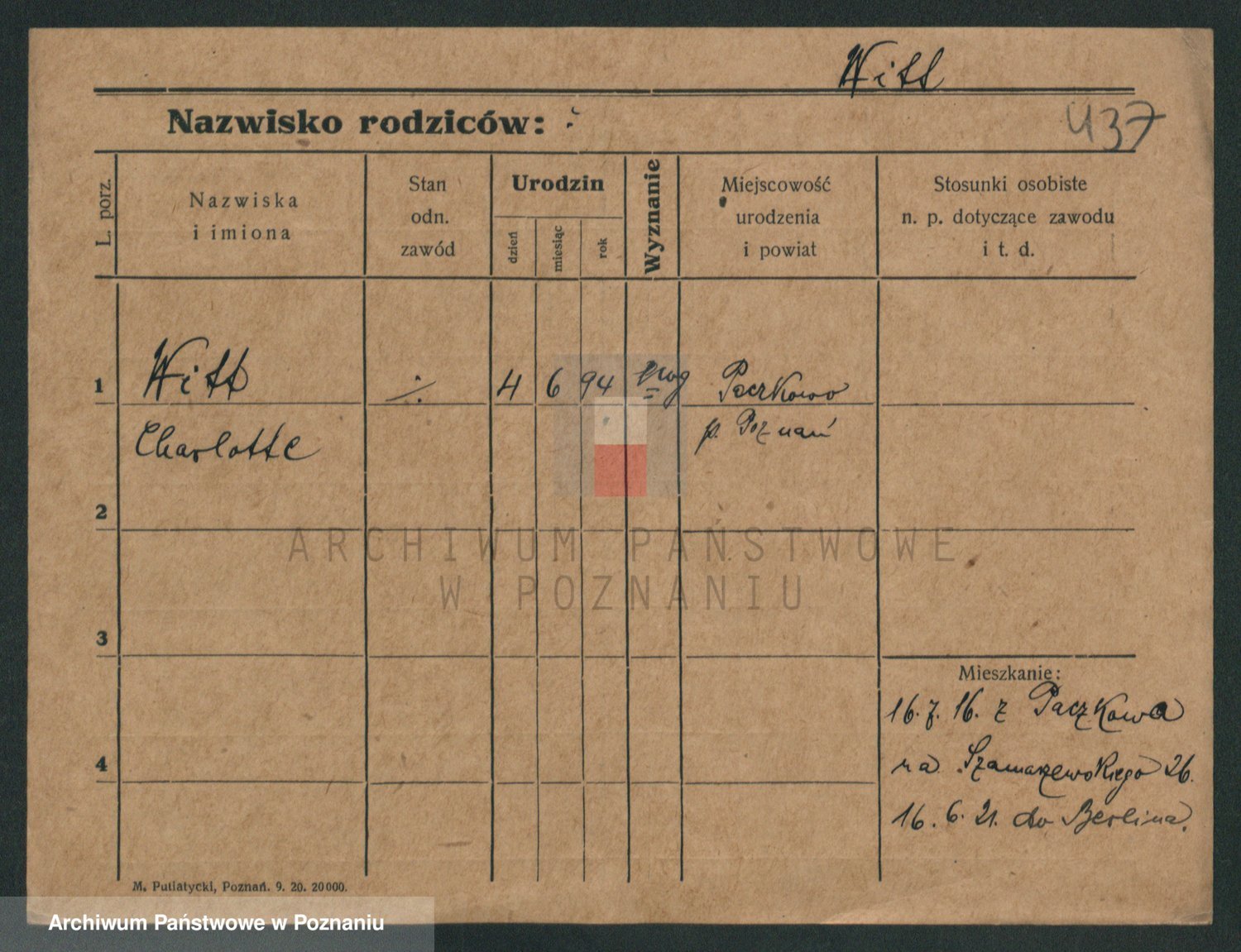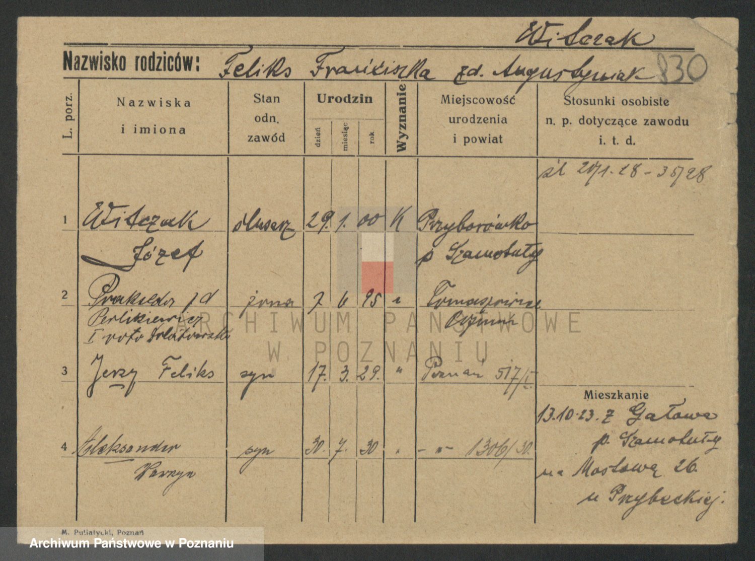Podgląd karty osobowej dostępny jest po kliknięciu na nazwisko lub ikonkę karty. Można dokonywać powiększenia (ikony na górze) lub przechodzić między kolejnymi skanami (strzałki po bokach).