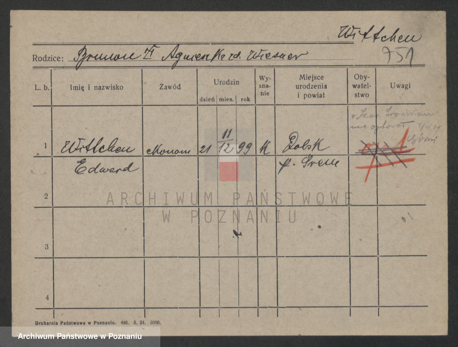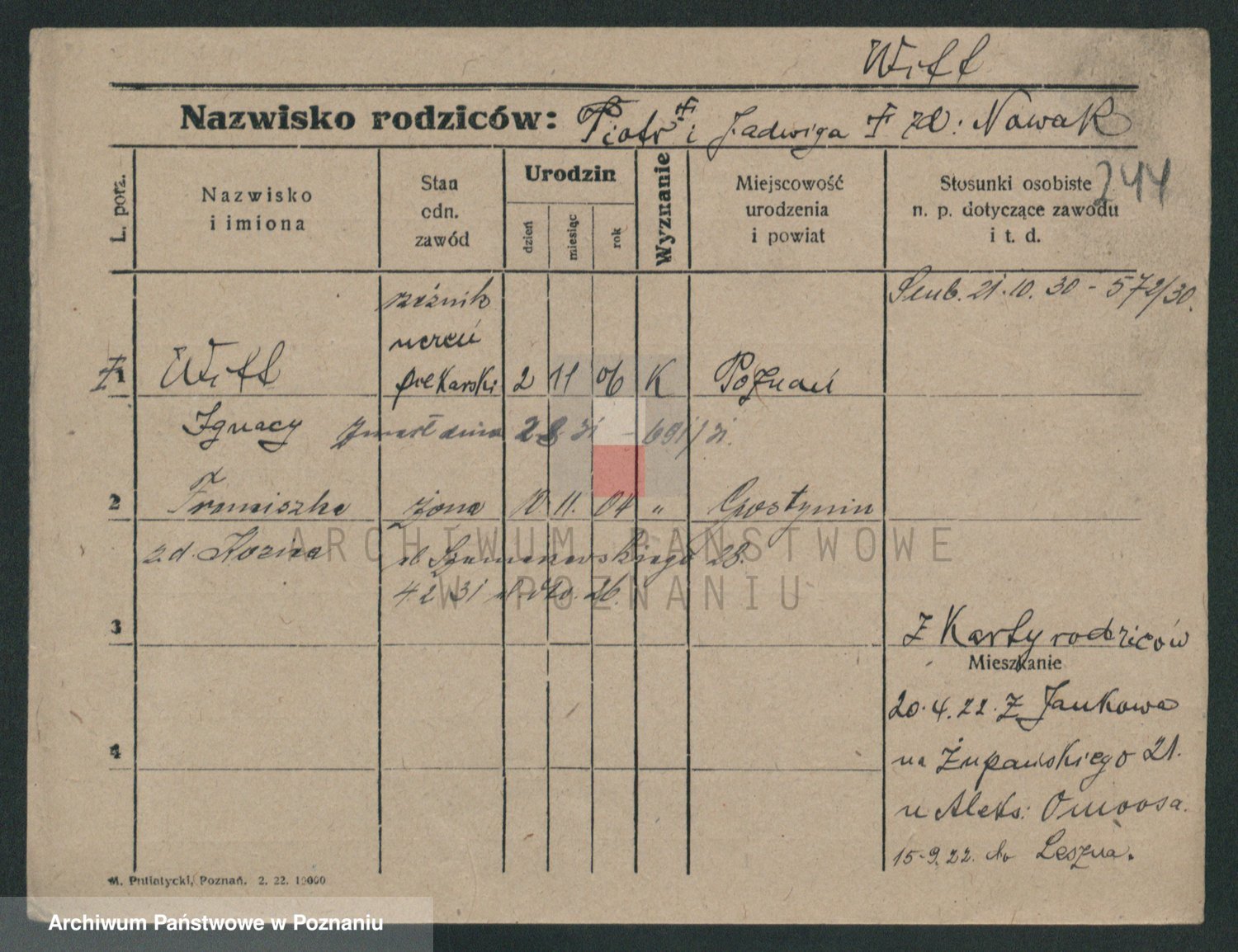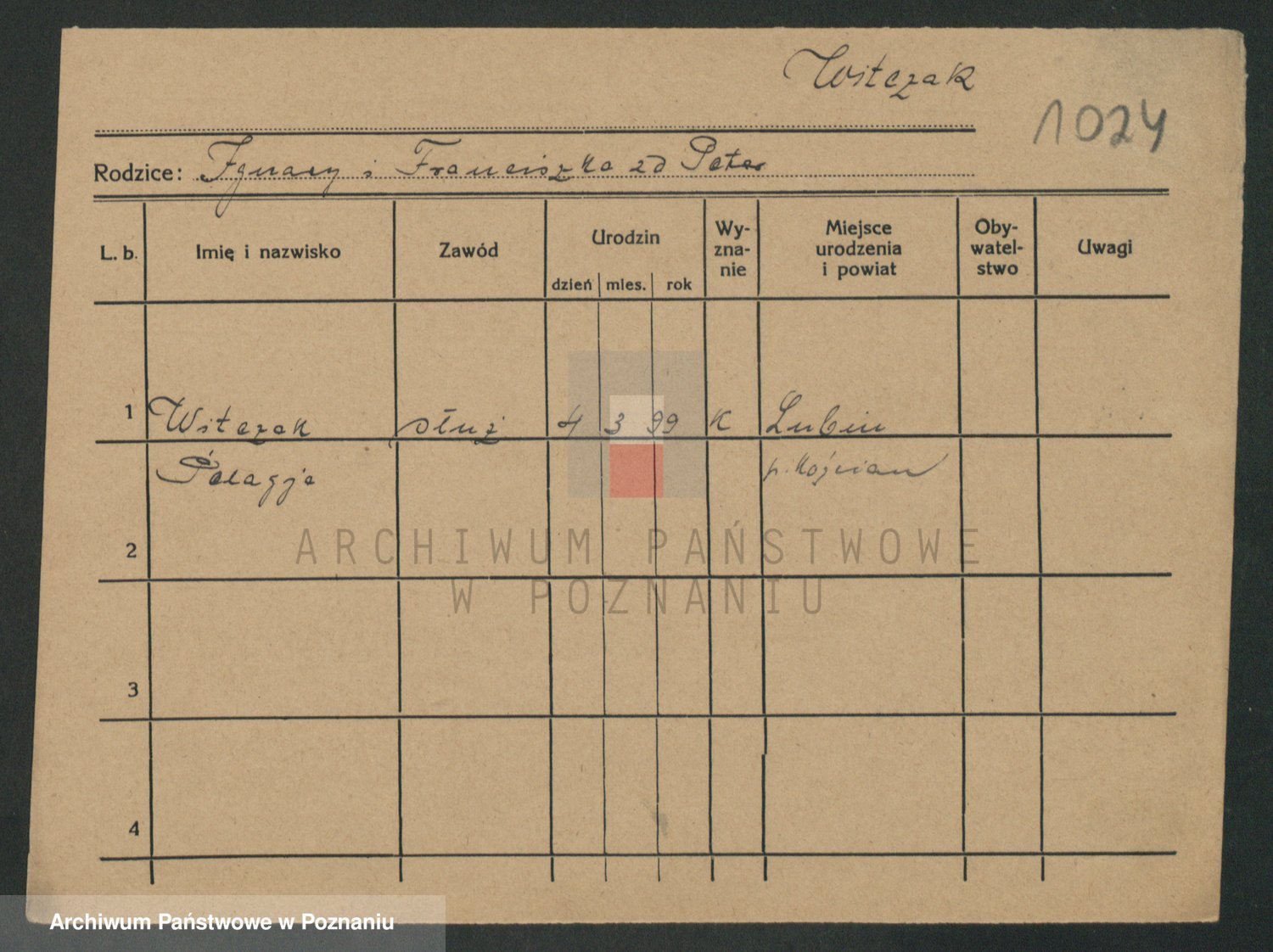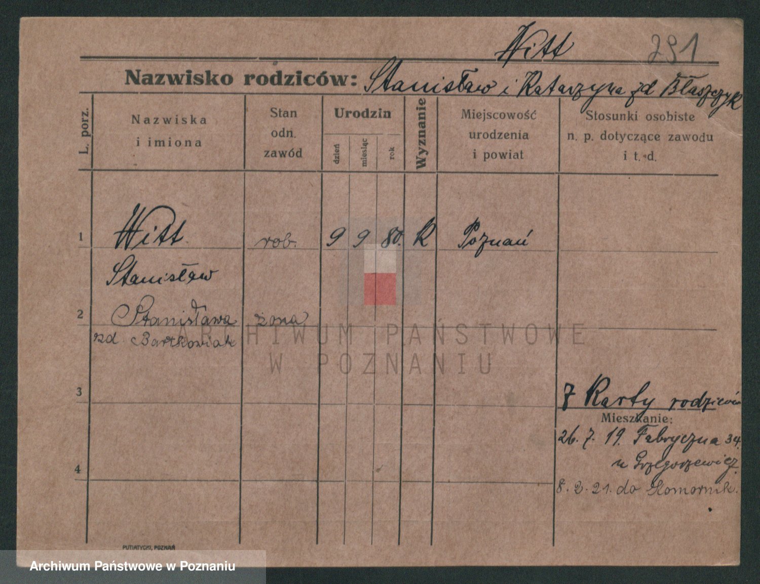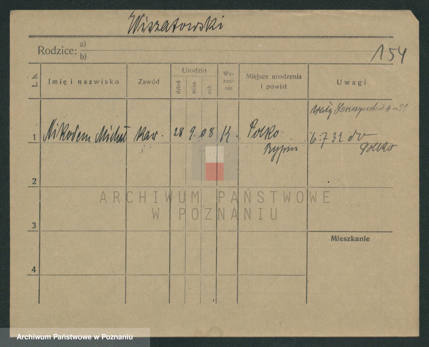 Podgląd karty osobowej dostępny jest po kliknięciu na nazwisko lub ikonkę karty. Można dokonywać powiększenia (ikony na górze) lub przechodzić między kolejnymi skanami (strzałki po bokach).