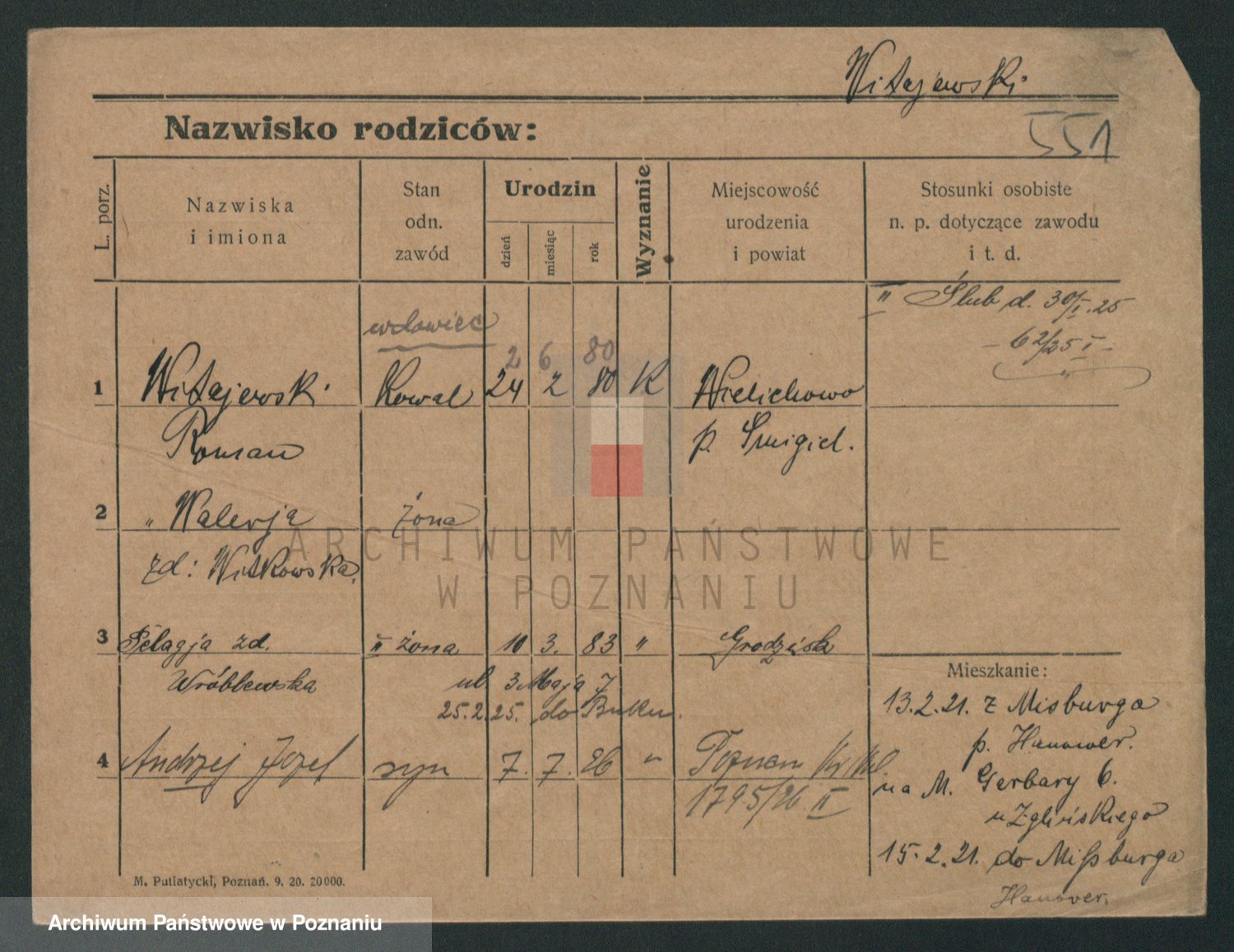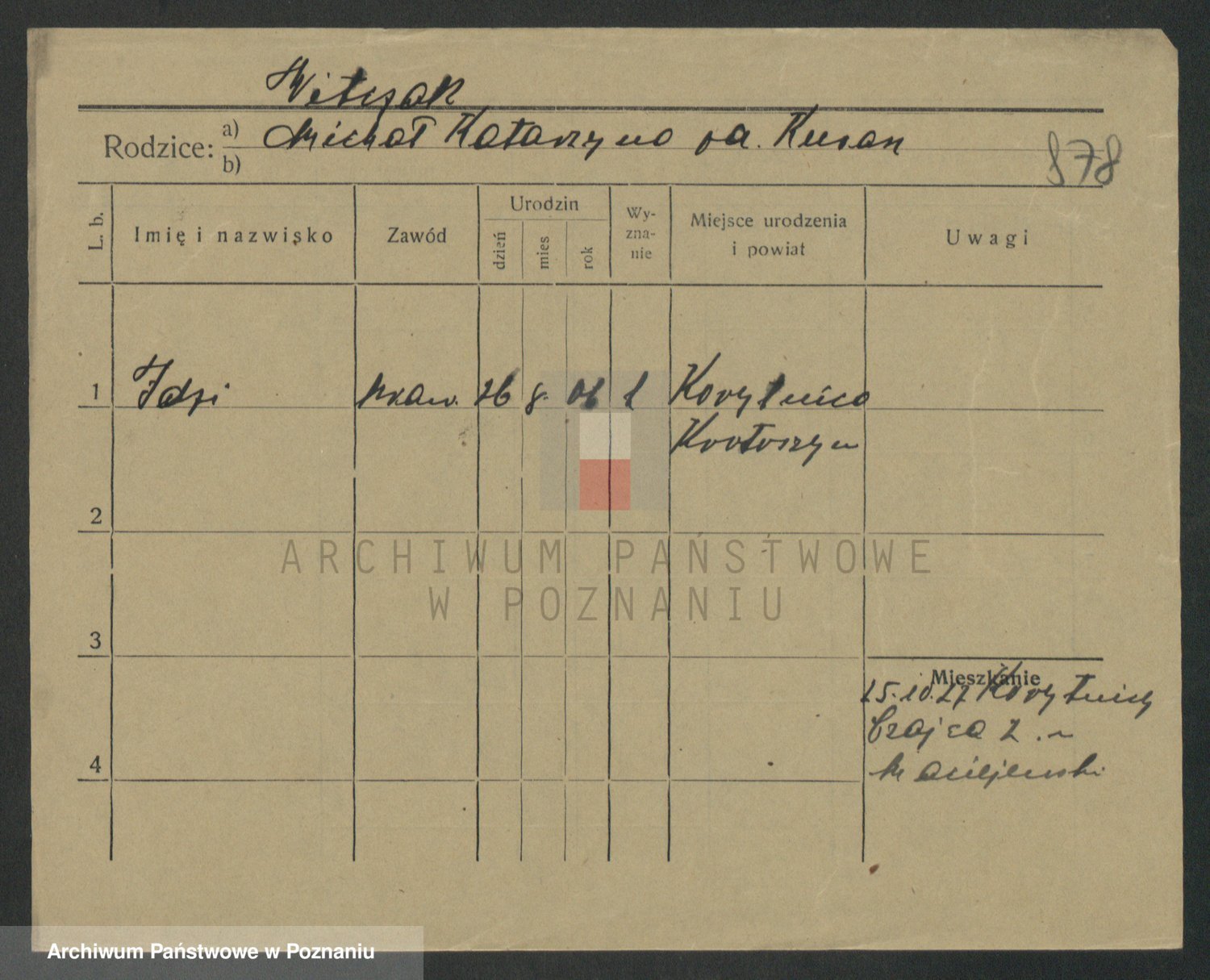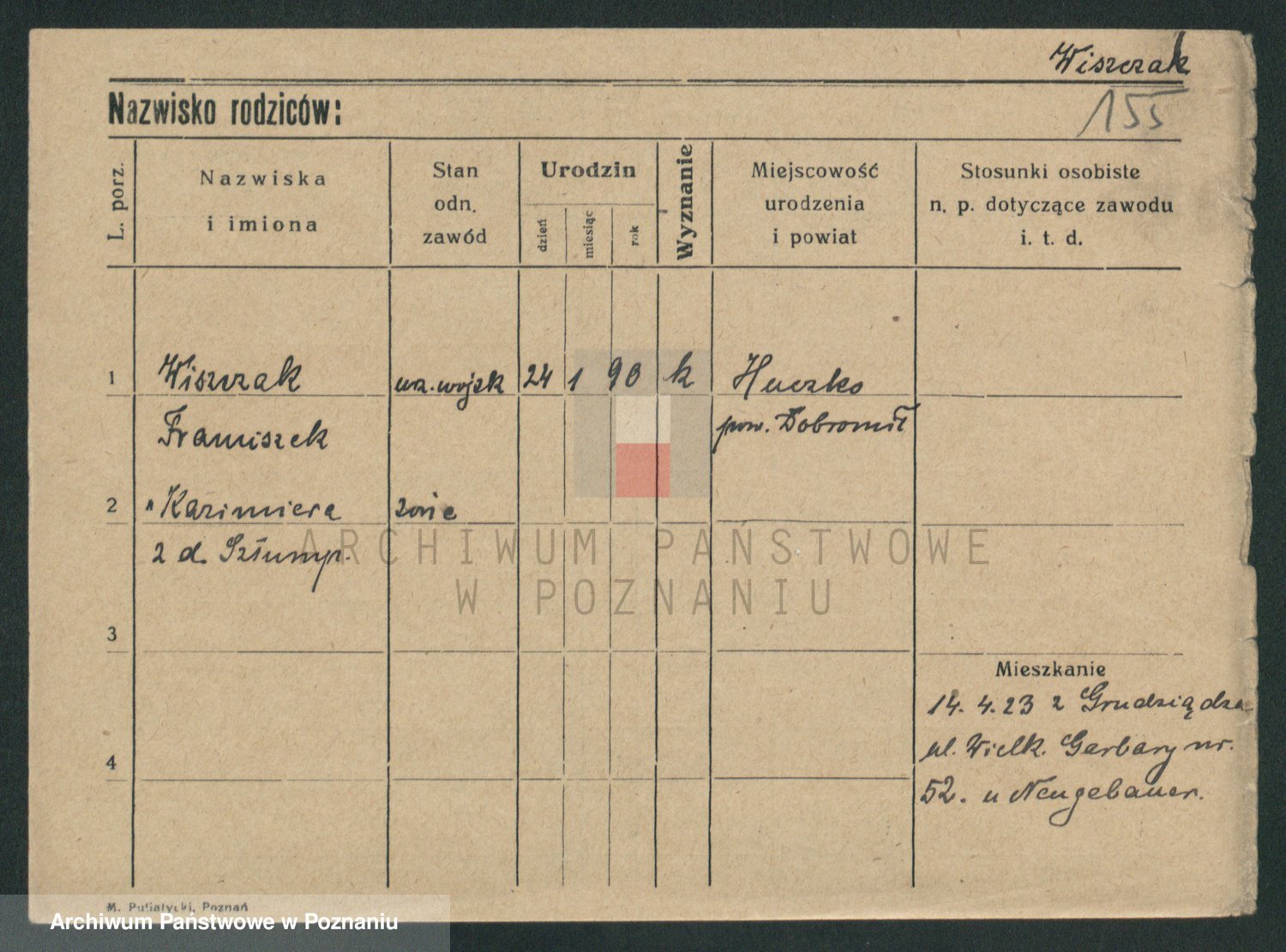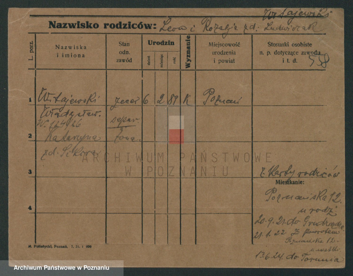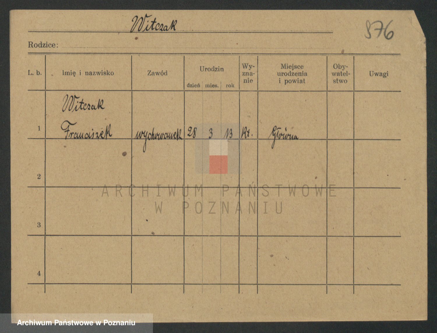 Podgląd karty osobowej dostępny jest po kliknięciu na nazwisko lub ikonkę karty. Można dokonywać powiększenia (ikony na górze) lub przechodzić między kolejnymi skanami (strzałki po bokach).