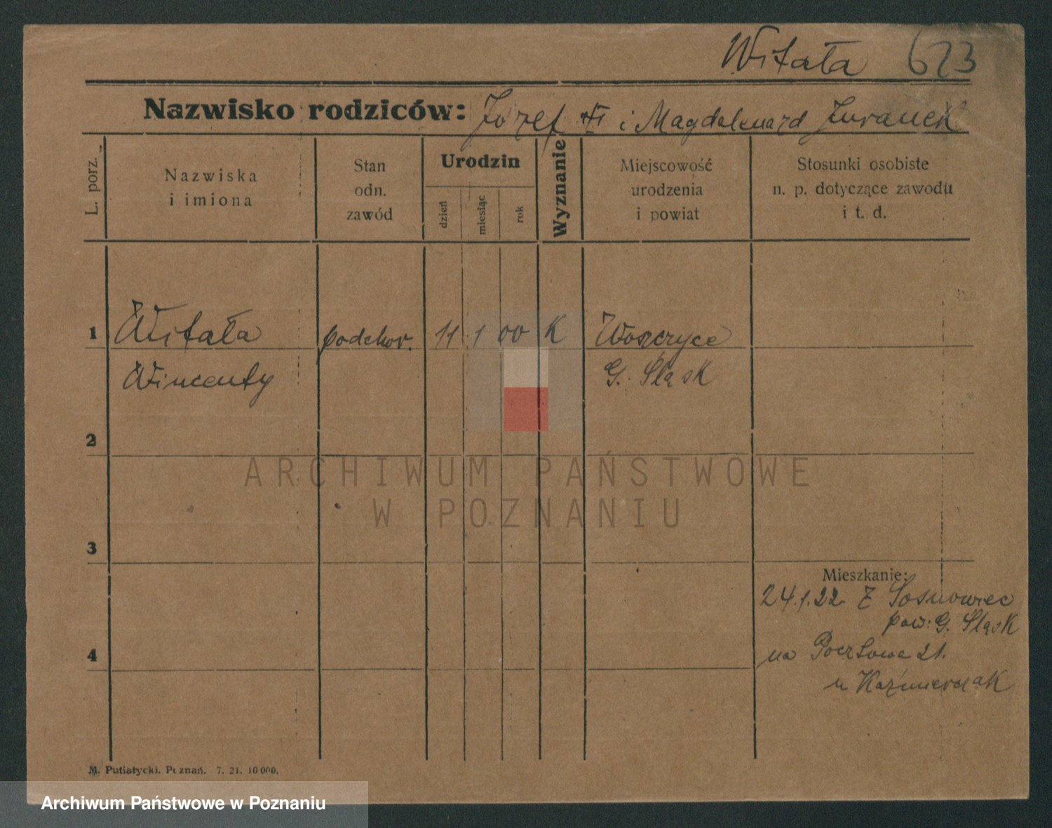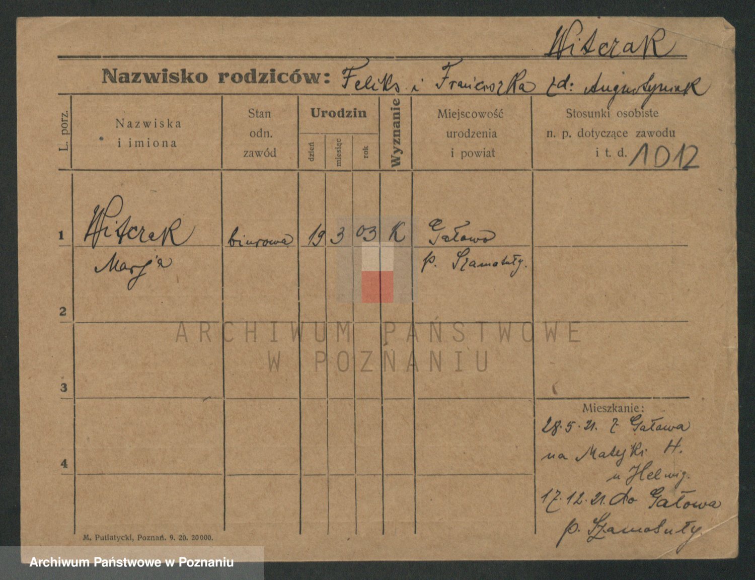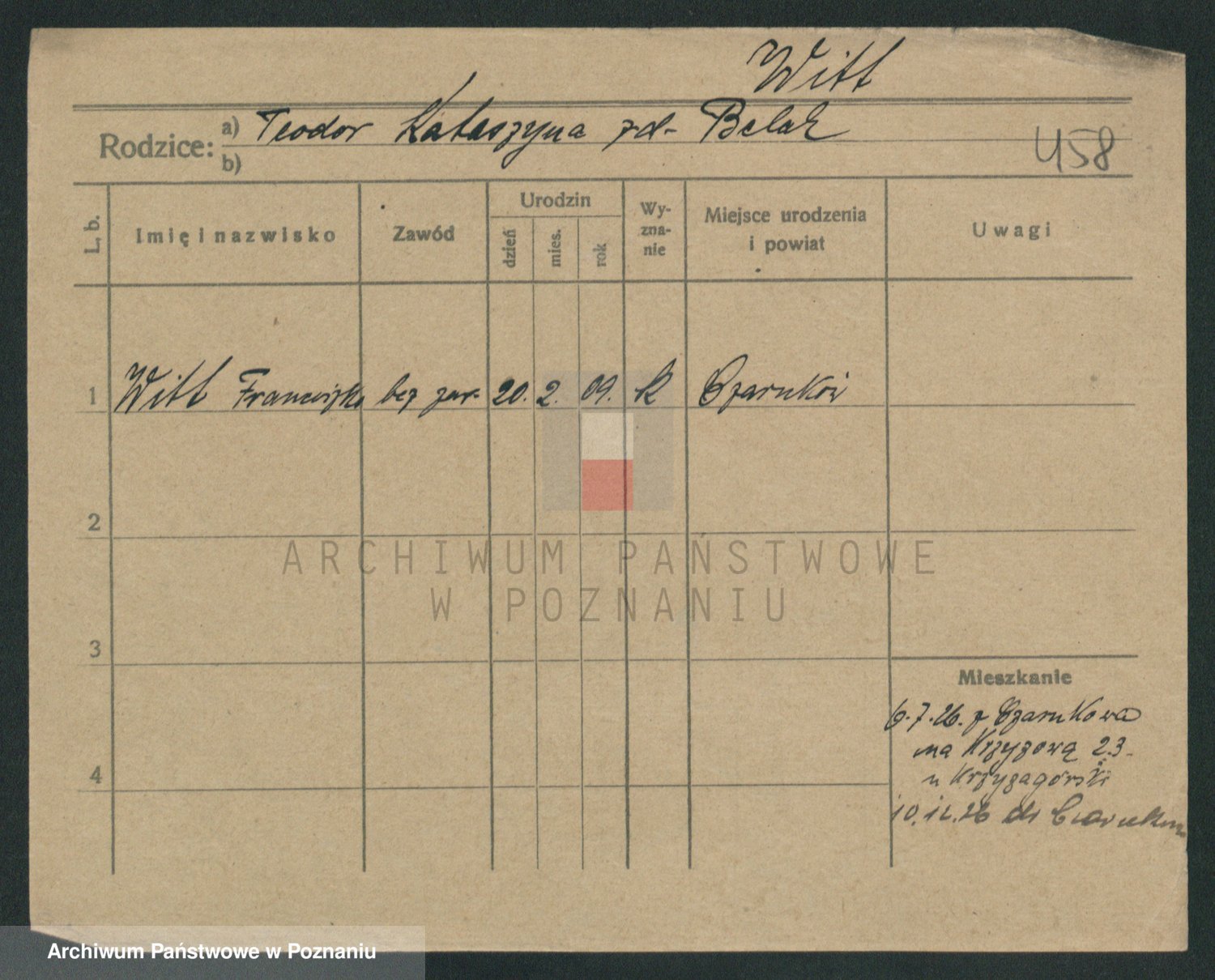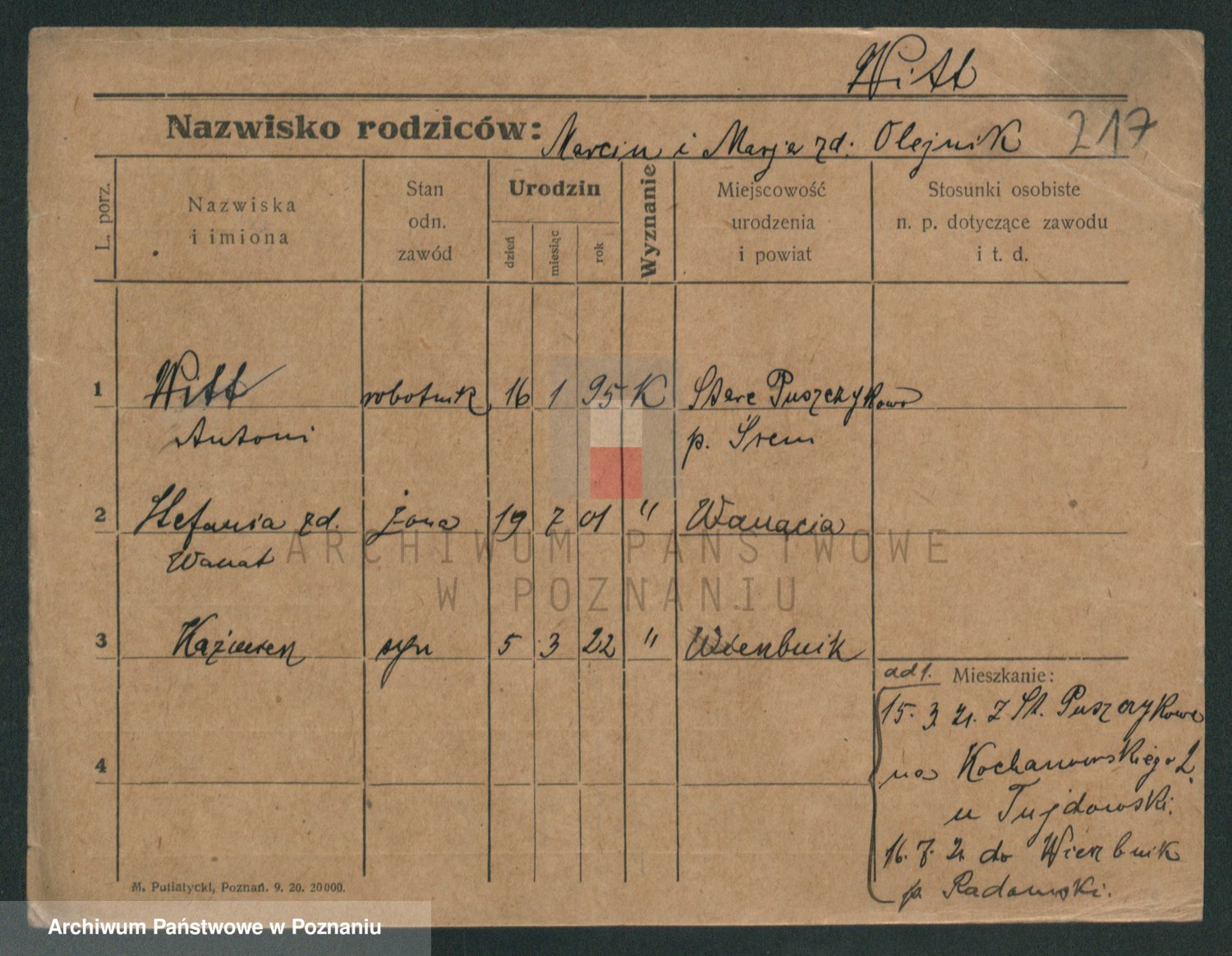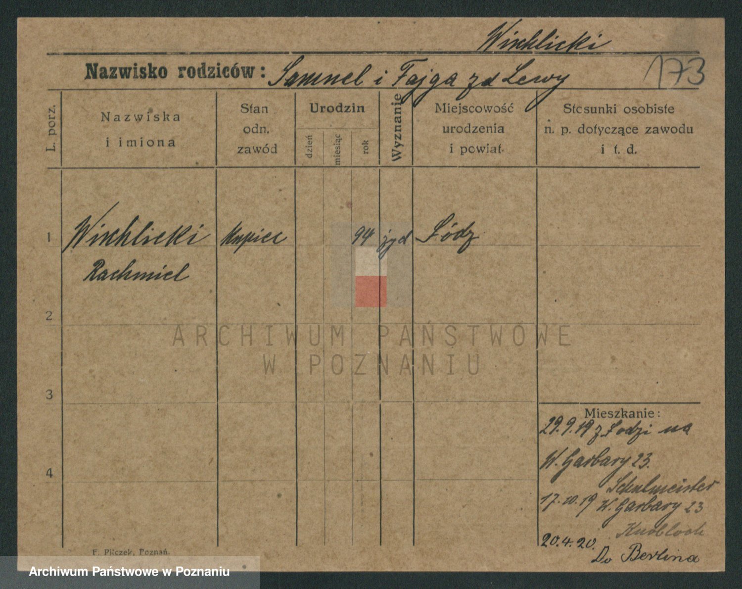 Podgląd karty osobowej dostępny jest po kliknięciu na nazwisko lub ikonkę karty. Można dokonywać powiększenia (ikony na górze) lub przechodzić między kolejnymi skanami (strzałki po bokach).