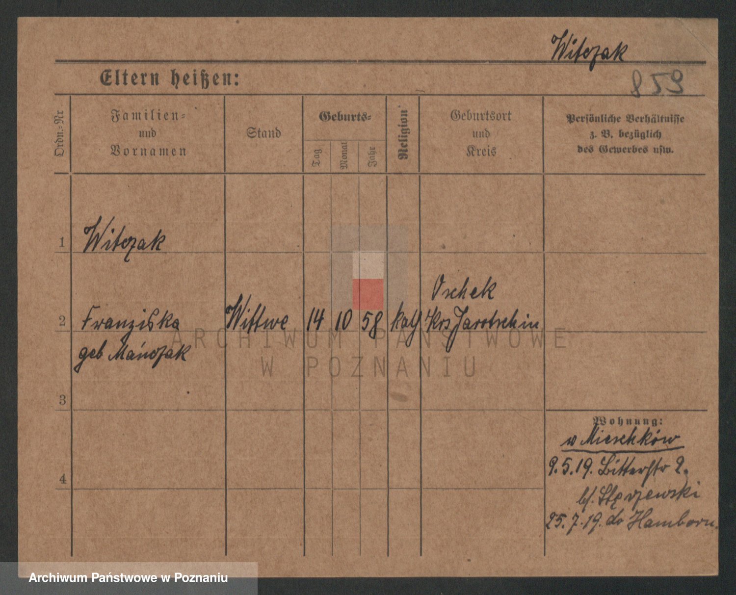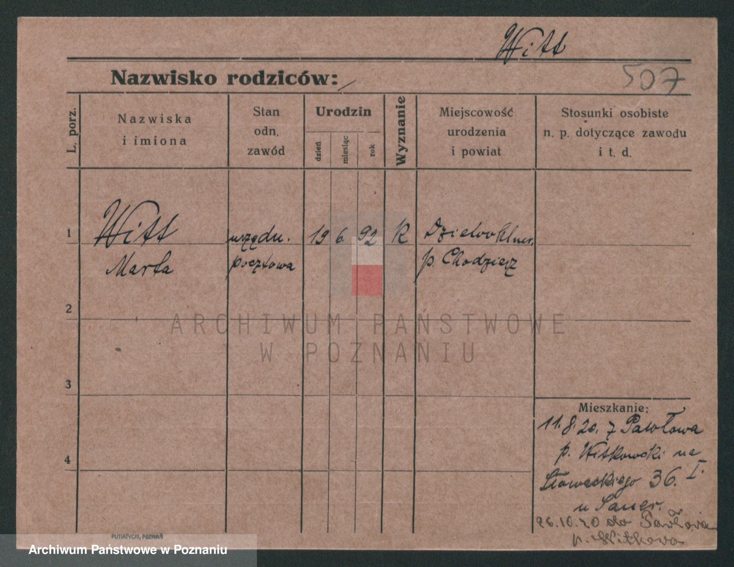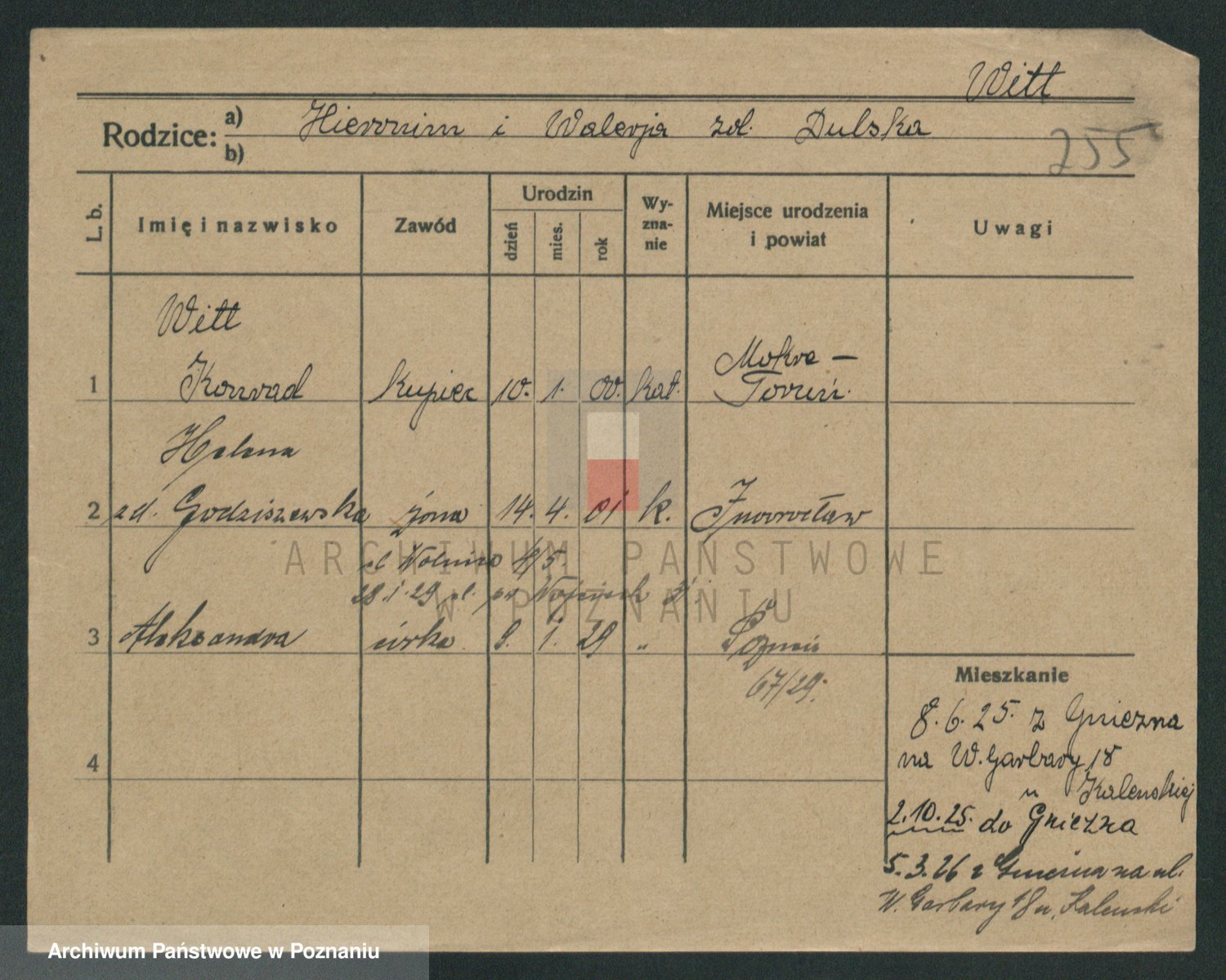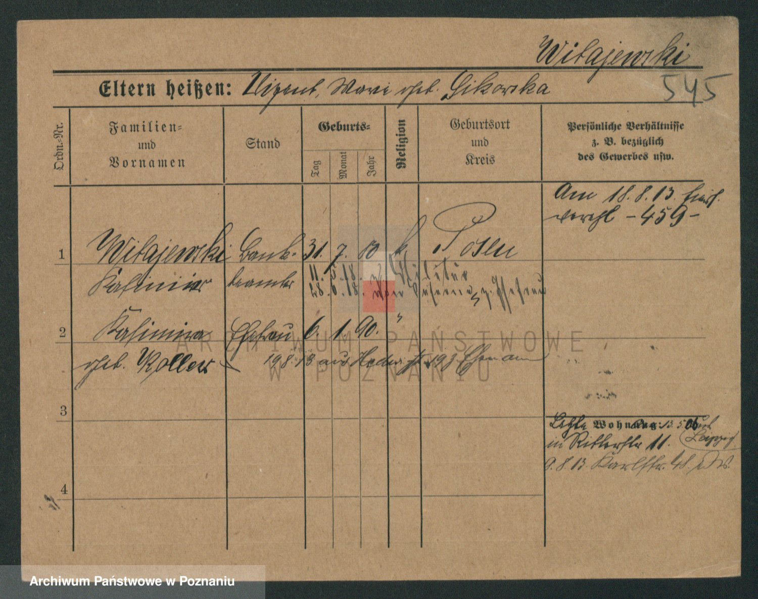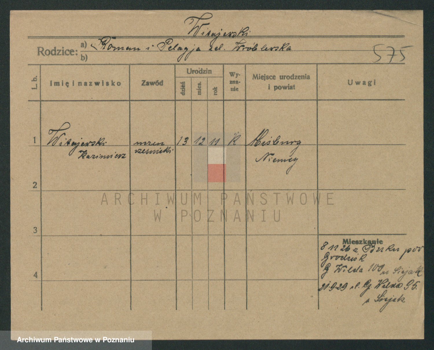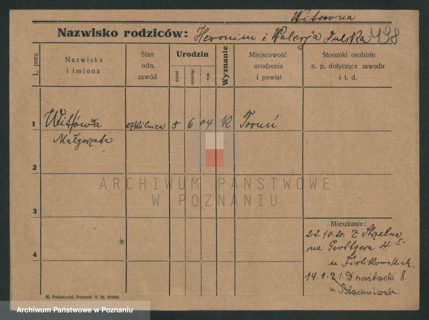 Podgląd karty osobowej dostępny jest po kliknięciu na nazwisko lub ikonkę karty. Można dokonywać powiększenia (ikony na górze) lub przechodzić między kolejnymi skanami (strzałki po bokach).