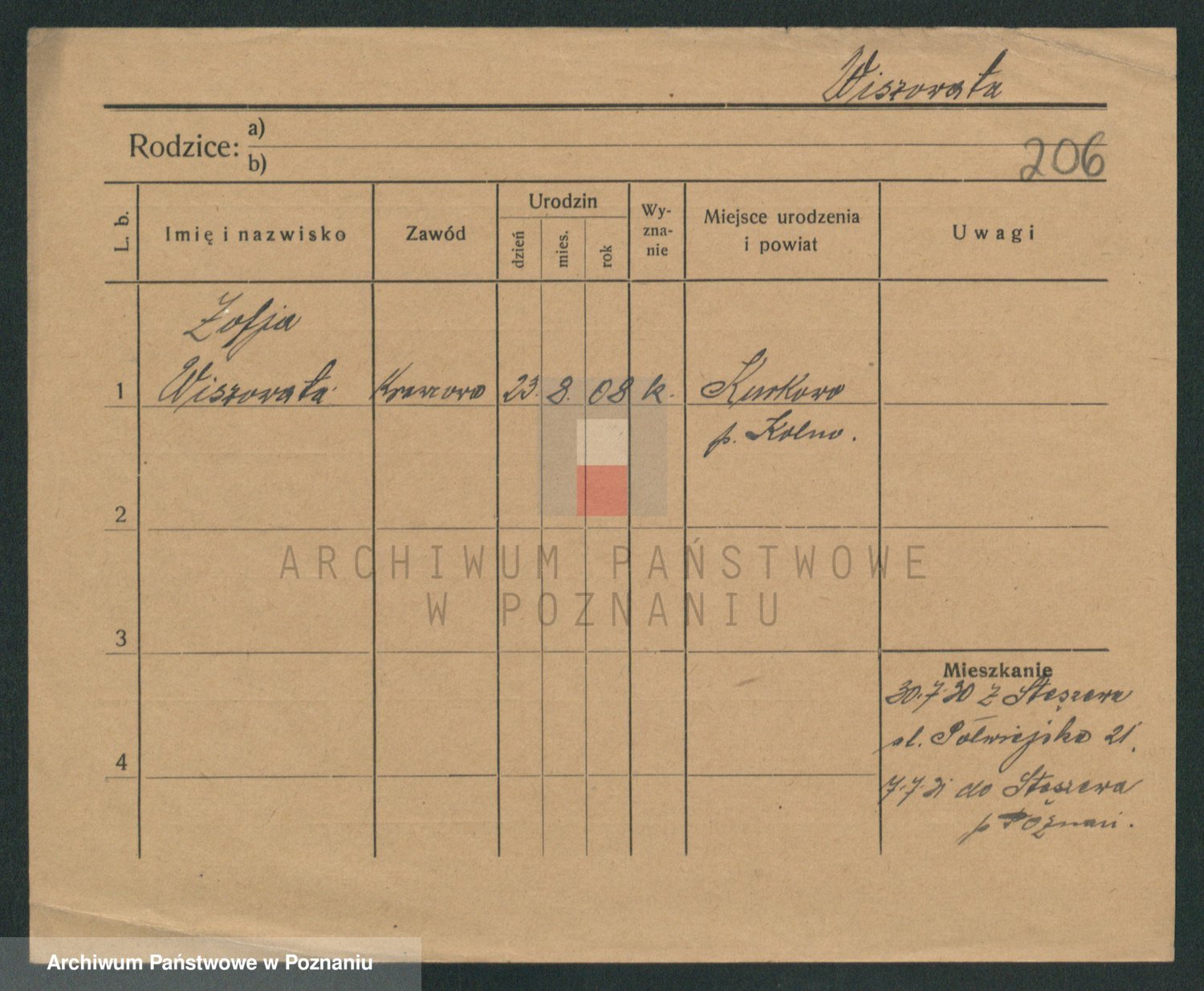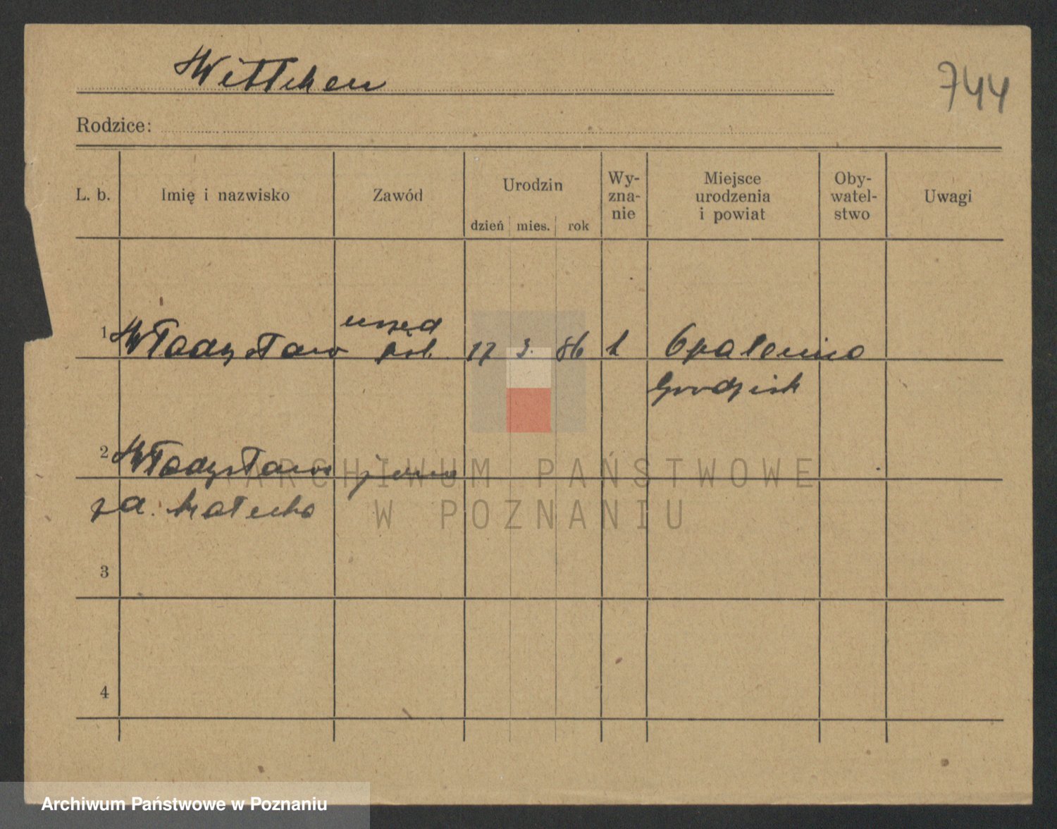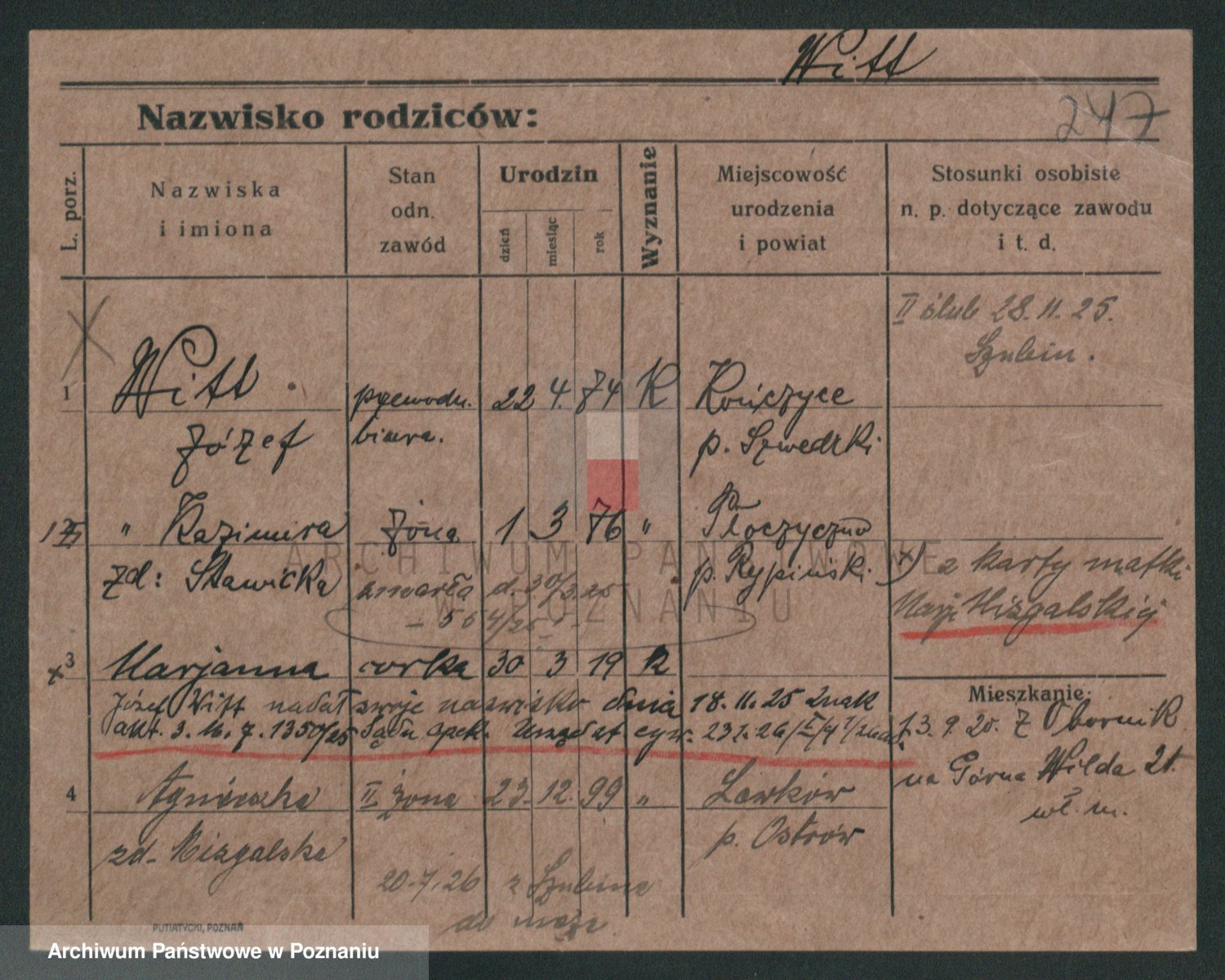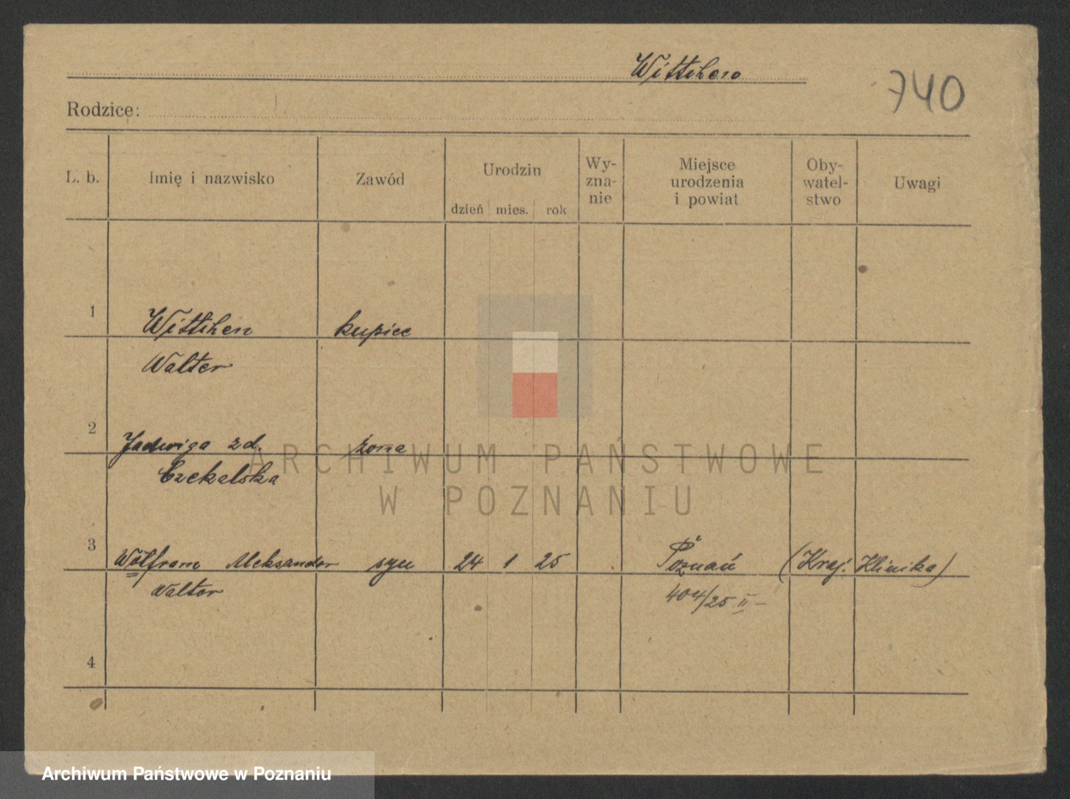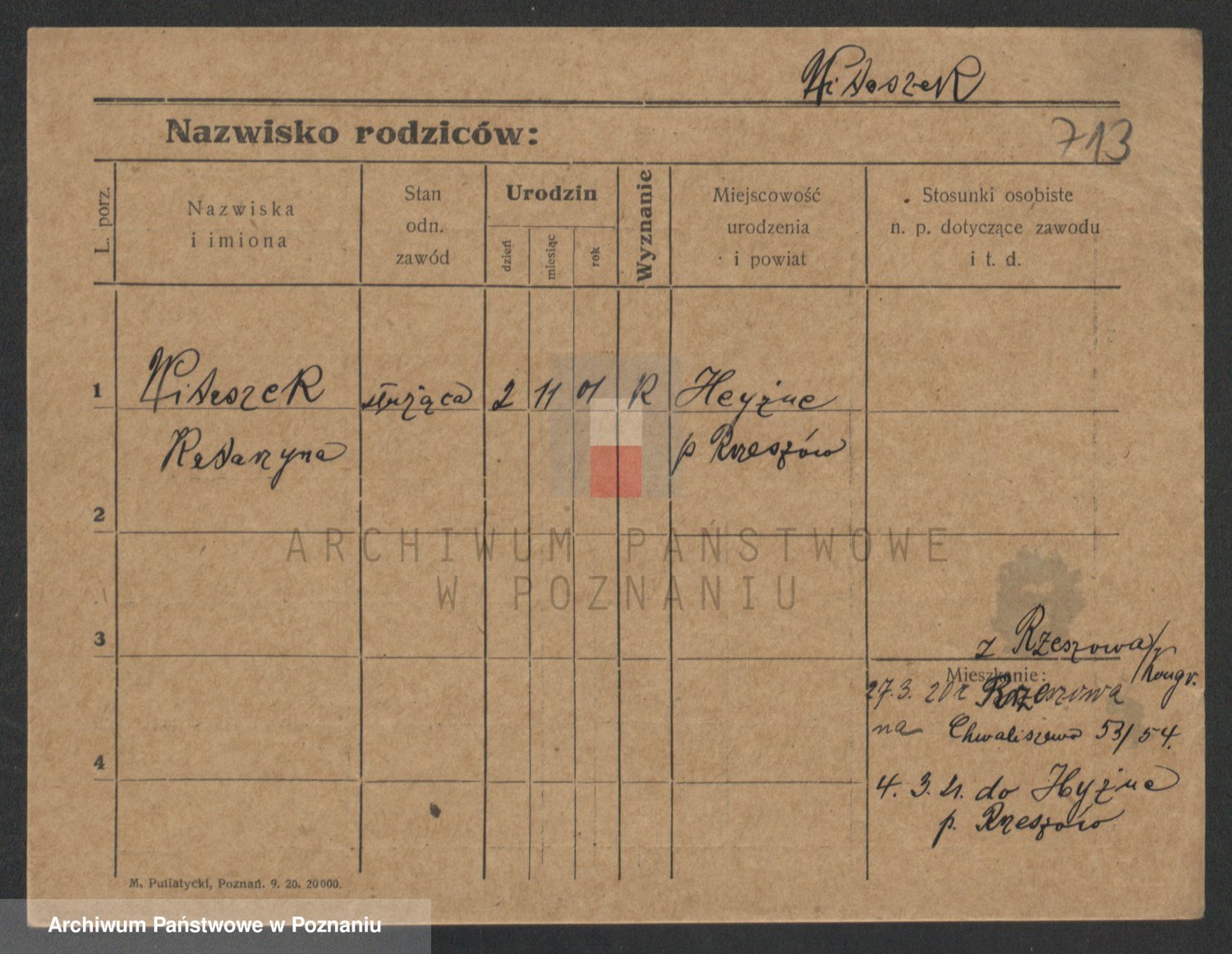 Podgląd karty osobowej dostępny jest po kliknięciu na nazwisko lub ikonkę karty. Można dokonywać powiększenia (ikony na górze) lub przechodzić między kolejnymi skanami (strzałki po bokach).