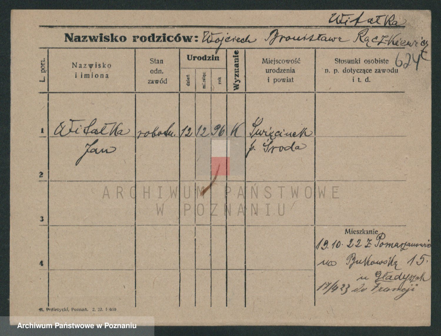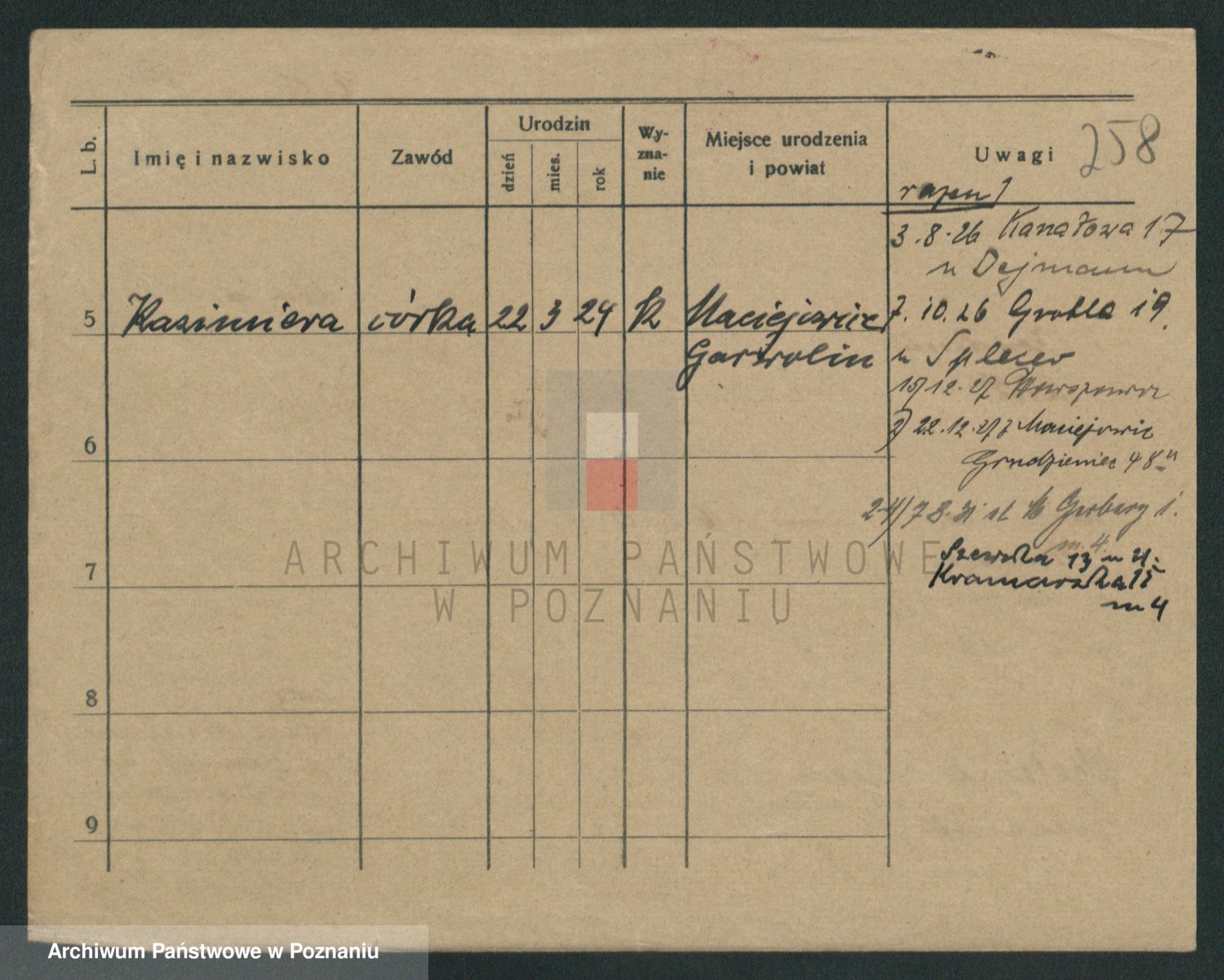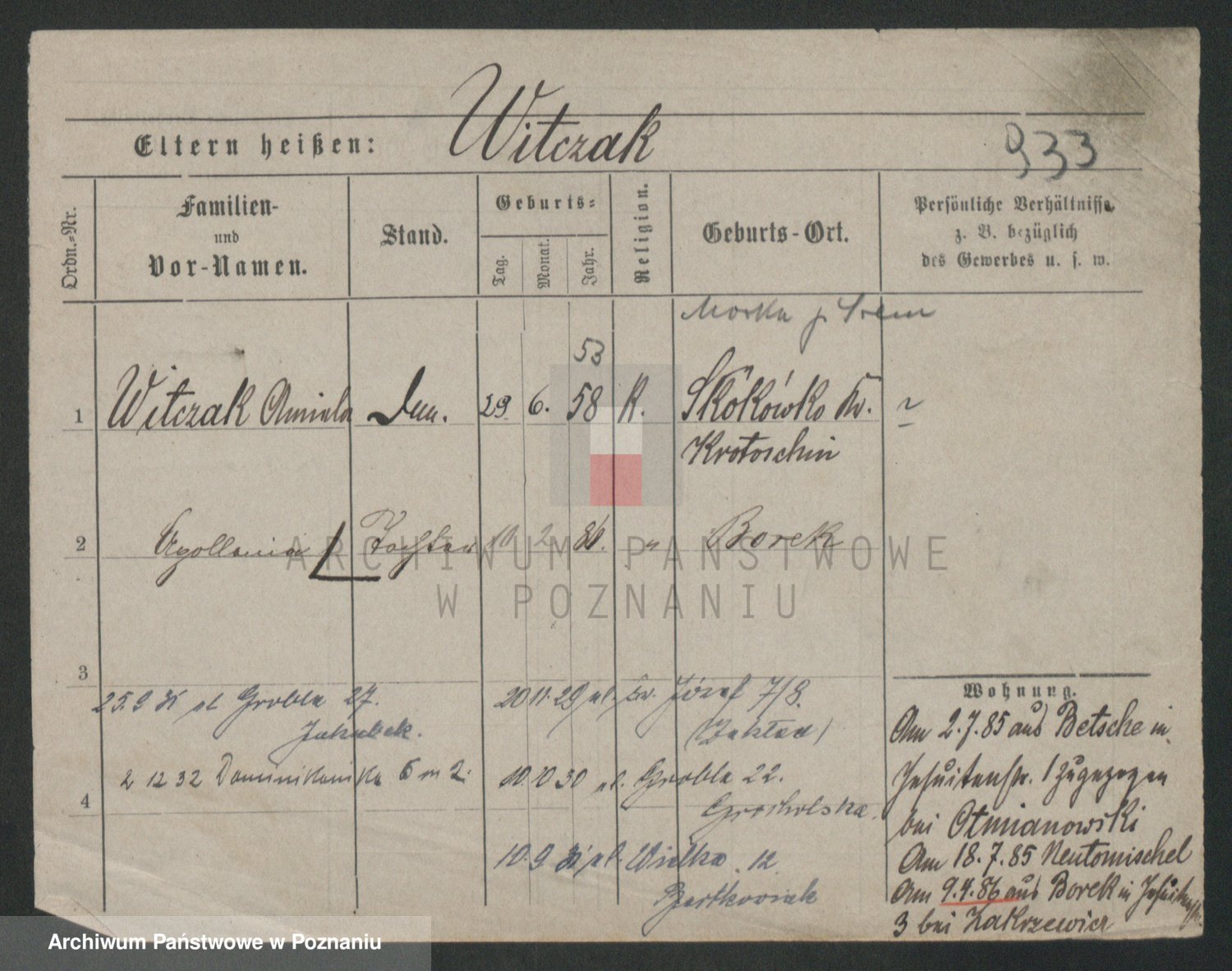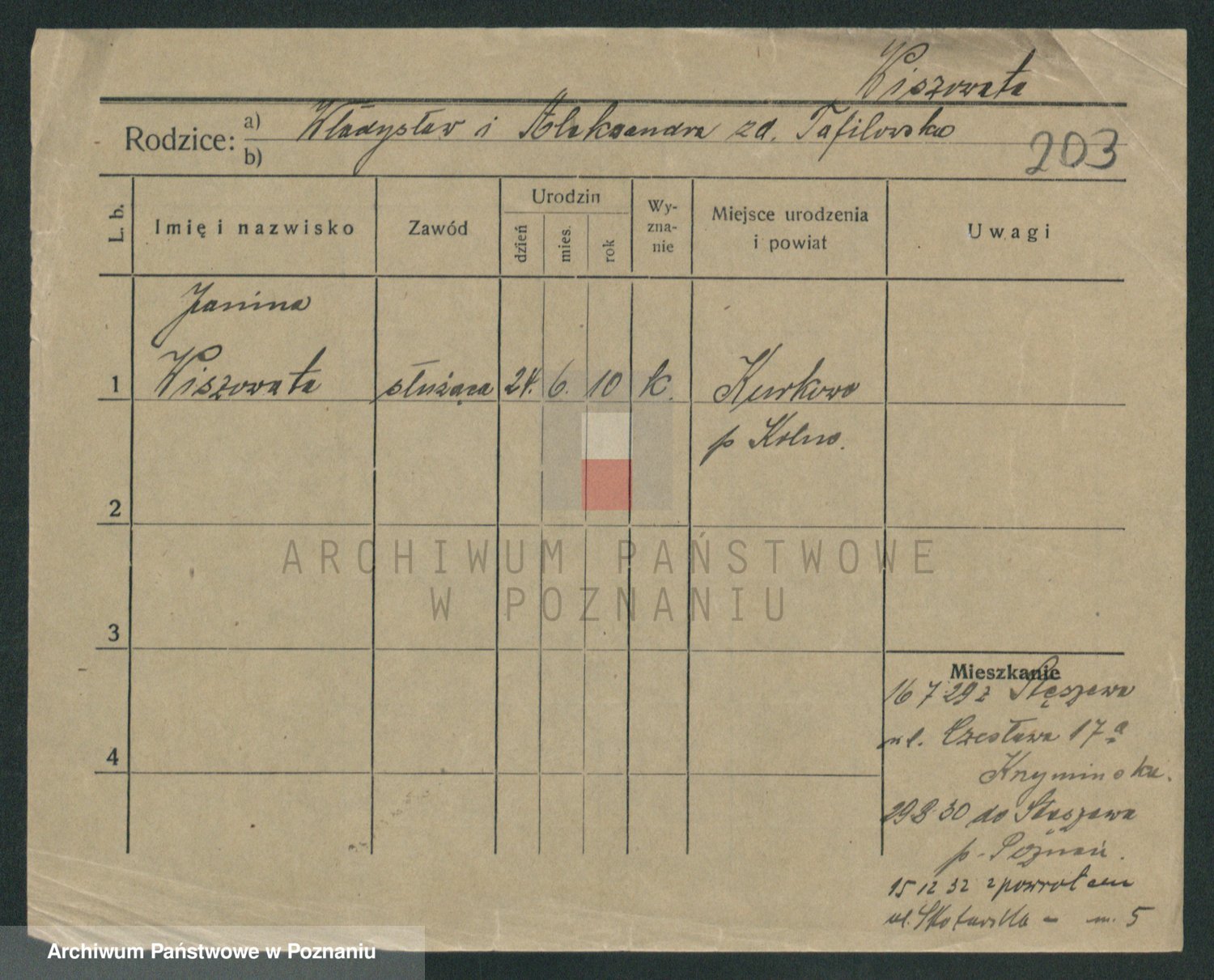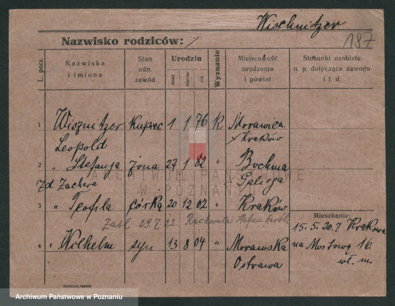 Podgląd karty osobowej dostępny jest po kliknięciu na nazwisko lub ikonkę karty. Można dokonywać powiększenia (ikony na górze) lub przechodzić między kolejnymi skanami (strzałki po bokach).
