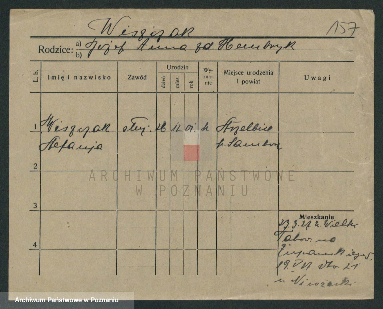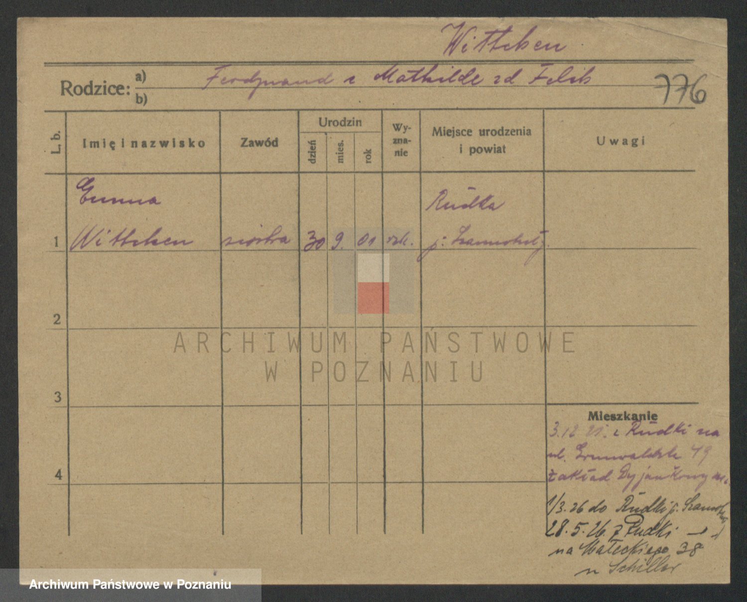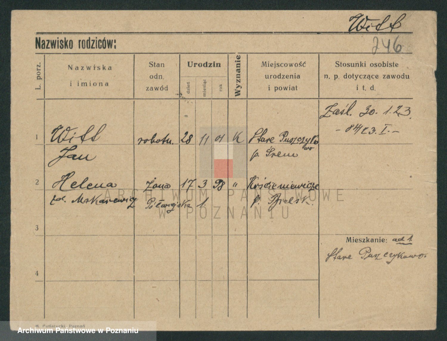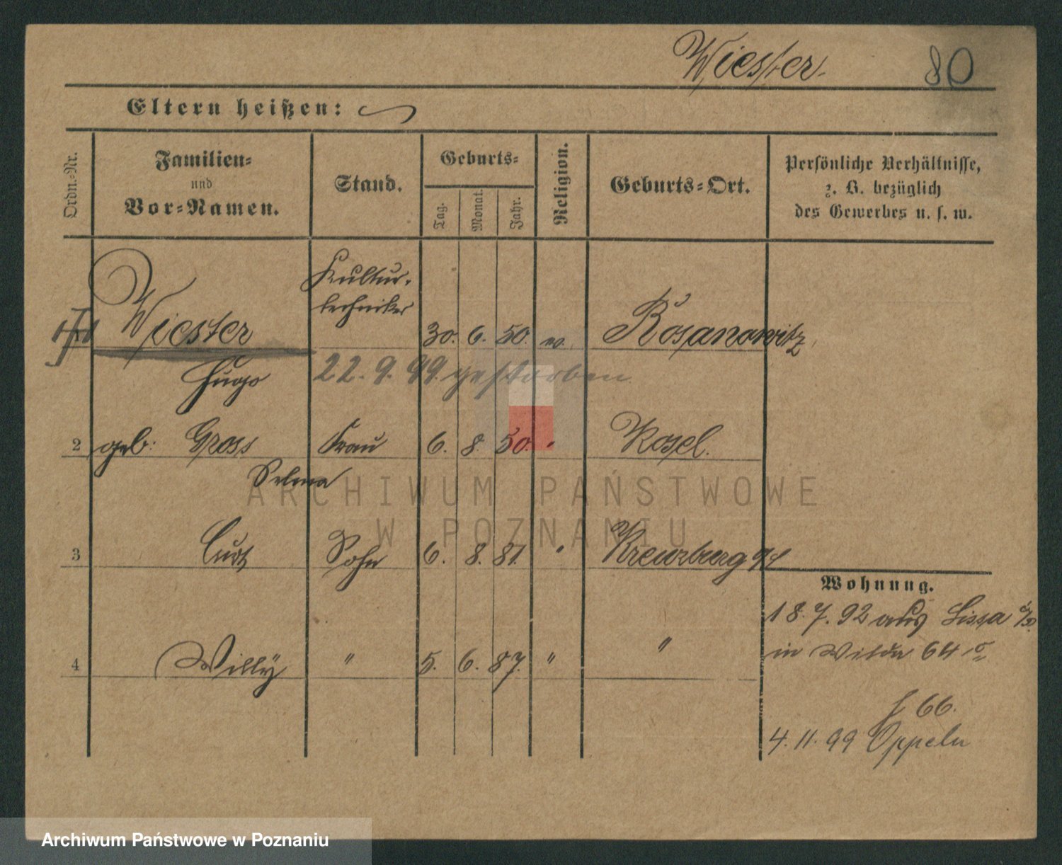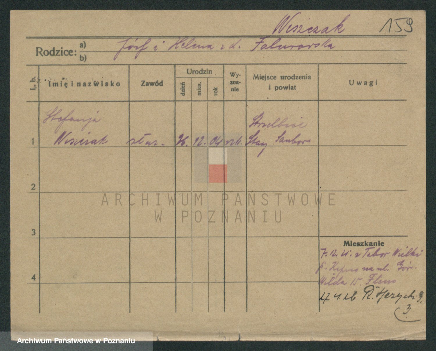 Podgląd karty osobowej dostępny jest po kliknięciu na nazwisko lub ikonkę karty. Można dokonywać powiększenia (ikony na górze) lub przechodzić między kolejnymi skanami (strzałki po bokach).
