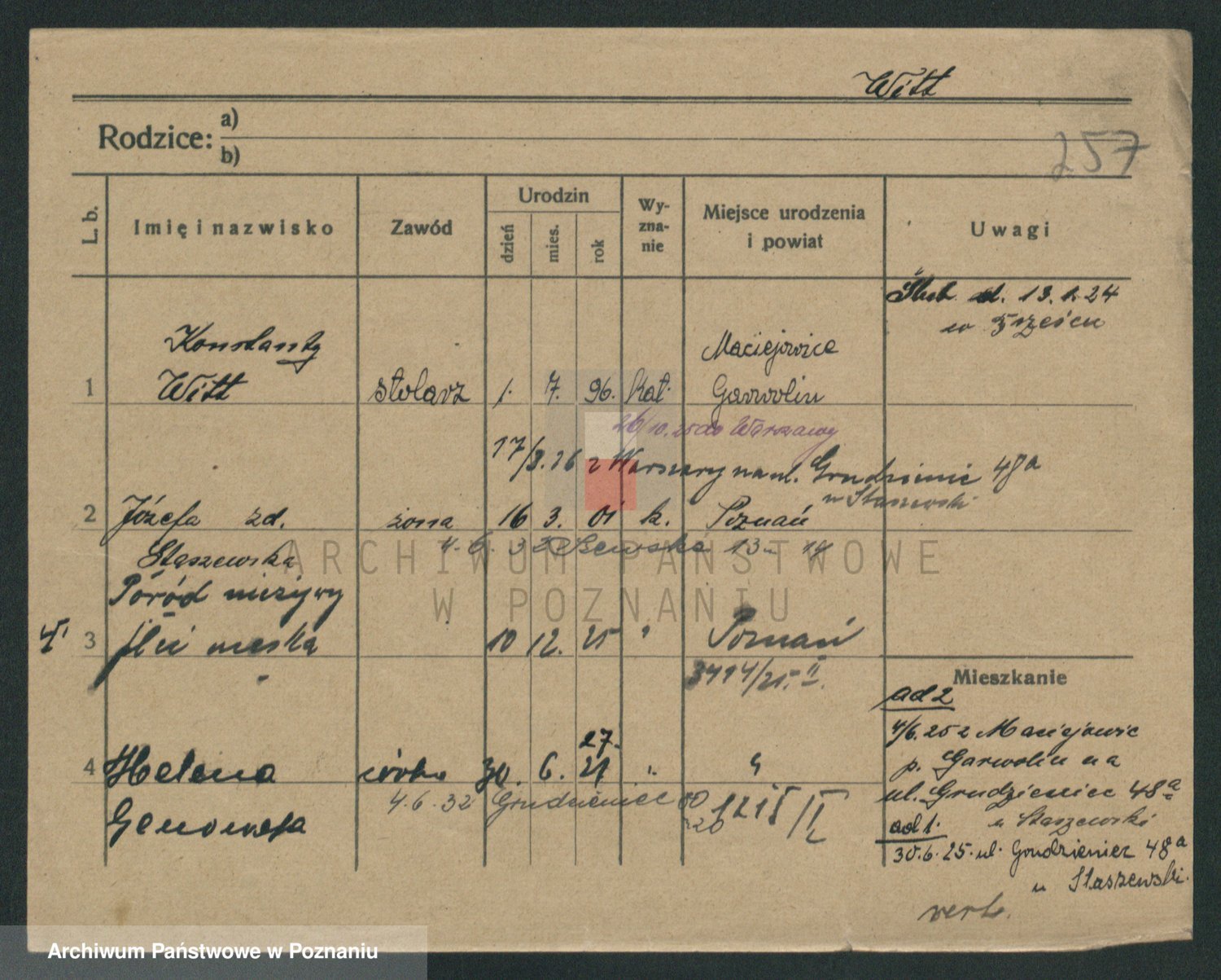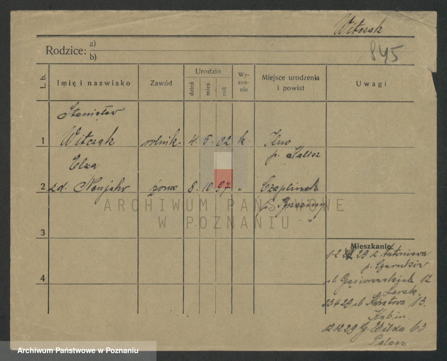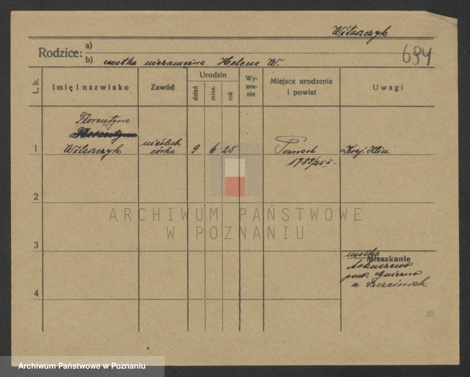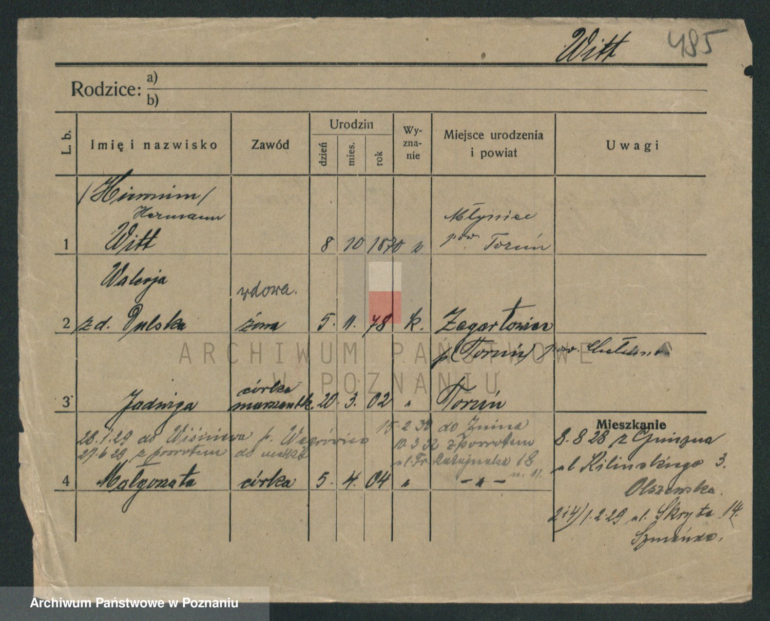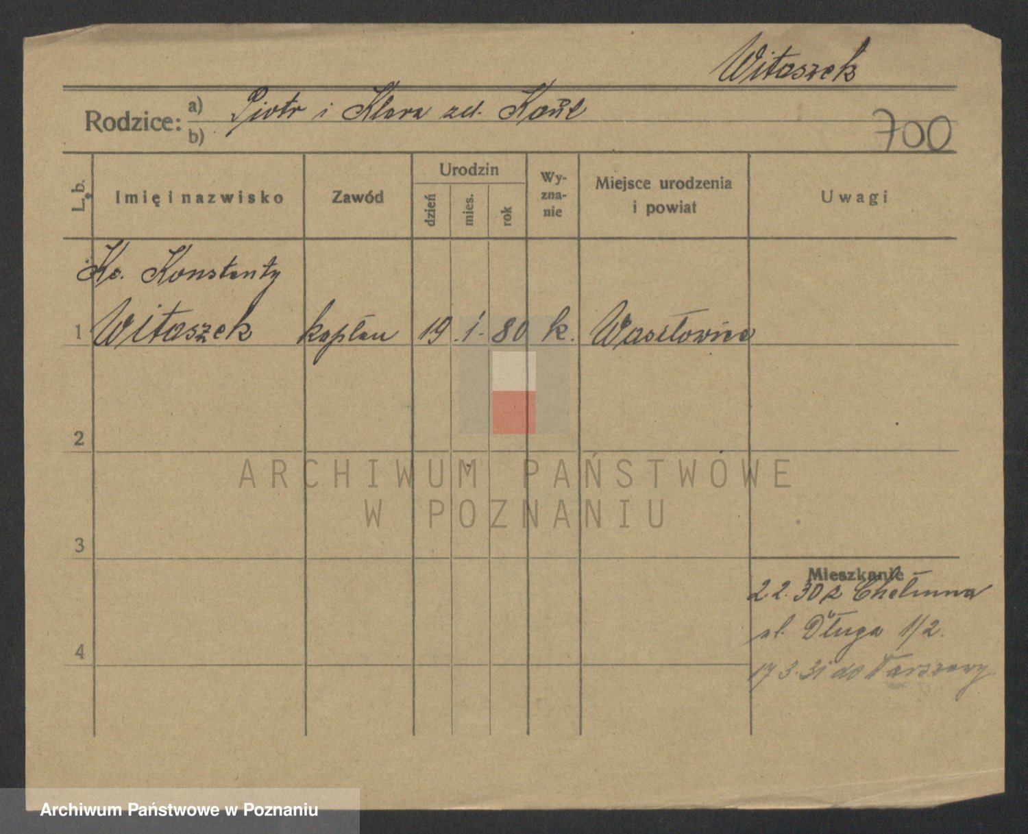 Podgląd karty osobowej dostępny jest po kliknięciu na nazwisko lub ikonkę karty. Można dokonywać powiększenia (ikony na górze) lub przechodzić między kolejnymi skanami (strzałki po bokach).