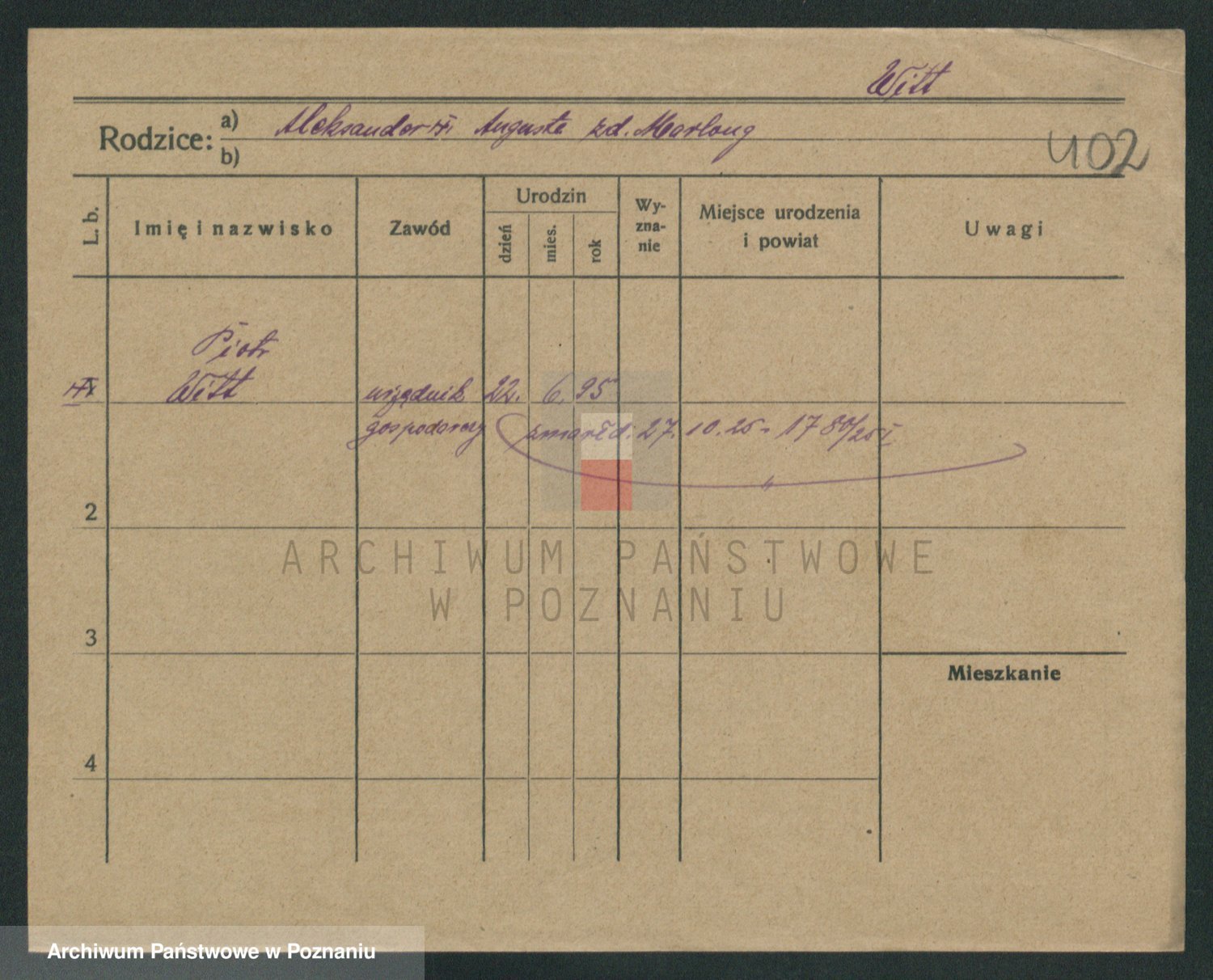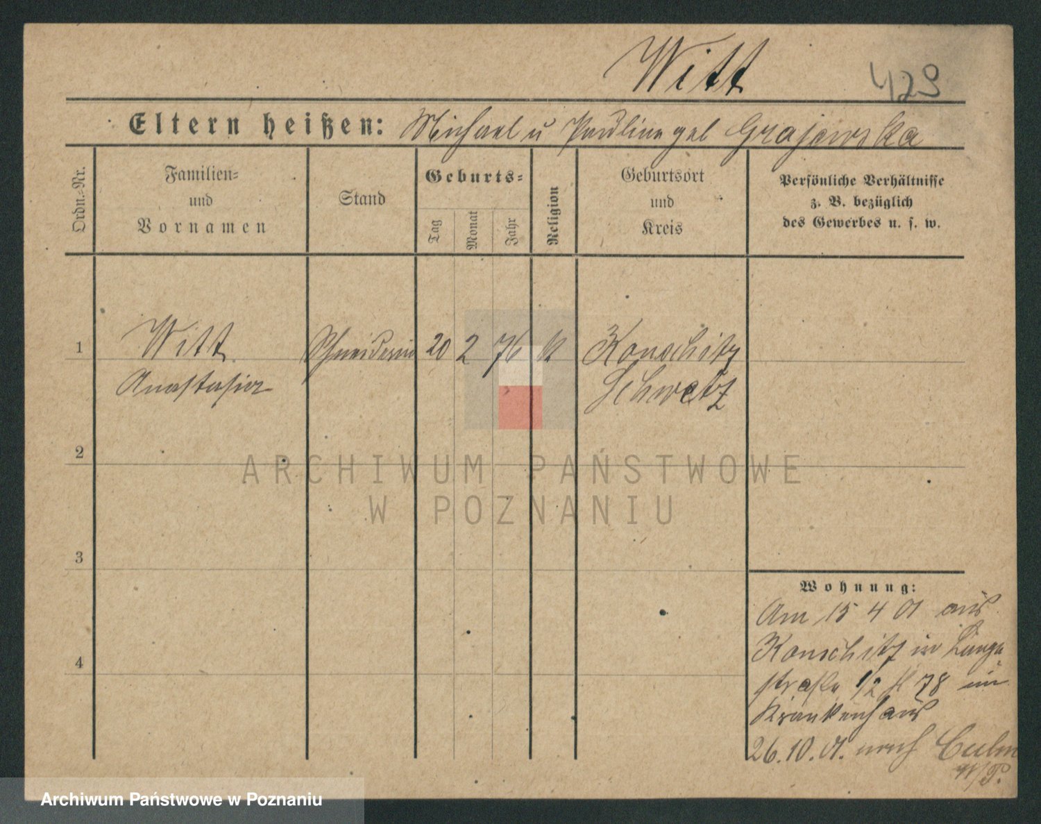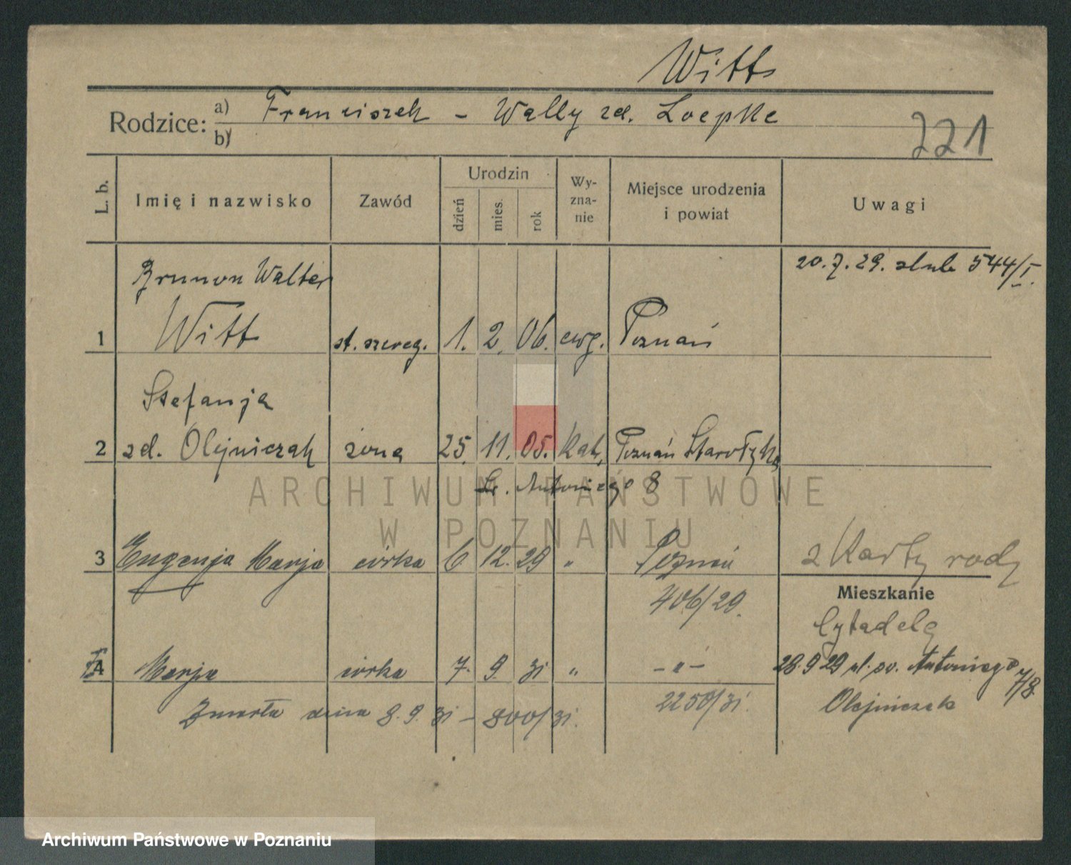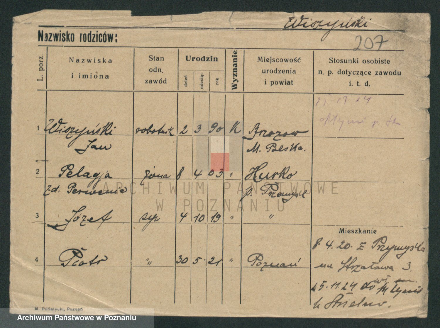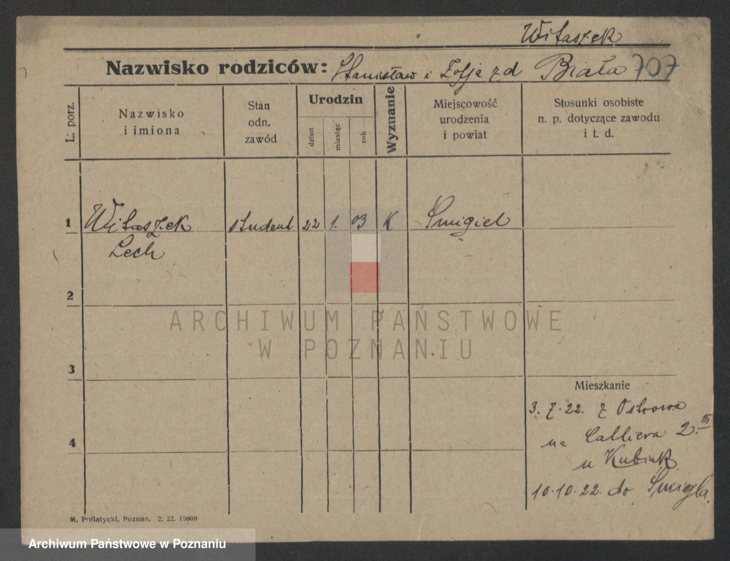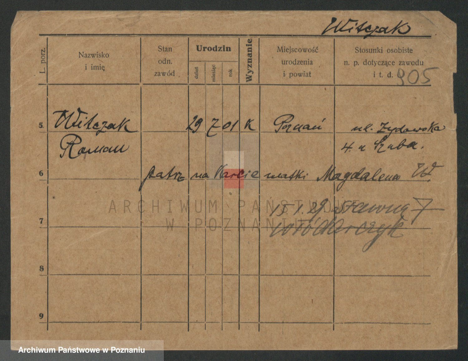 Podgląd karty osobowej dostępny jest po kliknięciu na nazwisko lub ikonkę karty. Można dokonywać powiększenia (ikony na górze) lub przechodzić między kolejnymi skanami (strzałki po bokach).