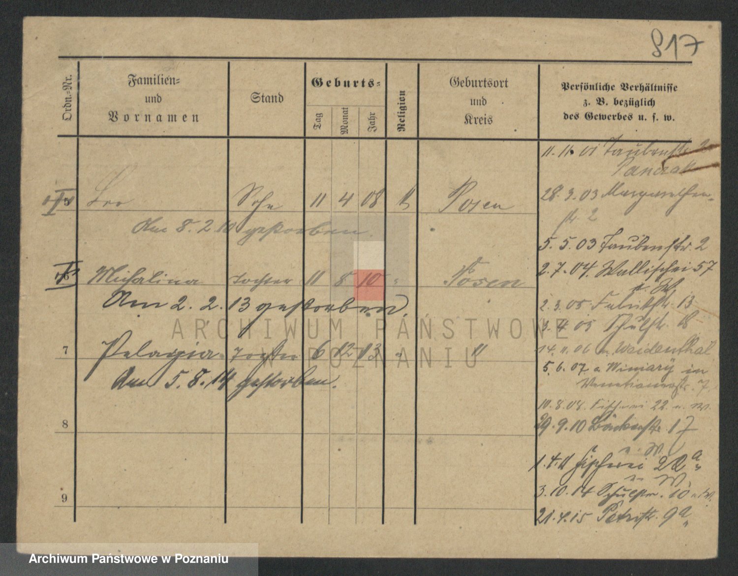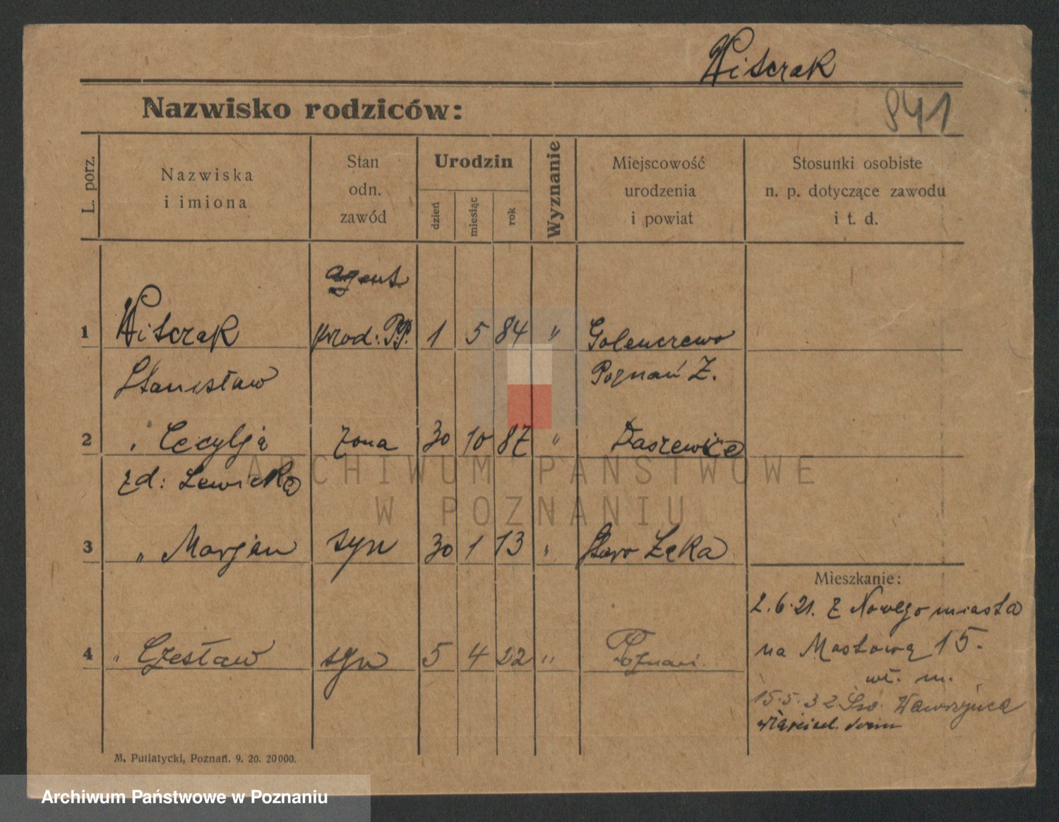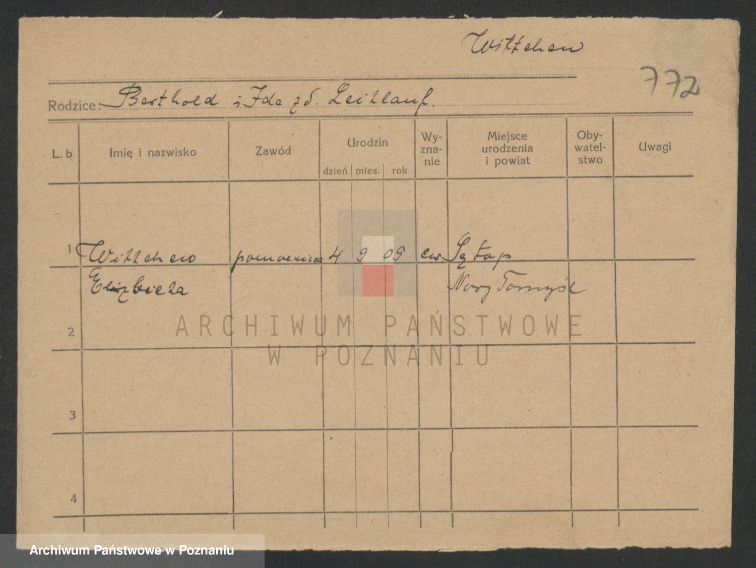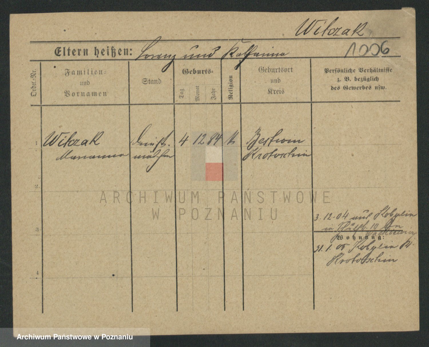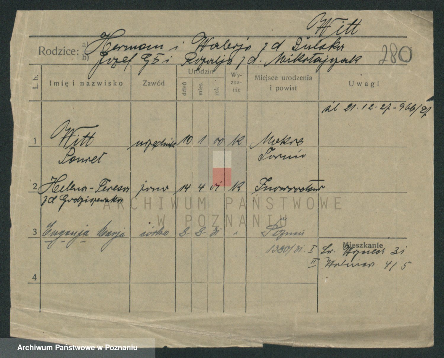 Podgląd karty osobowej dostępny jest po kliknięciu na nazwisko lub ikonkę karty. Można dokonywać powiększenia (ikony na górze) lub przechodzić między kolejnymi skanami (strzałki po bokach).