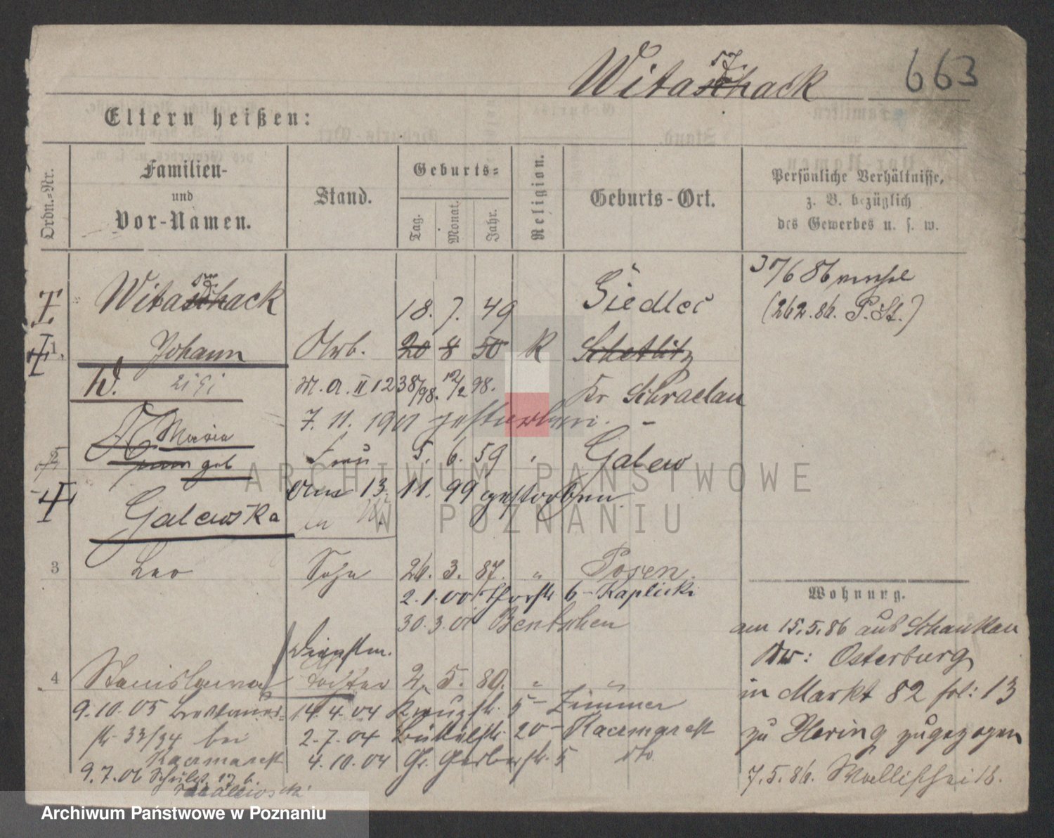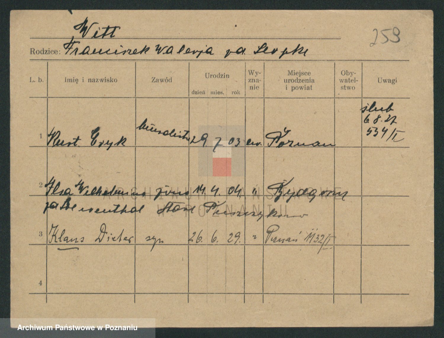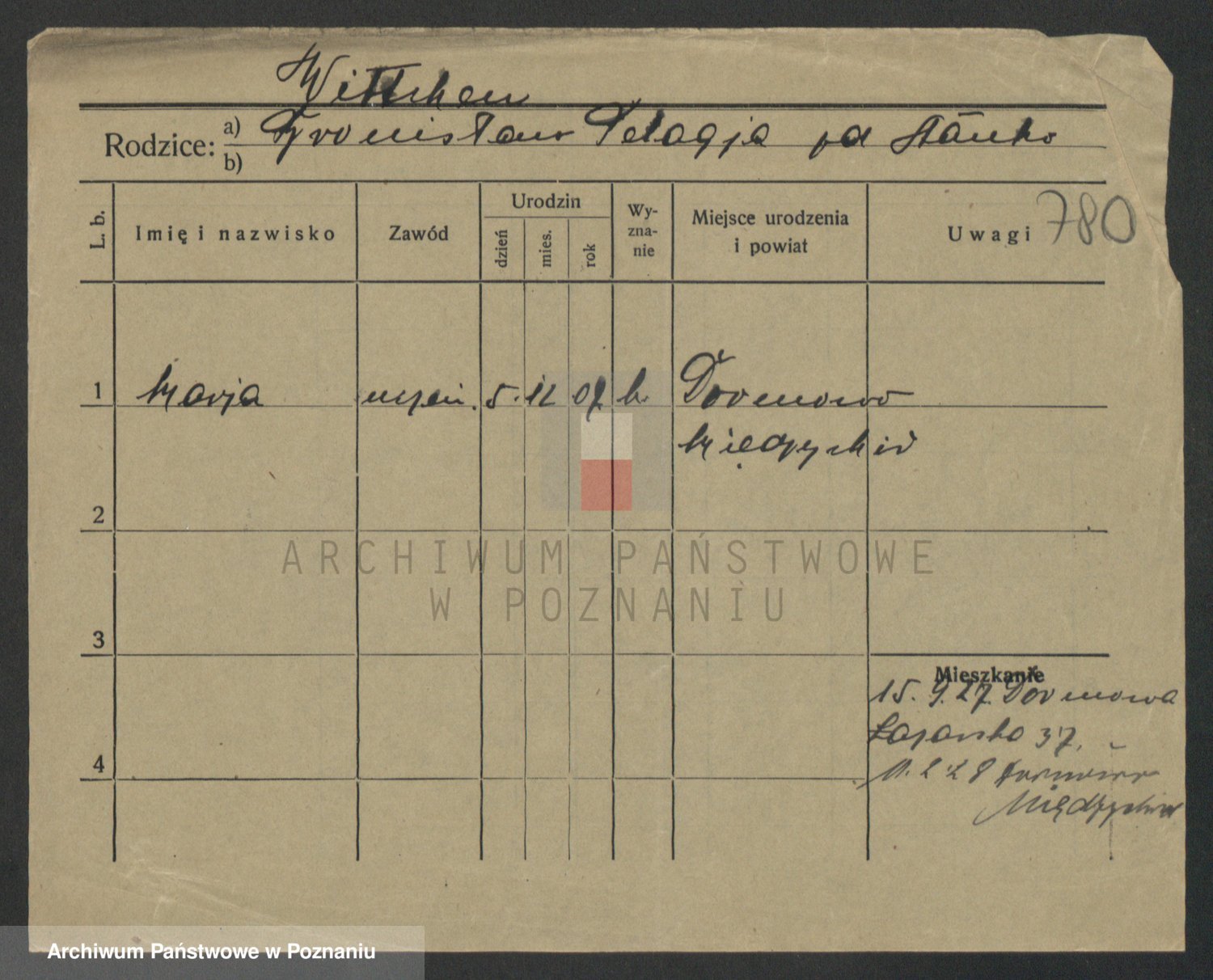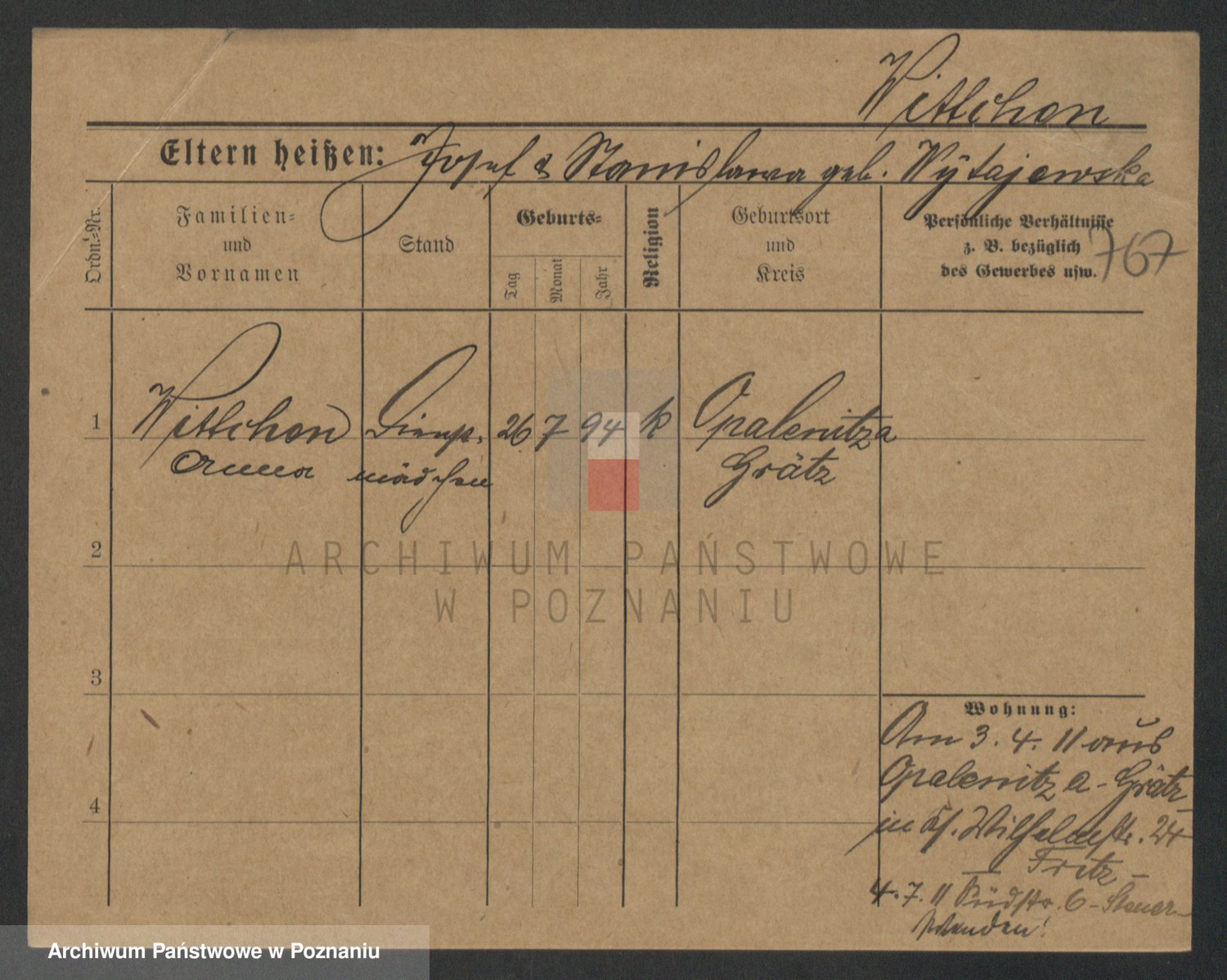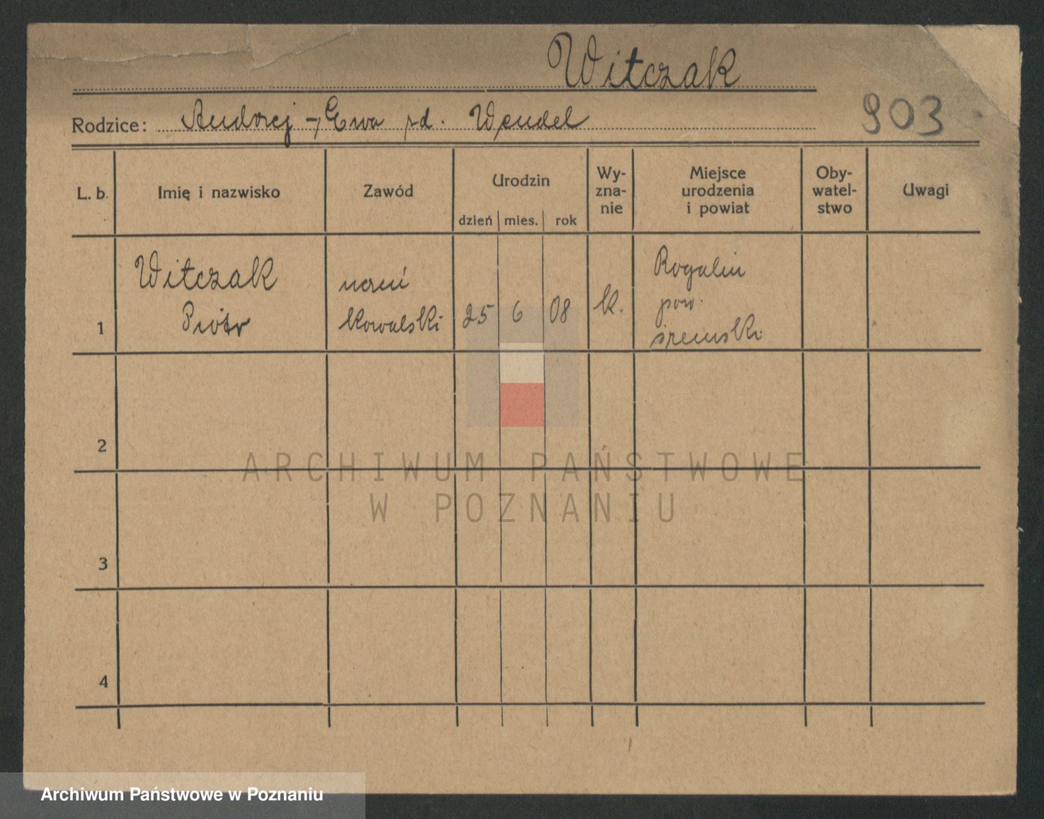 Podgląd karty osobowej dostępny jest po kliknięciu na nazwisko lub ikonkę karty. Można dokonywać powiększenia (ikony na górze) lub przechodzić między kolejnymi skanami (strzałki po bokach).