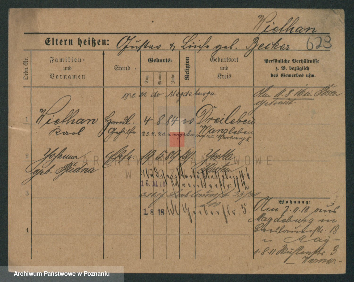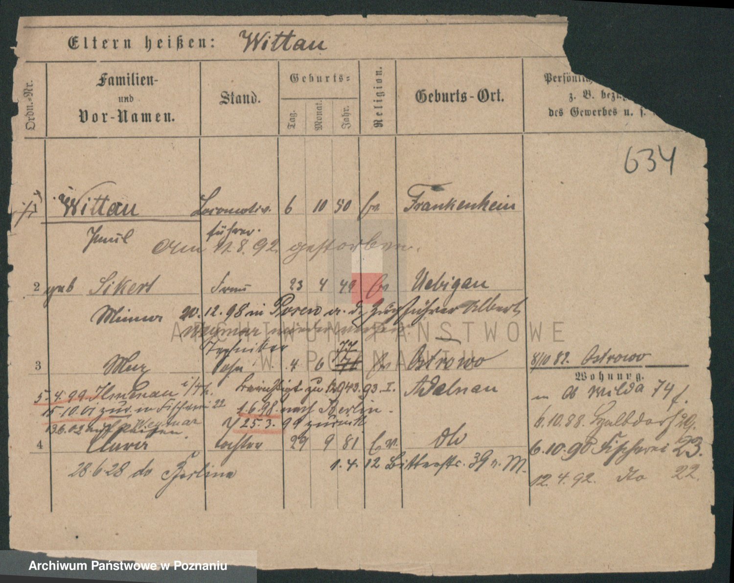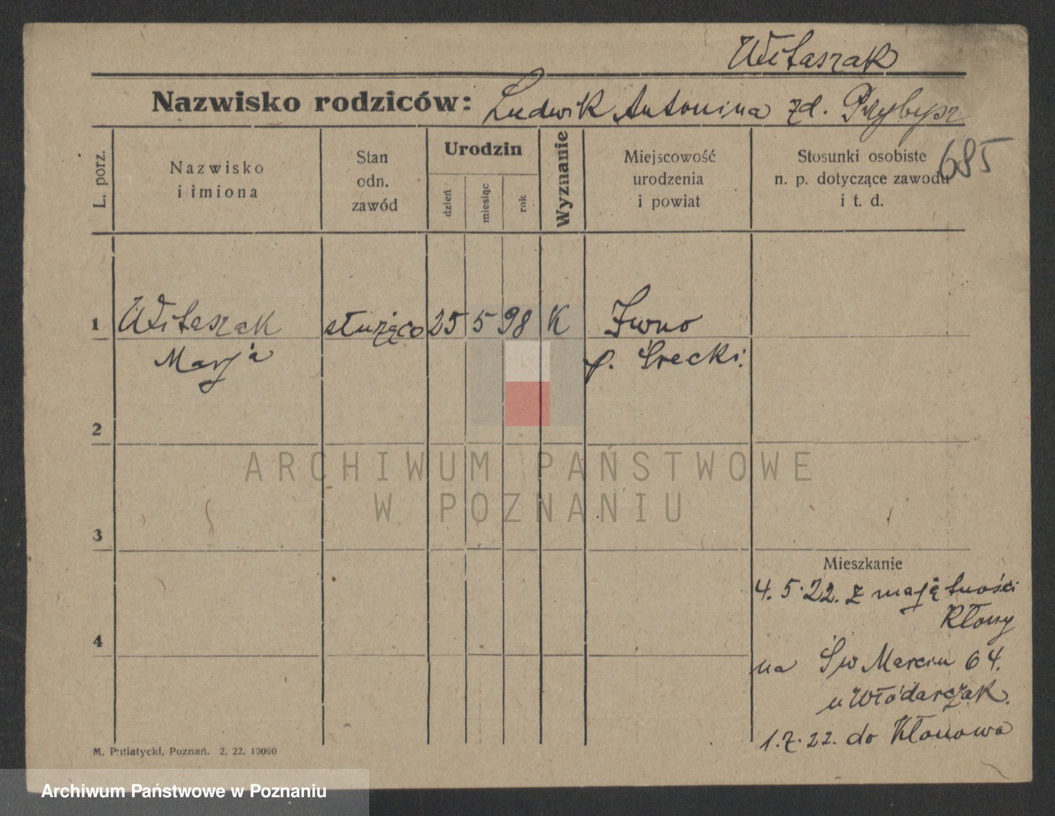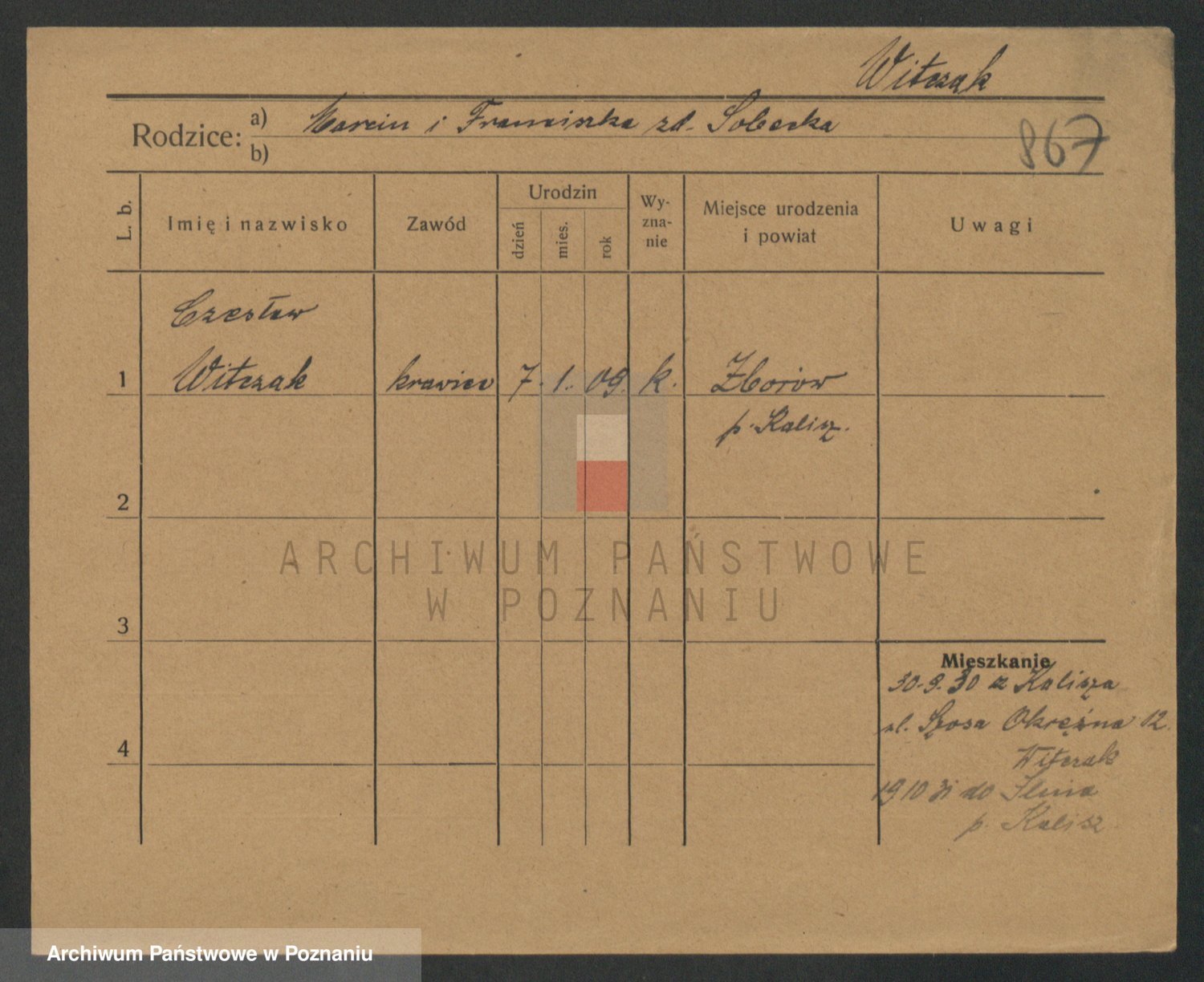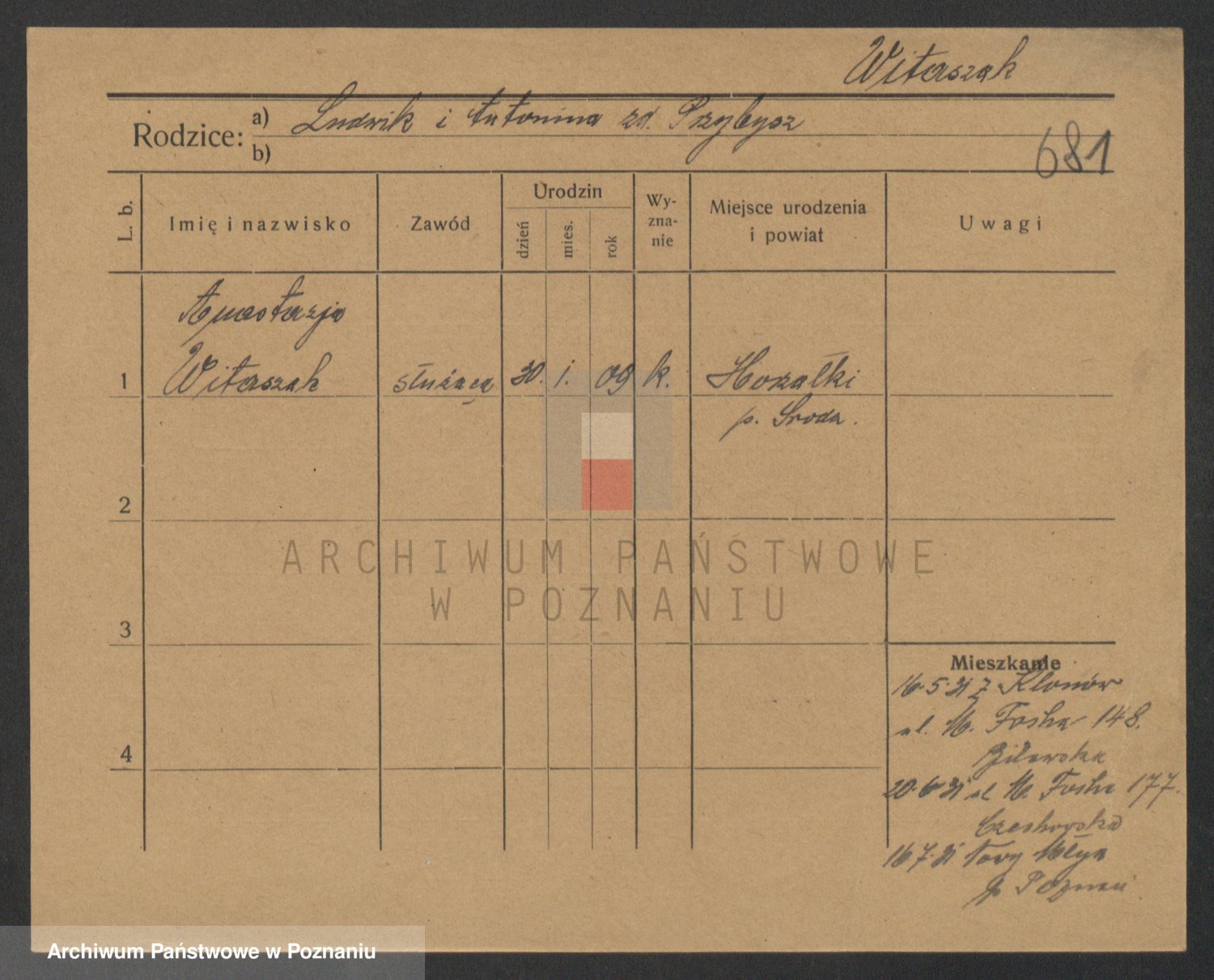 Podgląd karty osobowej dostępny jest po kliknięciu na nazwisko lub ikonkę karty. Można dokonywać powiększenia (ikony na górze) lub przechodzić między kolejnymi skanami (strzałki po bokach).