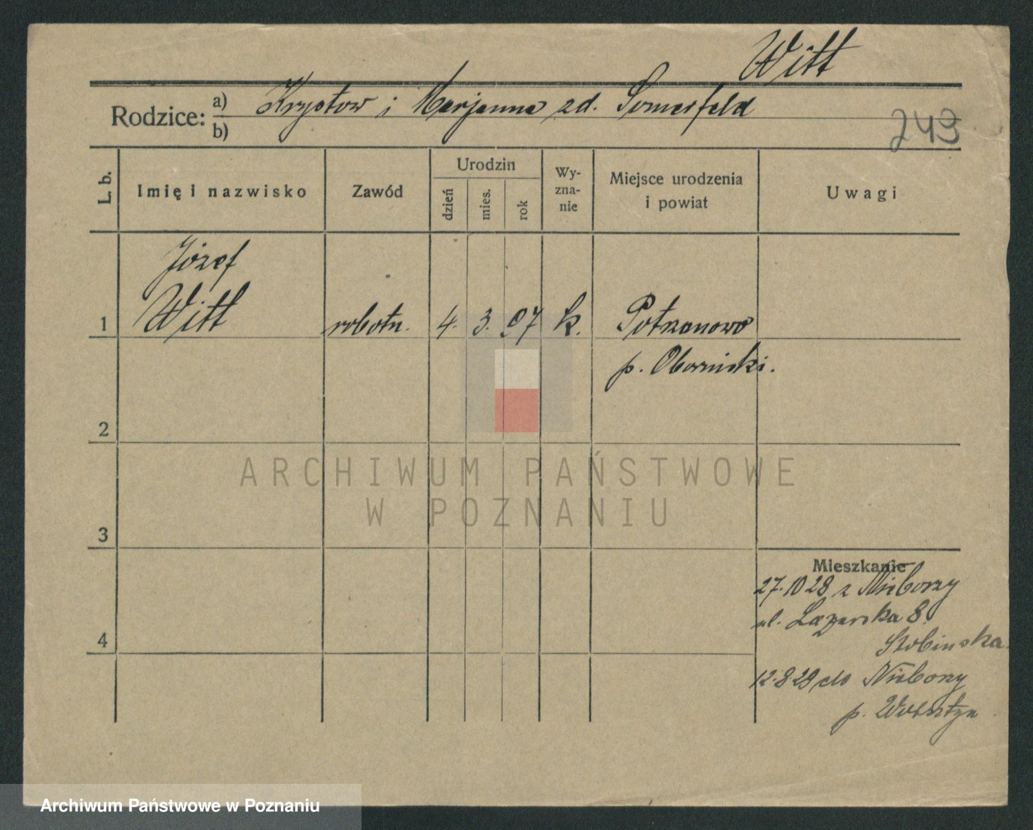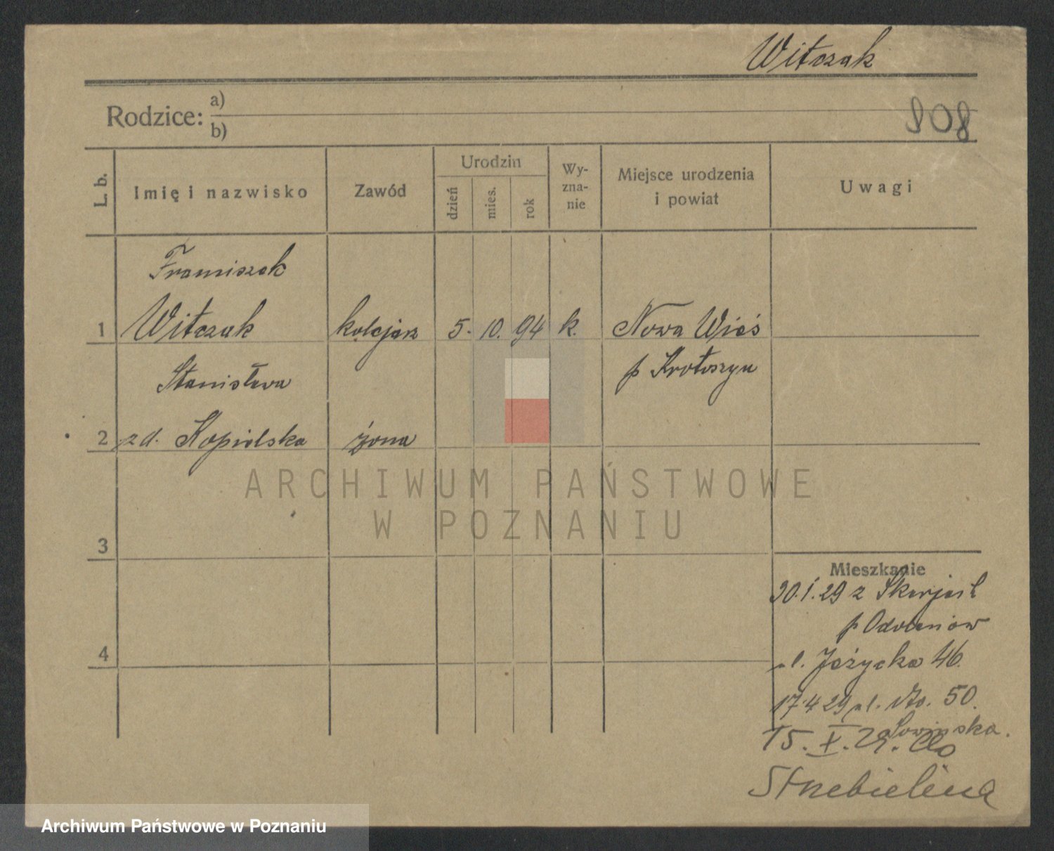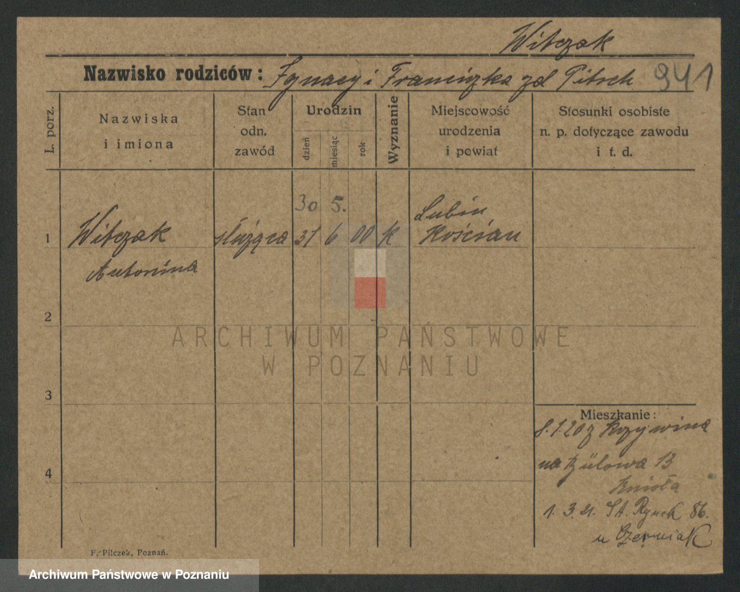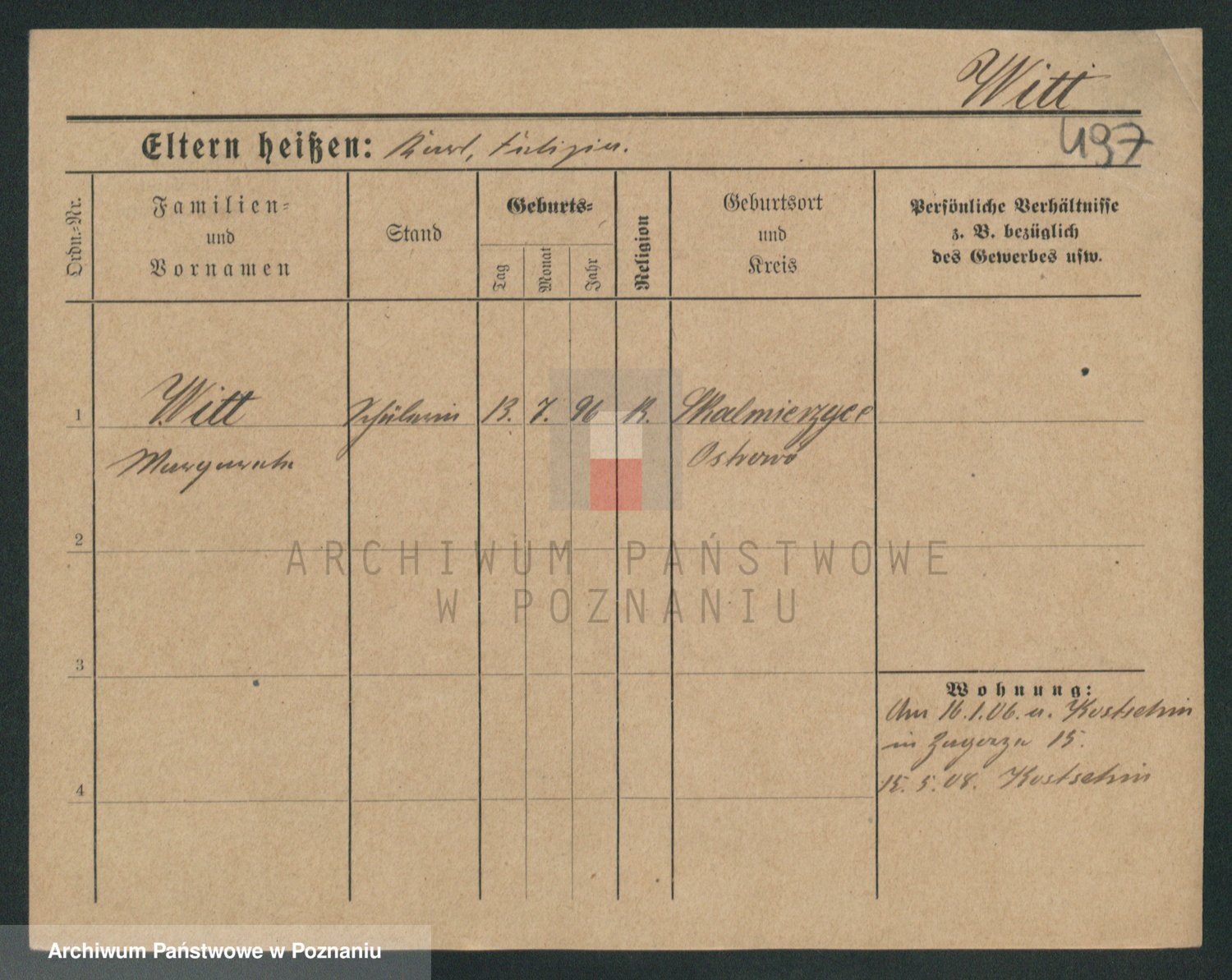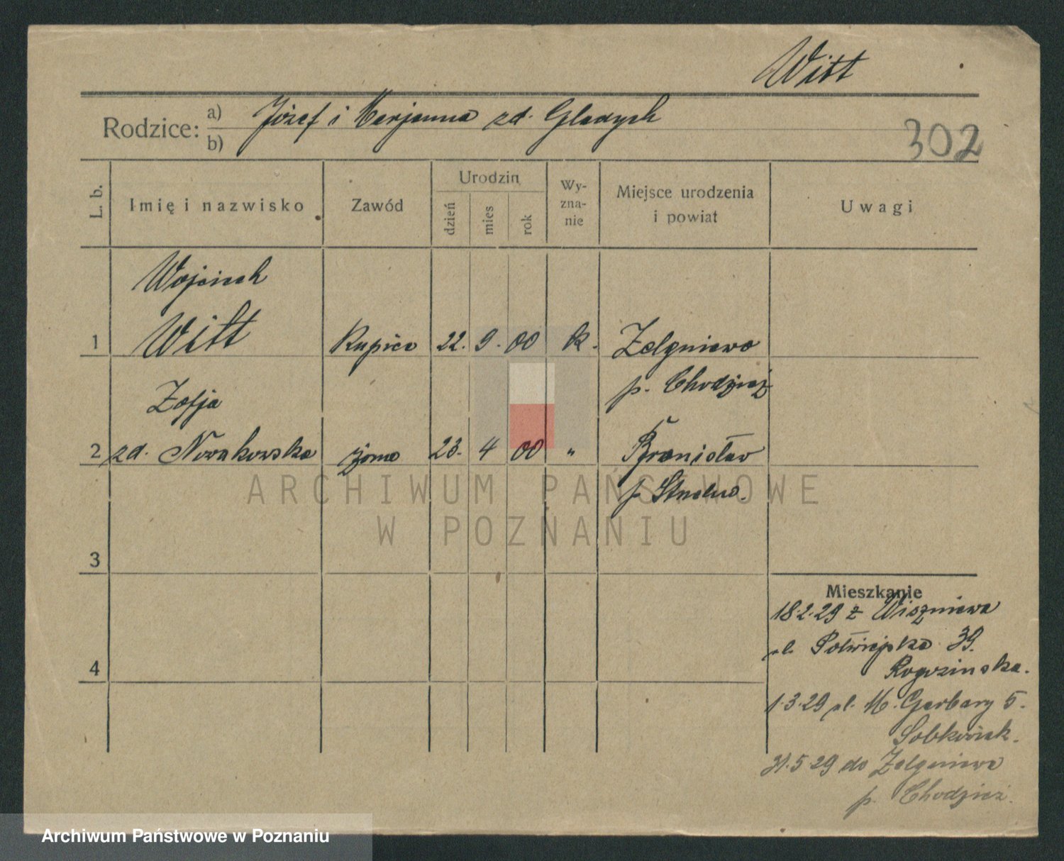 Podgląd karty osobowej dostępny jest po kliknięciu na nazwisko lub ikonkę karty. Można dokonywać powiększenia (ikony na górze) lub przechodzić między kolejnymi skanami (strzałki po bokach).