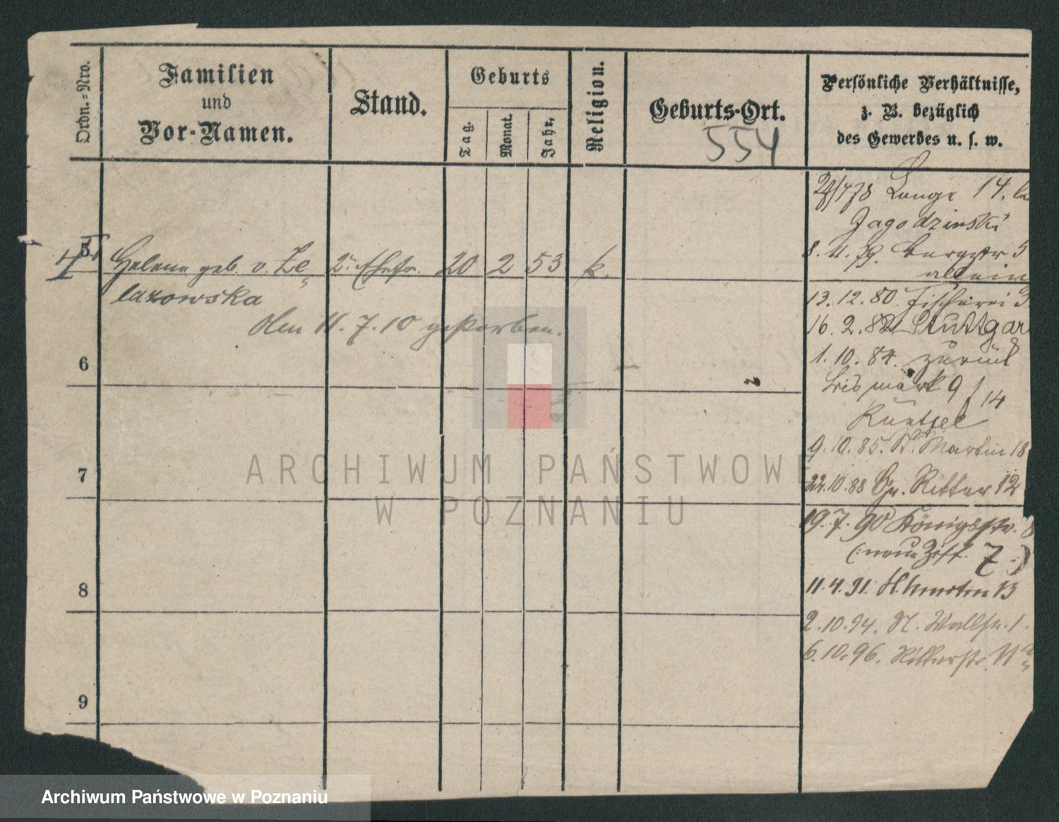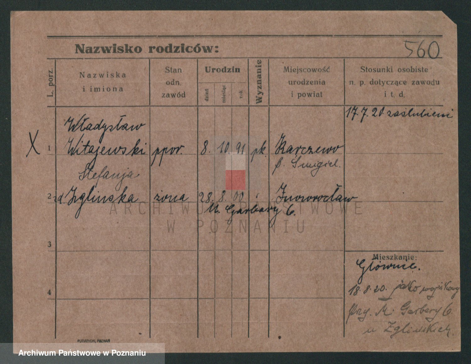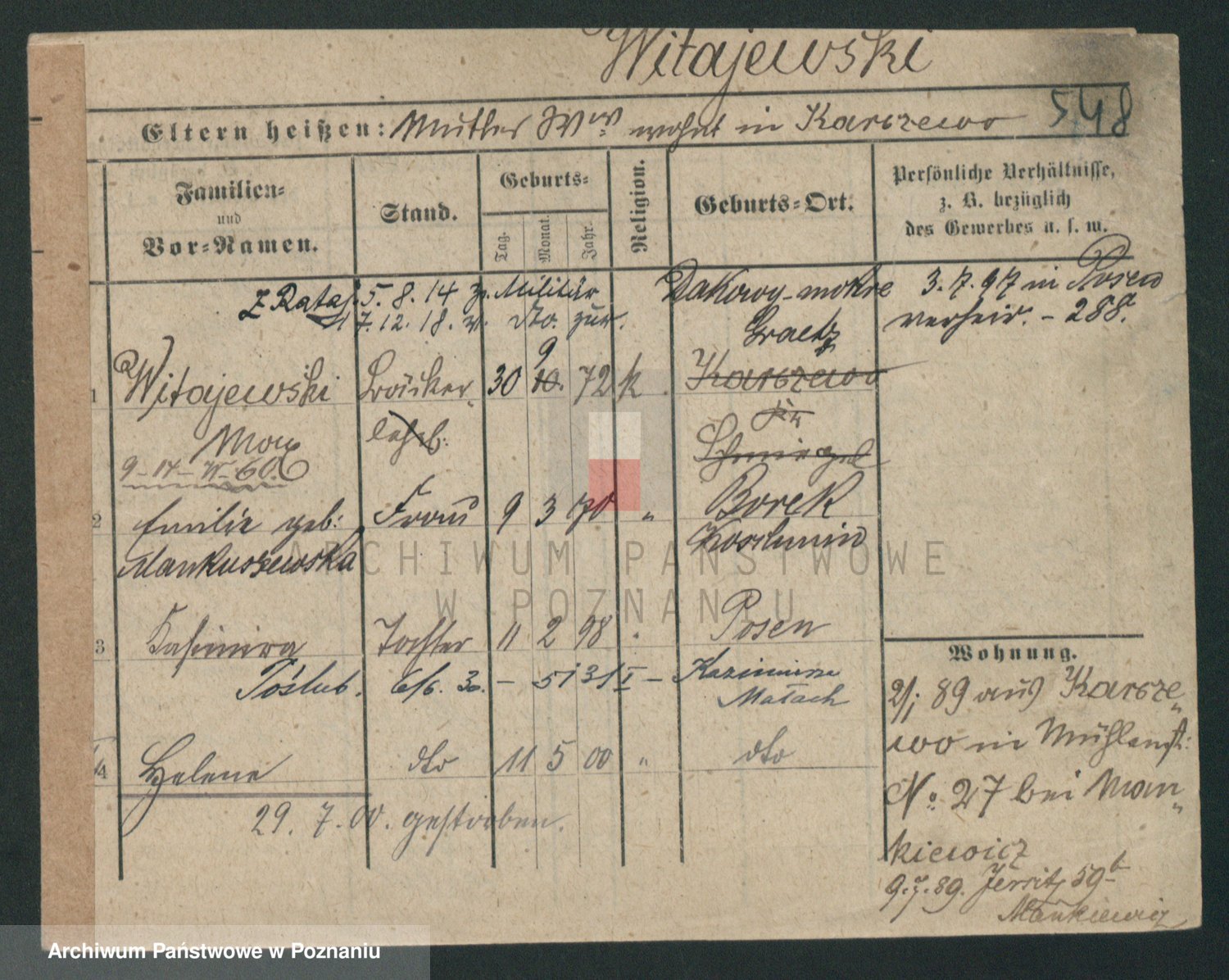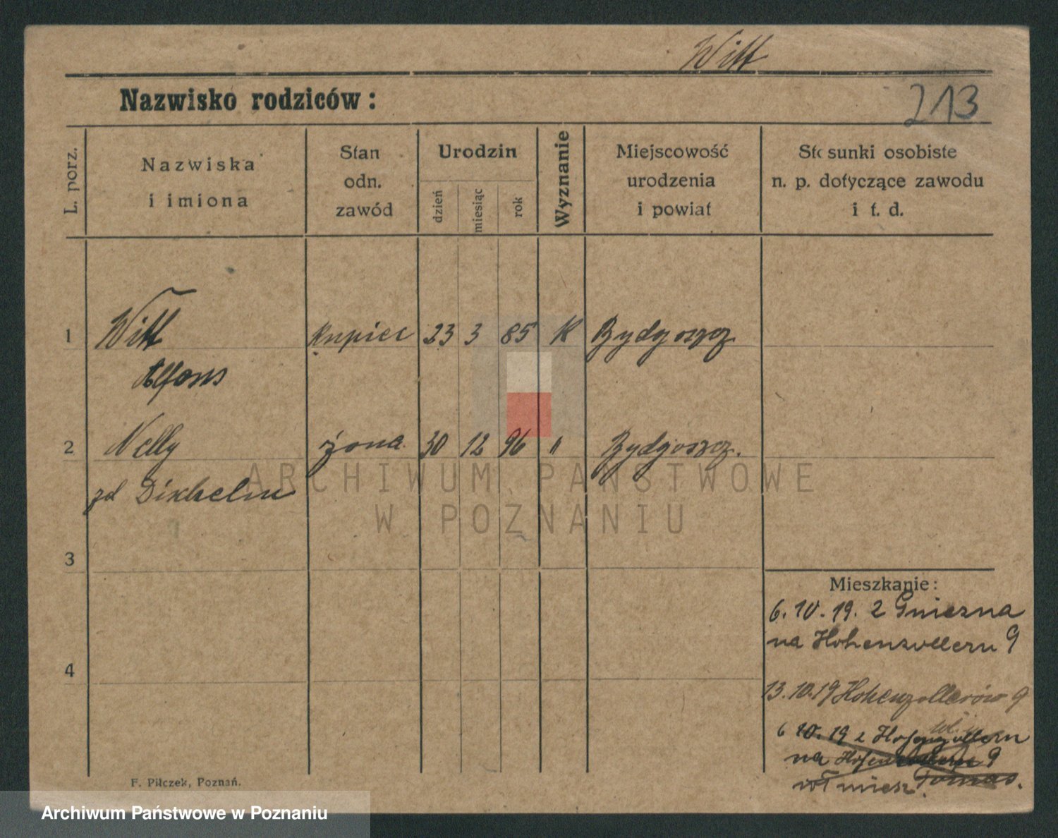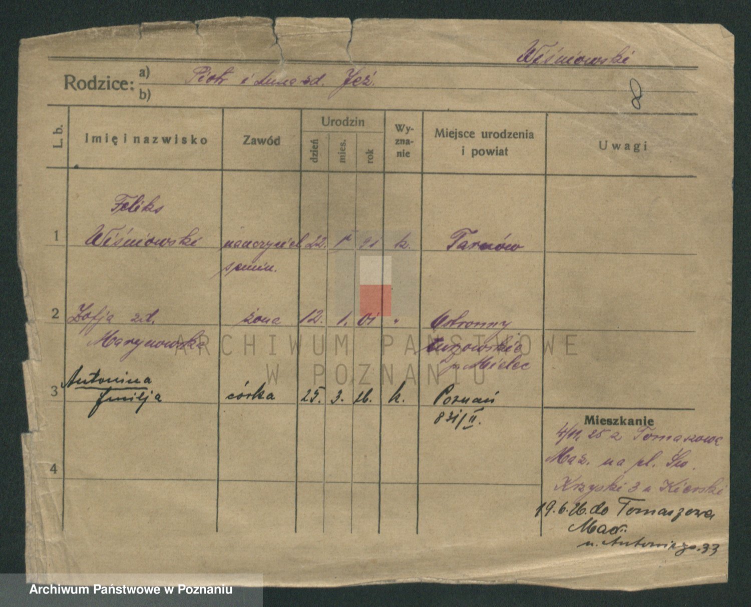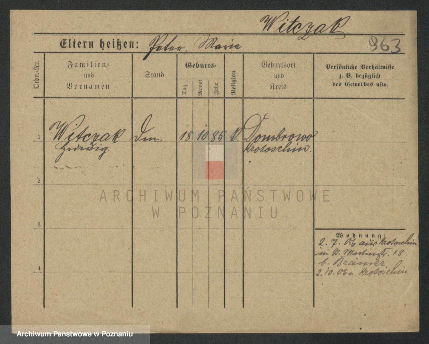 Podgląd karty osobowej dostępny jest po kliknięciu na nazwisko lub ikonkę karty. Można dokonywać powiększenia (ikony na górze) lub przechodzić między kolejnymi skanami (strzałki po bokach).