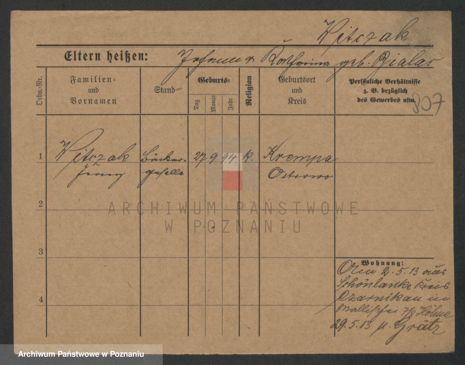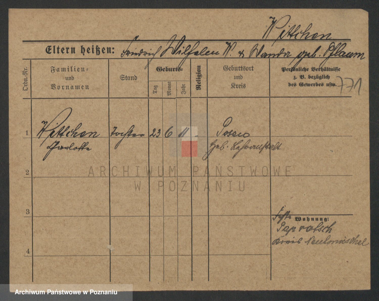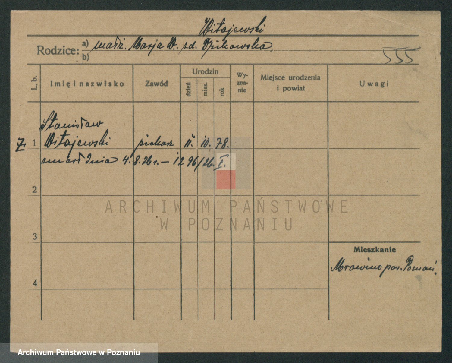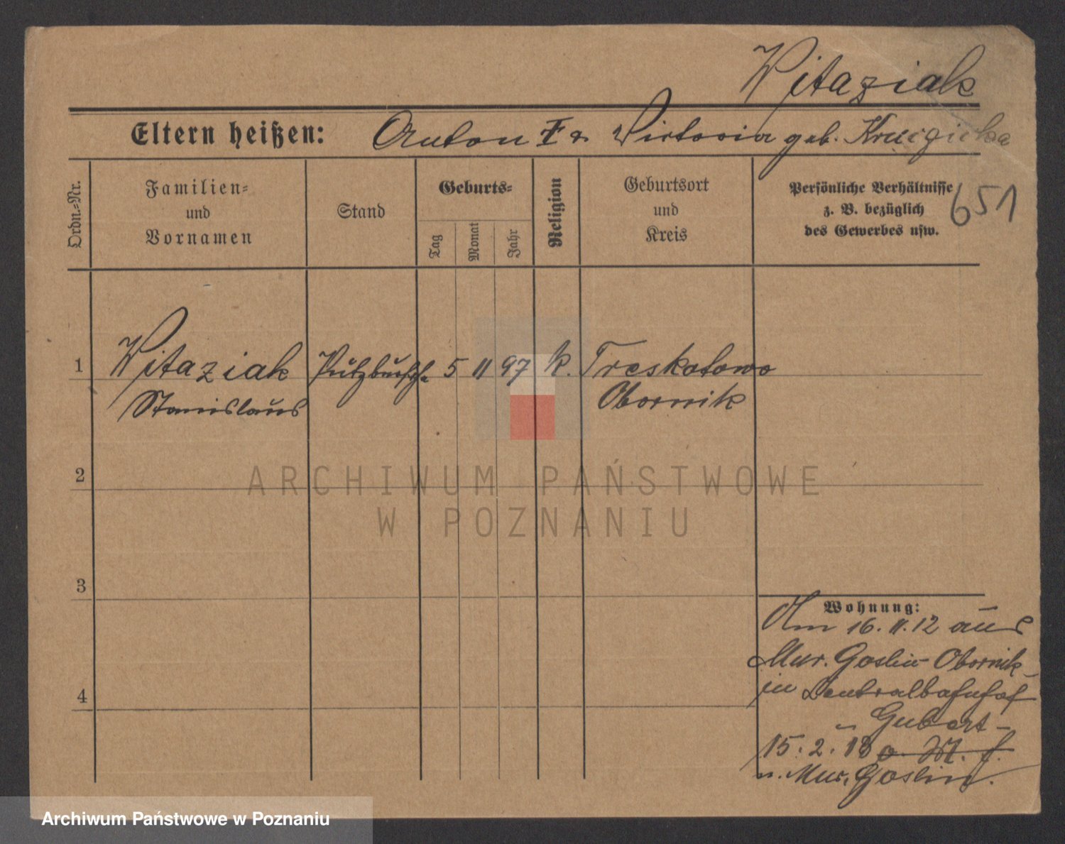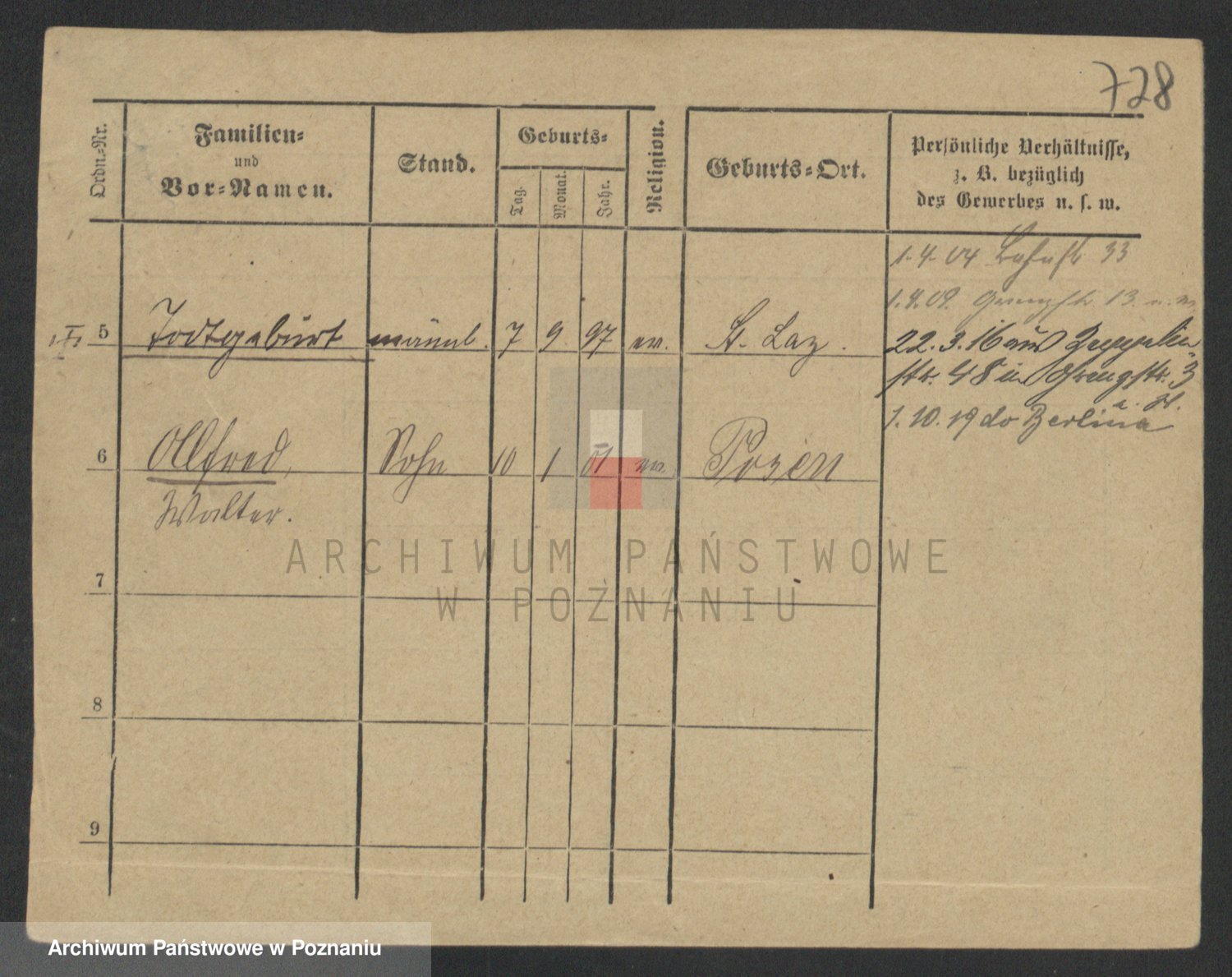 Podgląd karty osobowej dostępny jest po kliknięciu na nazwisko lub ikonkę karty. Można dokonywać powiększenia (ikony na górze) lub przechodzić między kolejnymi skanami (strzałki po bokach).