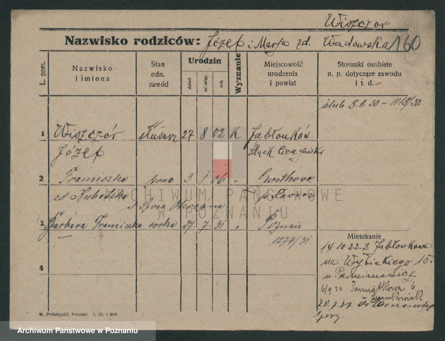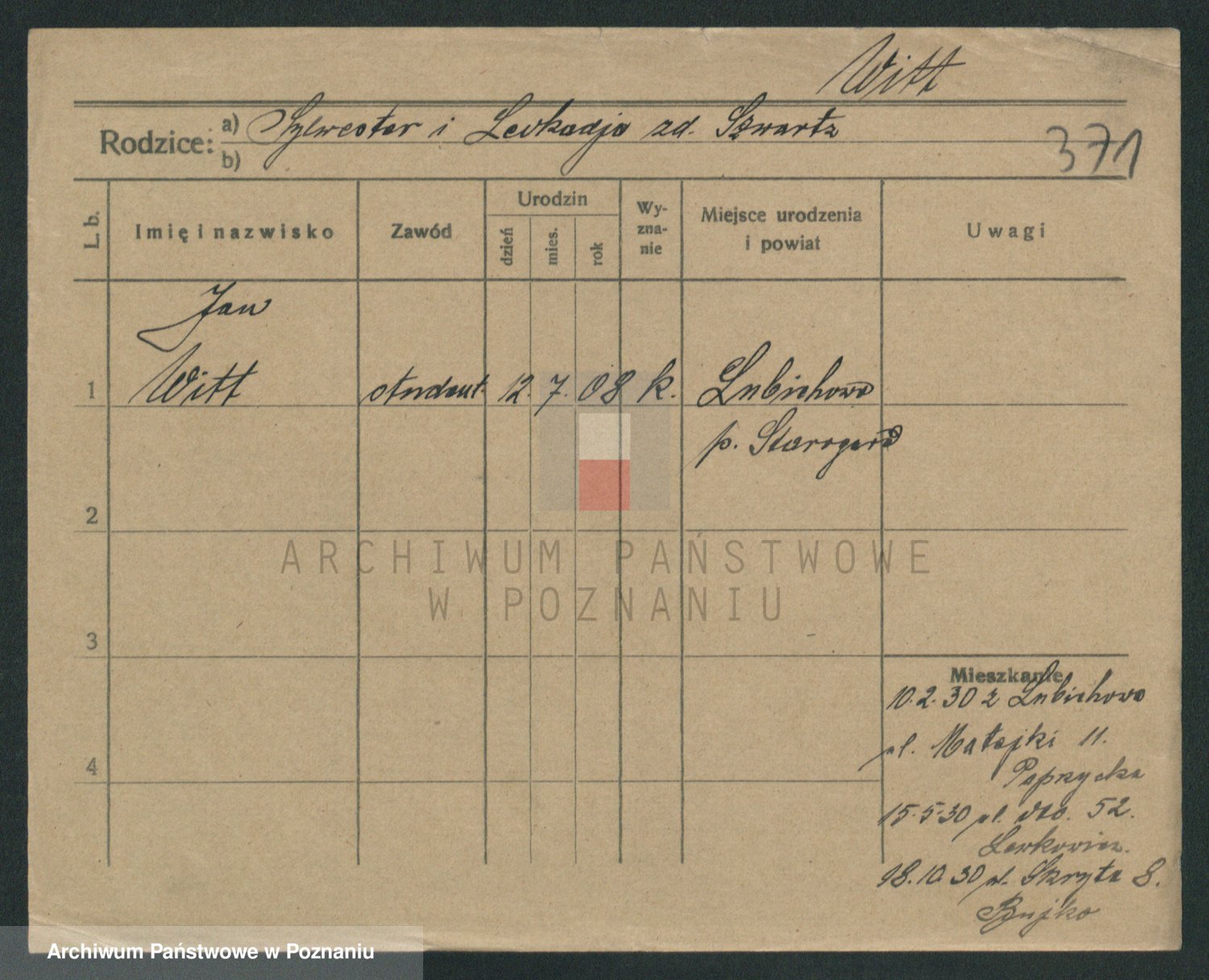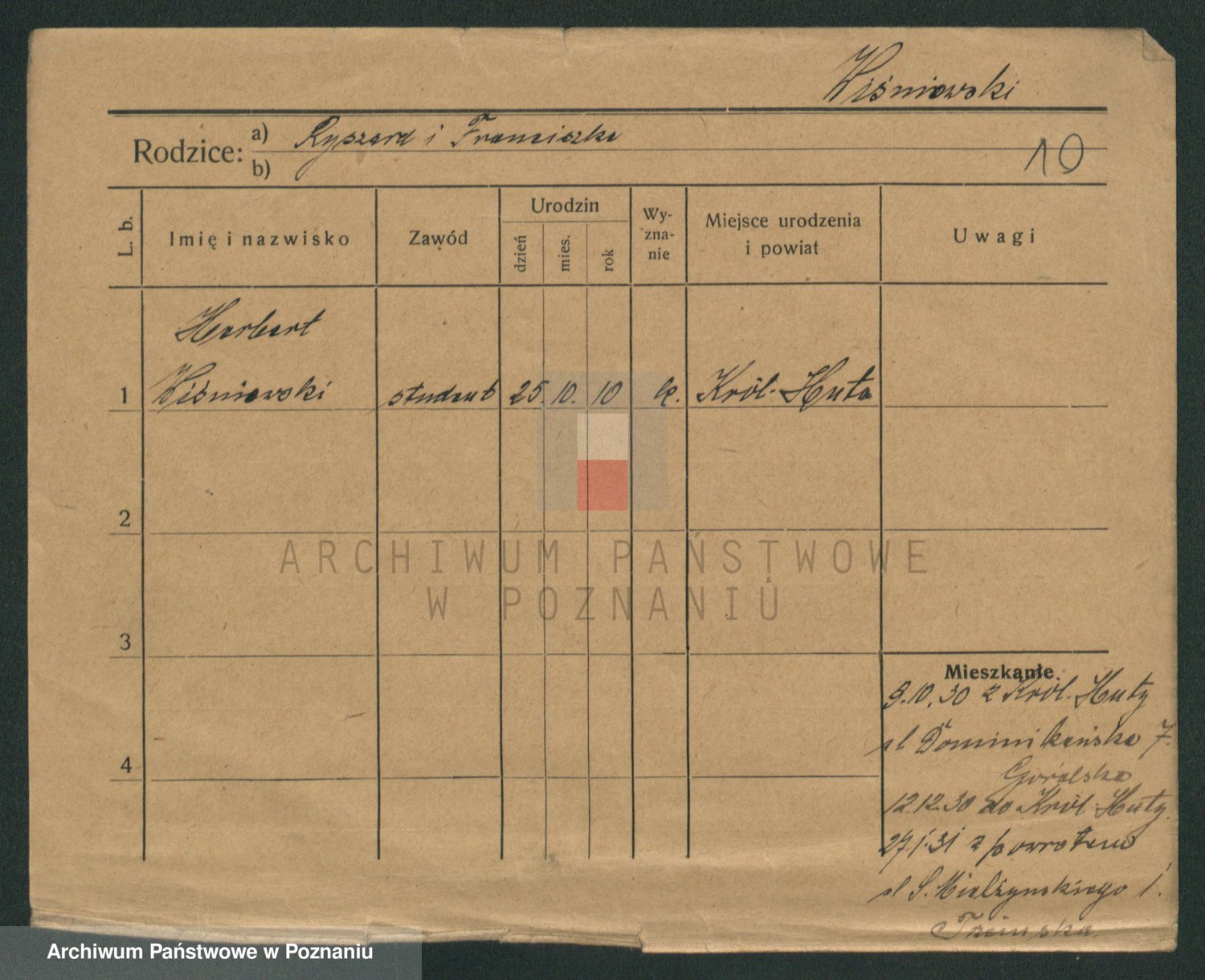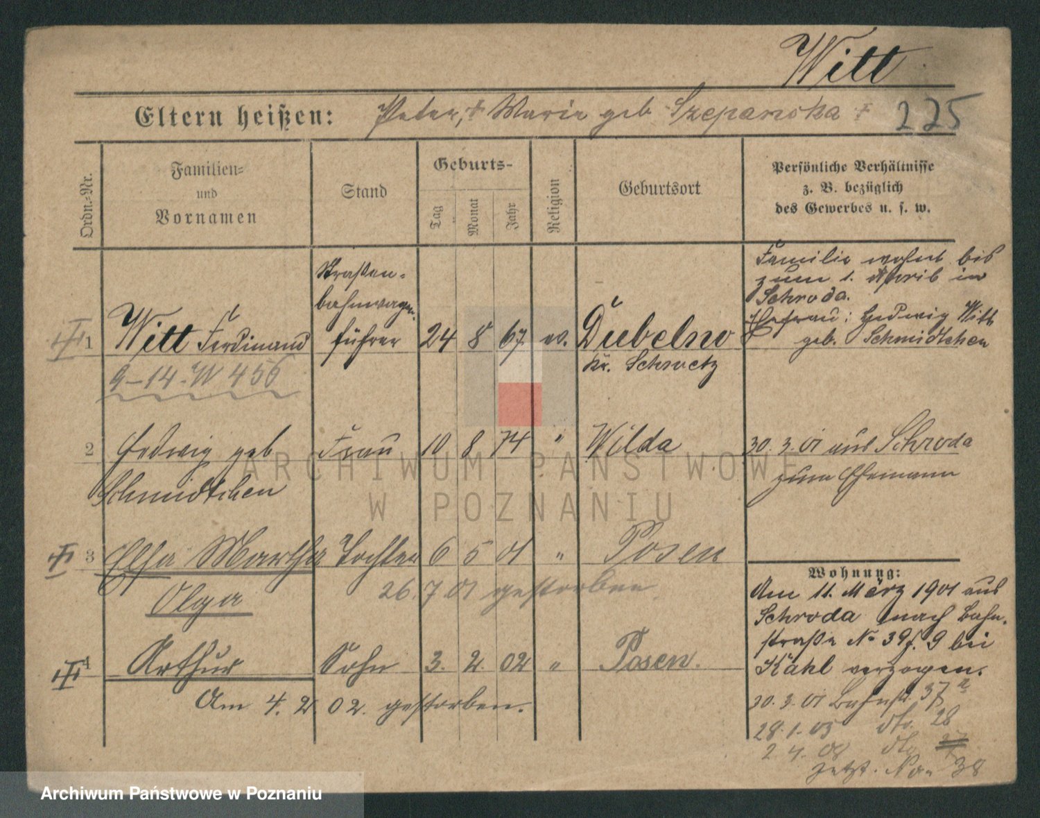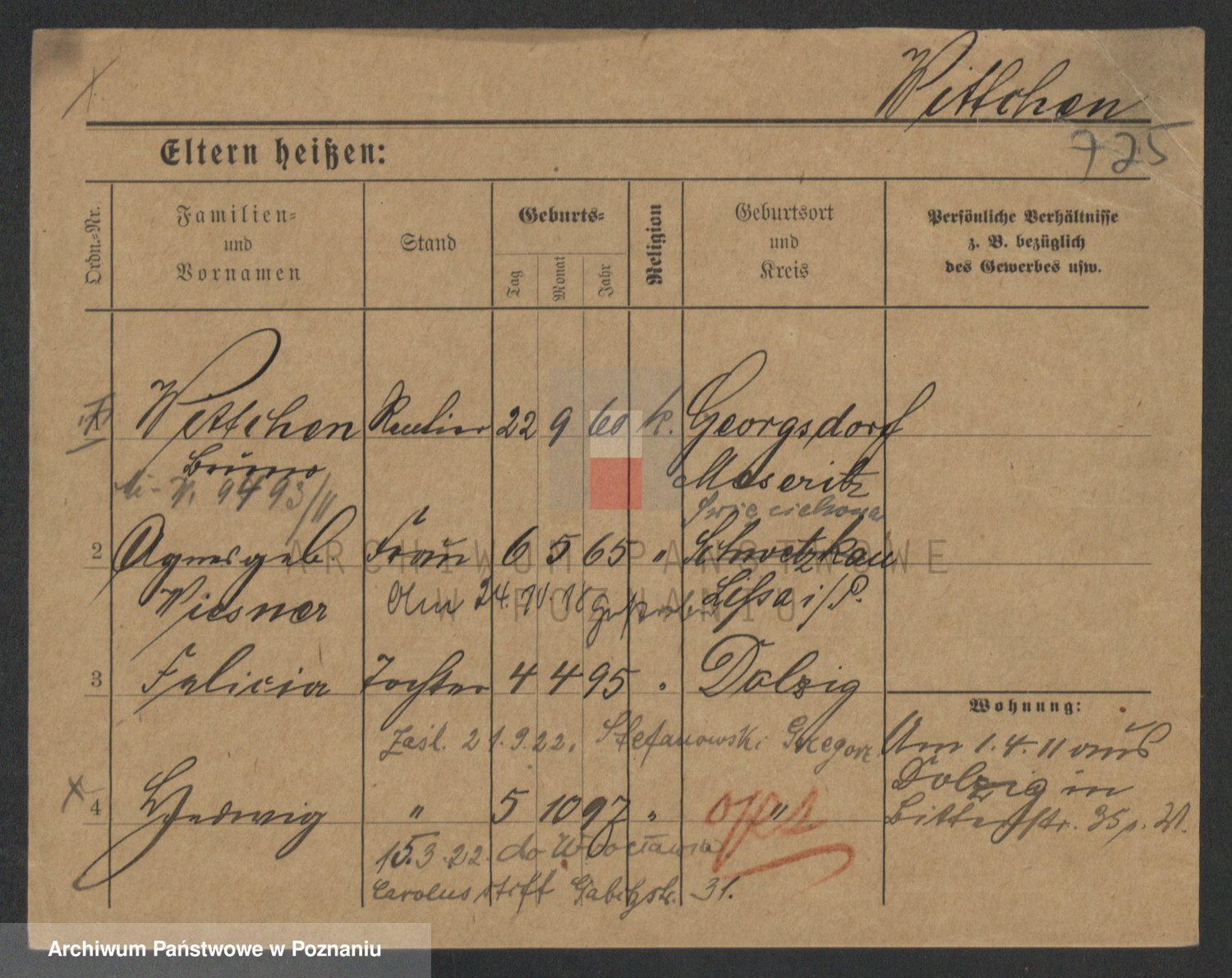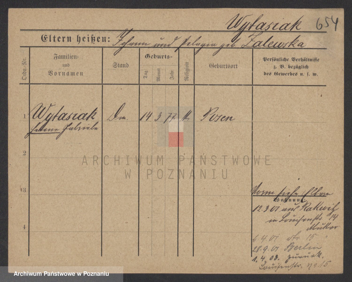 Podgląd karty osobowej dostępny jest po kliknięciu na nazwisko lub ikonkę karty. Można dokonywać powiększenia (ikony na górze) lub przechodzić między kolejnymi skanami (strzałki po bokach).