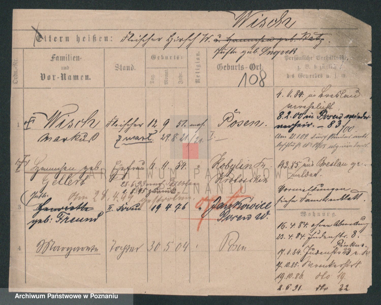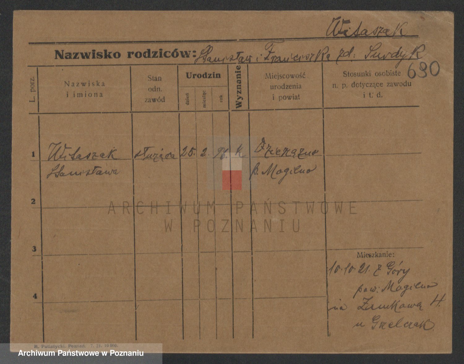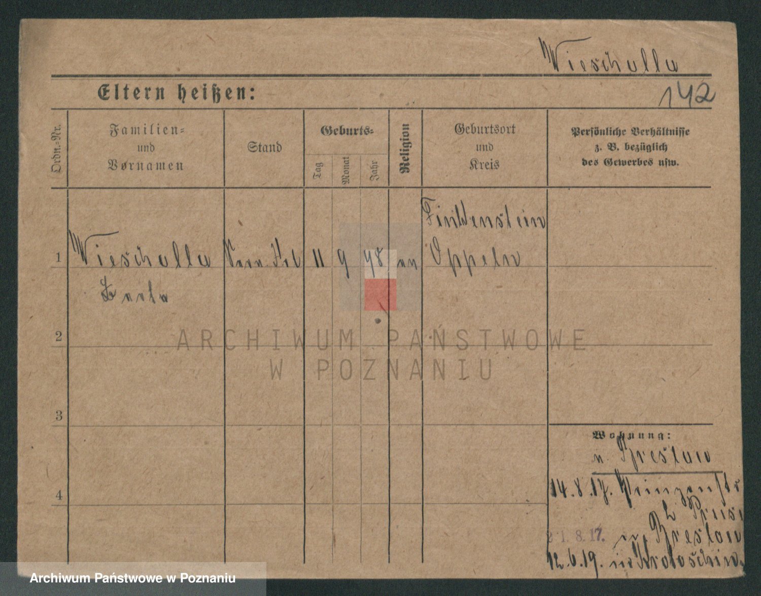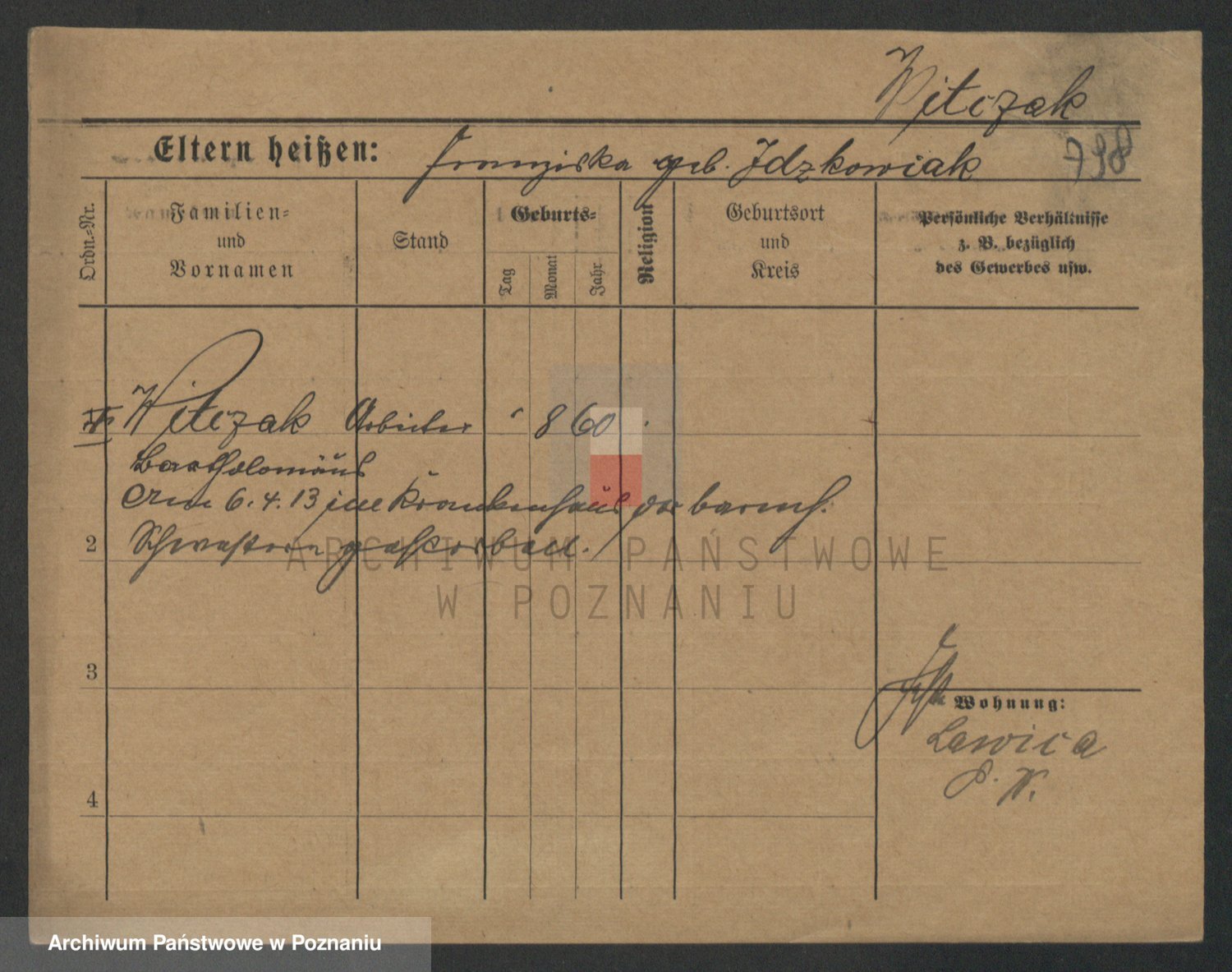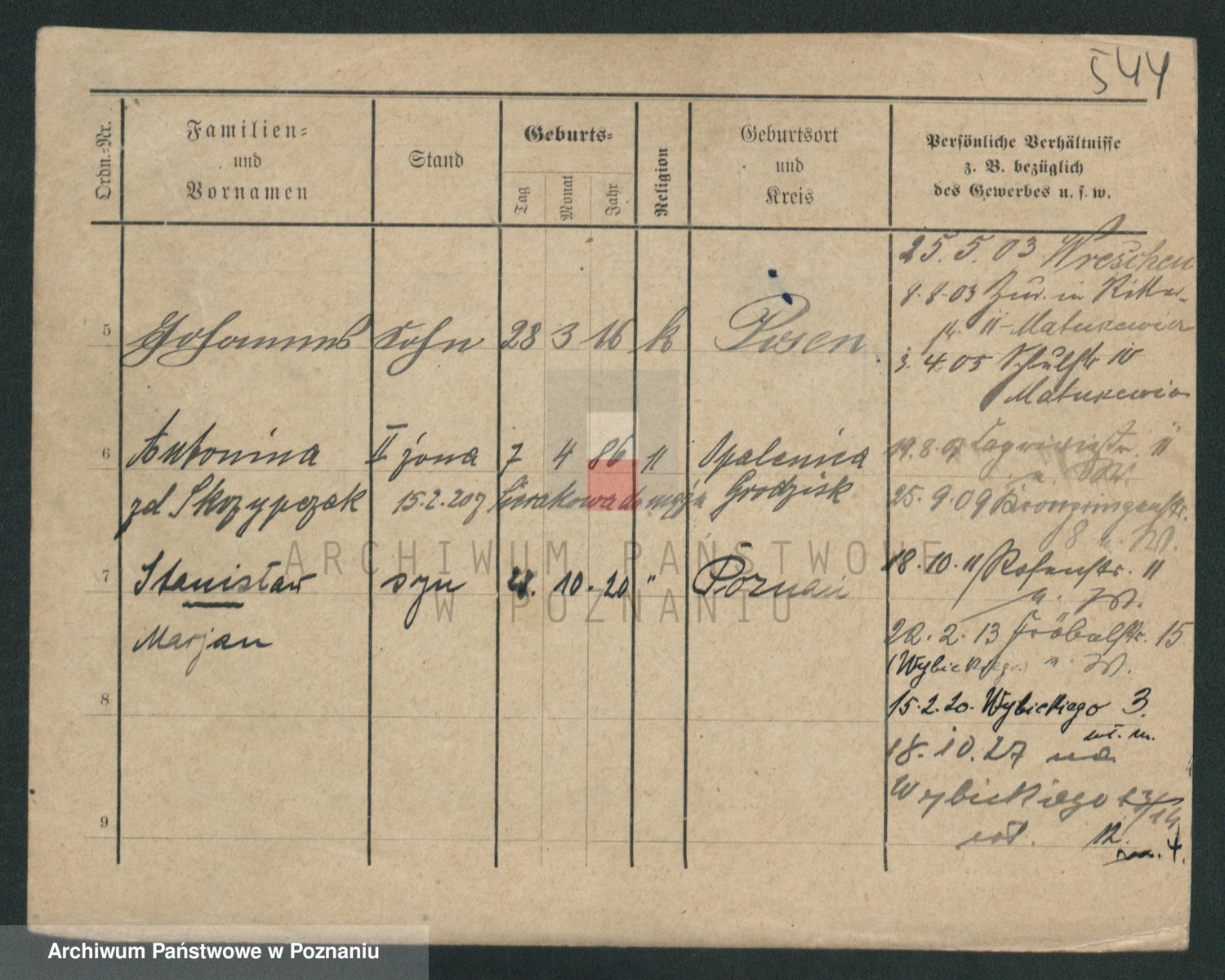 Podgląd karty osobowej dostępny jest po kliknięciu na nazwisko lub ikonkę karty. Można dokonywać powiększenia (ikony na górze) lub przechodzić między kolejnymi skanami (strzałki po bokach).