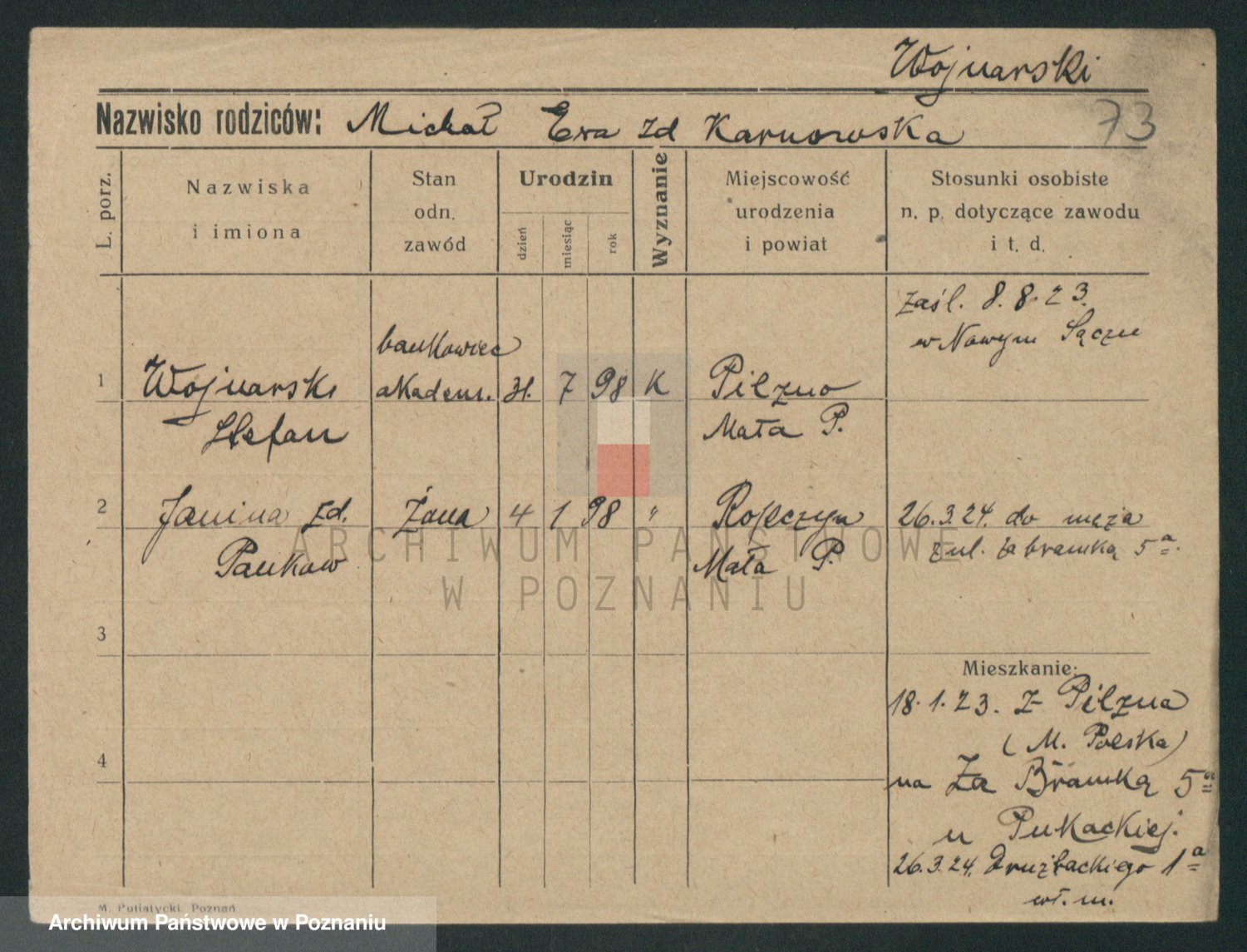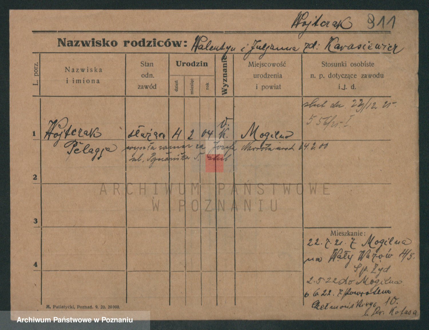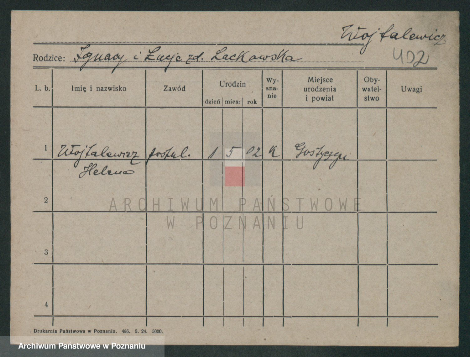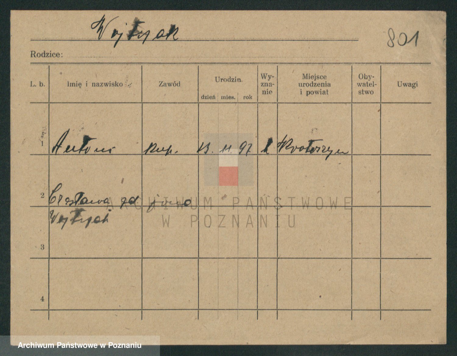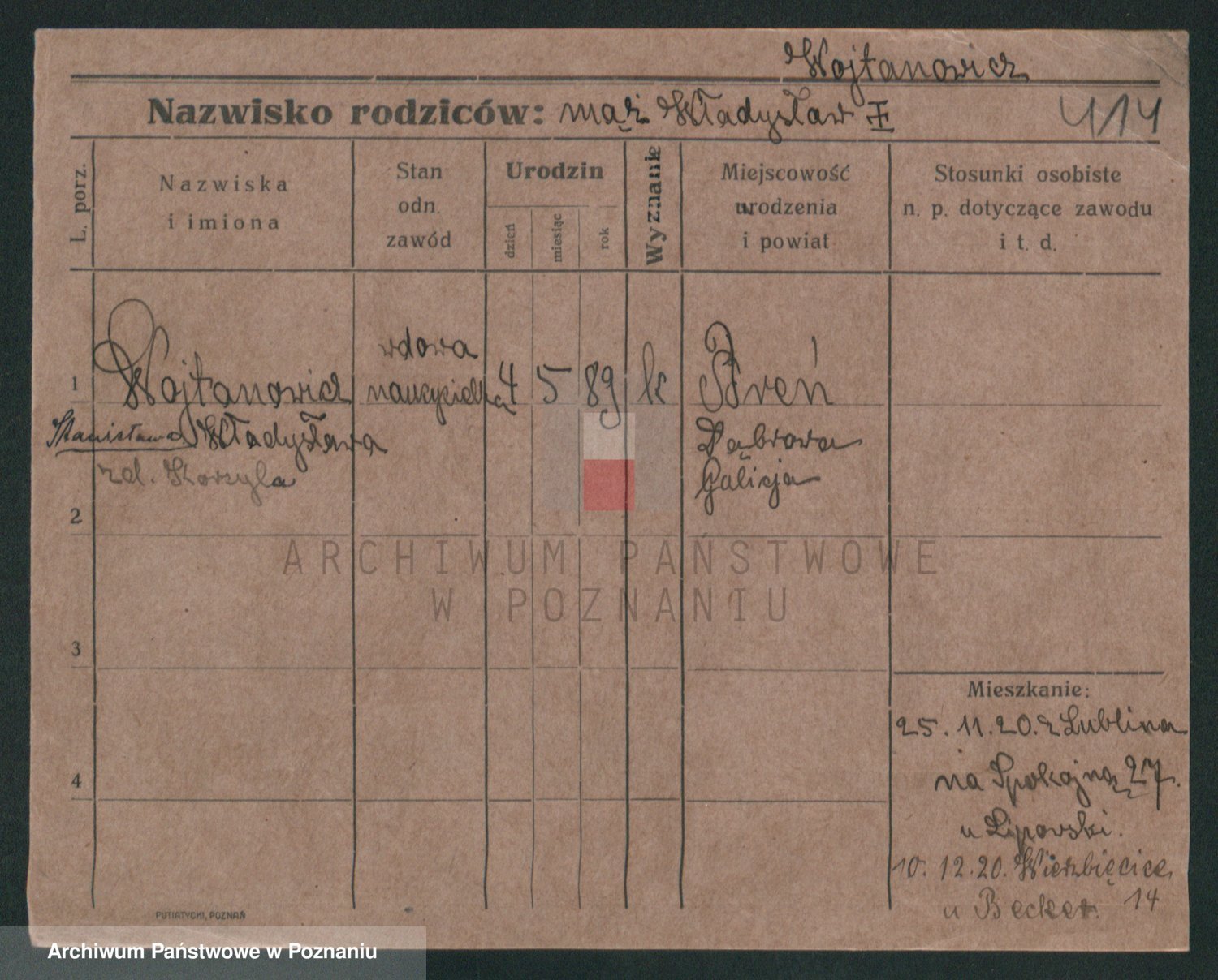 Podgląd karty osobowej dostępny jest po kliknięciu na nazwisko lub ikonkę karty. Można dokonywać powiększenia (ikony na górze) lub przechodzić między kolejnymi skanami (strzałki po bokach).