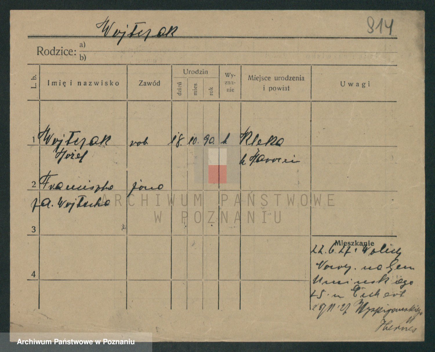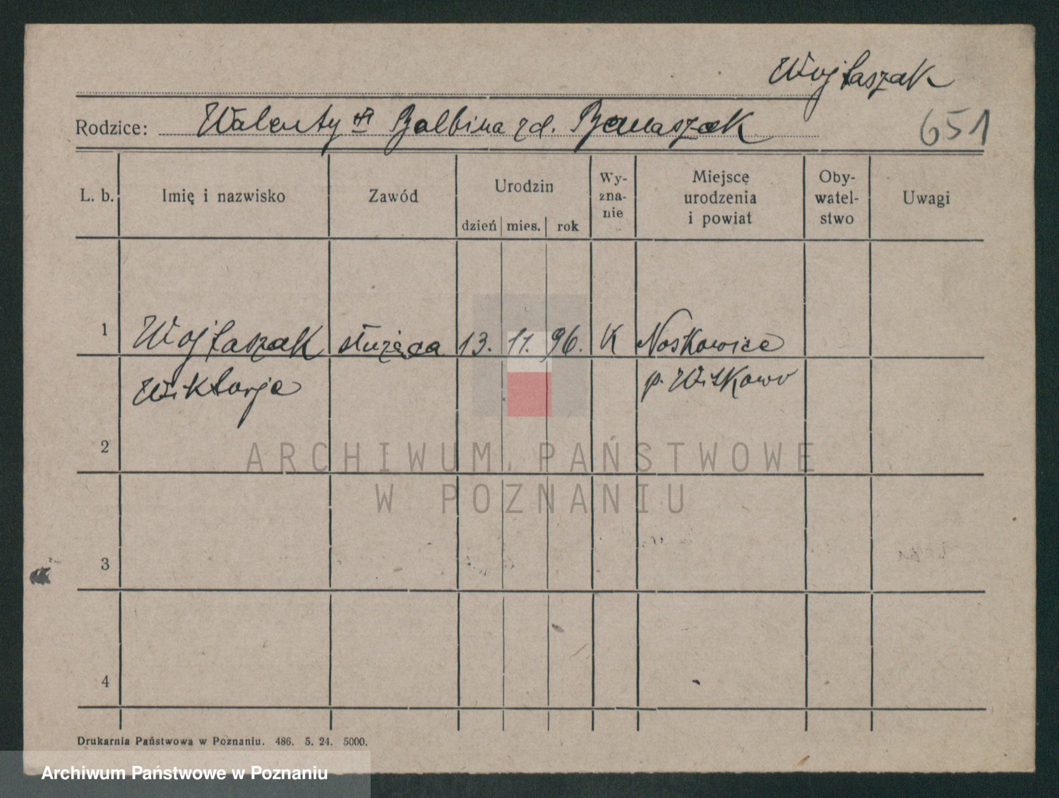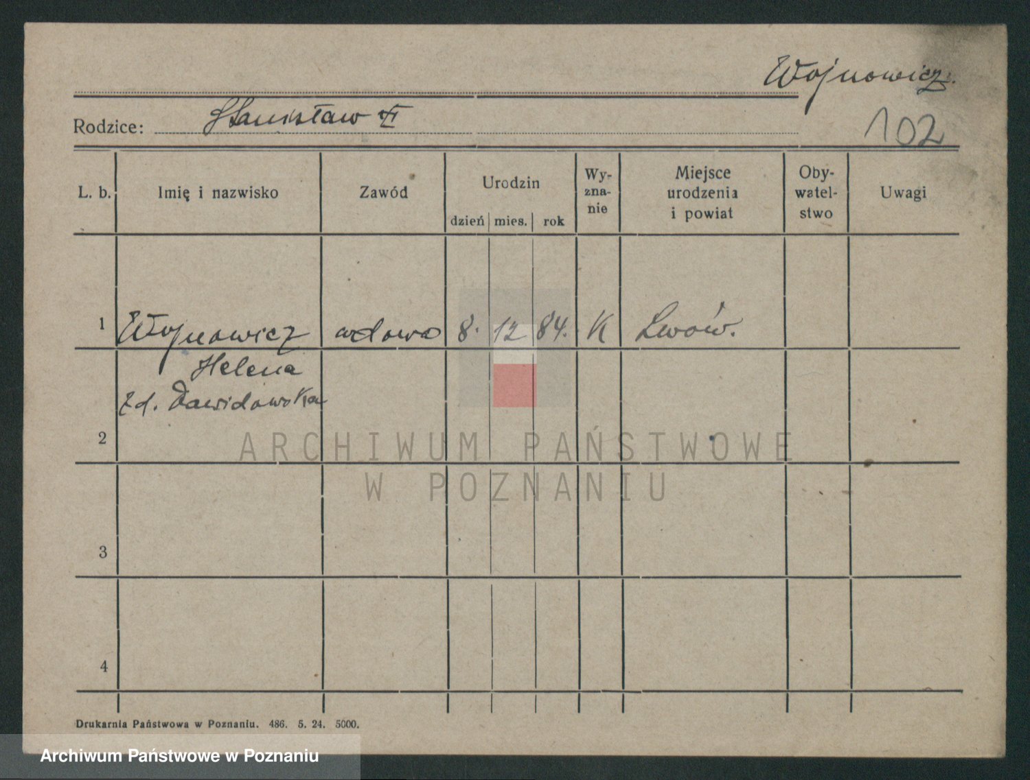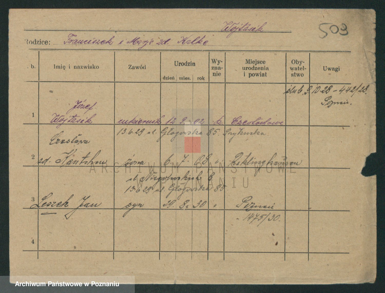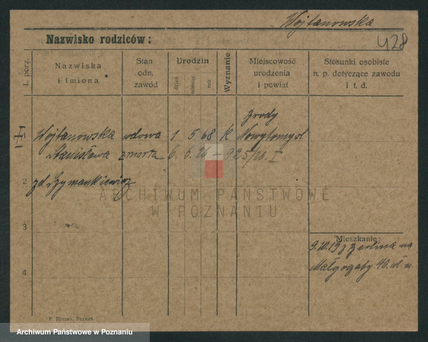 Podgląd karty osobowej dostępny jest po kliknięciu na nazwisko lub ikonkę karty. Można dokonywać powiększenia (ikony na górze) lub przechodzić między kolejnymi skanami (strzałki po bokach).