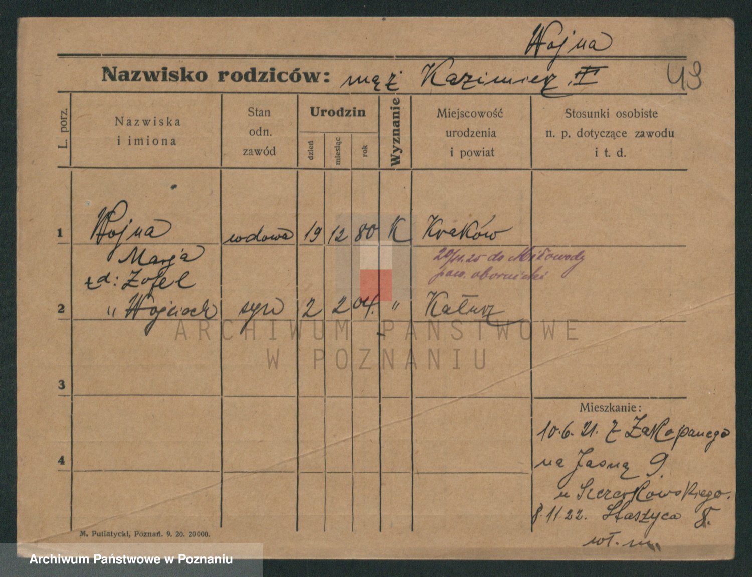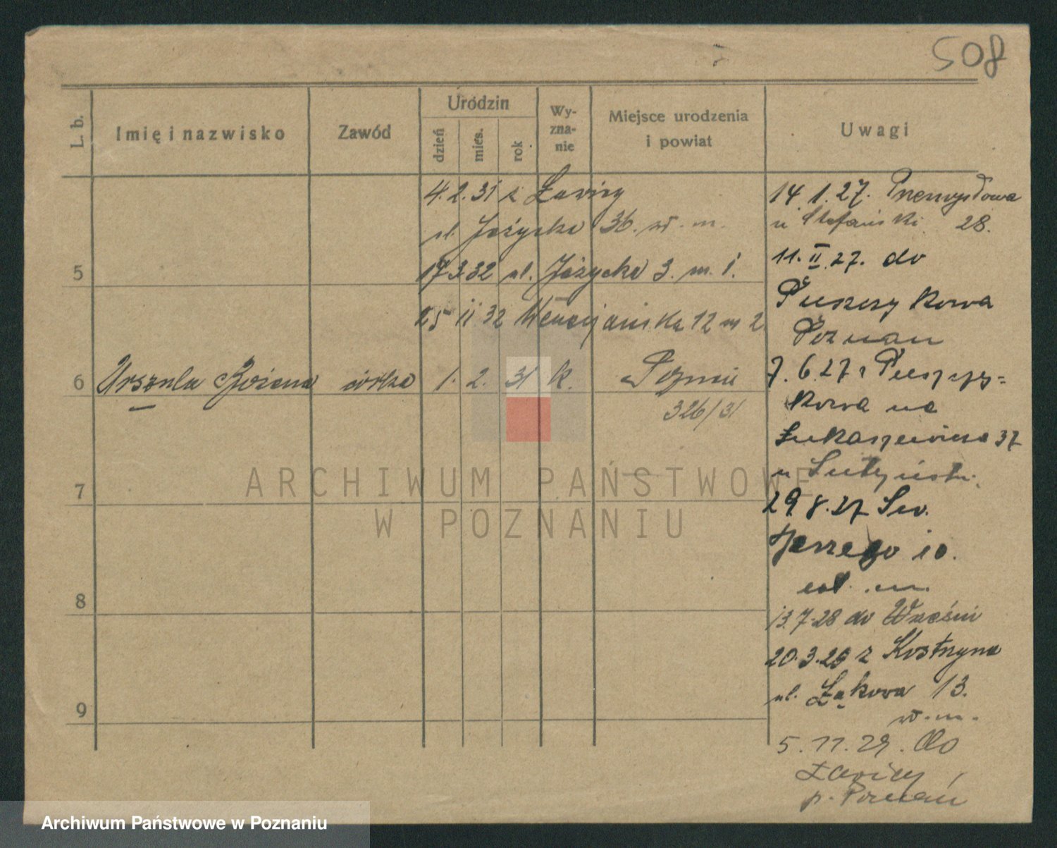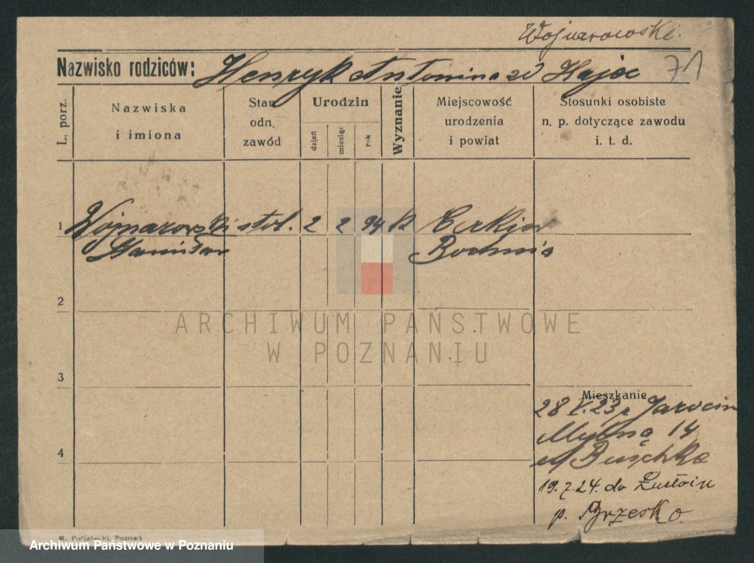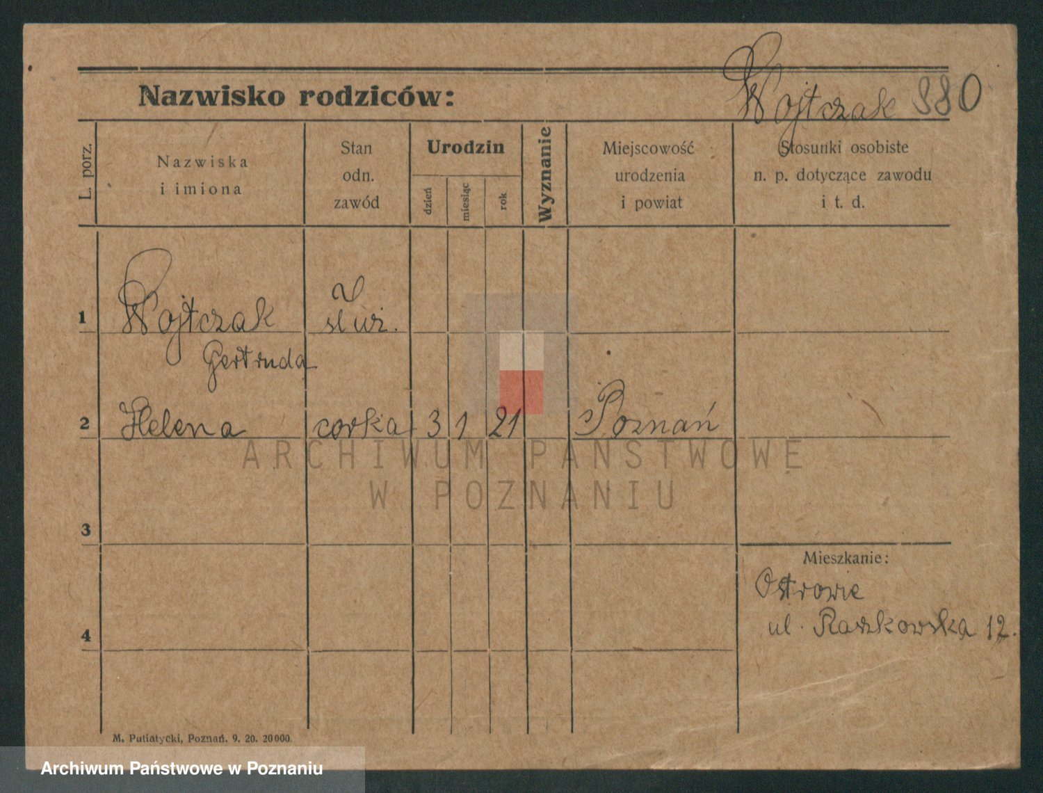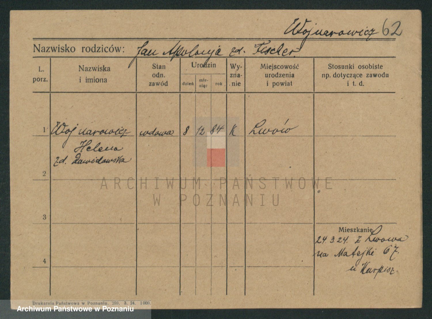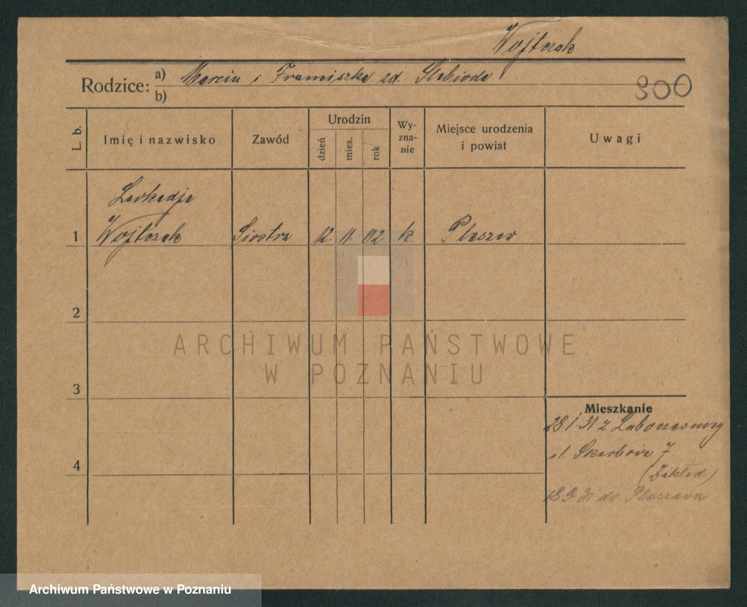 Podgląd karty osobowej dostępny jest po kliknięciu na nazwisko lub ikonkę karty. Można dokonywać powiększenia (ikony na górze) lub przechodzić między kolejnymi skanami (strzałki po bokach).