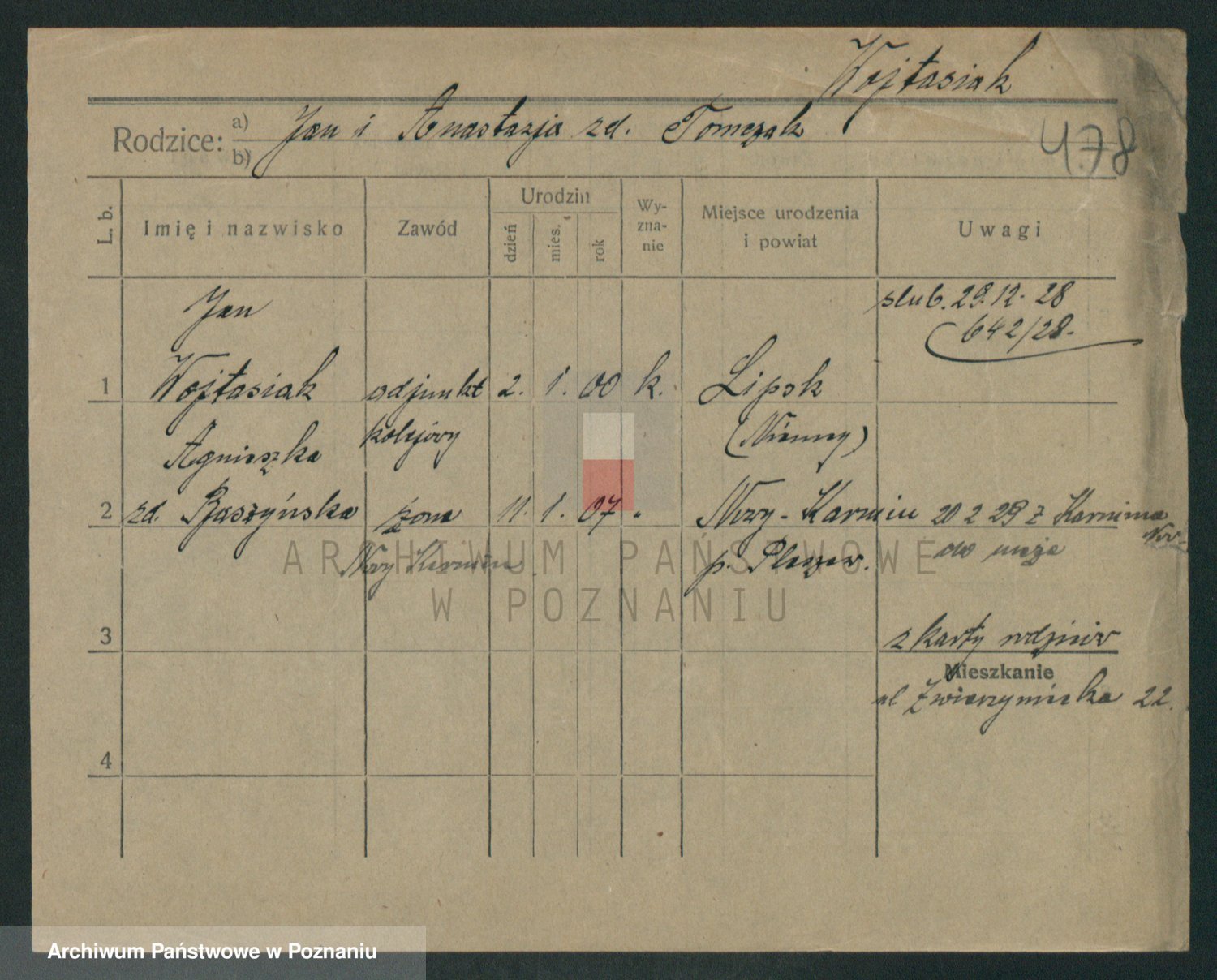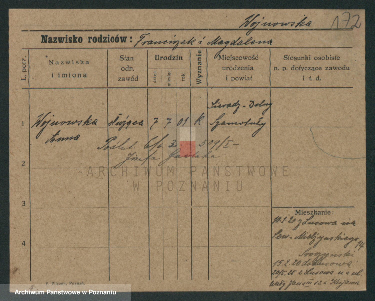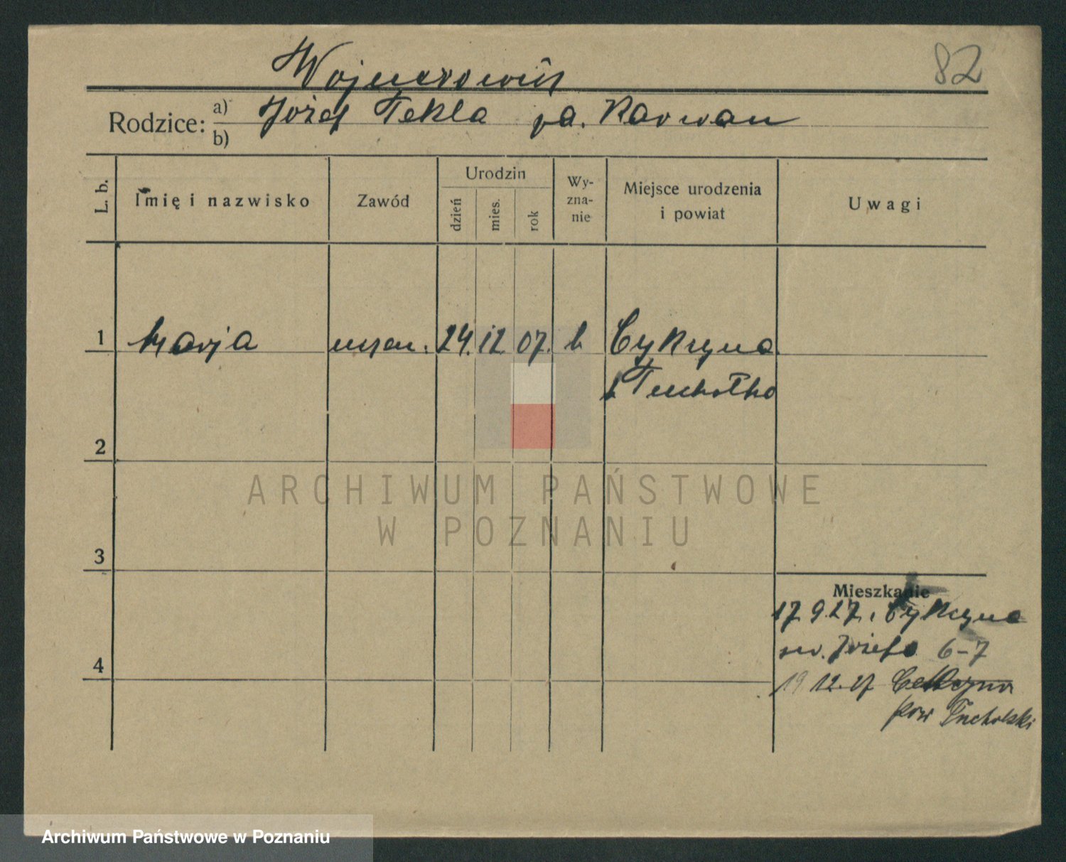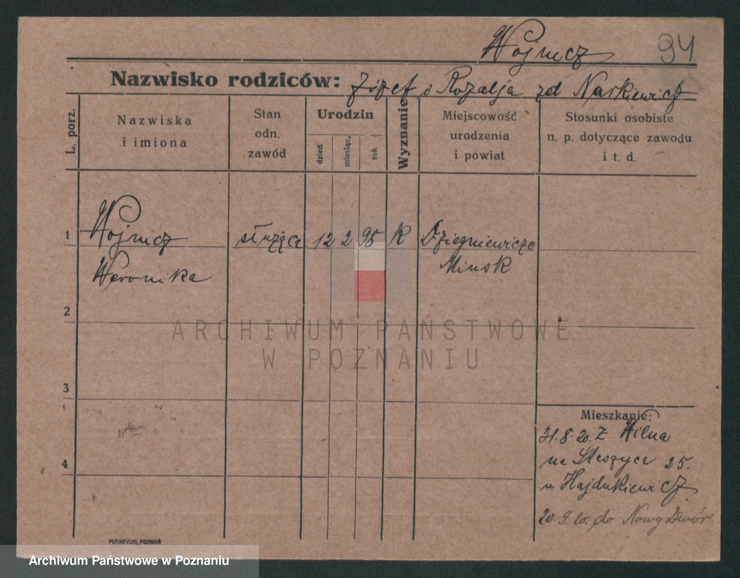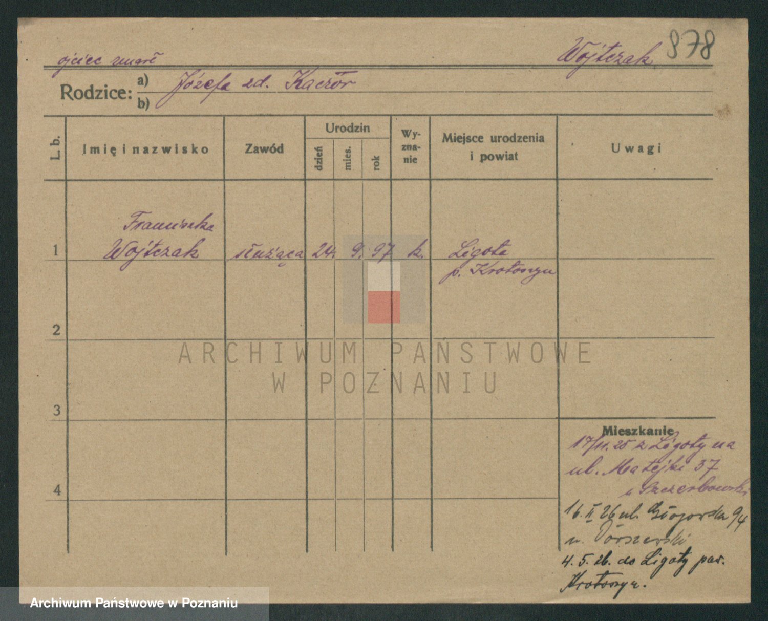 Podgląd karty osobowej dostępny jest po kliknięciu na nazwisko lub ikonkę karty. Można dokonywać powiększenia (ikony na górze) lub przechodzić między kolejnymi skanami (strzałki po bokach).
