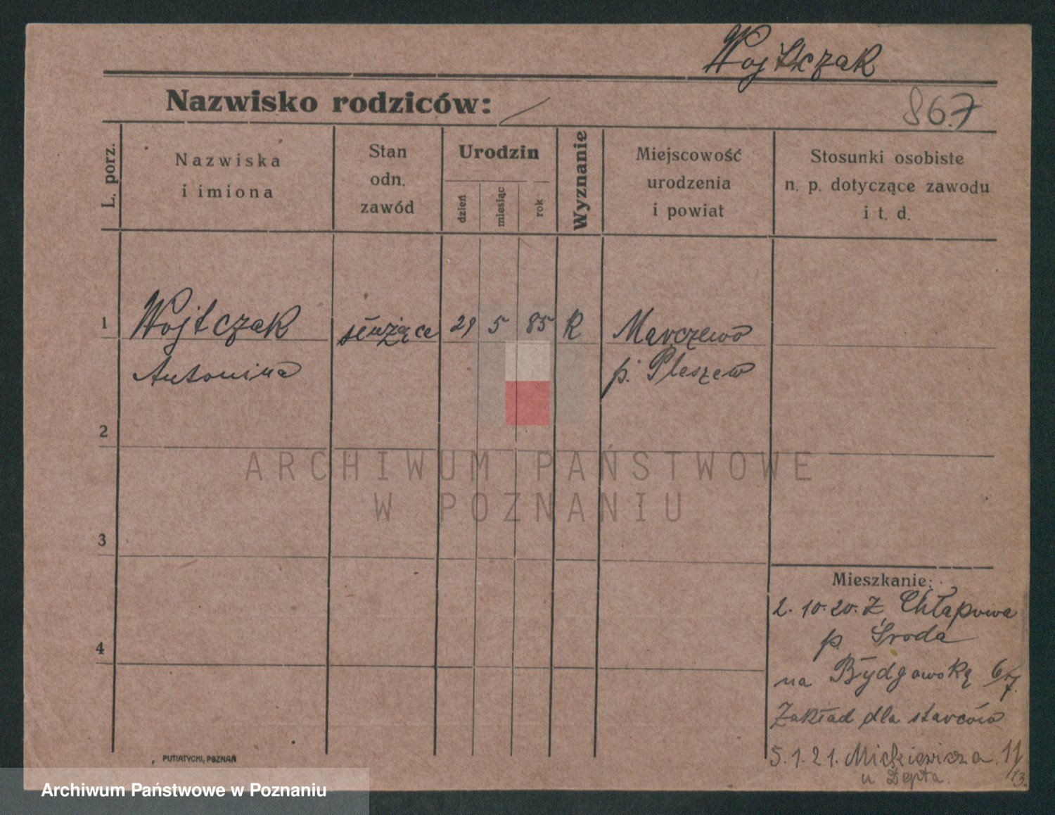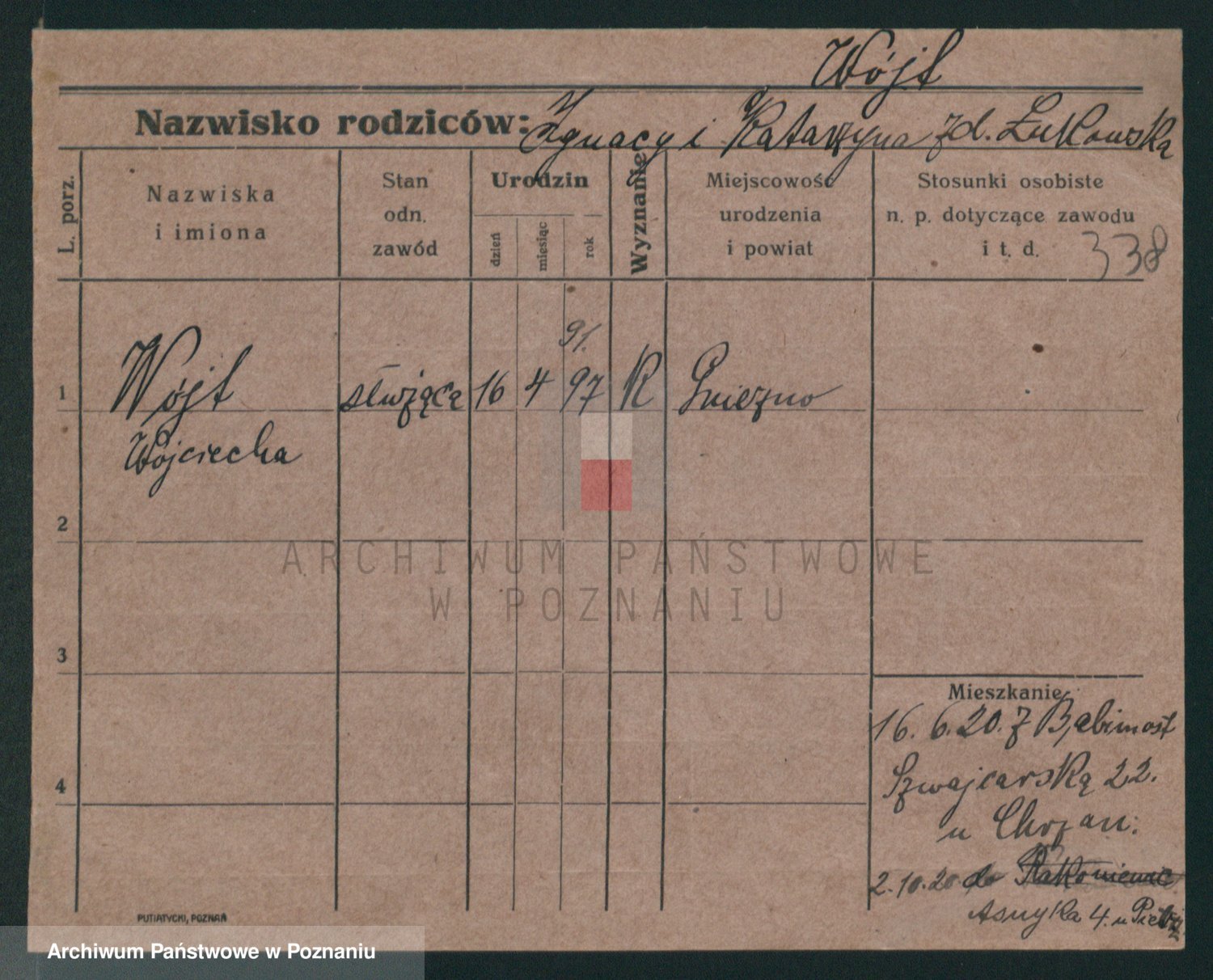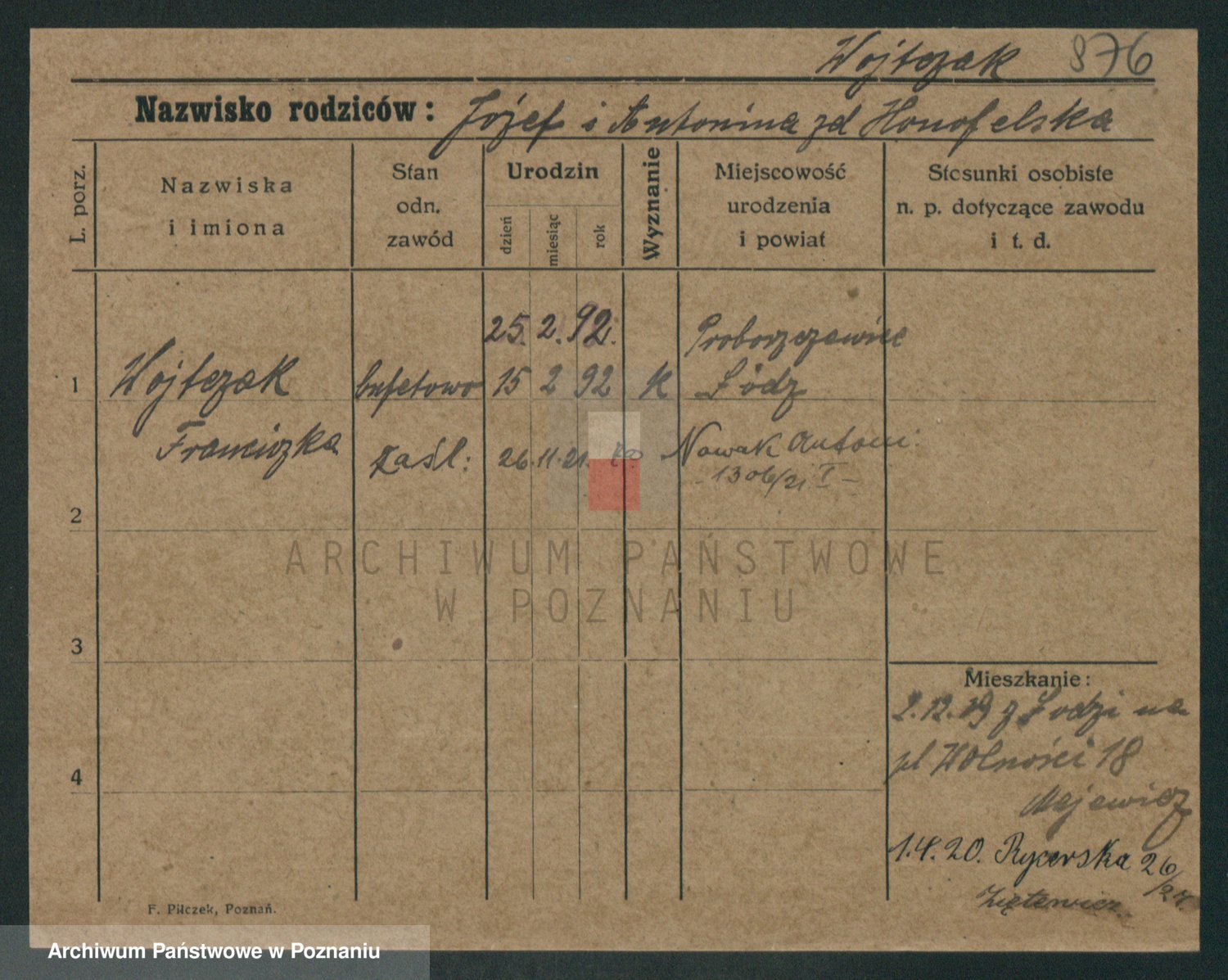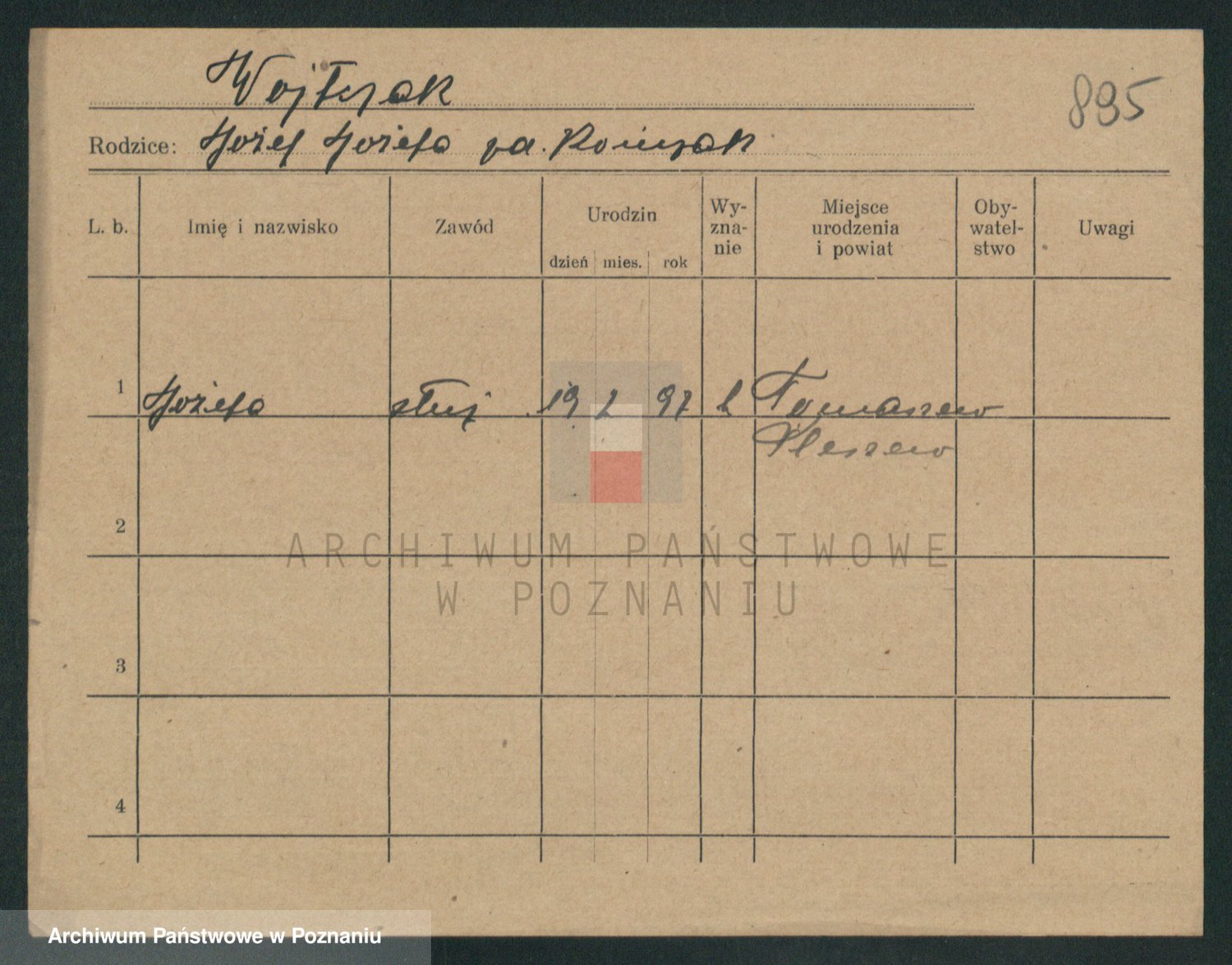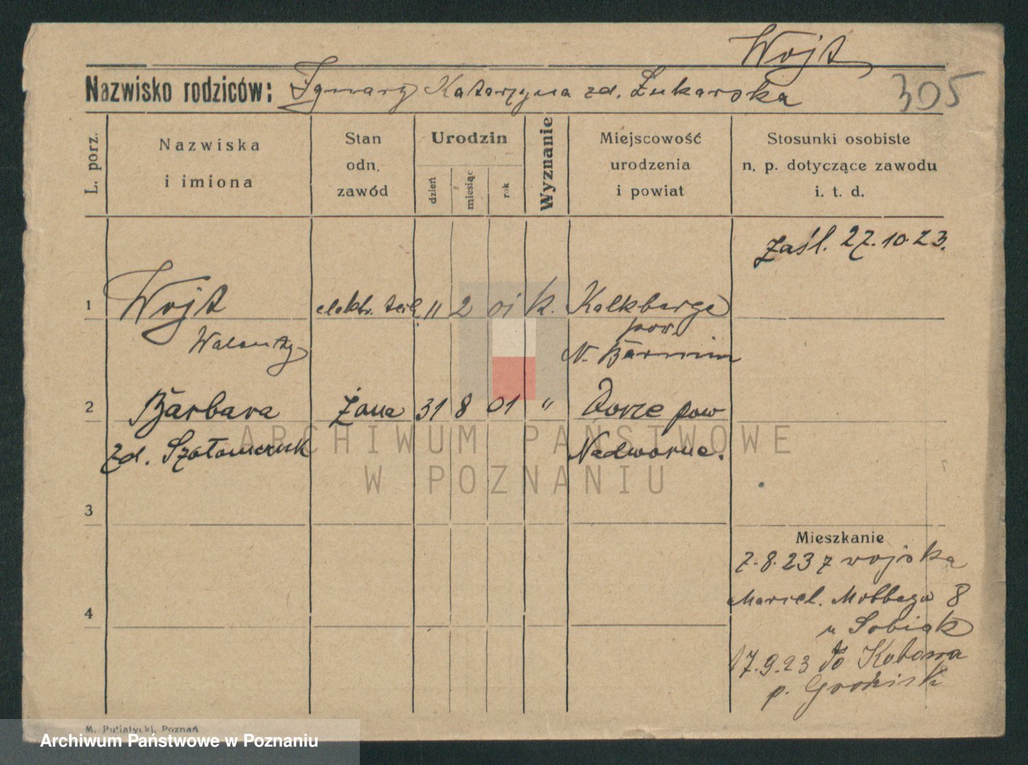 Podgląd karty osobowej dostępny jest po kliknięciu na nazwisko lub ikonkę karty. Można dokonywać powiększenia (ikony na górze) lub przechodzić między kolejnymi skanami (strzałki po bokach).