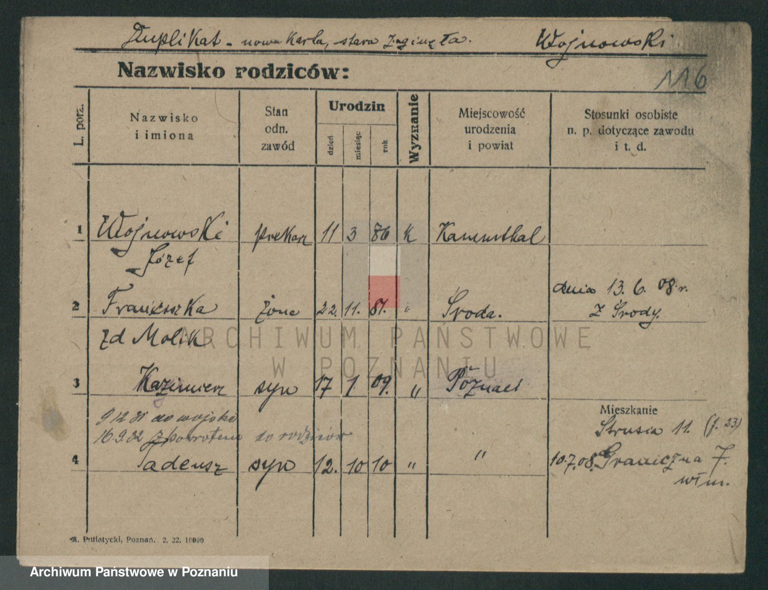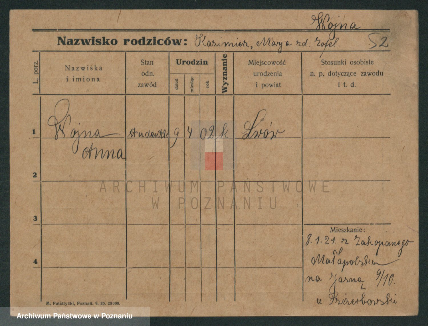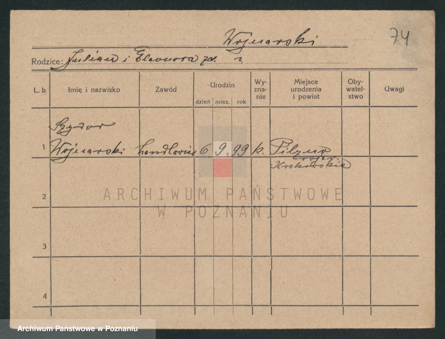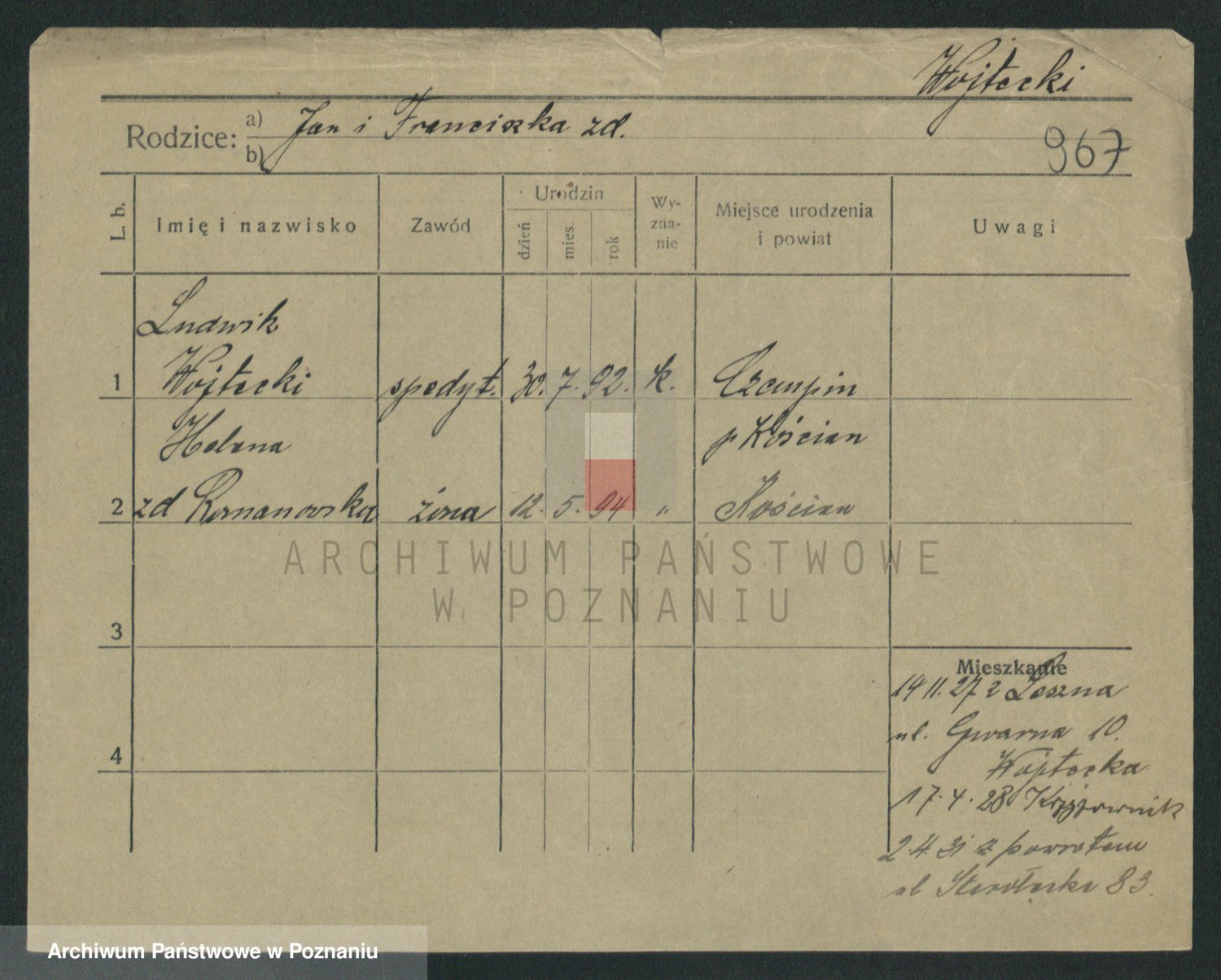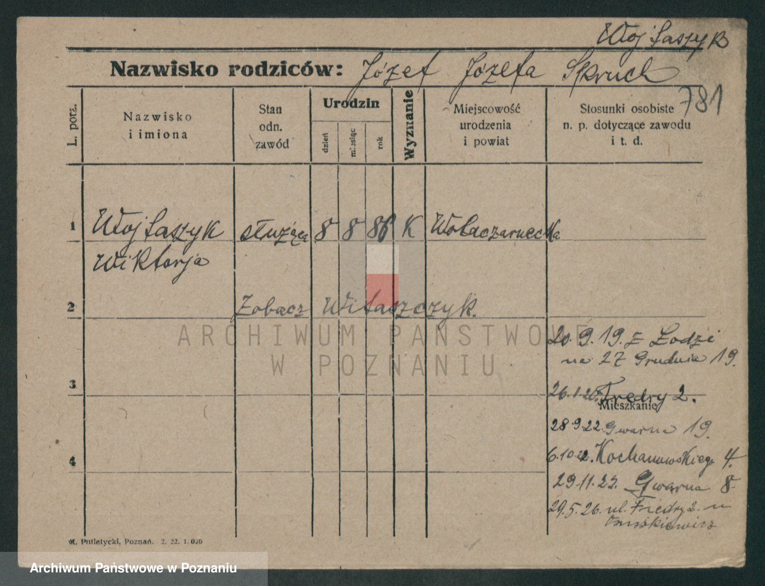 Podgląd karty osobowej dostępny jest po kliknięciu na nazwisko lub ikonkę karty. Można dokonywać powiększenia (ikony na górze) lub przechodzić między kolejnymi skanami (strzałki po bokach).
