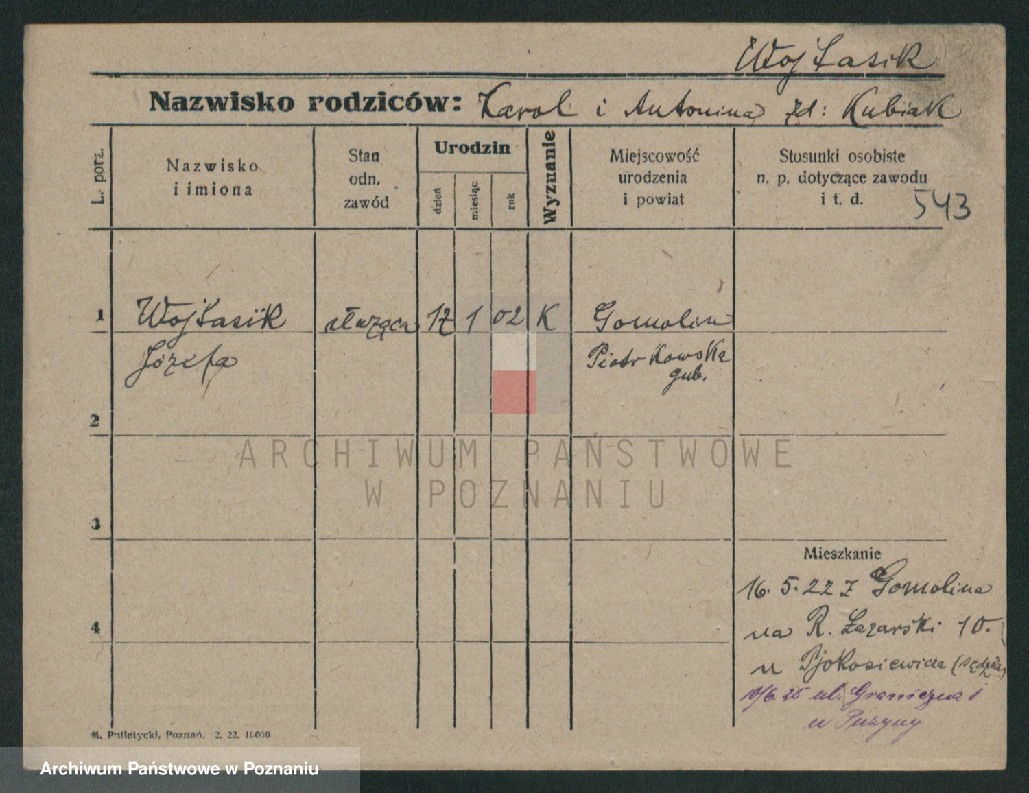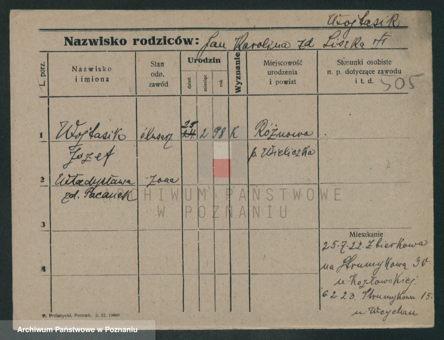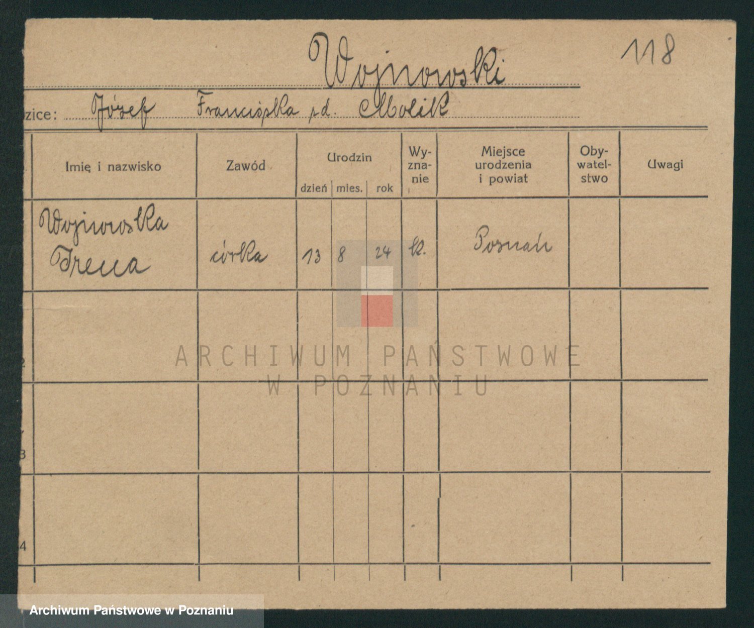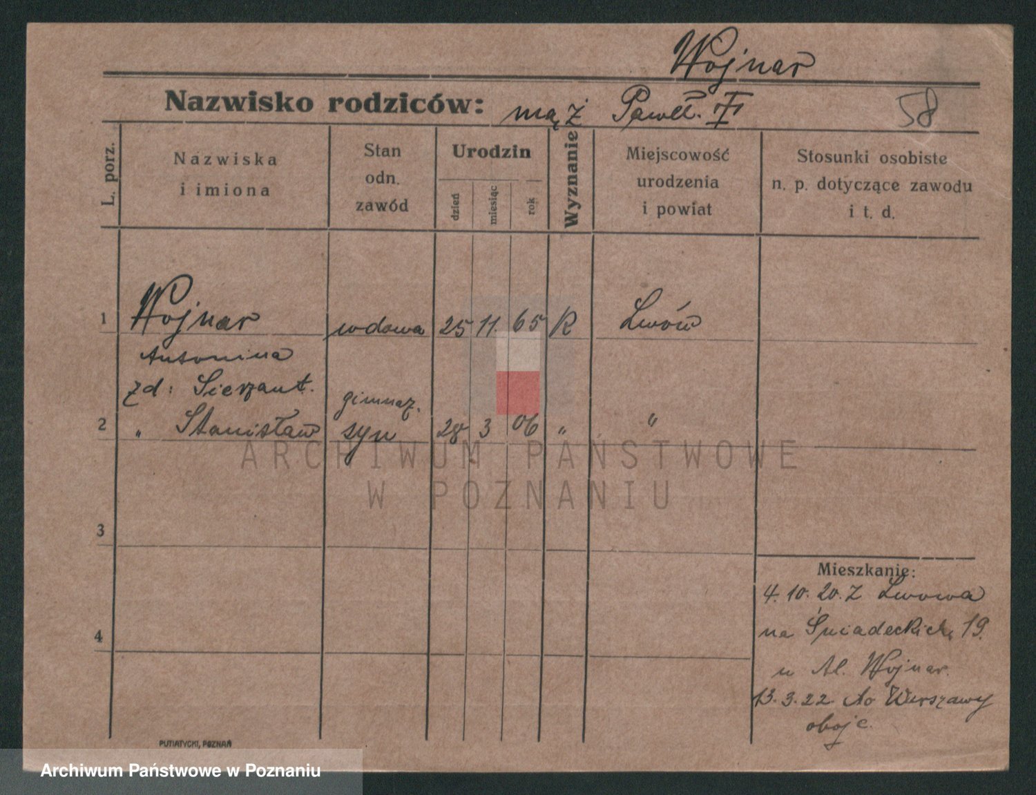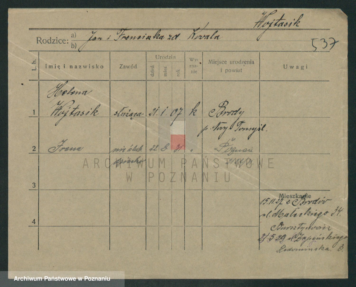 Podgląd karty osobowej dostępny jest po kliknięciu na nazwisko lub ikonkę karty. Można dokonywać powiększenia (ikony na górze) lub przechodzić między kolejnymi skanami (strzałki po bokach).