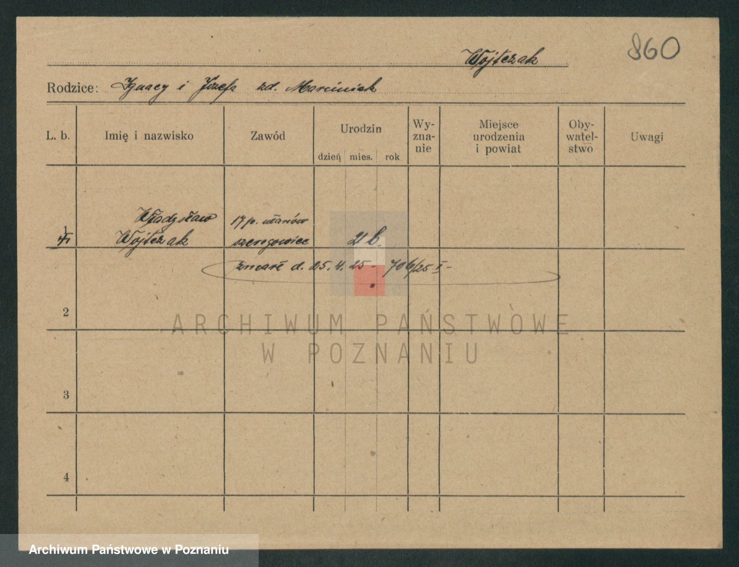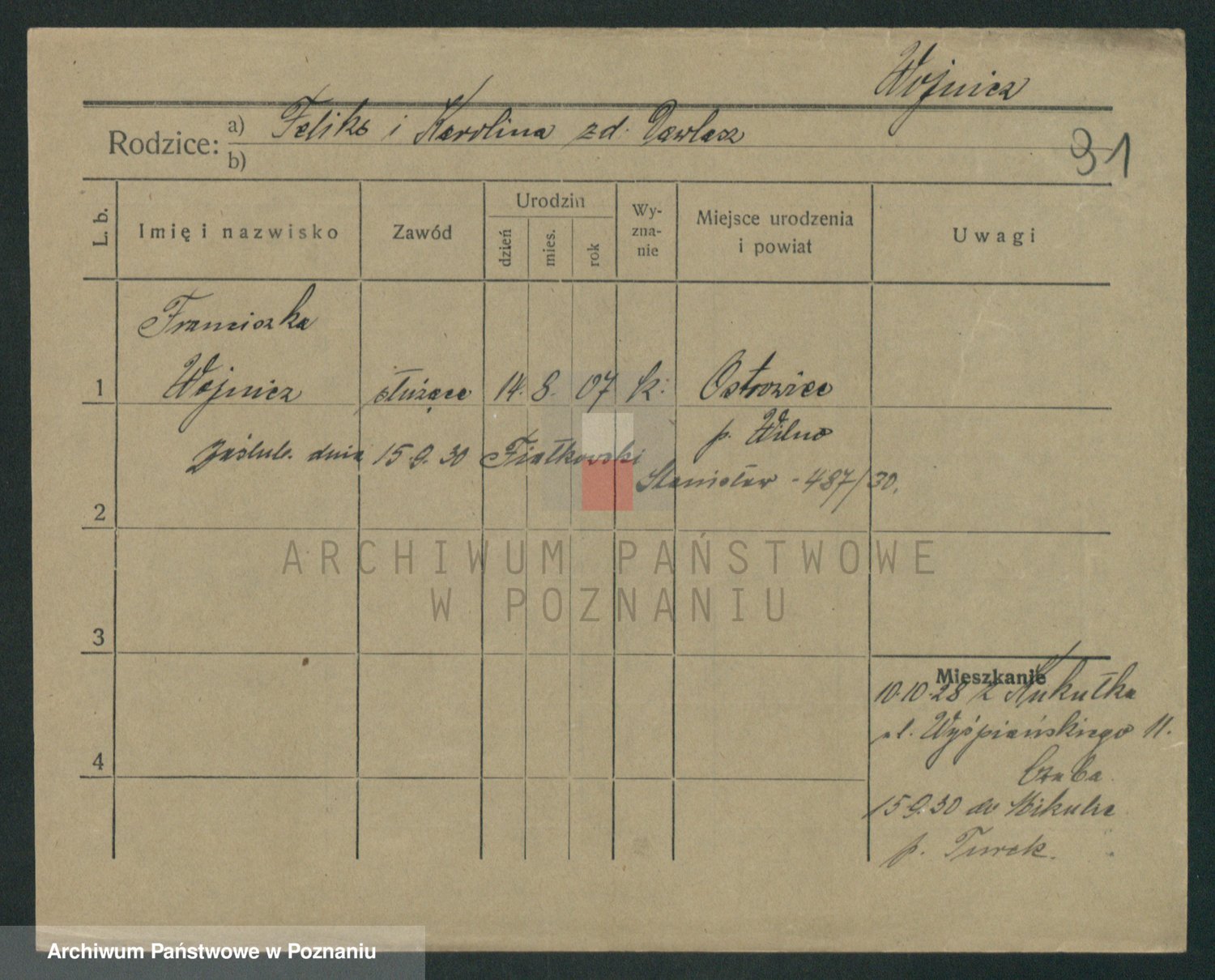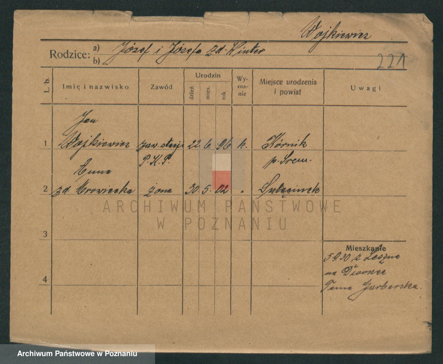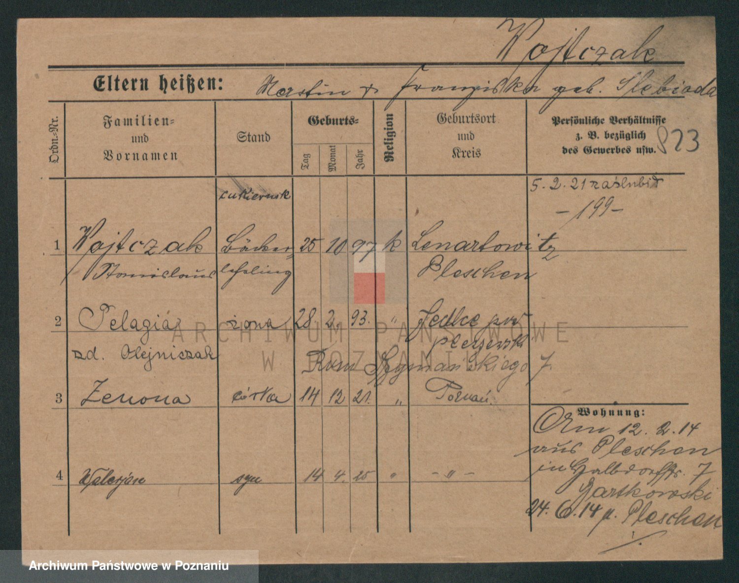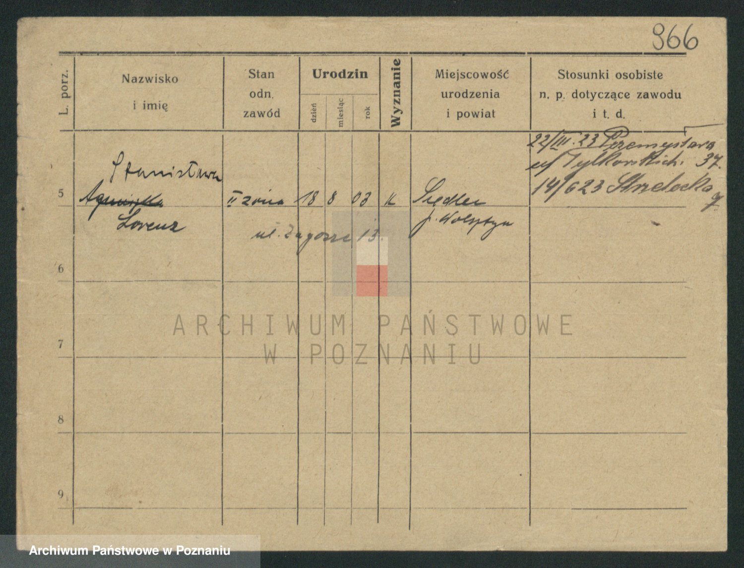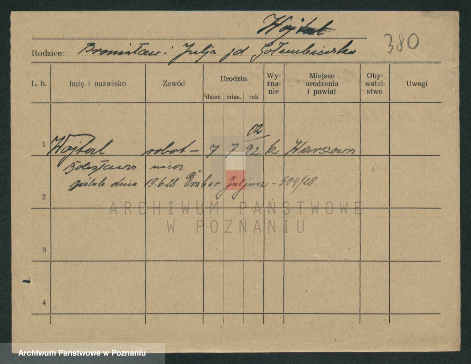 Podgląd karty osobowej dostępny jest po kliknięciu na nazwisko lub ikonkę karty. Można dokonywać powiększenia (ikony na górze) lub przechodzić między kolejnymi skanami (strzałki po bokach).