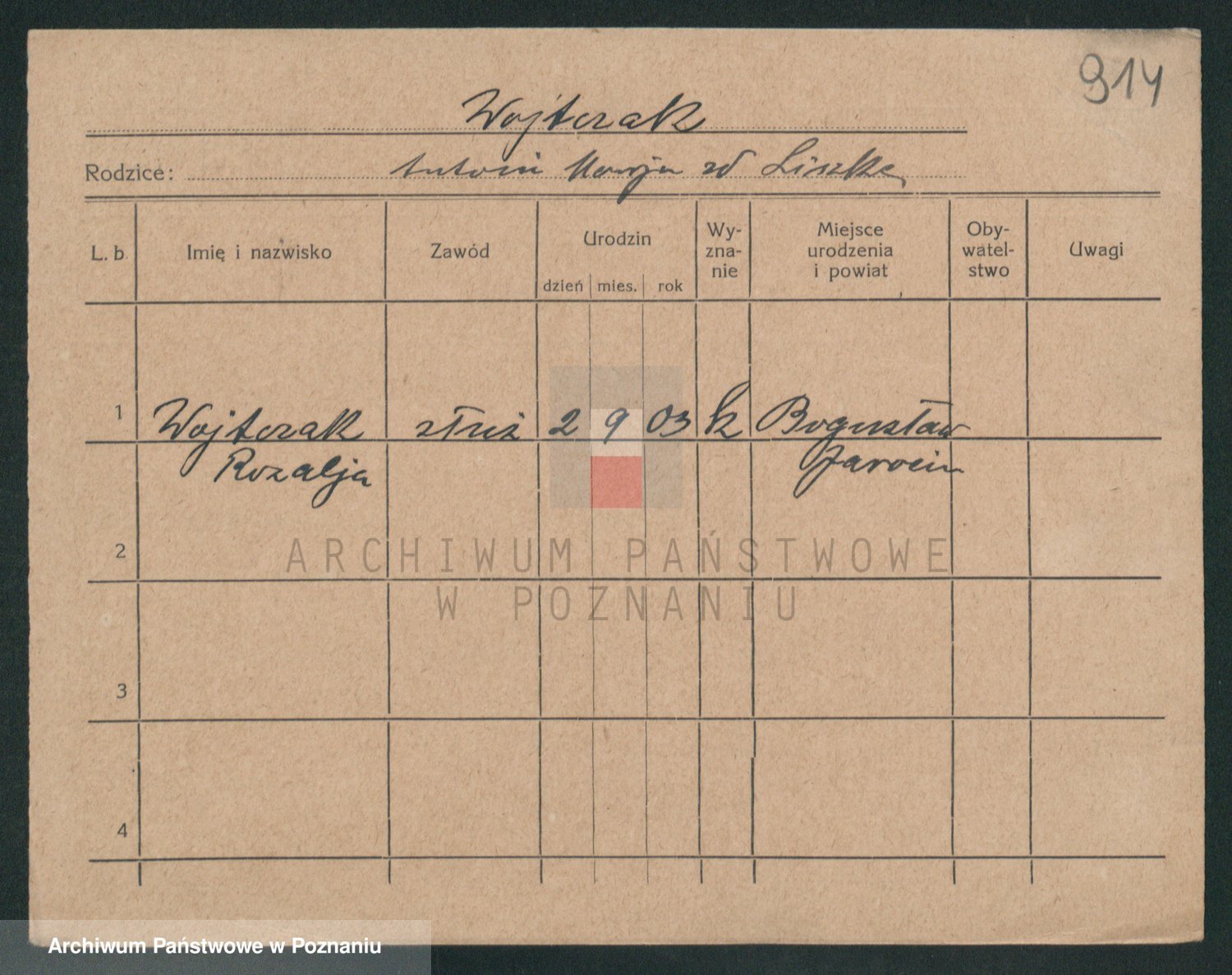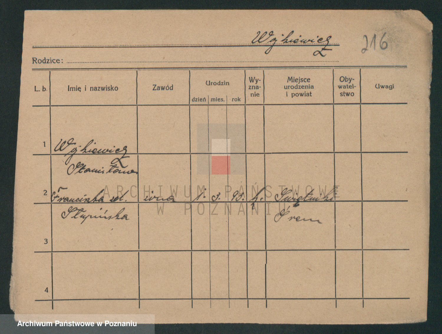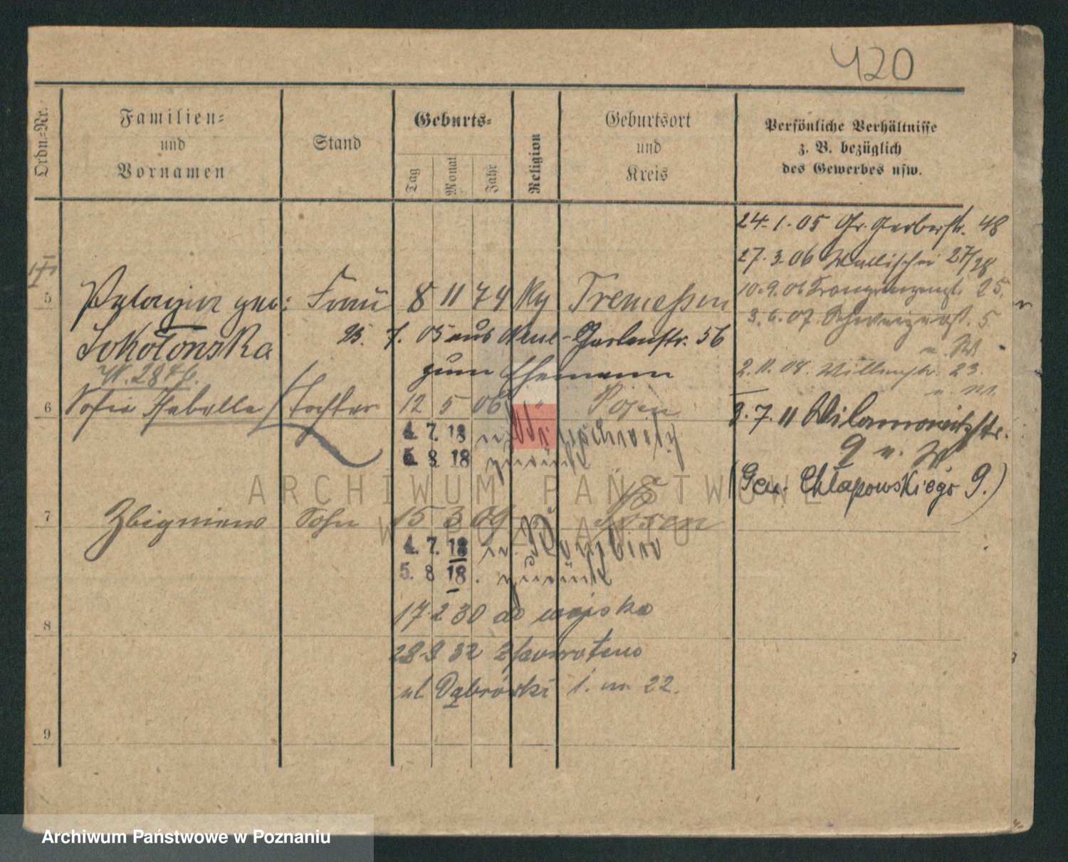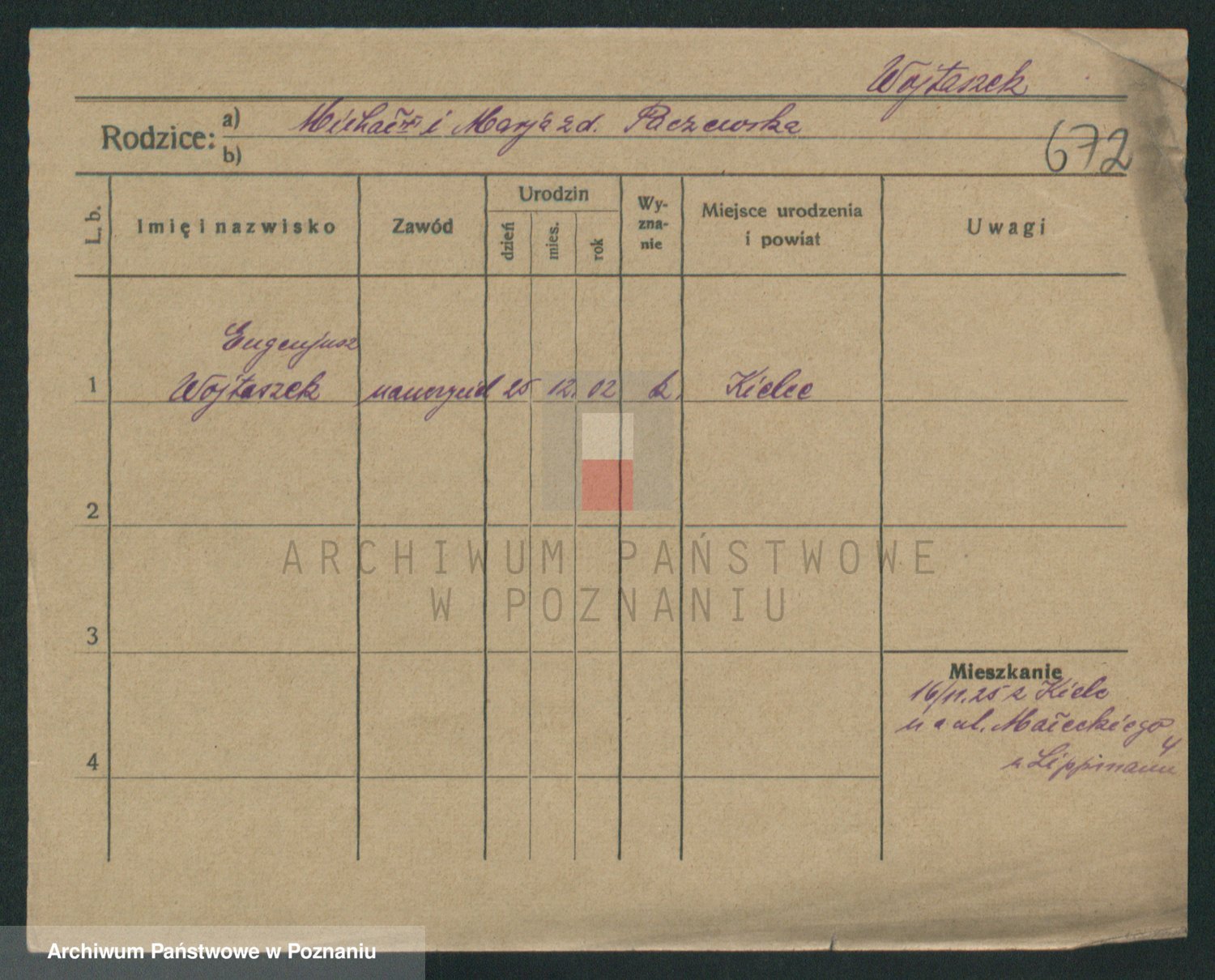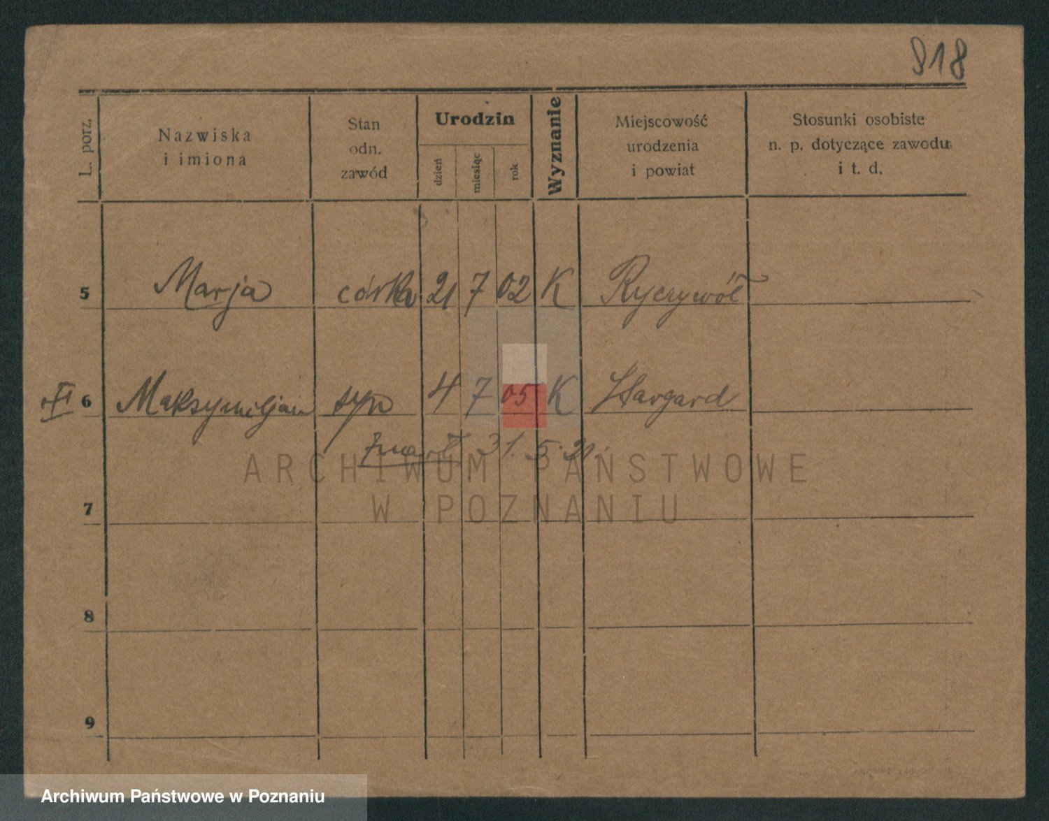 Podgląd karty osobowej dostępny jest po kliknięciu na nazwisko lub ikonkę karty. Można dokonywać powiększenia (ikony na górze) lub przechodzić między kolejnymi skanami (strzałki po bokach).