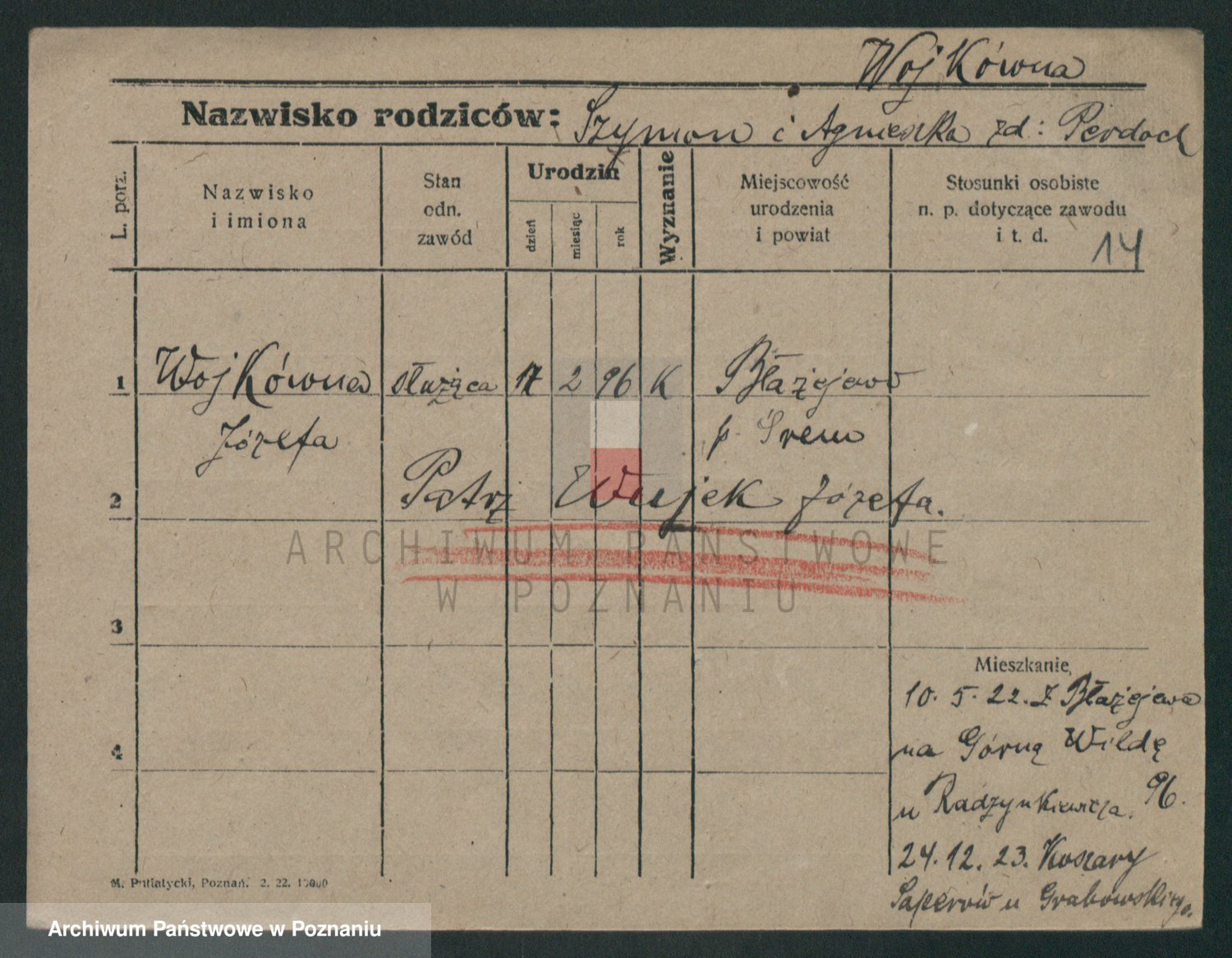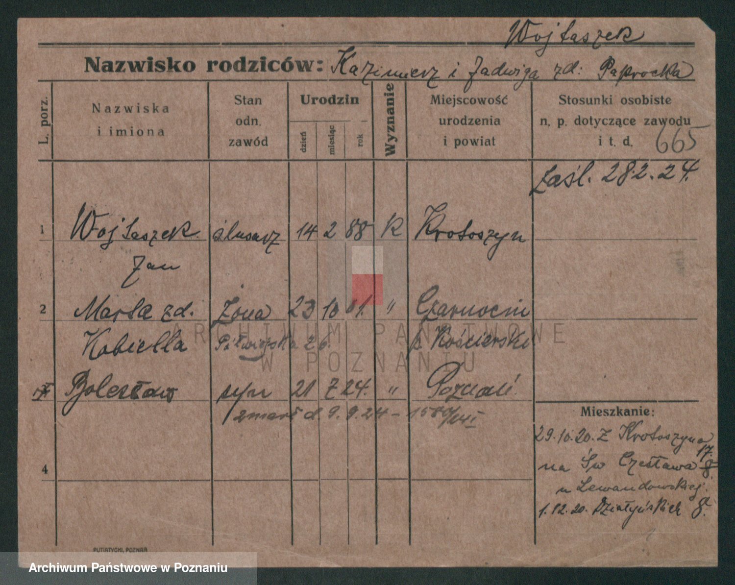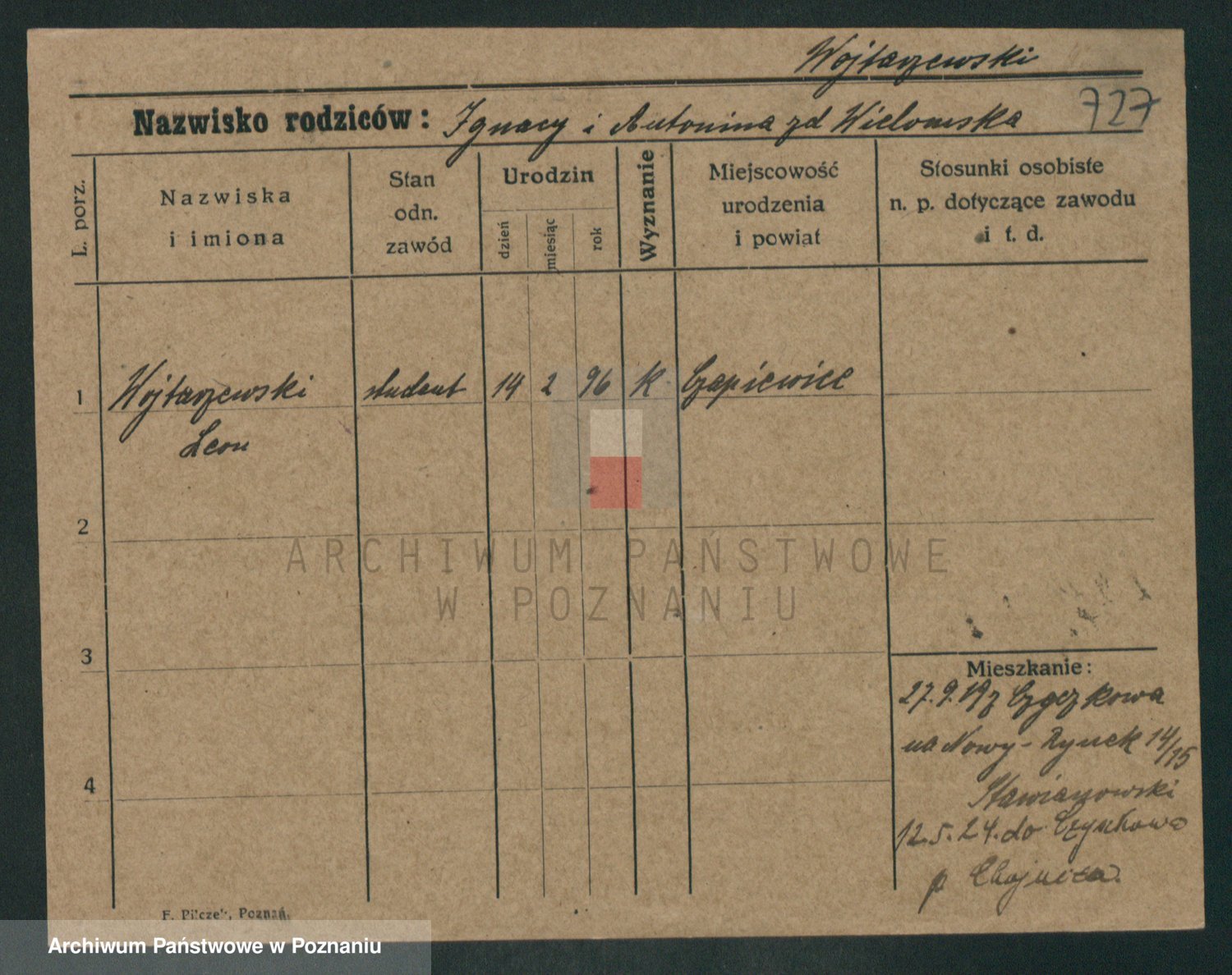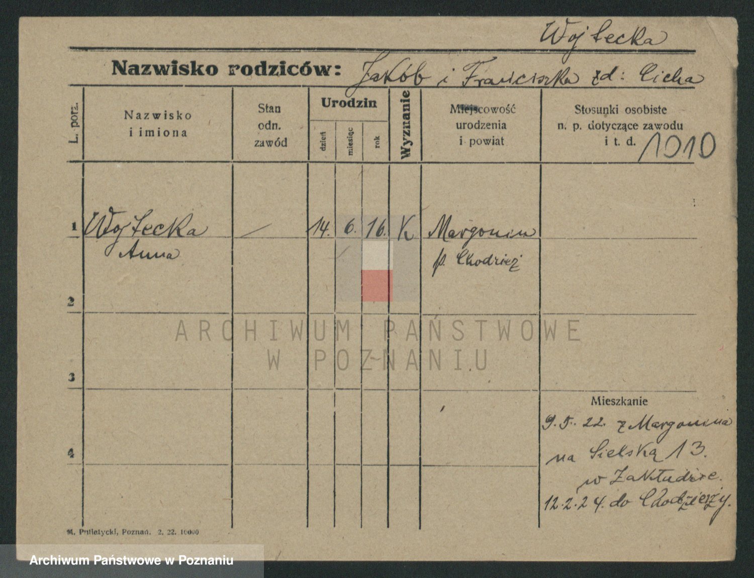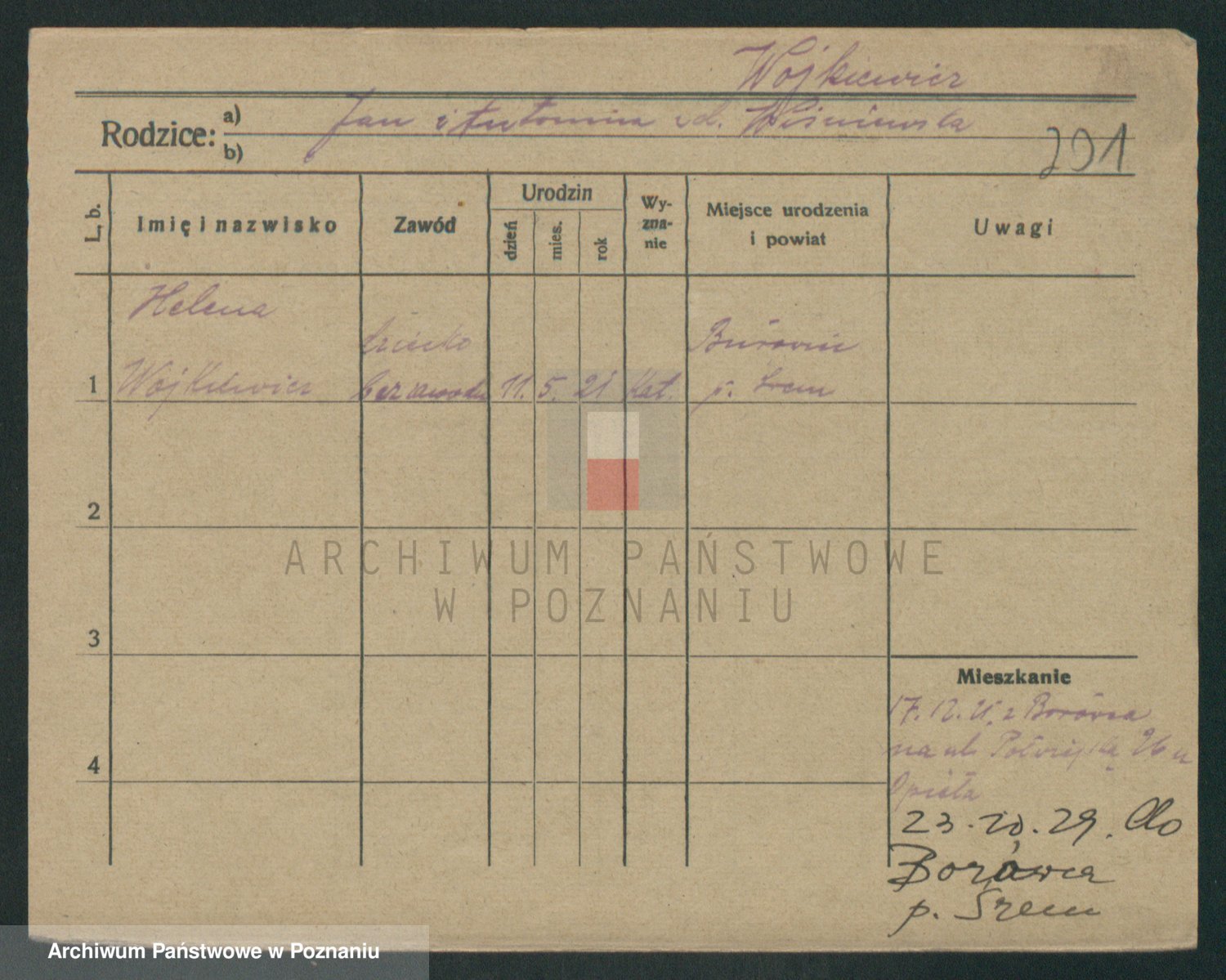 Podgląd karty osobowej dostępny jest po kliknięciu na nazwisko lub ikonkę karty. Można dokonywać powiększenia (ikony na górze) lub przechodzić między kolejnymi skanami (strzałki po bokach).